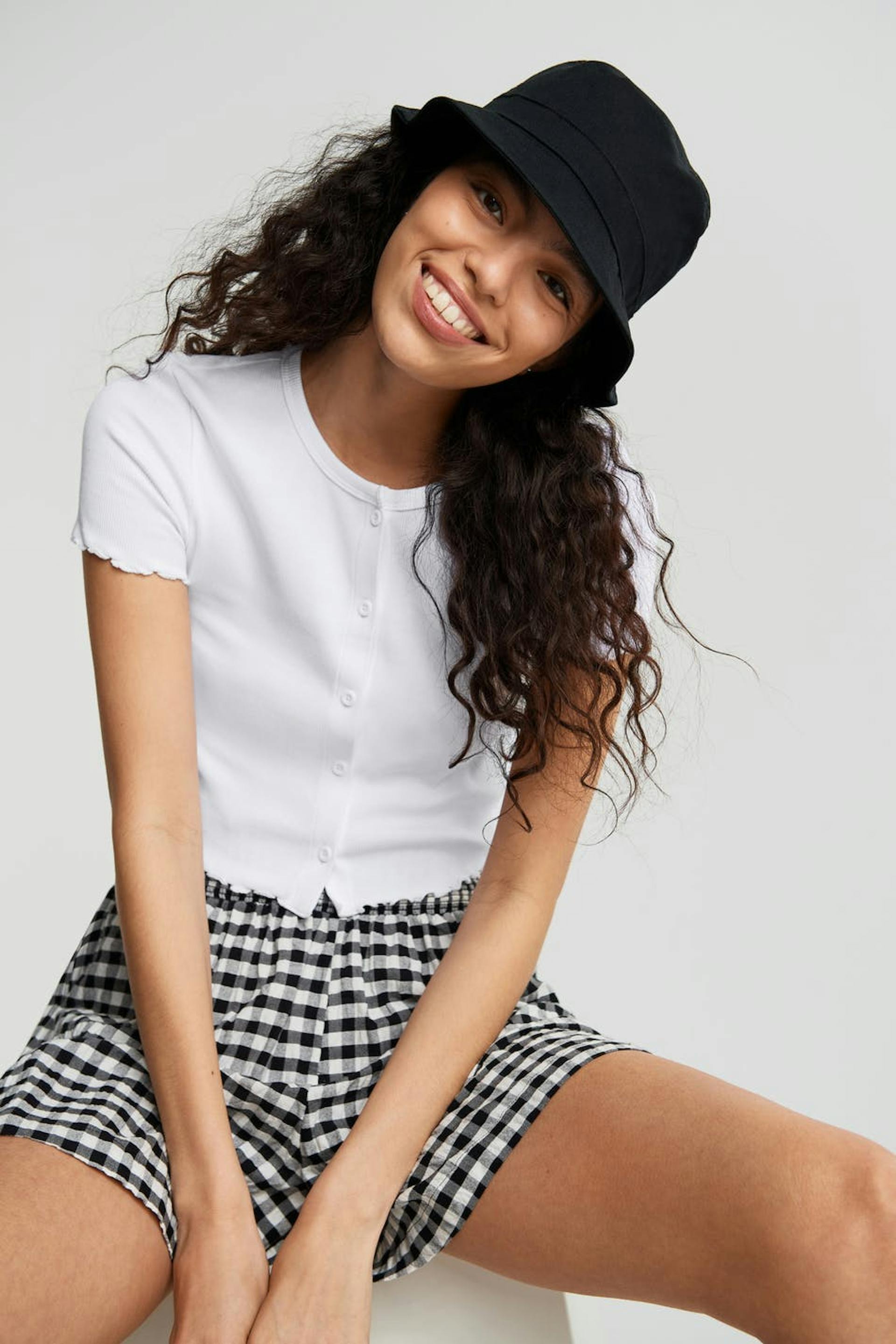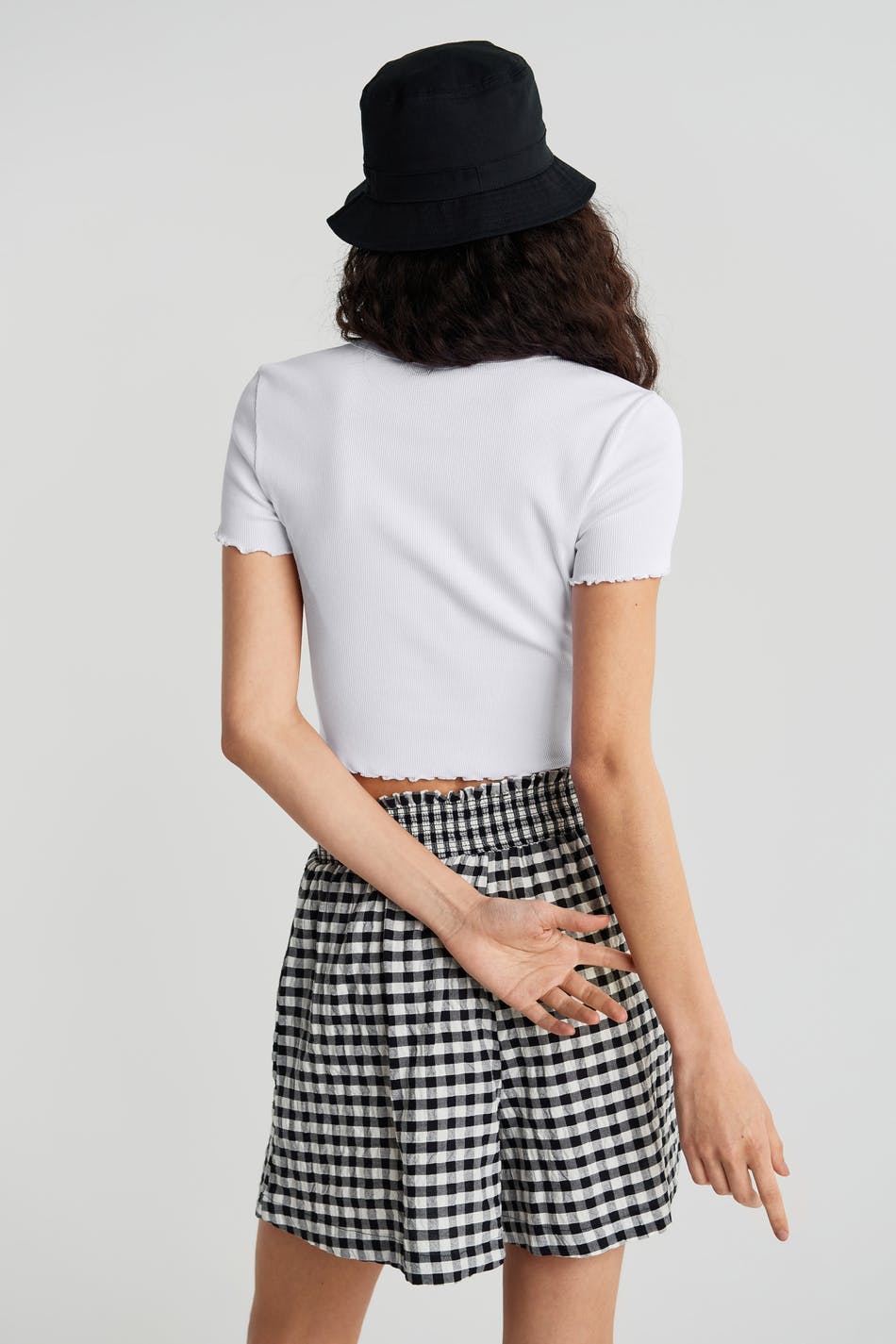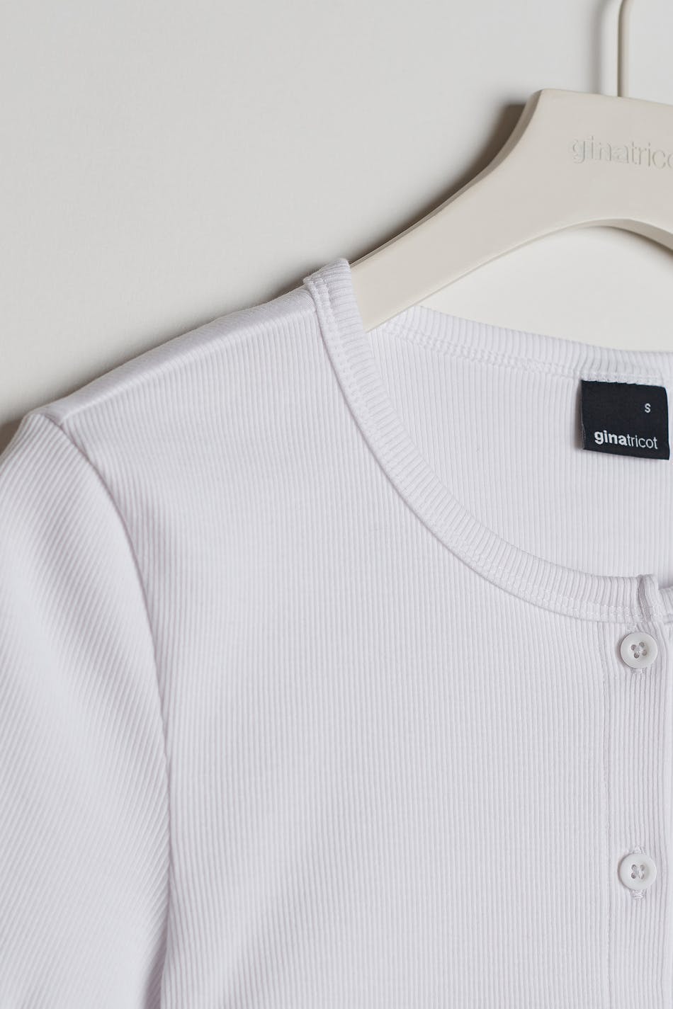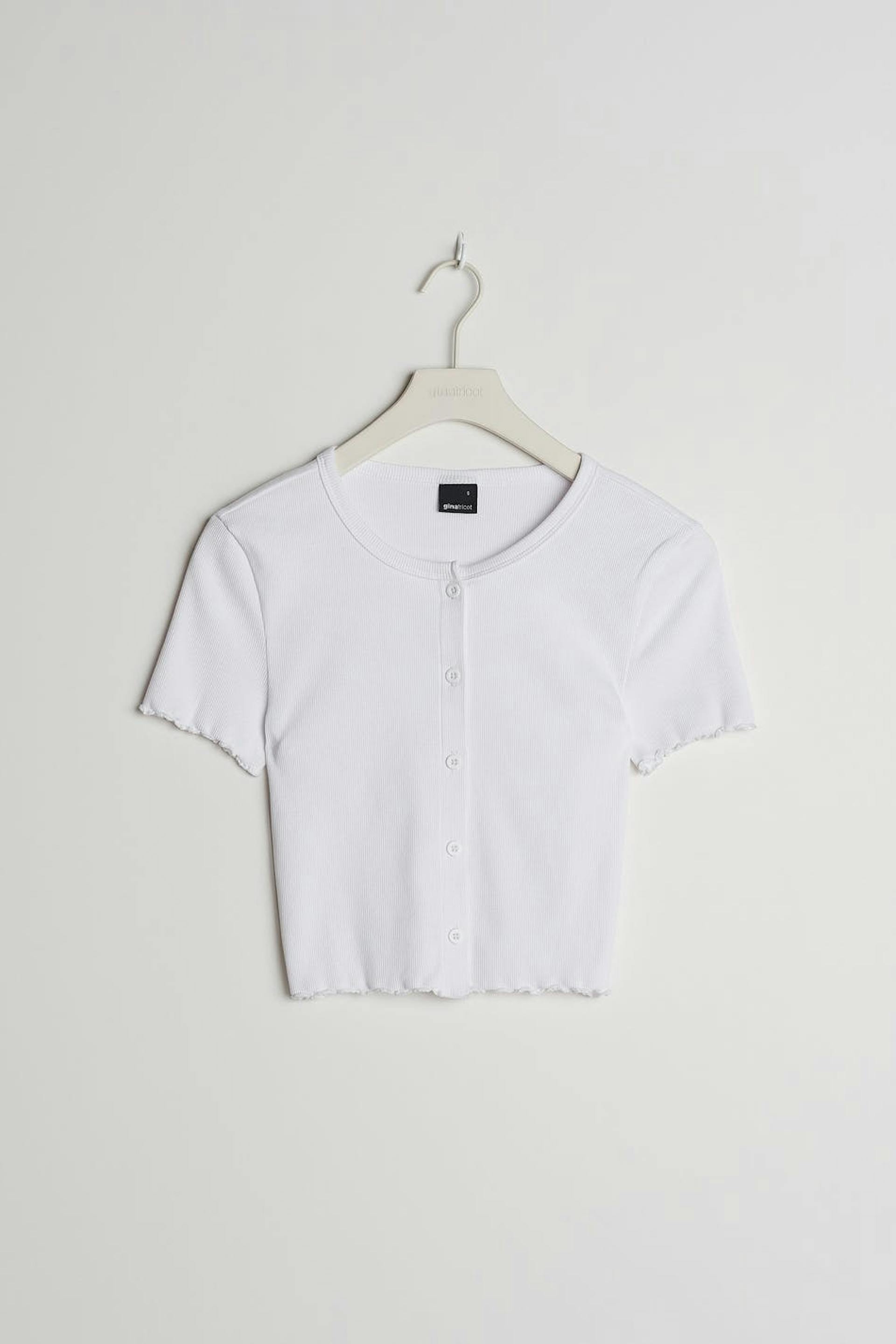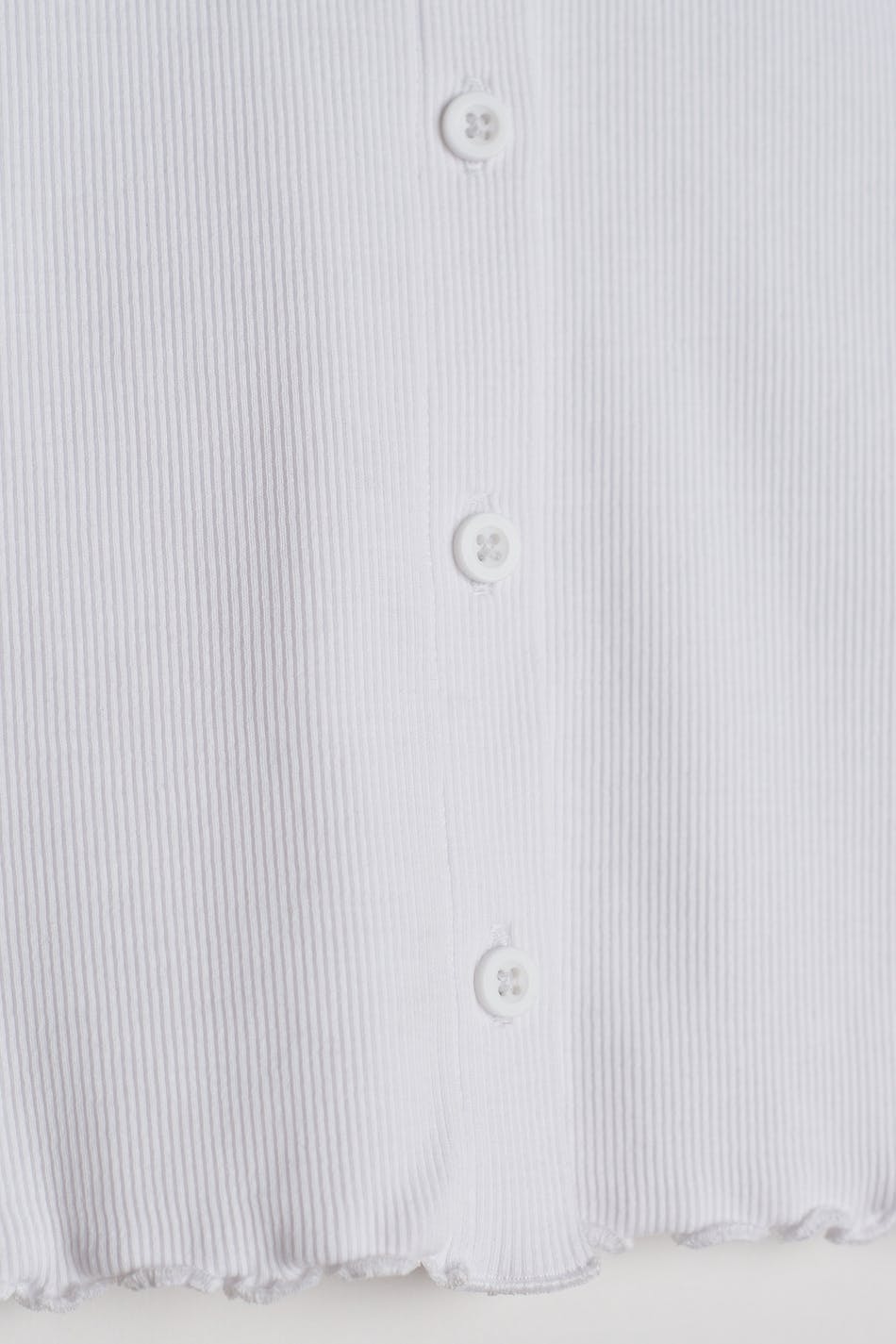 Short-sleeved cardigan with a regular fit. The cardigan is white, ribbed and cropped. It has a crew neckline, small buttons at the front and an overlock seam on the sleeve ends and at the bottom hem.