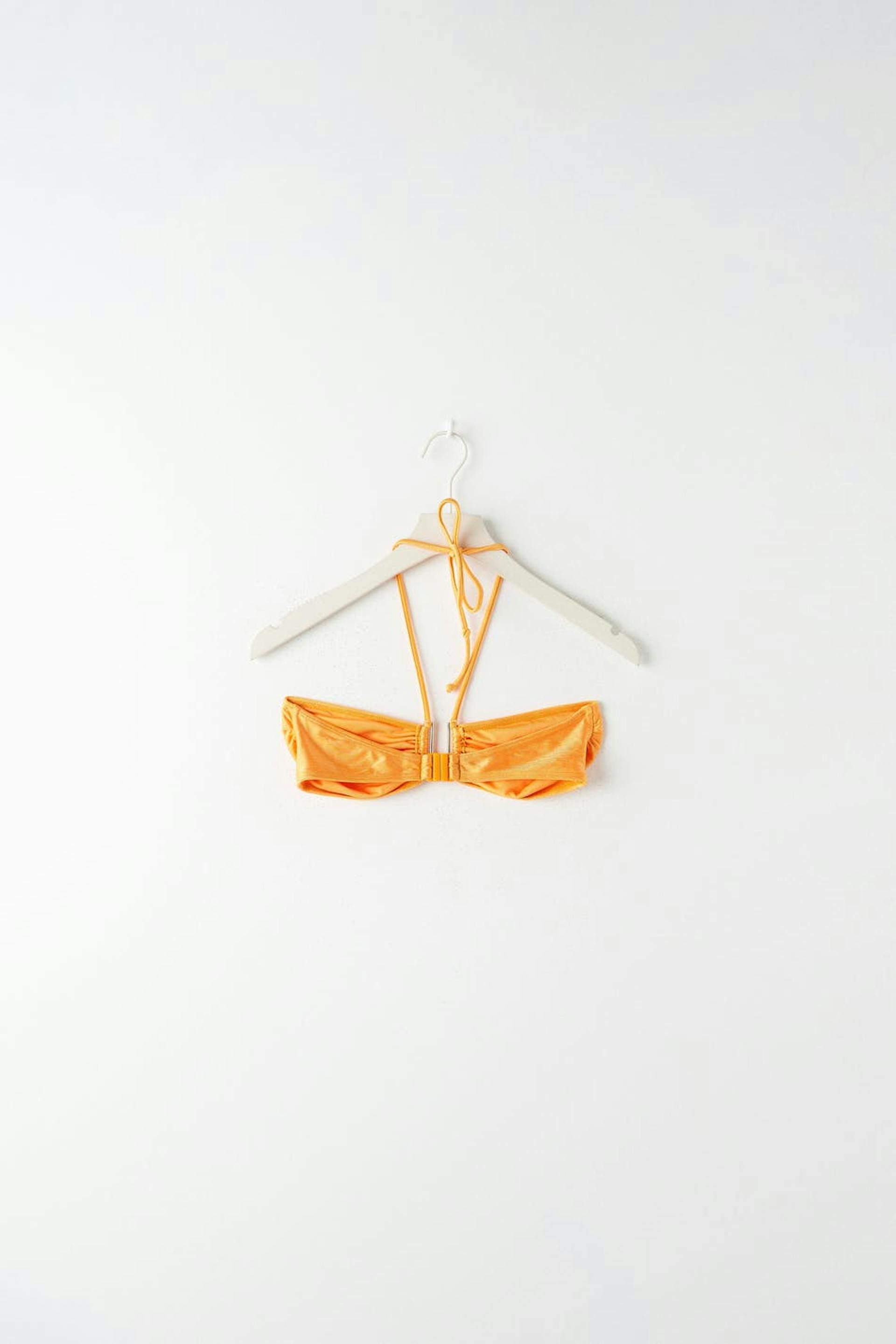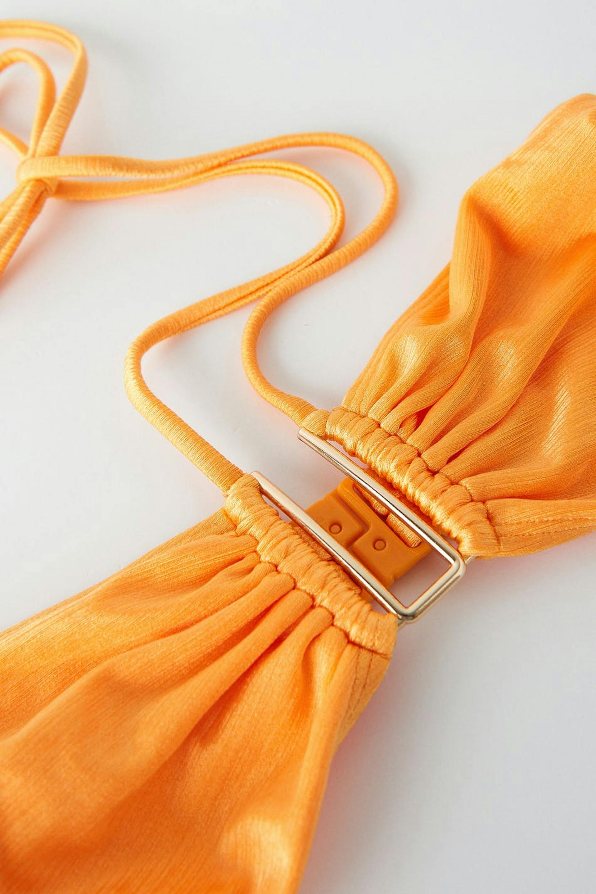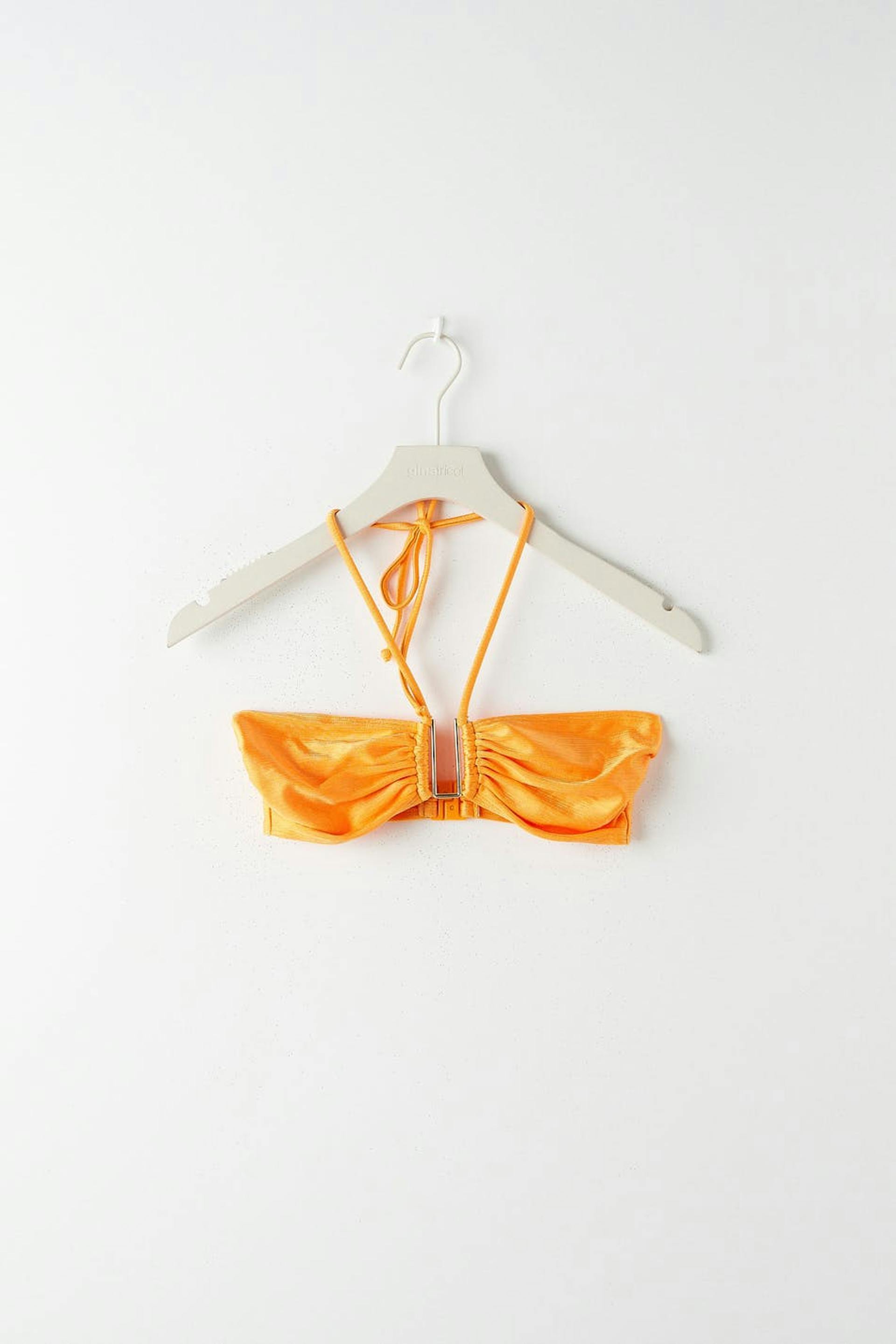 Lined bandeau bikini top with shiny swimsuit material. The bikini top is orange and has halterneck straps with self-tie at neck. It has a metal detail at the front and button placket in the back.