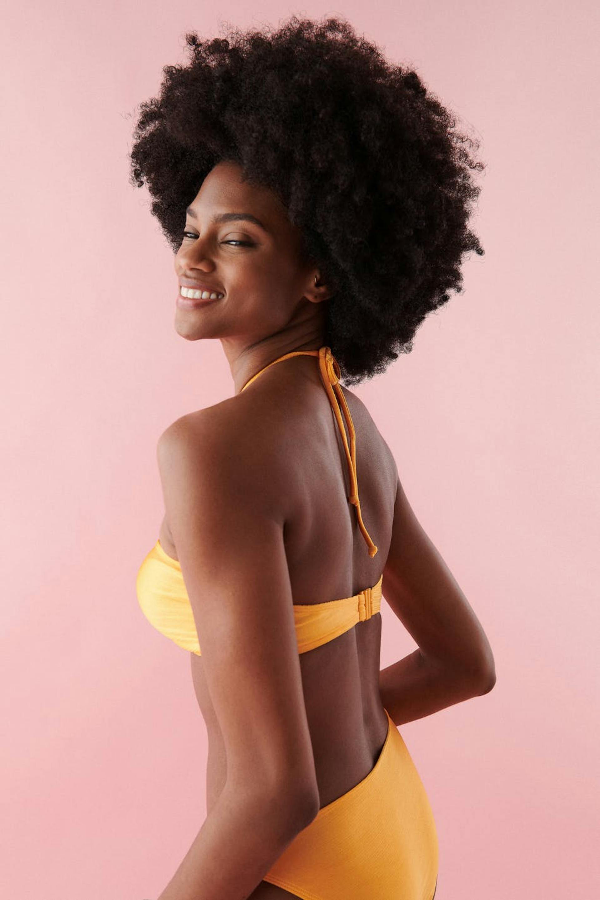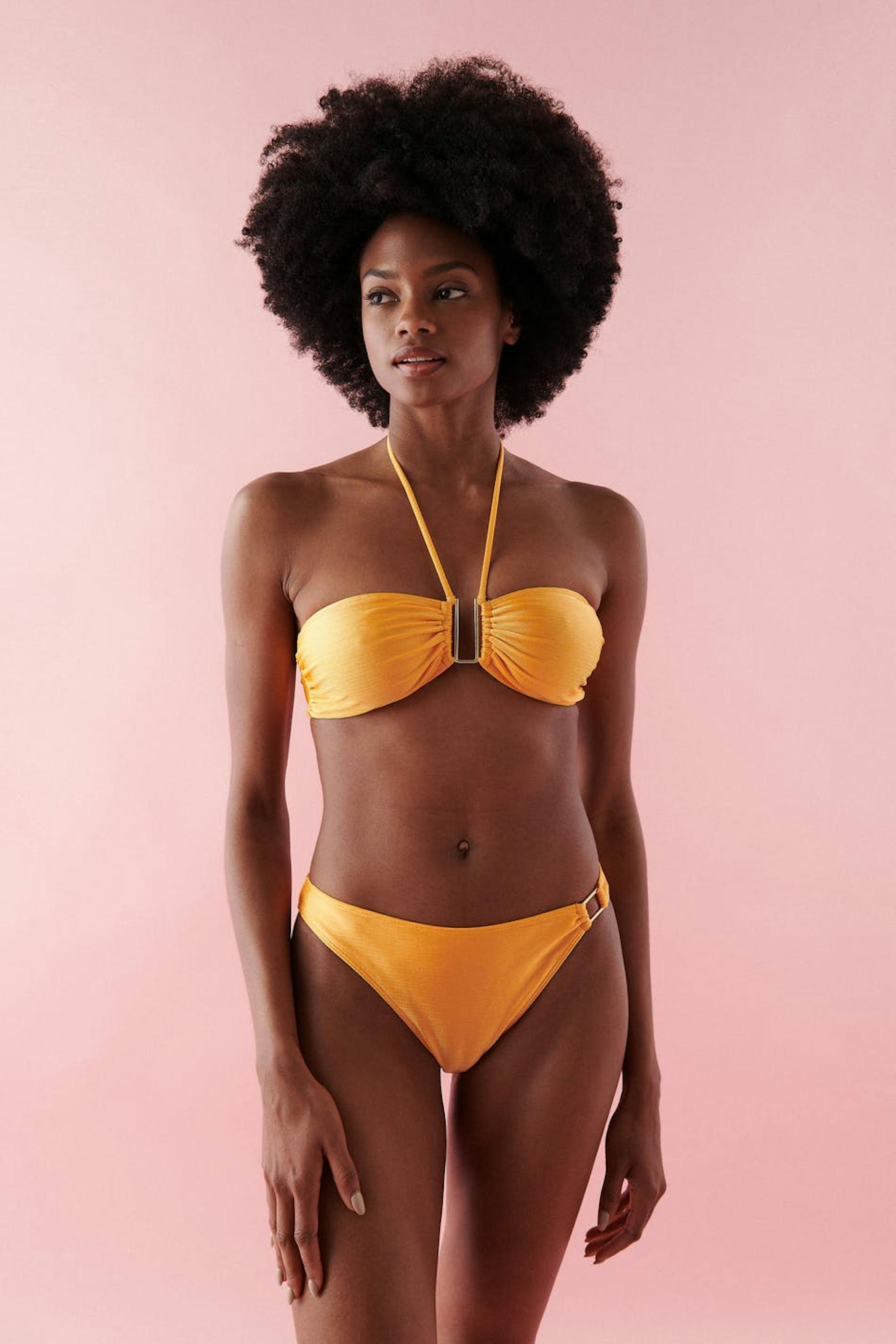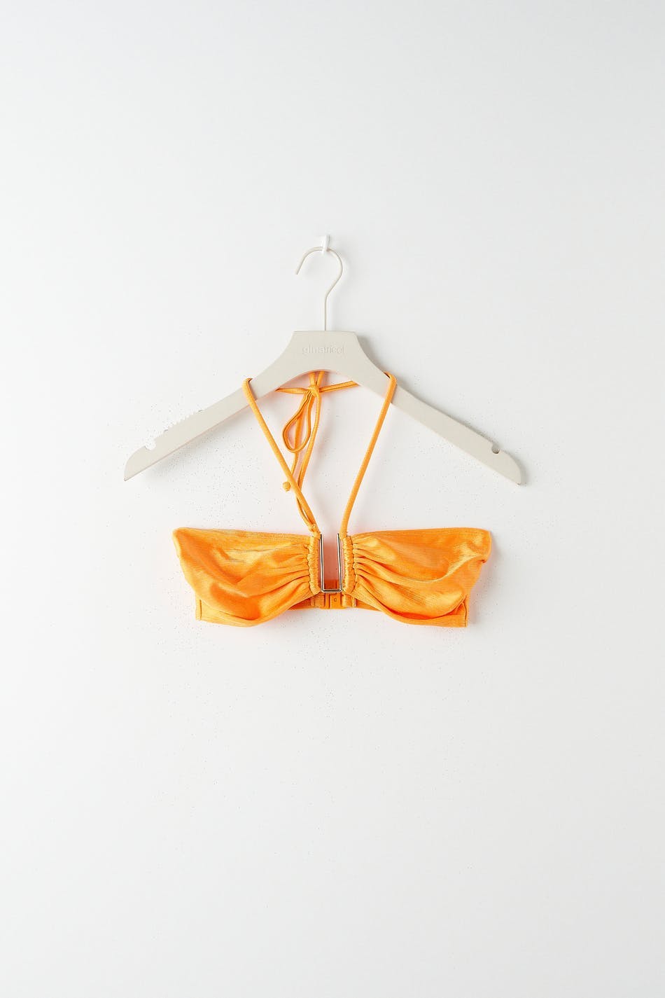 Lined bandeau bikini top with shiny swimsuit material. The bikini top is orange and has halterneck straps with self-tie at neck. It has a metal detail at the front and button placket in the back.