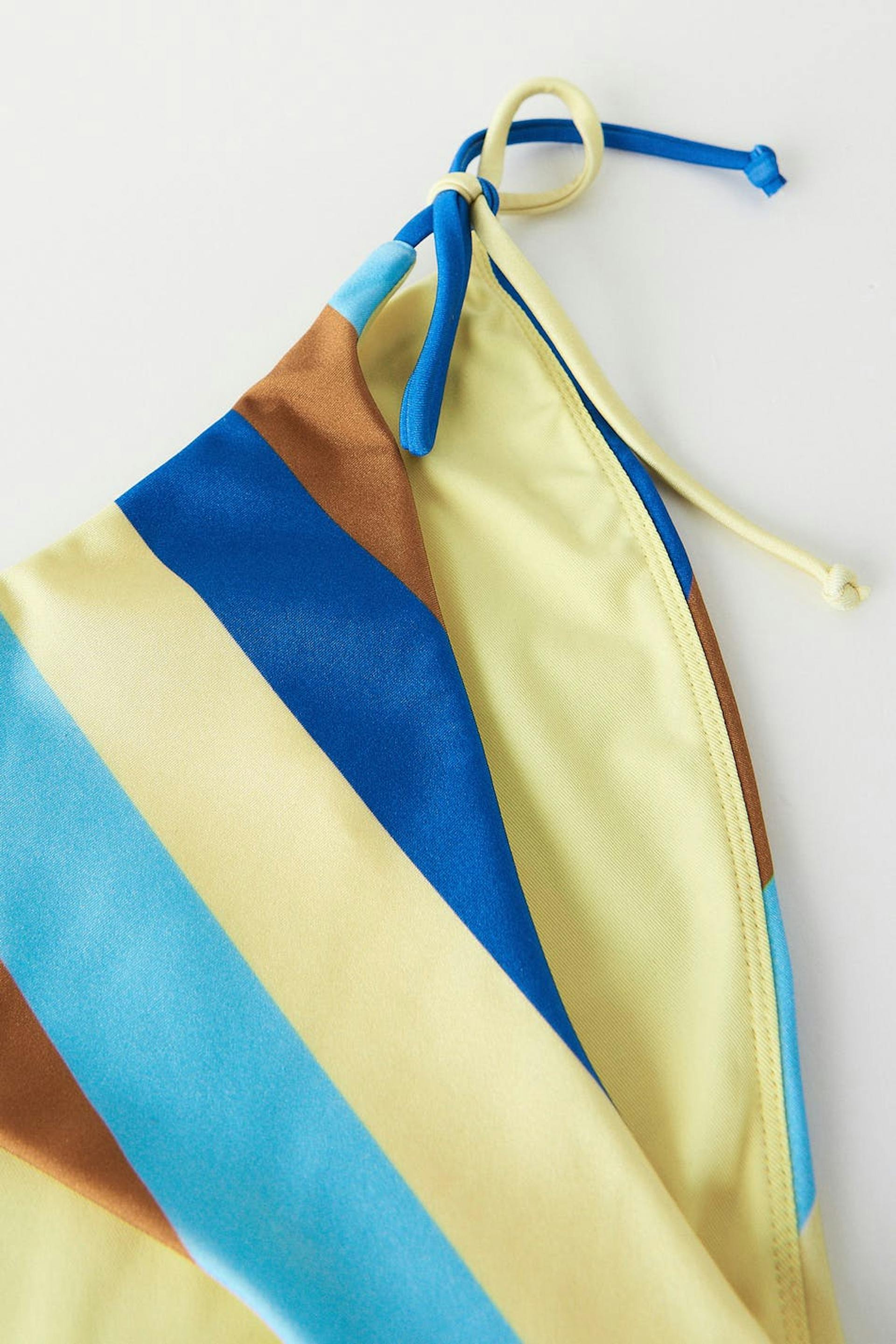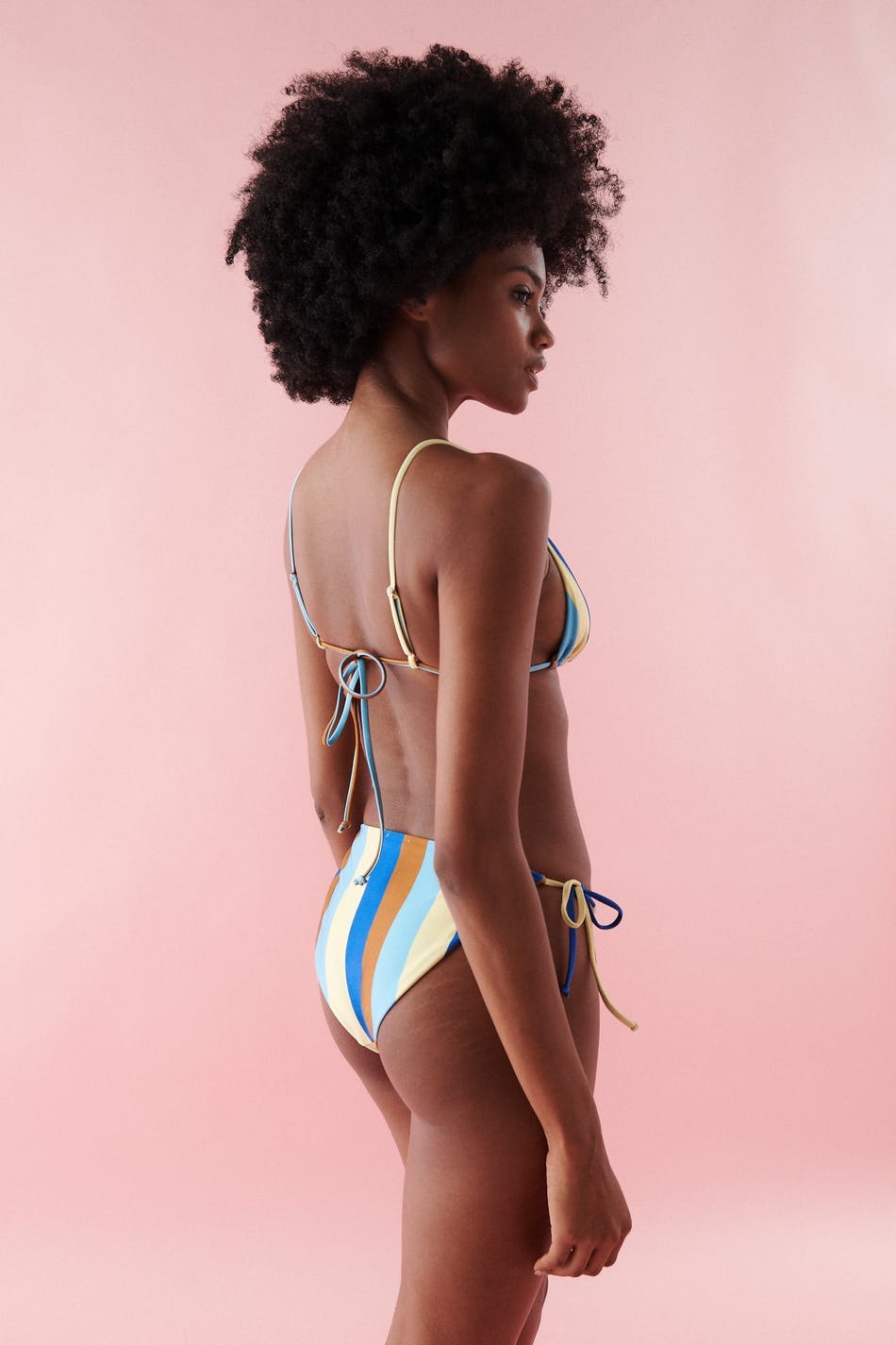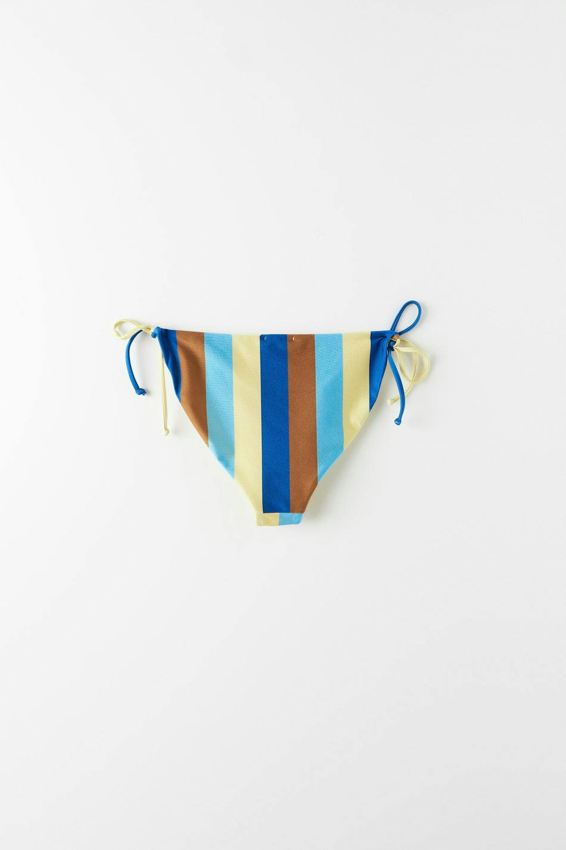 Striped bikini panties with self-tie in the sides. The bikini panties are blue and lined and have an elastic at the waist and on the leg openings.