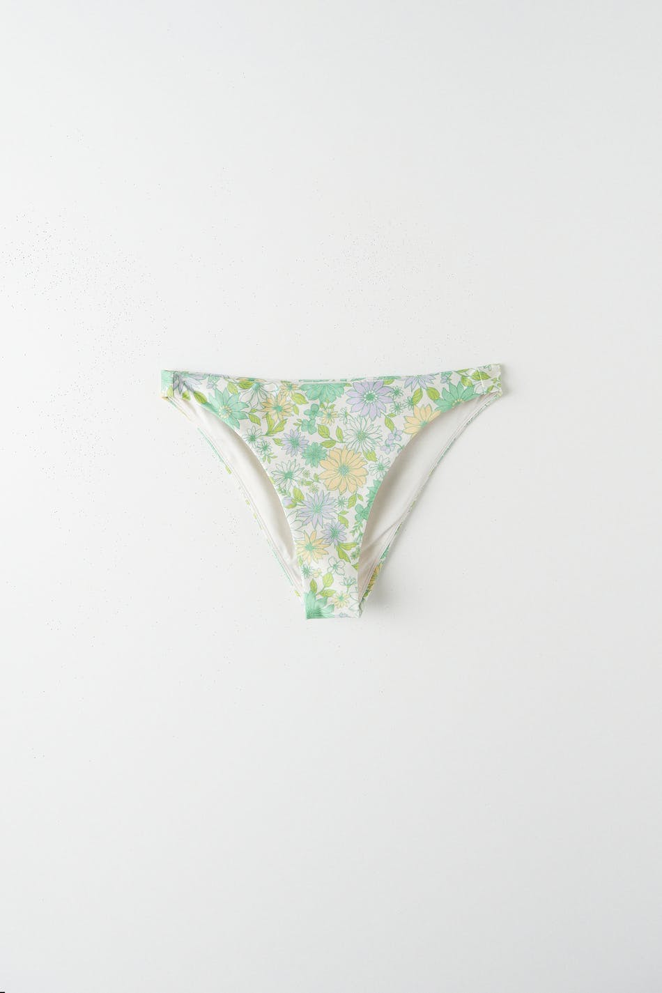 Floral bikini panties with semi shiny swimsuit material. The bikini panties are green and have an elastic at the waist and on the leg openings.