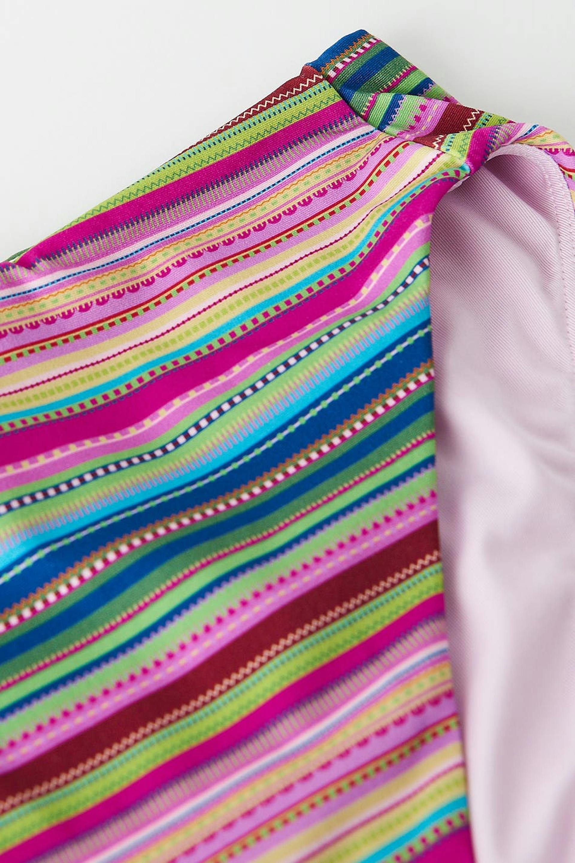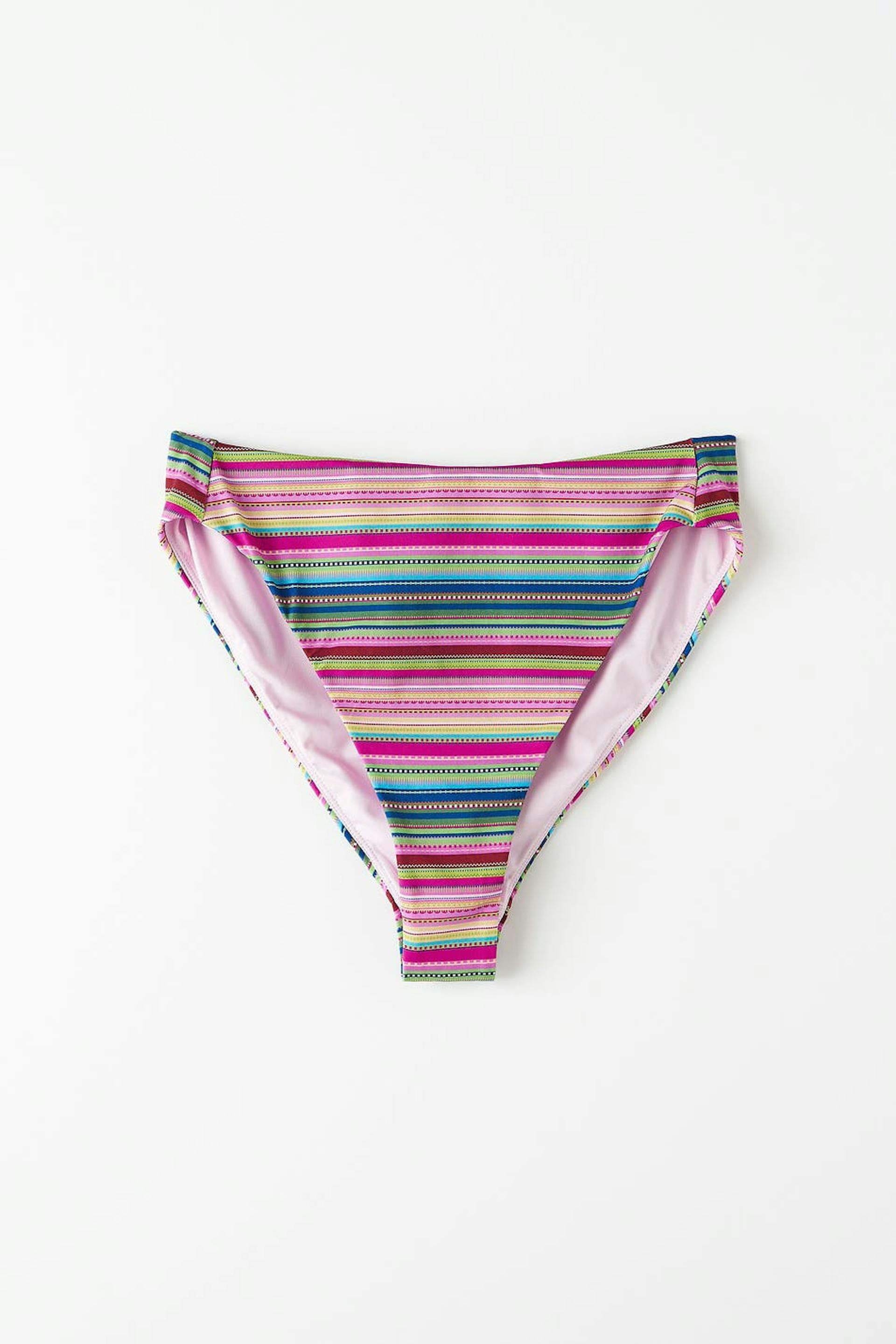 Striped bikini bottoms with high waist. The panties are pink and have matte swimsuit material. They have a soft elastic at the waist and on the leg openings.