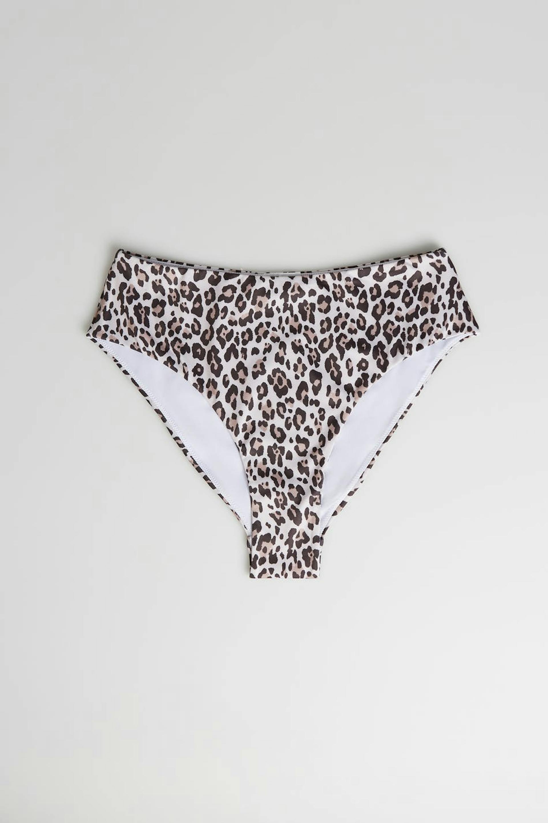 Fully lined bikini bottom with a high waist. The pantie is leopard and has matte swimsuit material. It has an elastic band at the waist and on the leg openings.