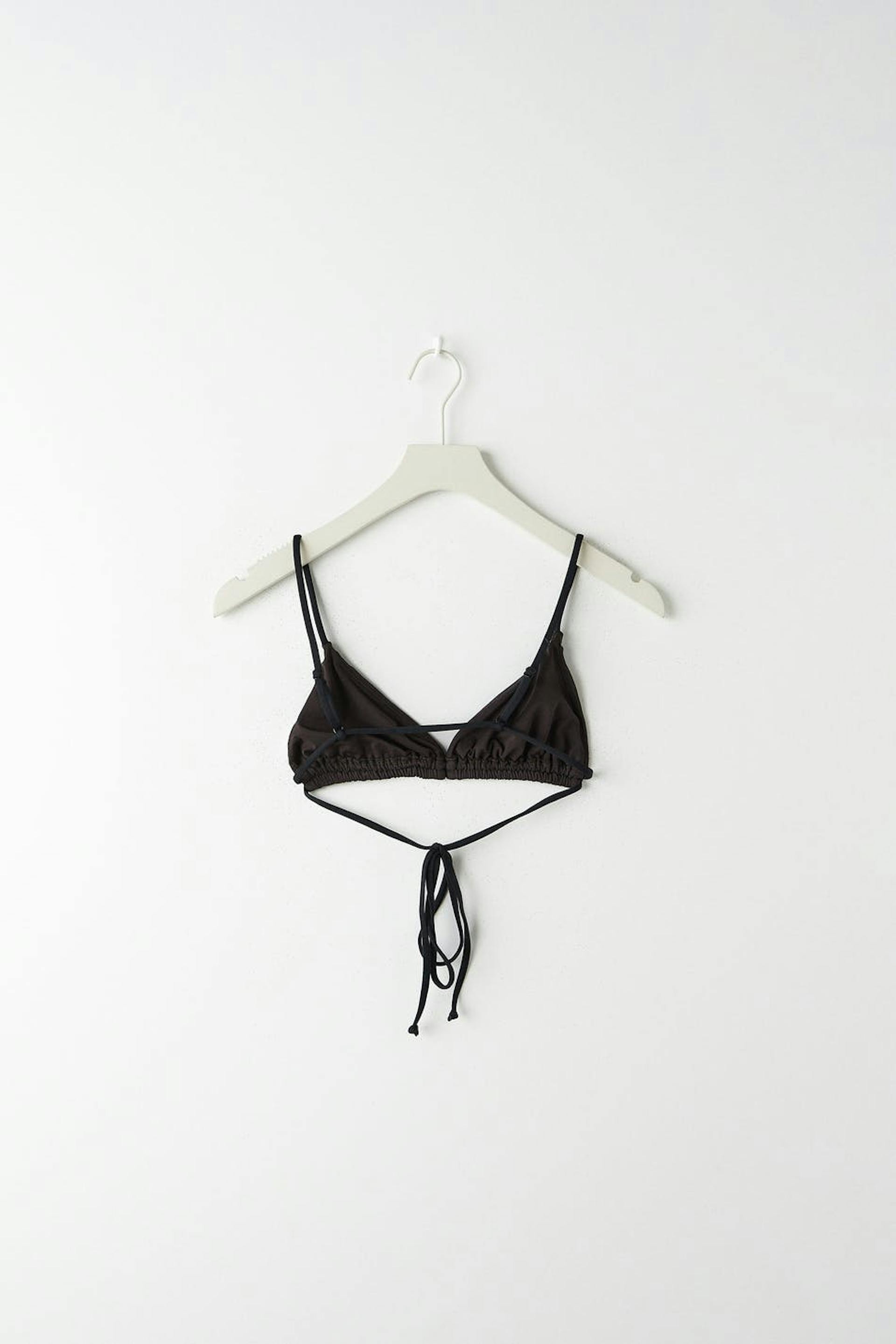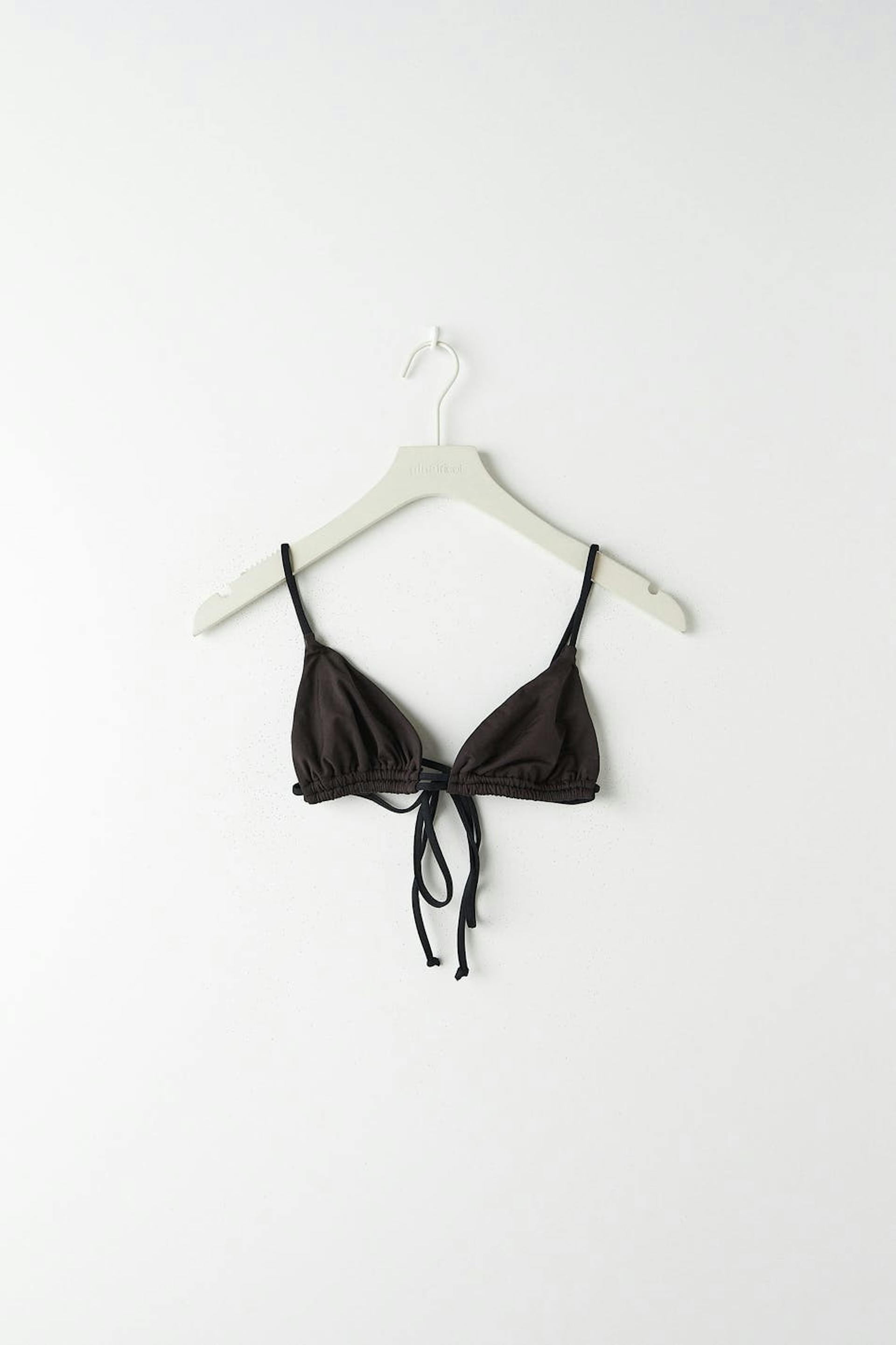 Bikini brief with semi shiny swimsuit material. The bikini brief is brown and has adjustable shoulder straps. It has double bands and a self-tie at the back.