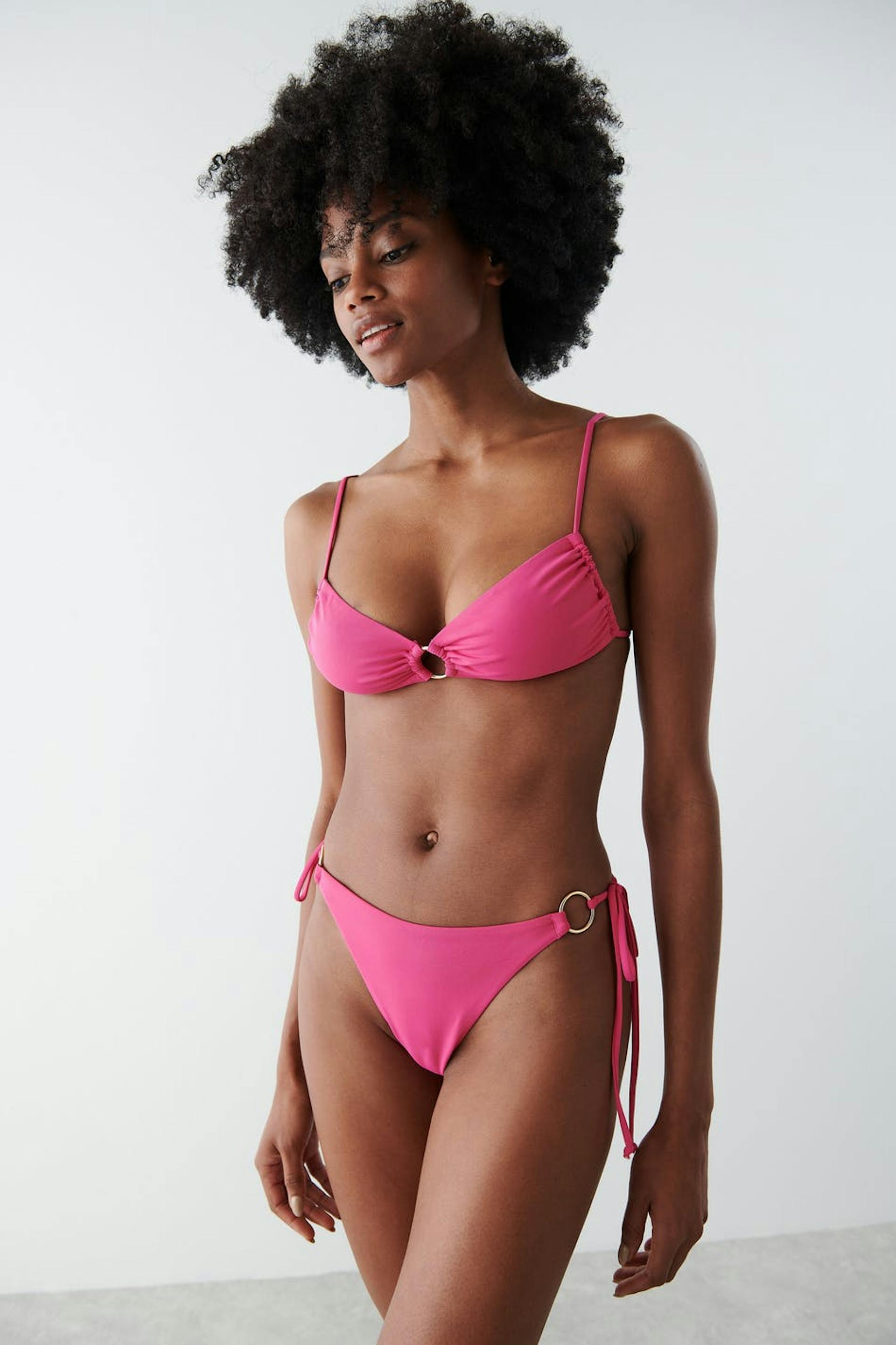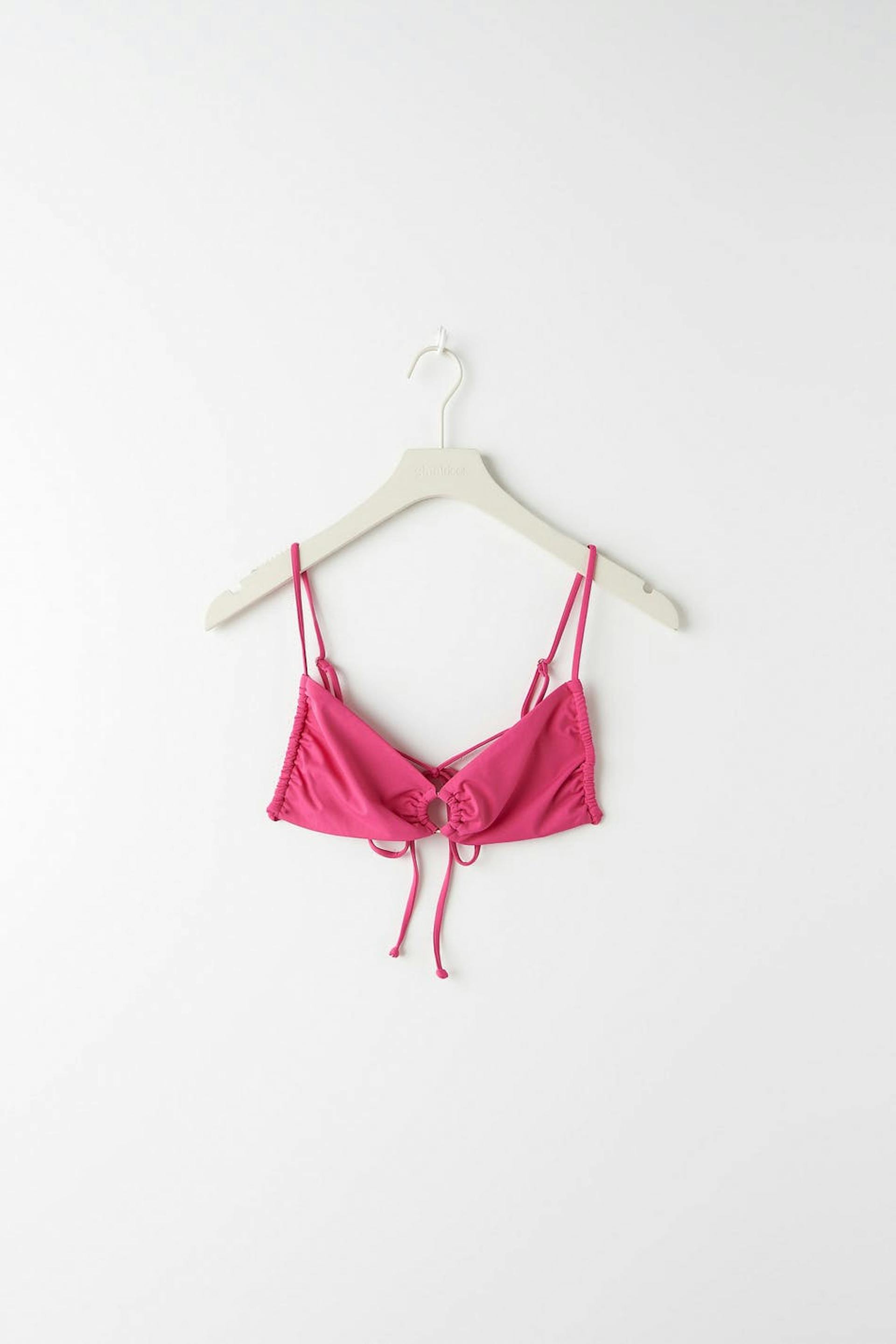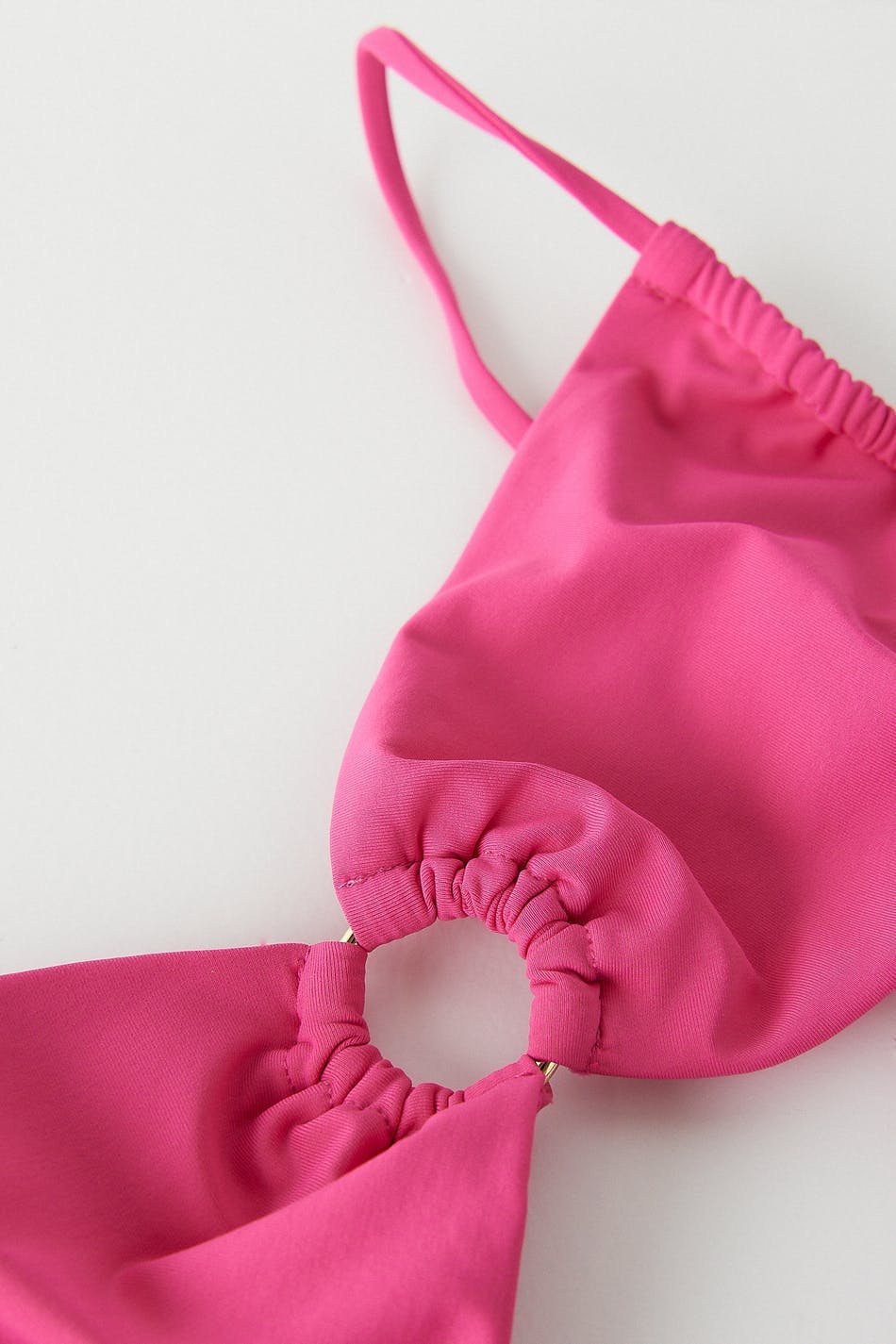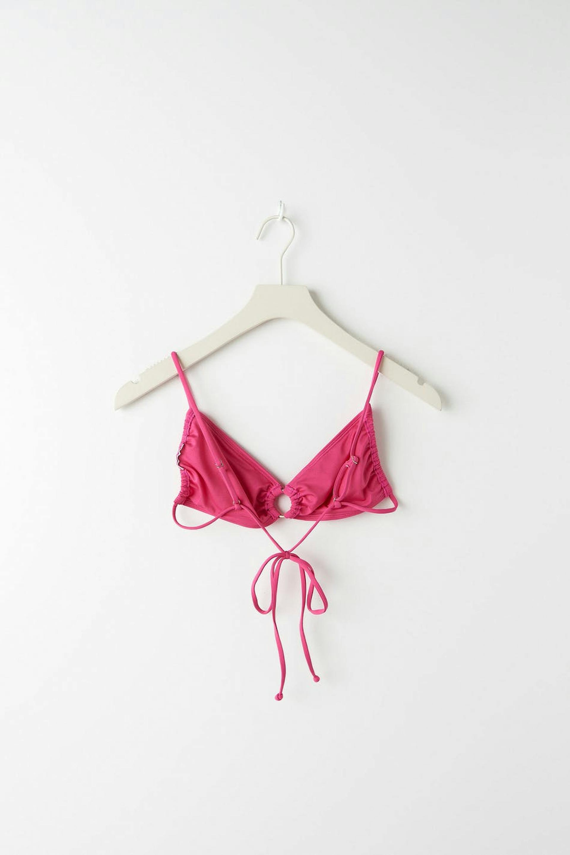 Bikini top with thin, adjustable shoulder straps. The bikini top is pink and has soft swimsuit material. It has self-tie in the back and a detail with a metal ring at the front.