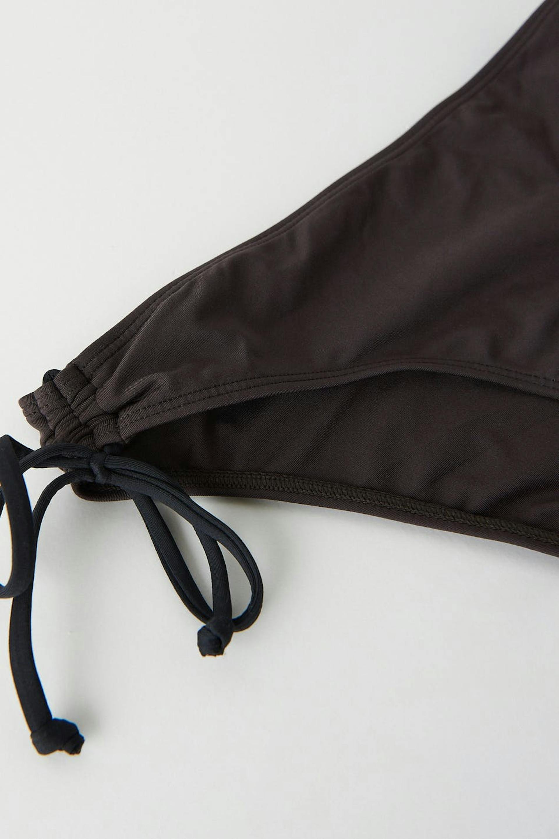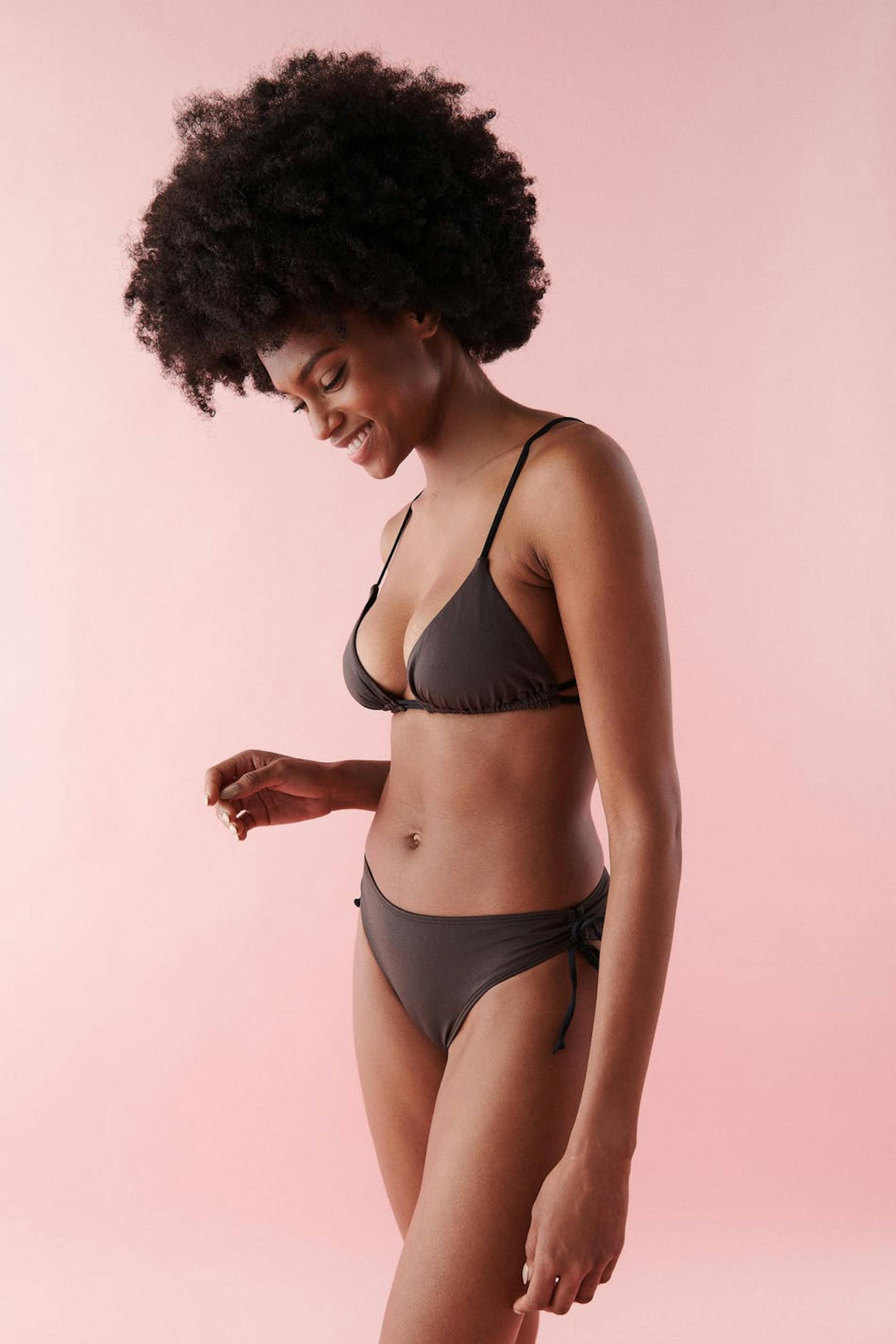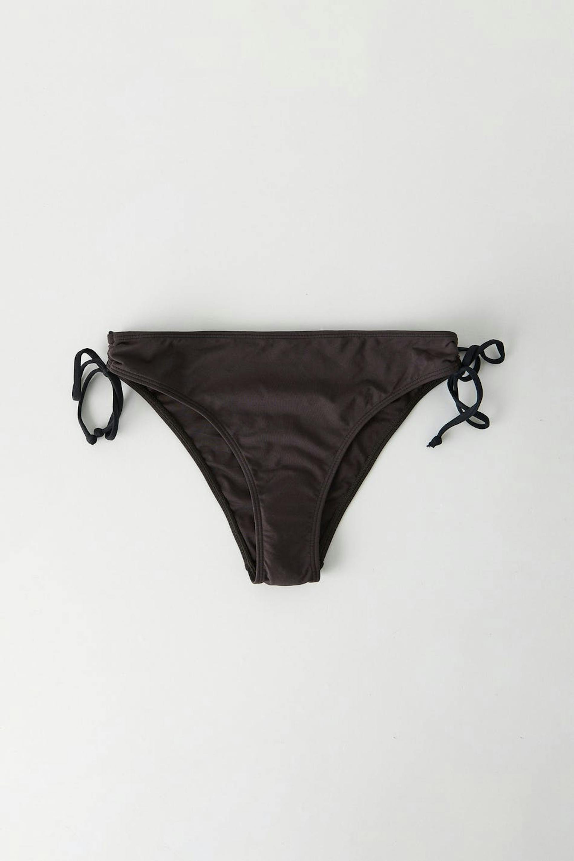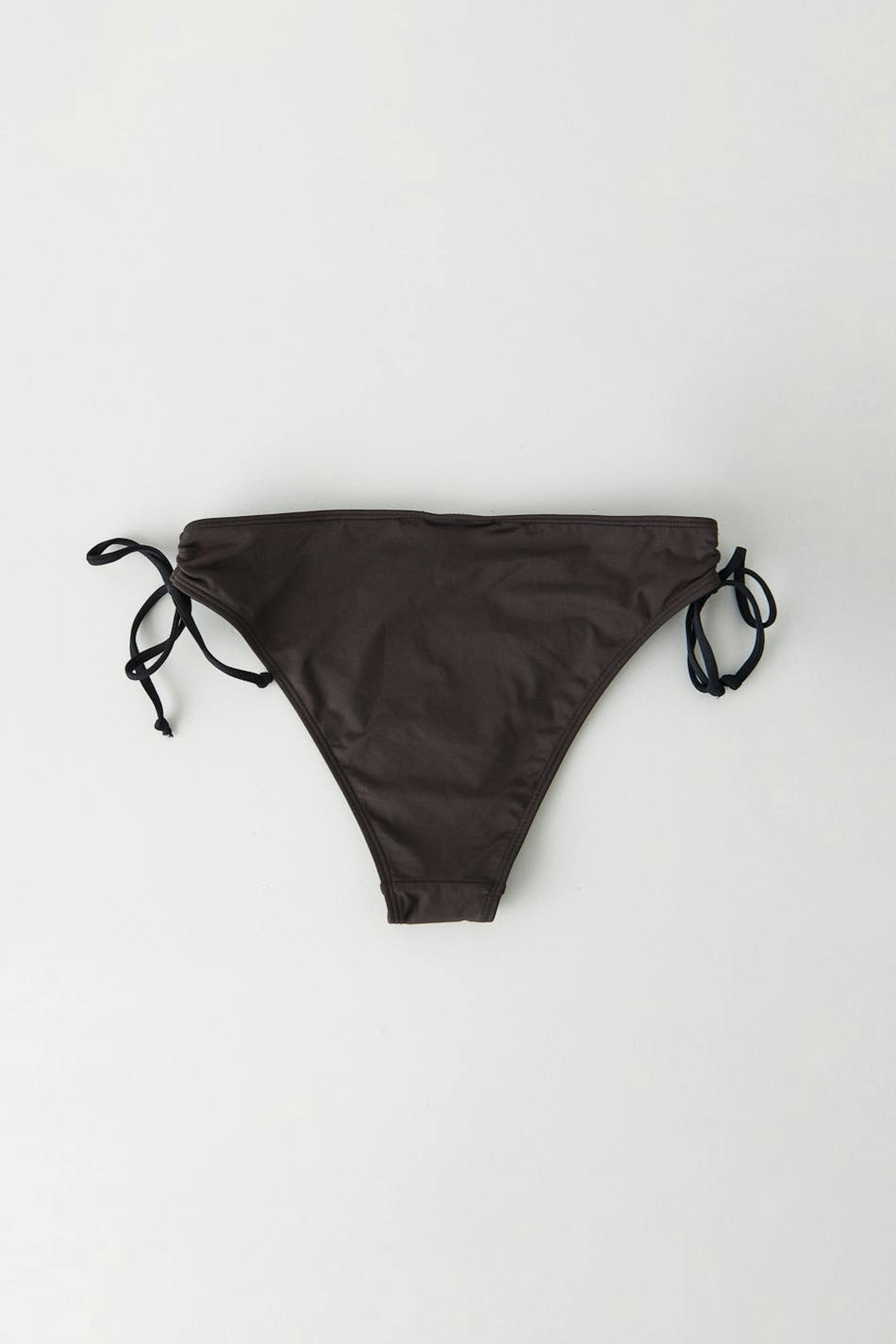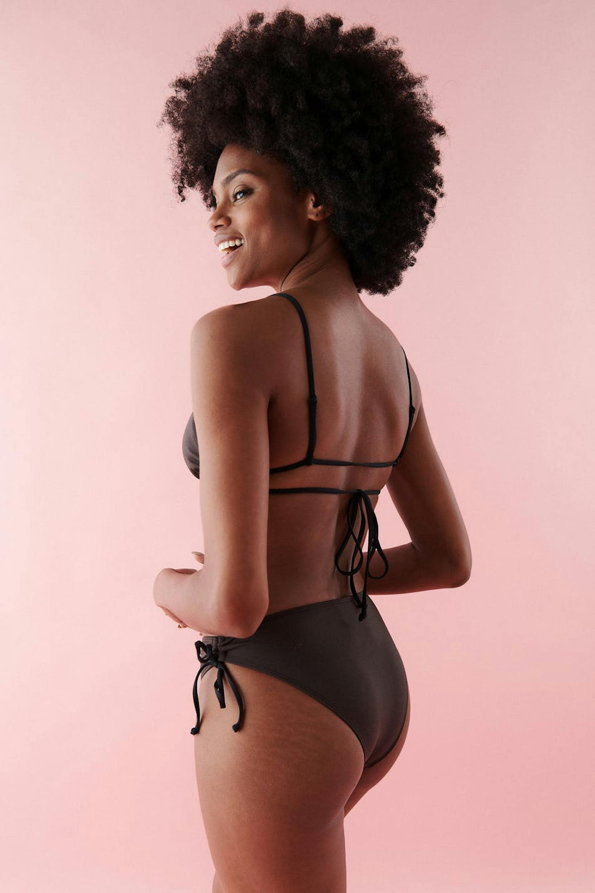 Lined bikini brief with a self-tie on the sides. The bikini brief is brown and has semi shiny swimsuit material. It has a soft elastic on the leg openings and at the waist.