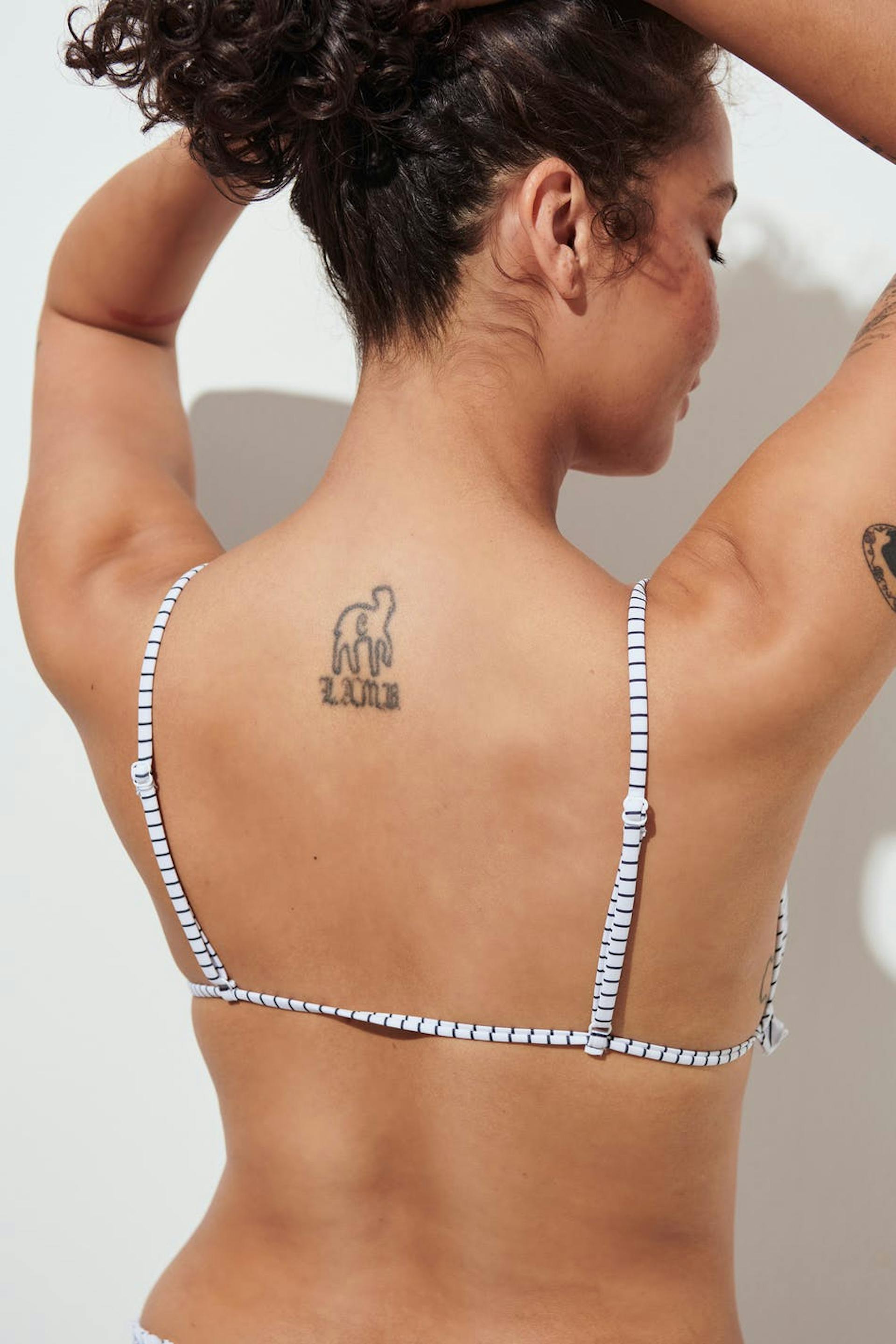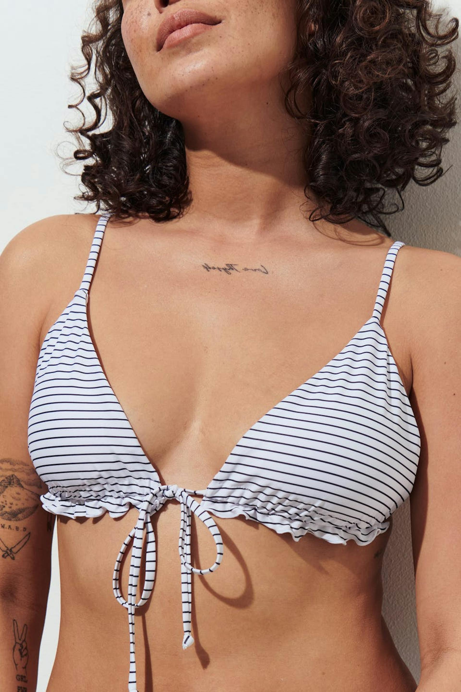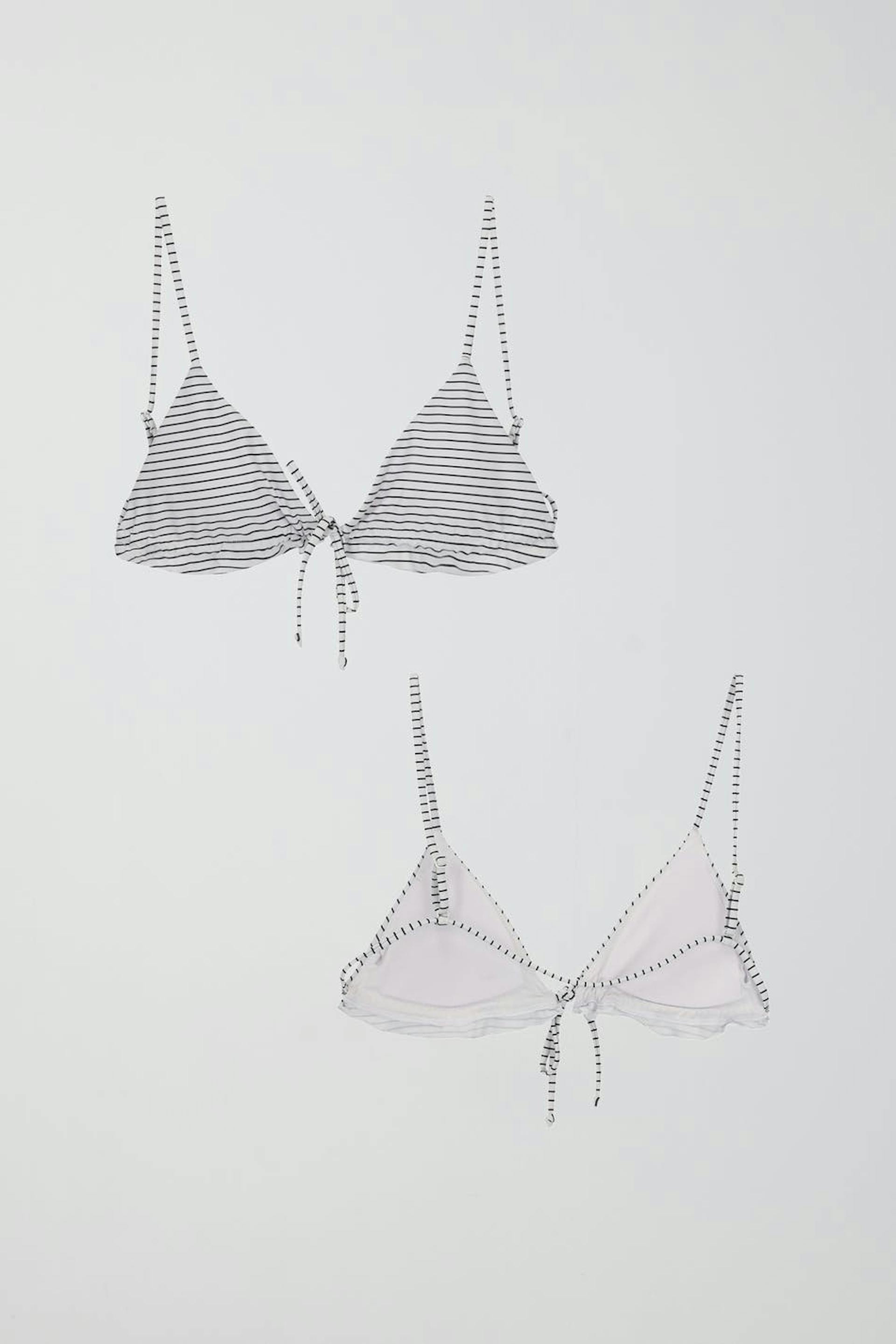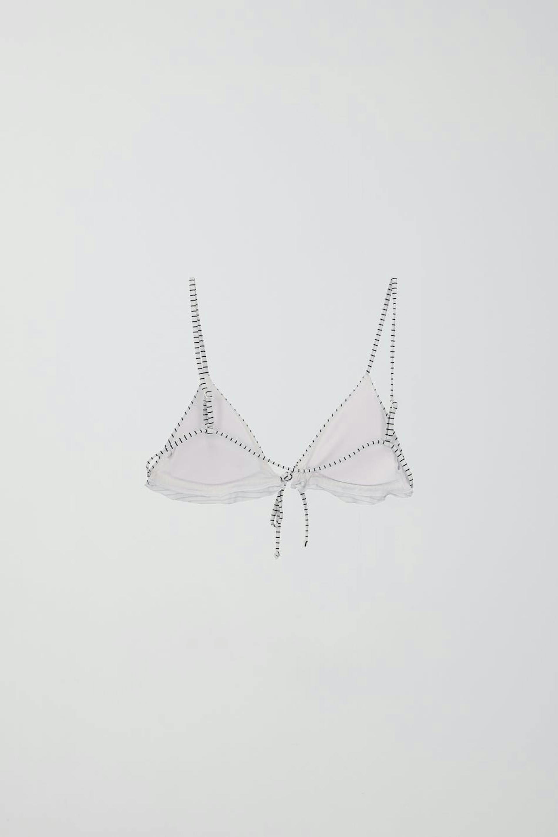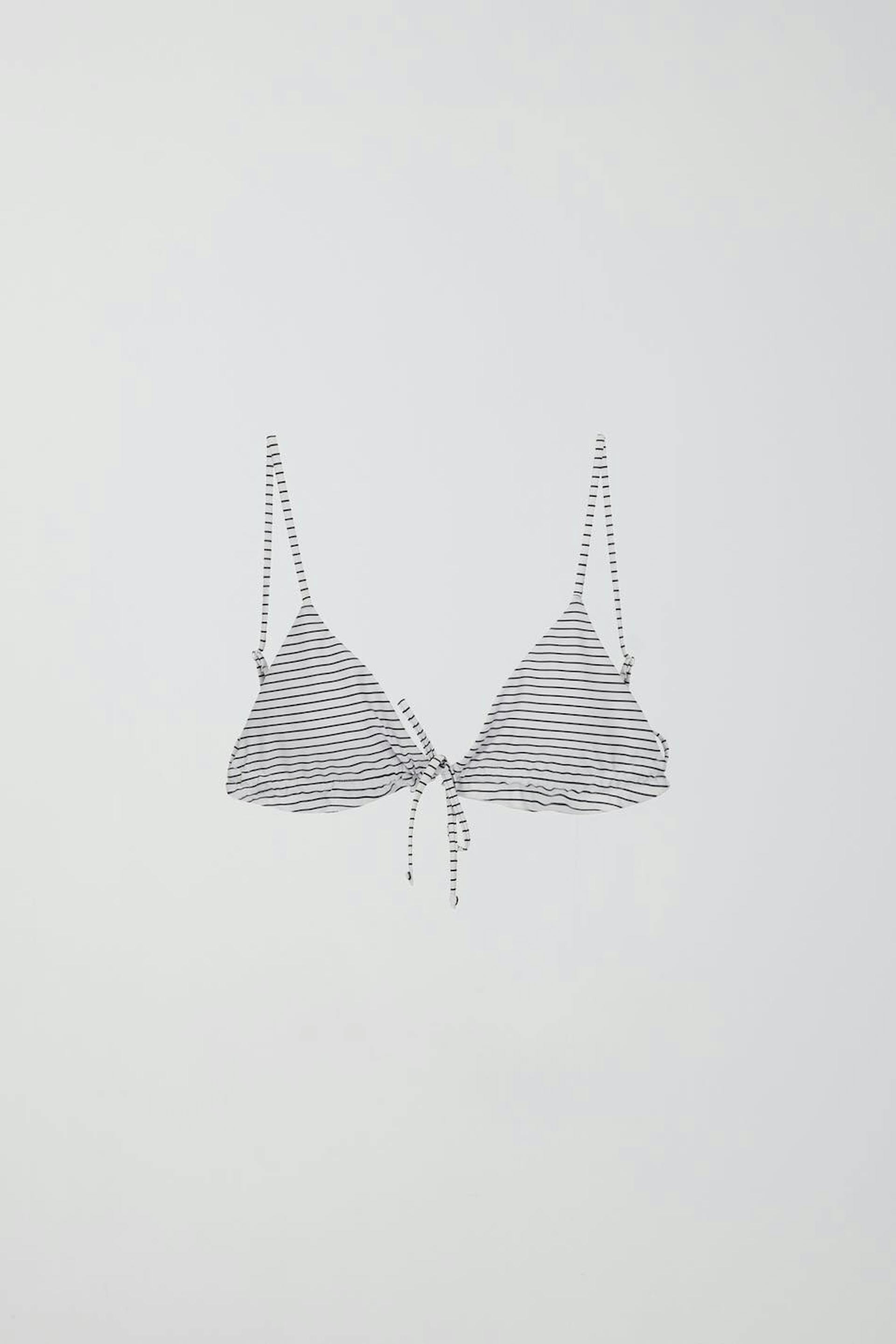 Striped bikini top with a semi shiny, soft material. The bikini top is white, black and triangle. It has adjustable, narrow shoulder straps and frills at the bottom with a self-tie in front.