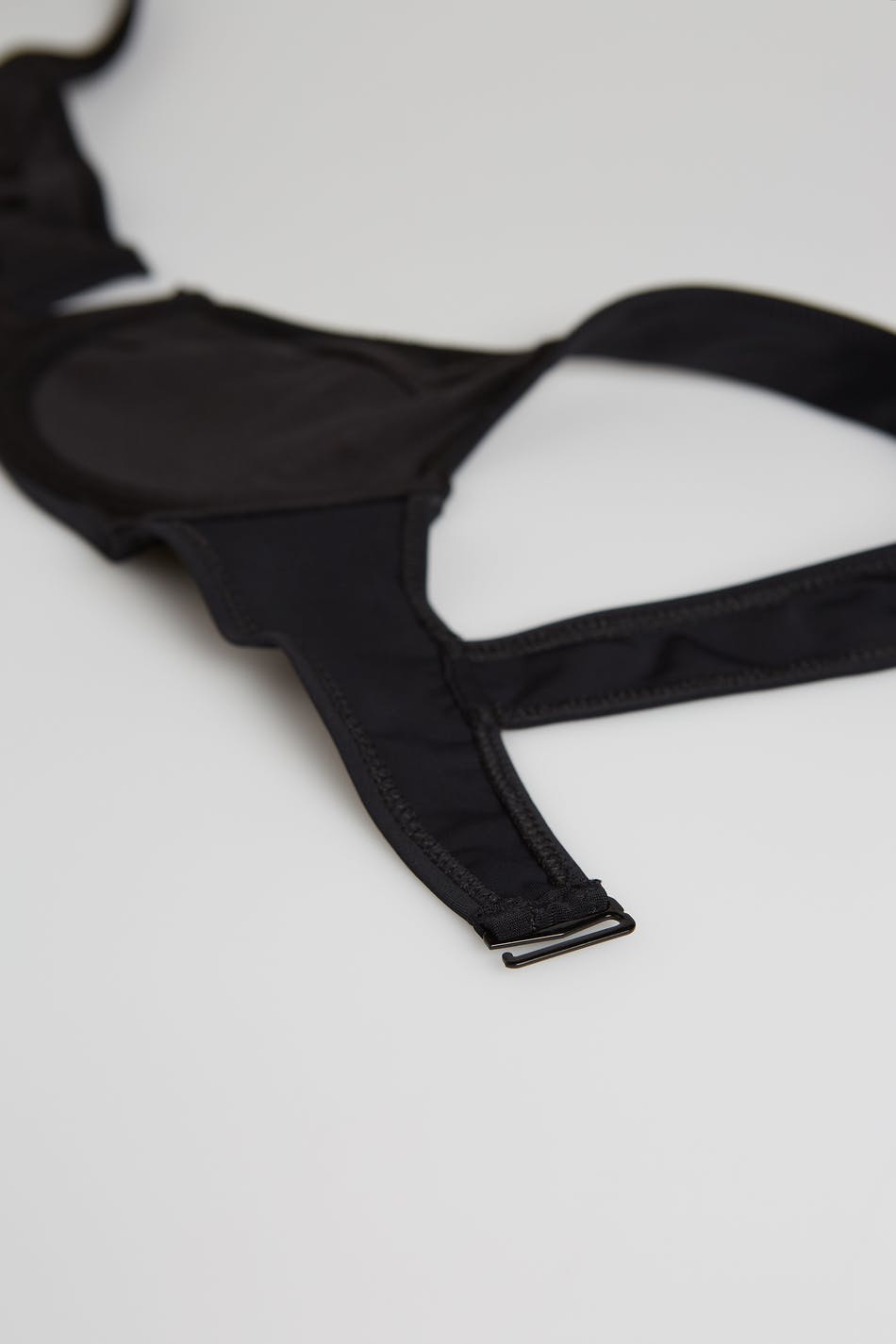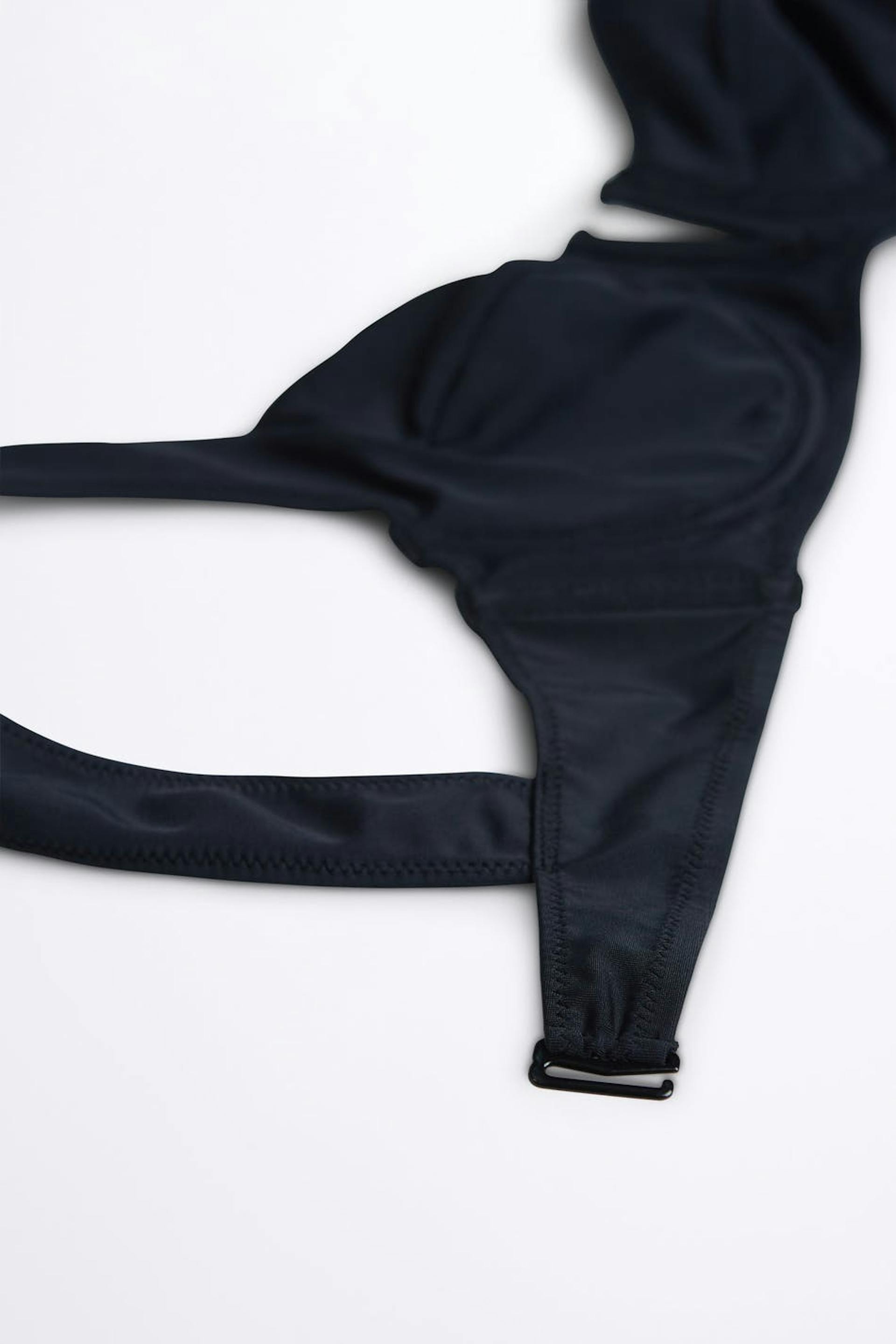 Bikini top with an underwiring. The bikini top is black and has defined cups. It has a clasp in the back.