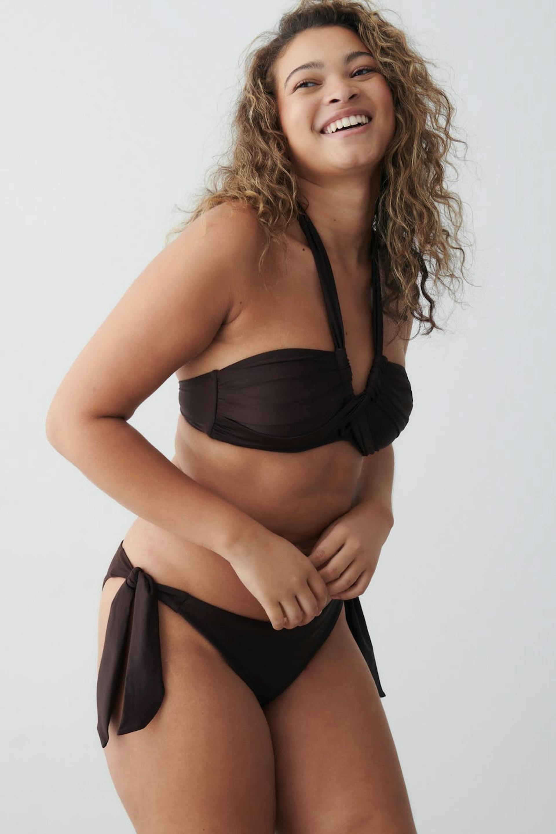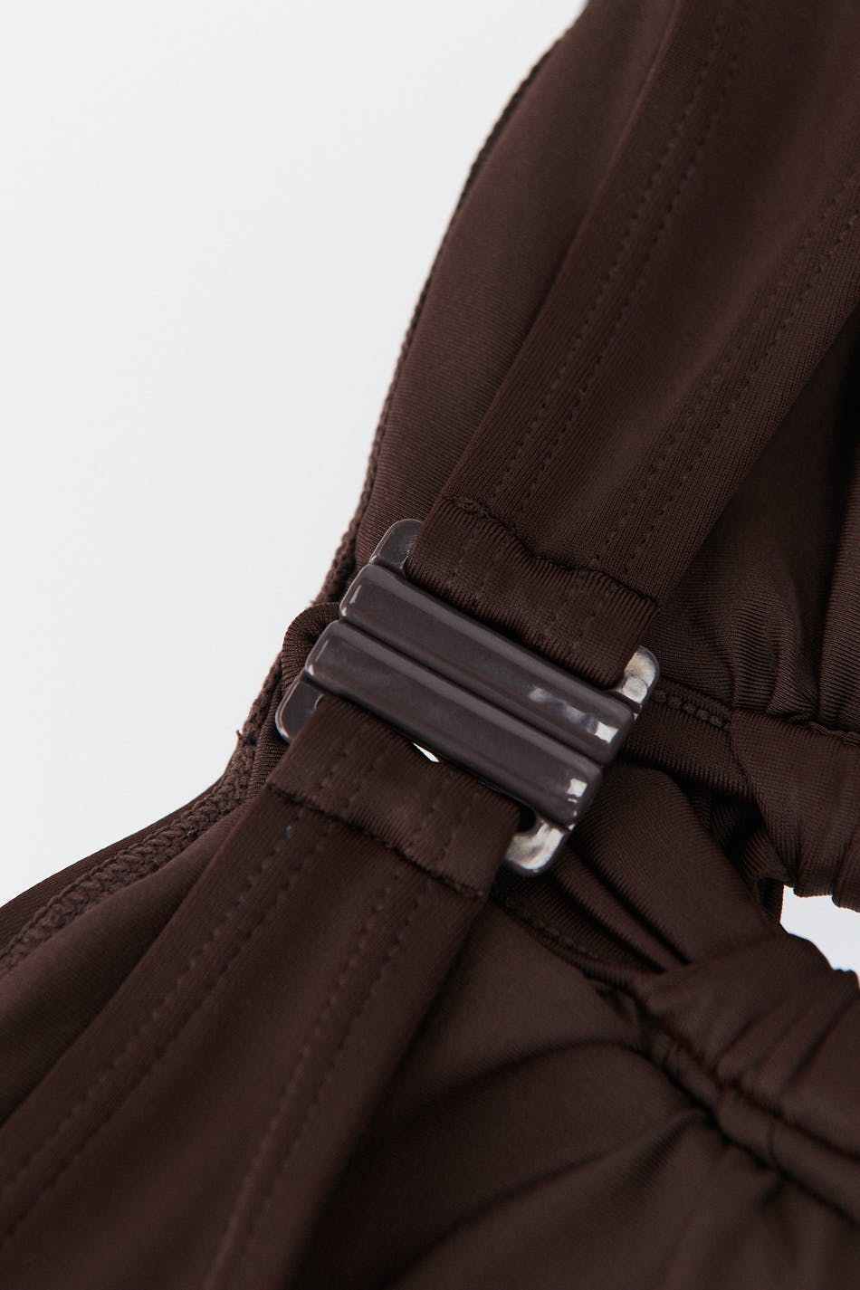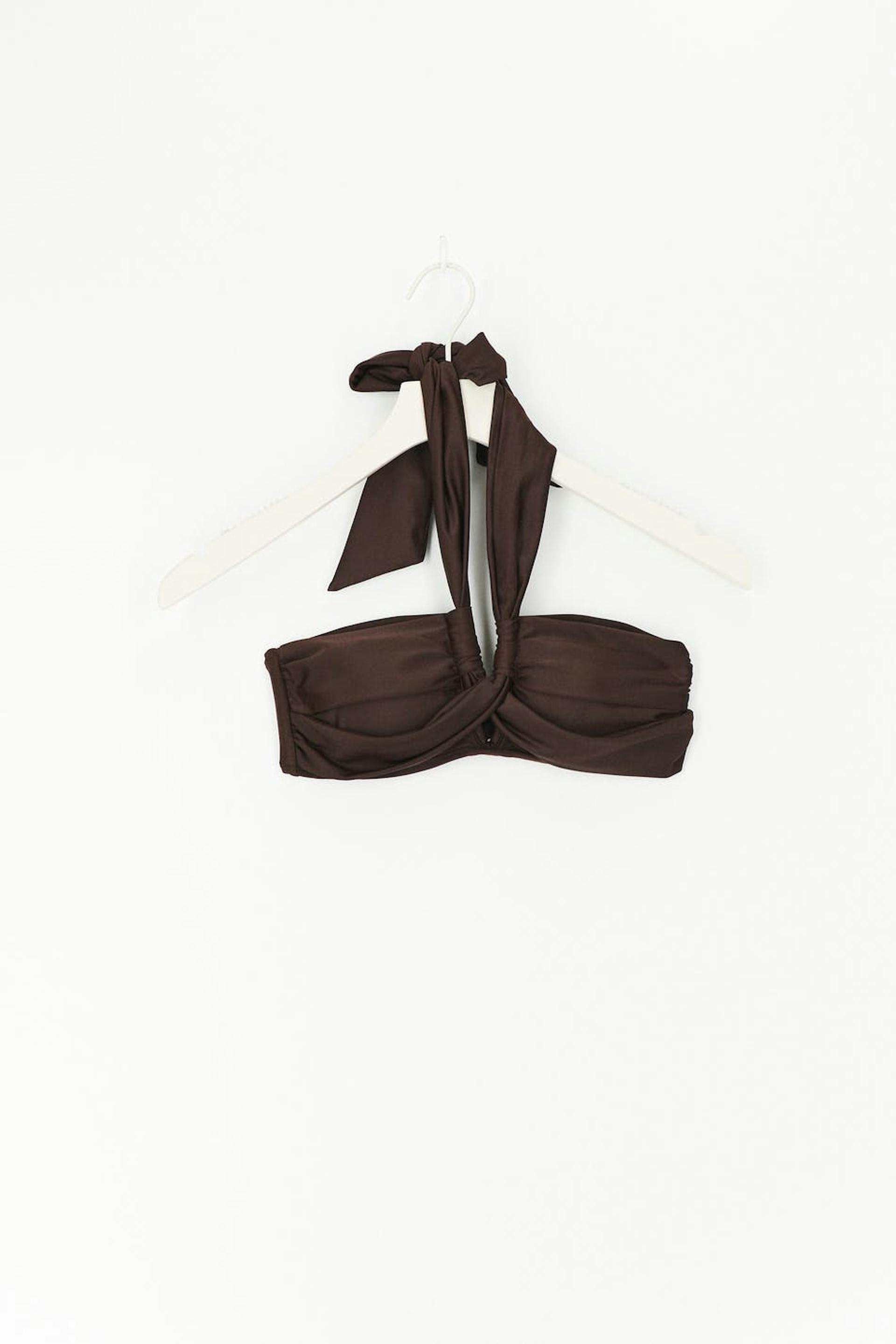 Bikini bra with halterneck design. The bikini top is brown and has clasp in the back. It has criss crossed halterneck straps at the front and self-tie at neck.