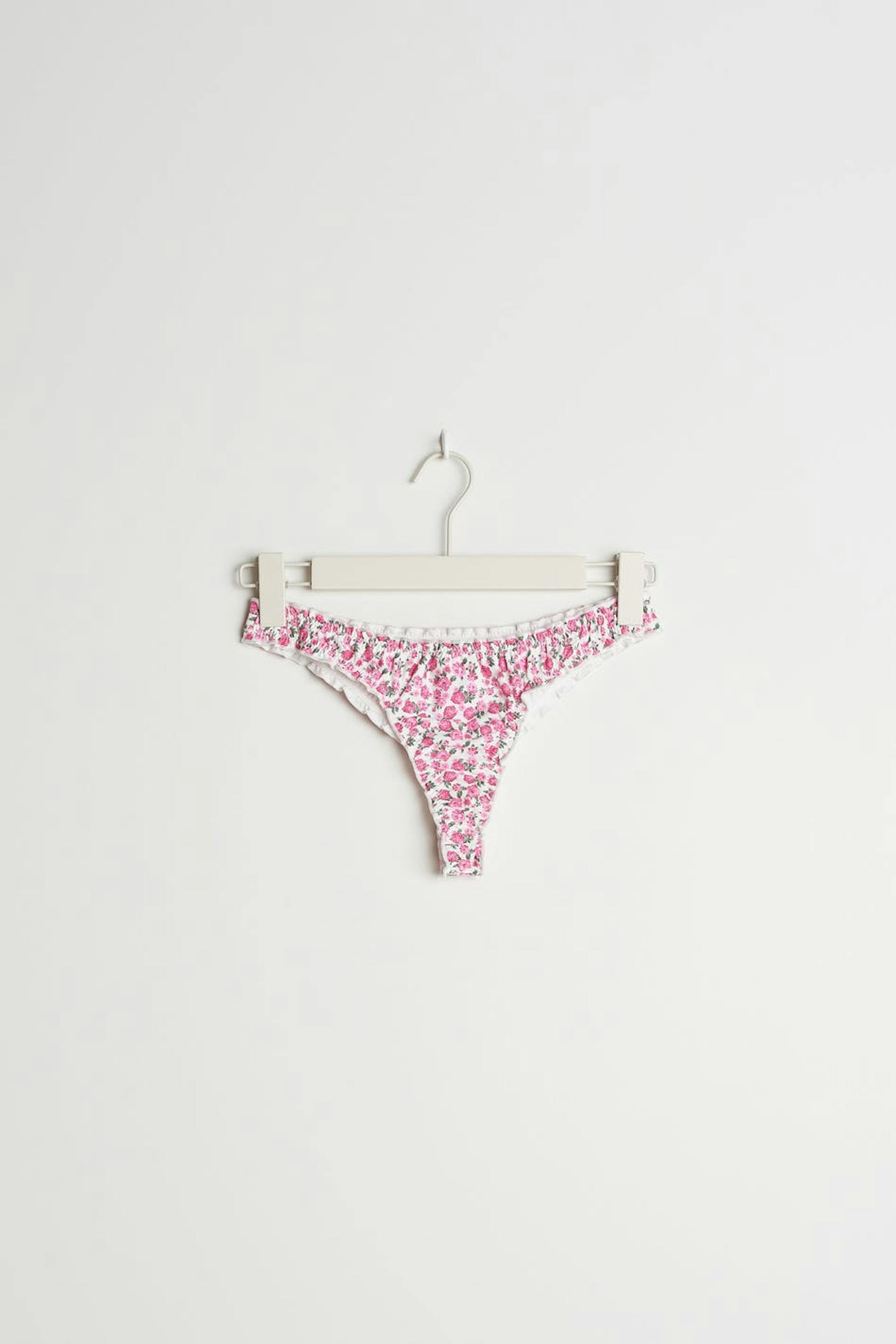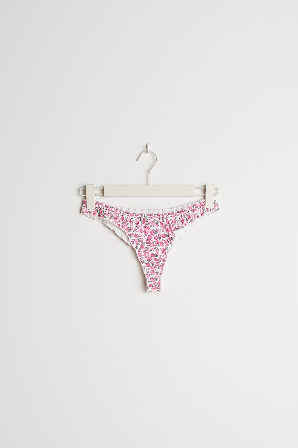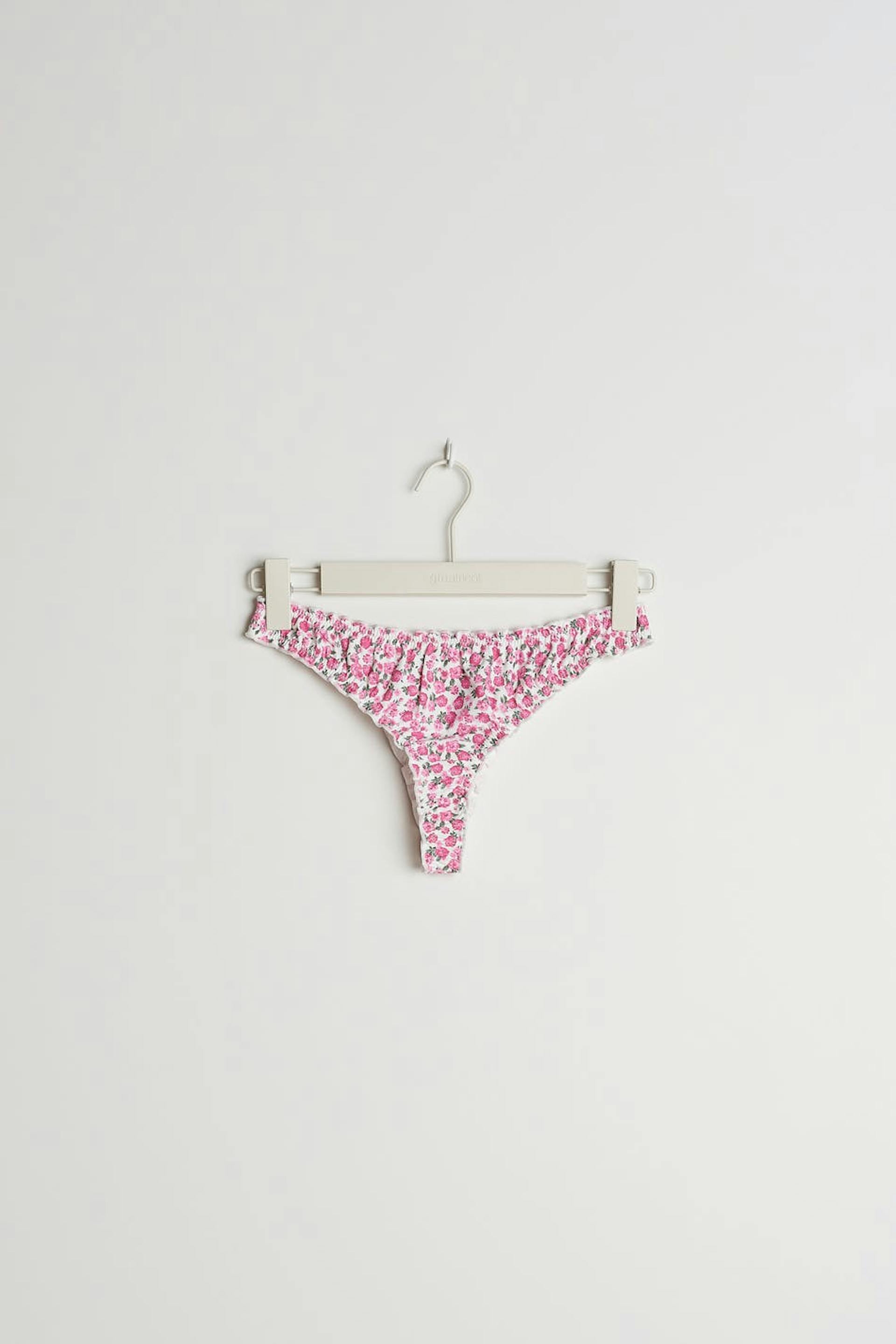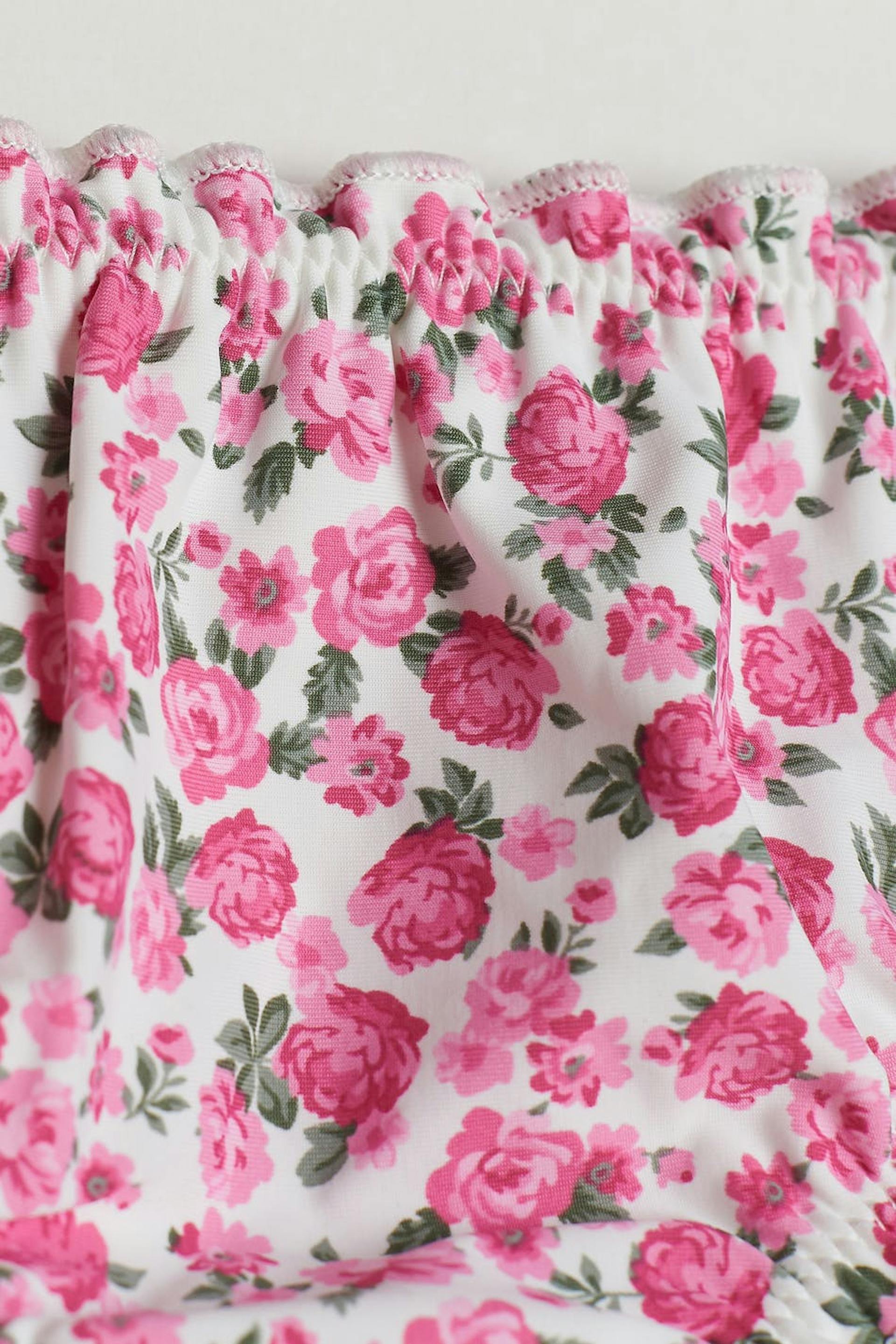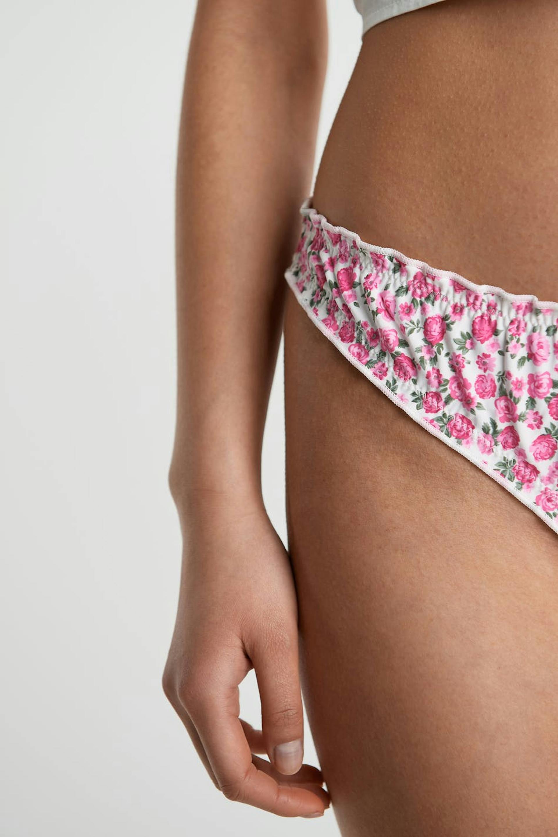 Bikini bottom with a floral, pink pattern. The pantie has swimsuit material. It has a soft elastic band at the waist and on the leg openings.