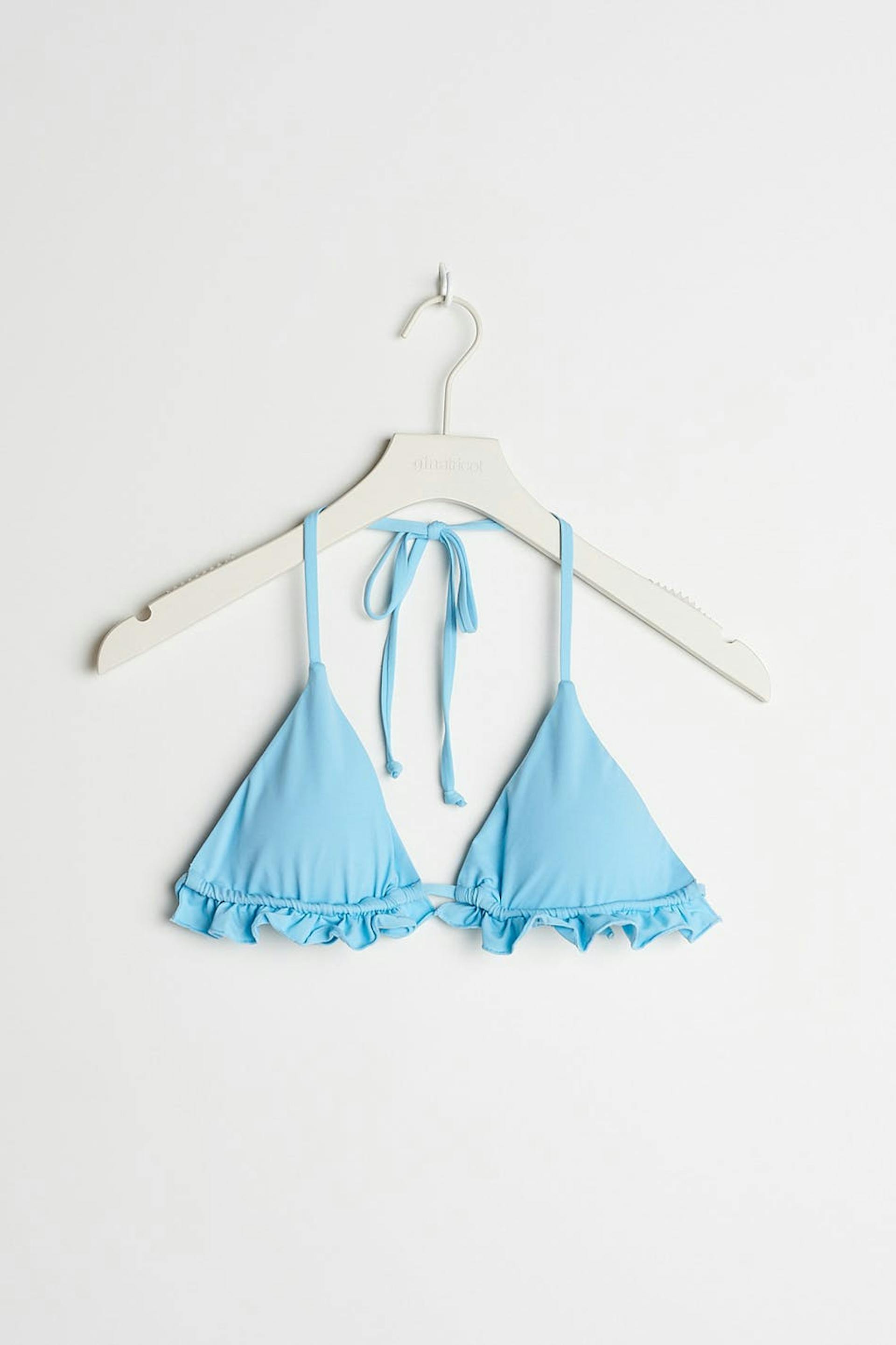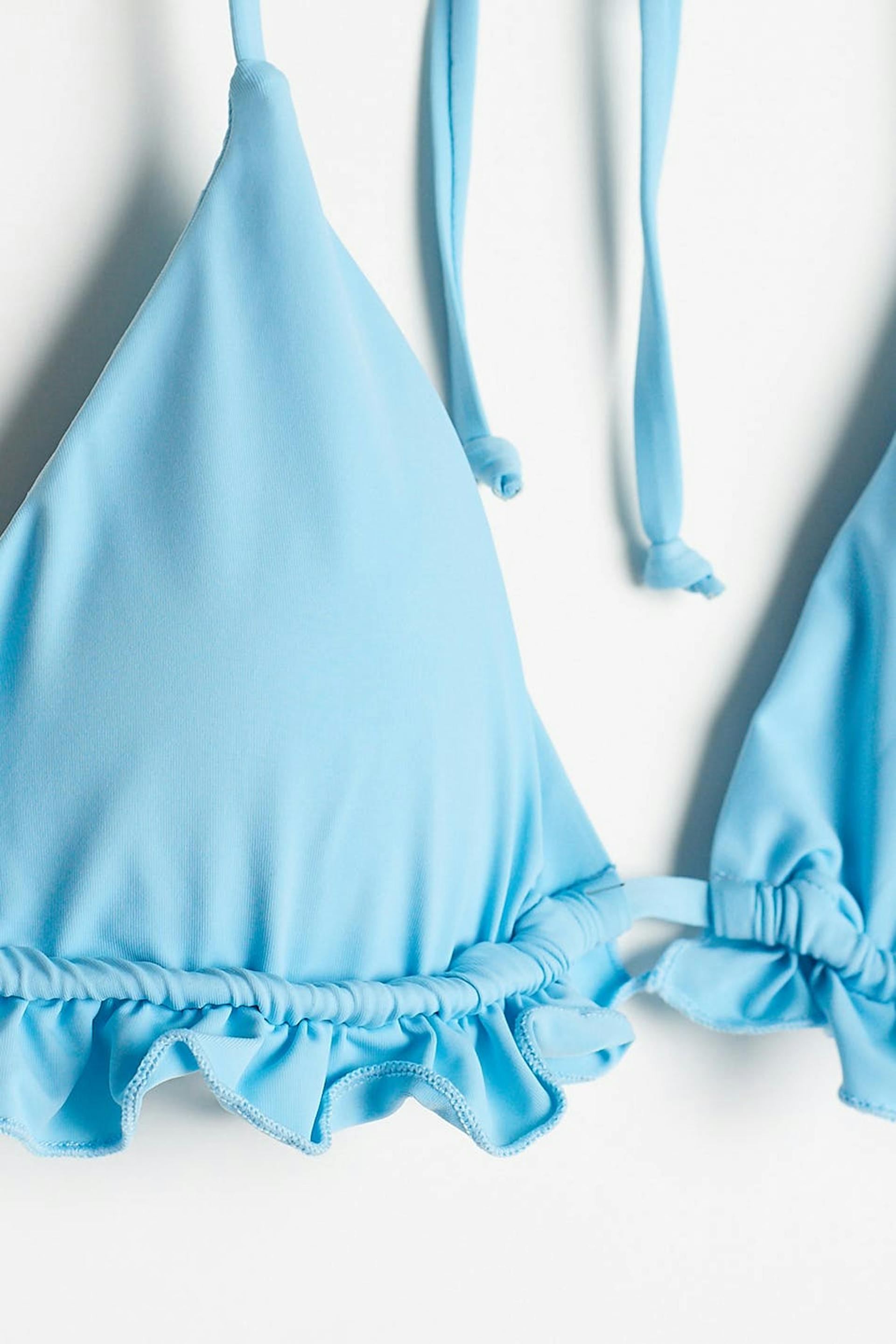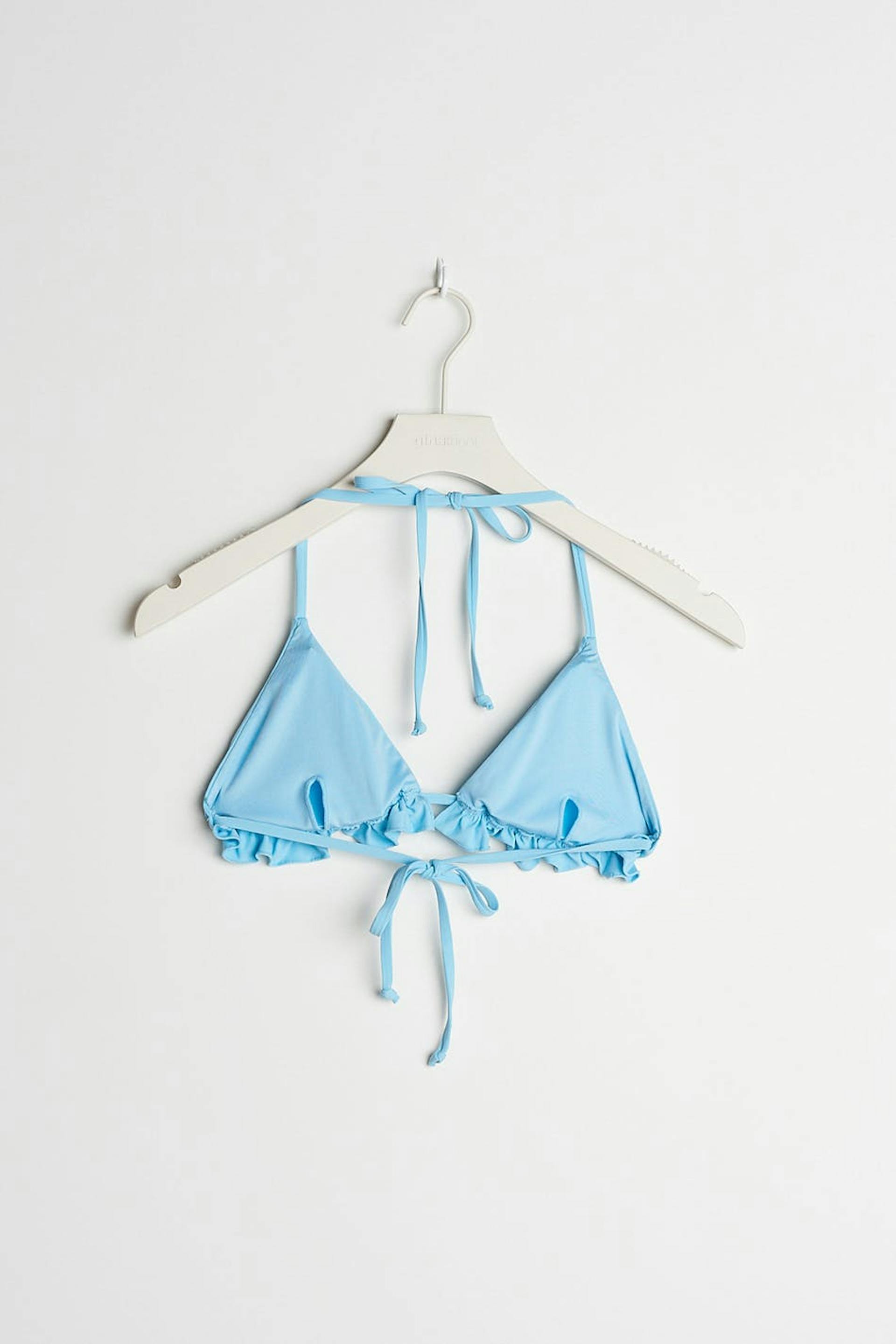 Triangle bikini top with a self-tie at the neck and in the back. The bikini top is blue and has removable, soft padding. It has cups with a flounce at the hem.