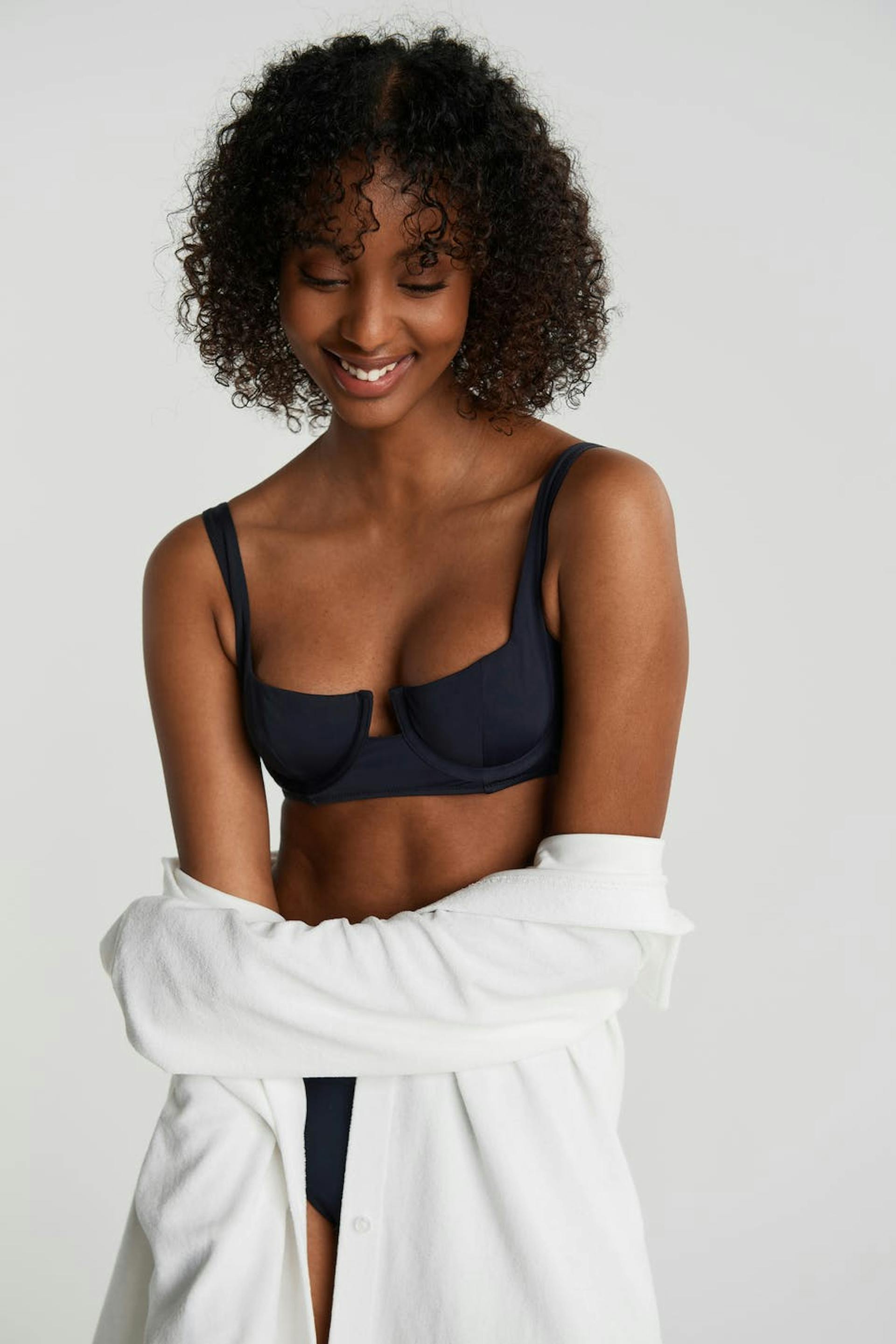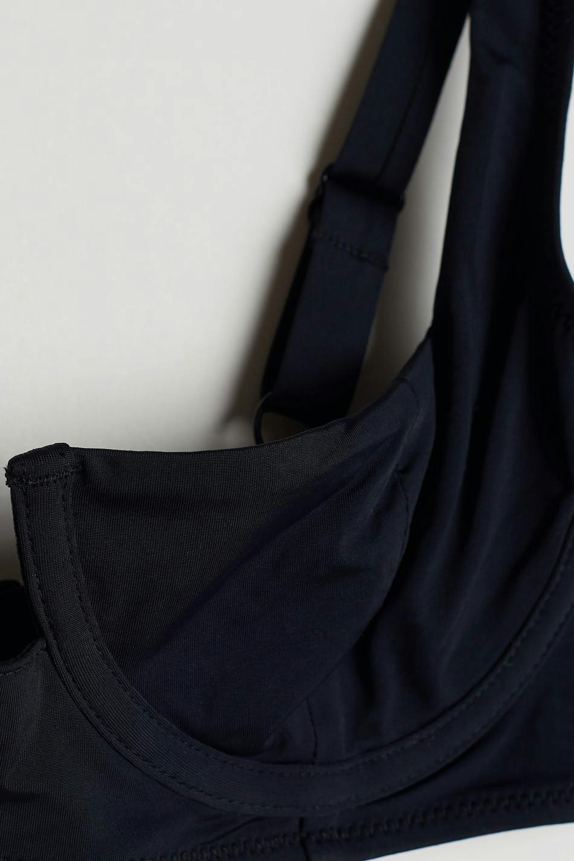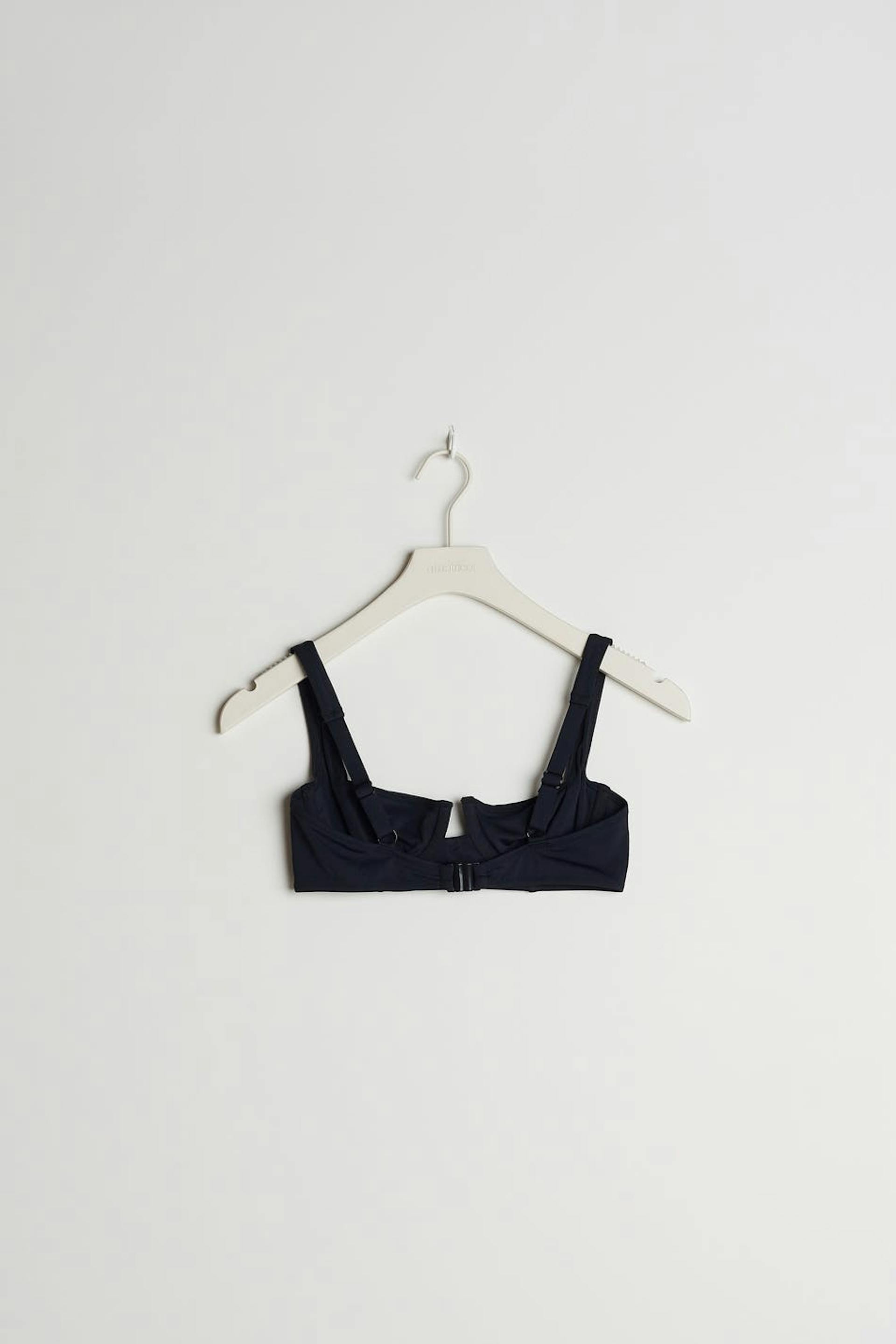 Bikini bra with defined cups with underwire. The bikini top is black and has adjustable shoulder straps. It has a clasp in the back.