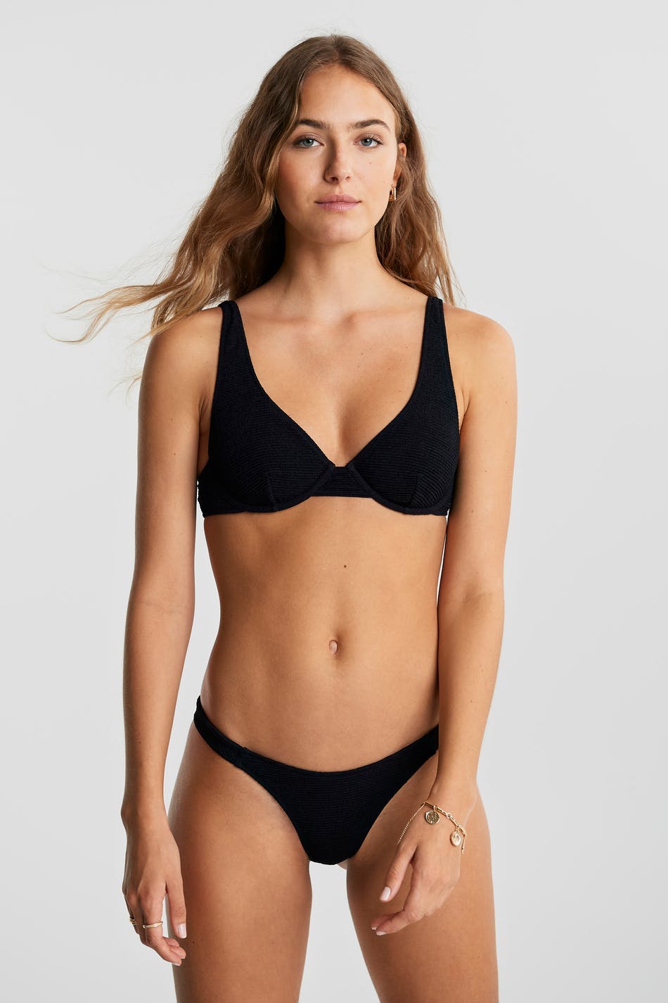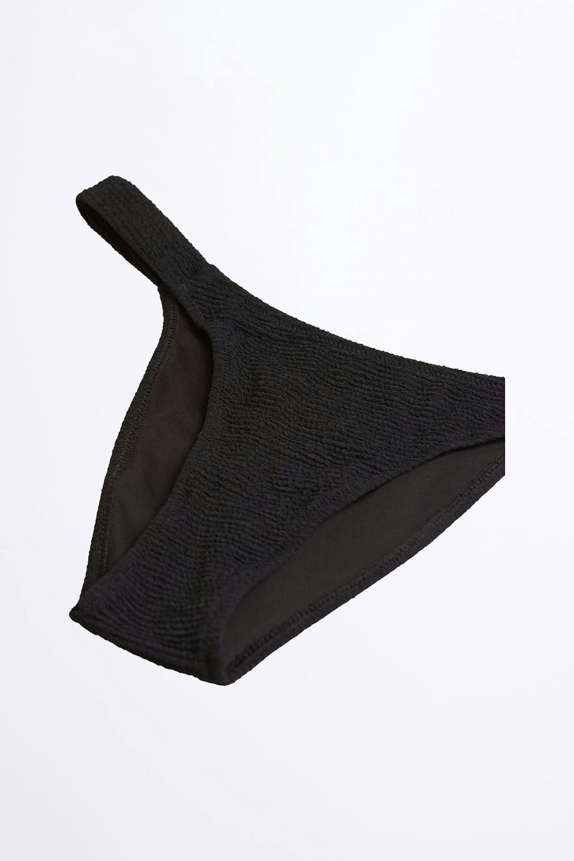 Bikini bottom with swimsuit material. The pantie is black and has a soft elastic band on the leg openings.