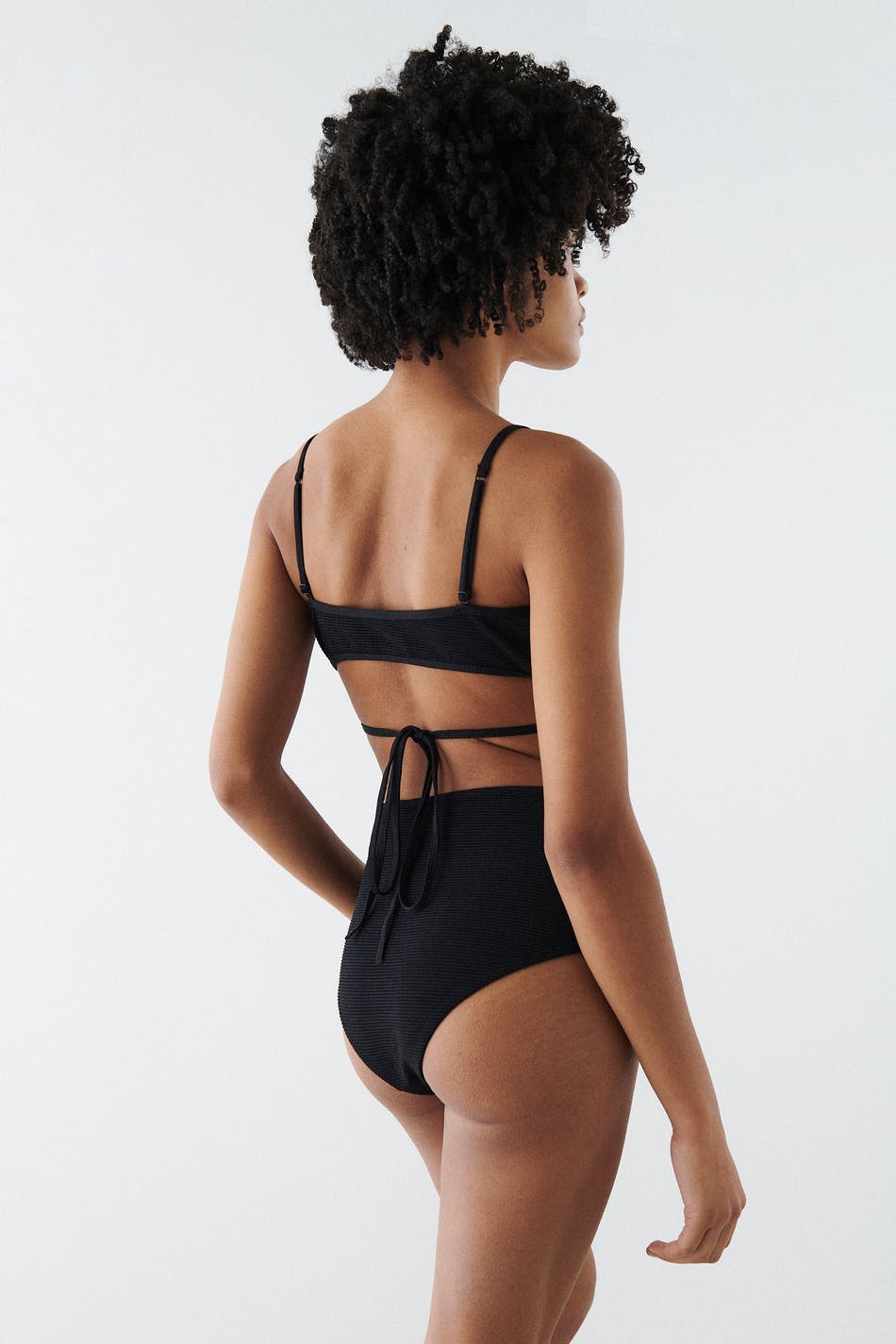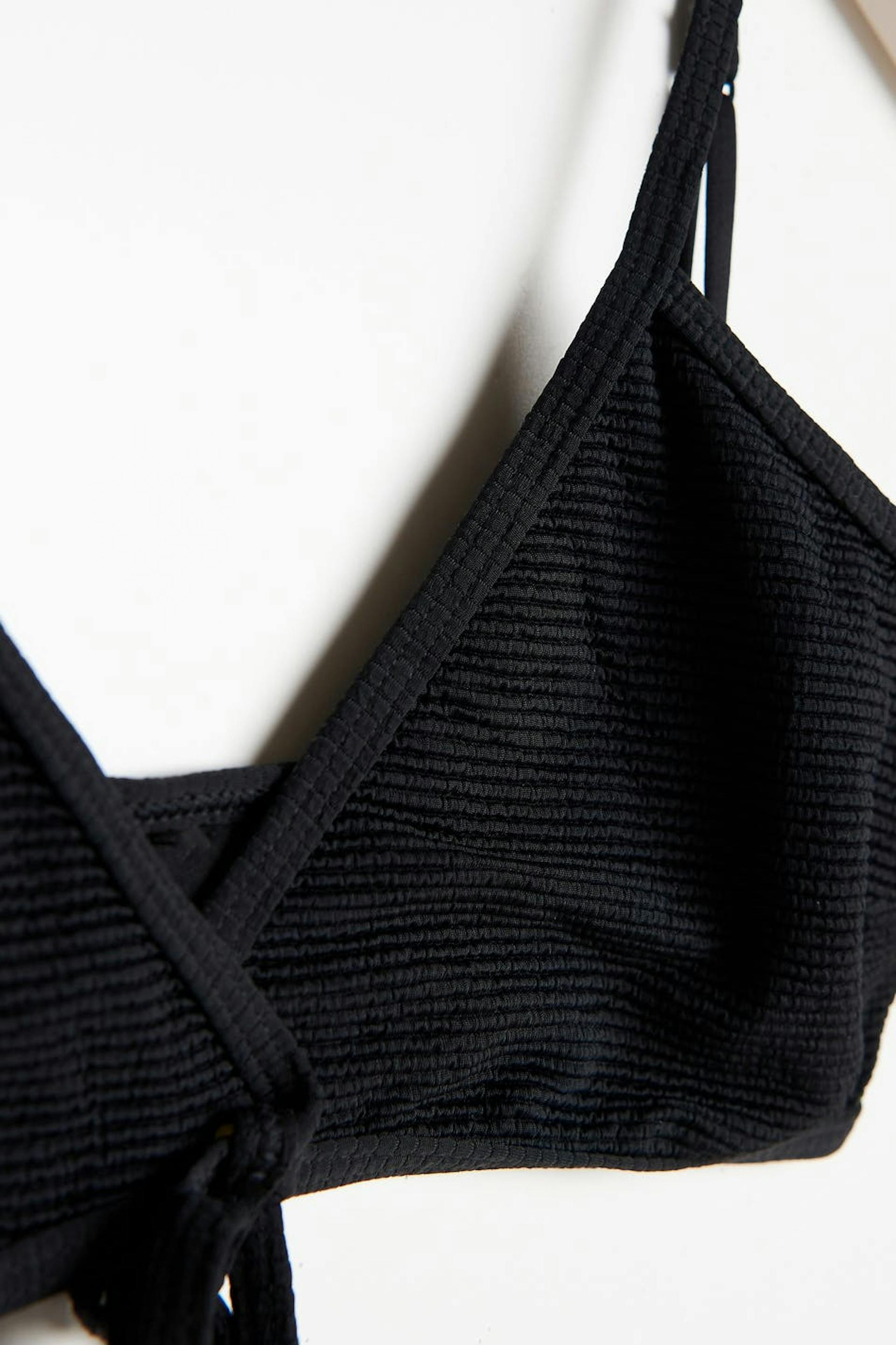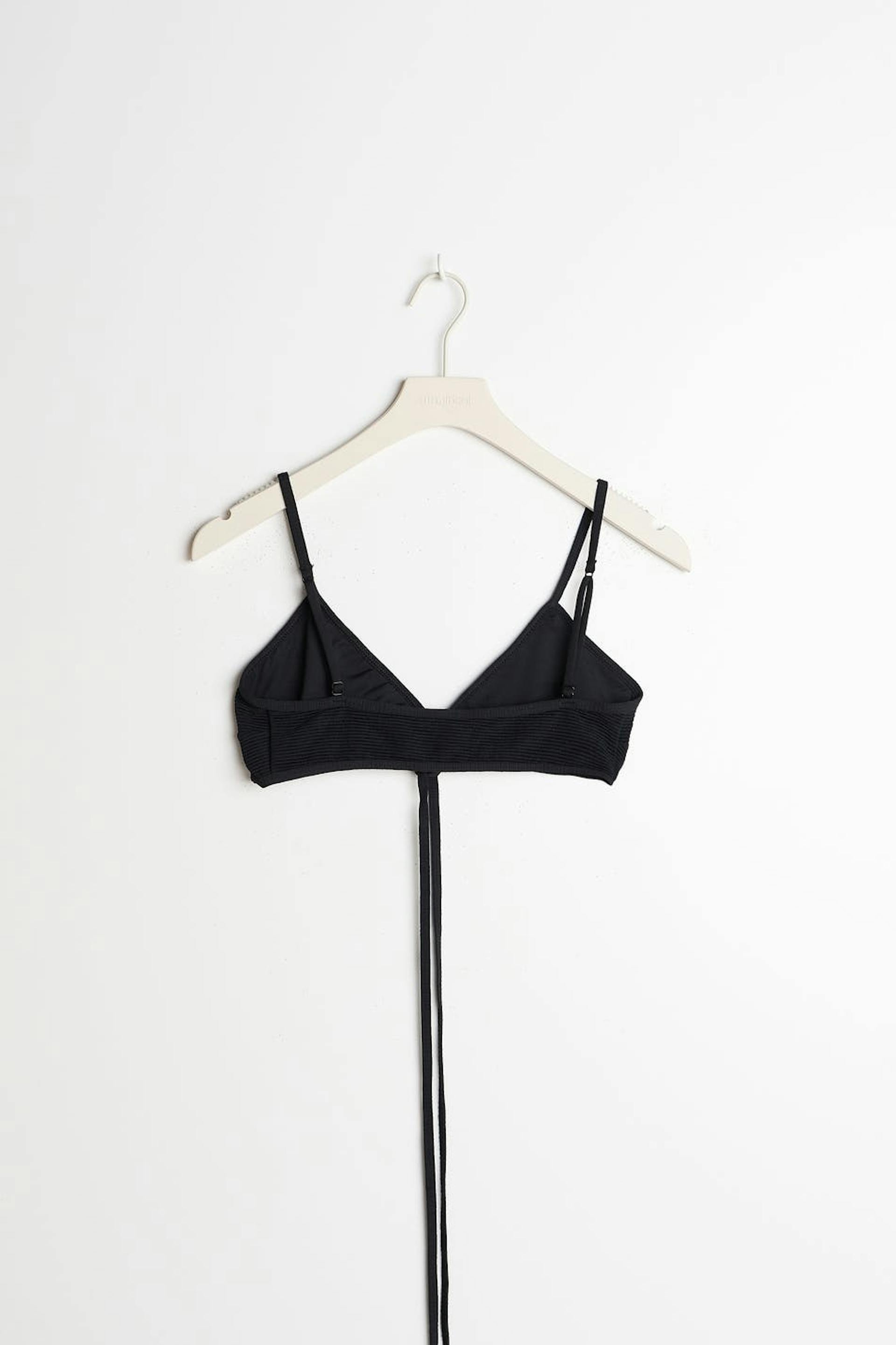 Triangle bikini top with treaded swimsuit material. The bikini top is black and has adjustable shoulder straps. It has long tie straps at the bottom to tie on the back.