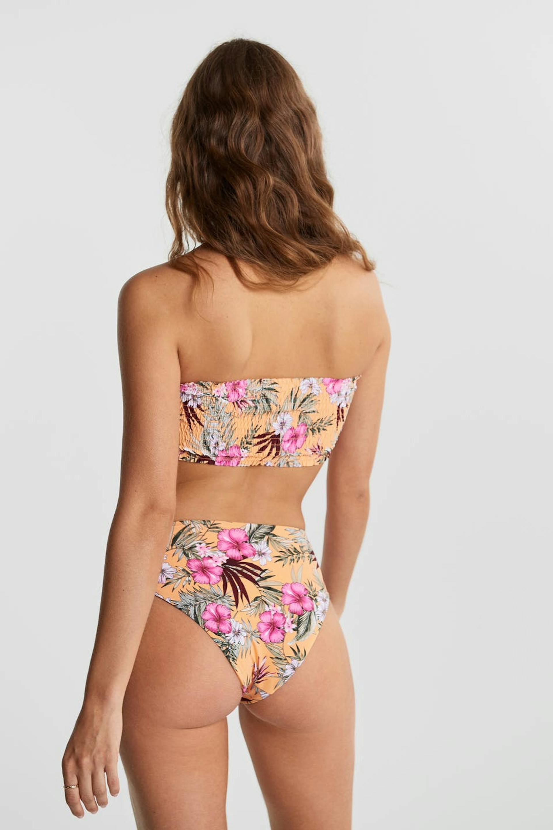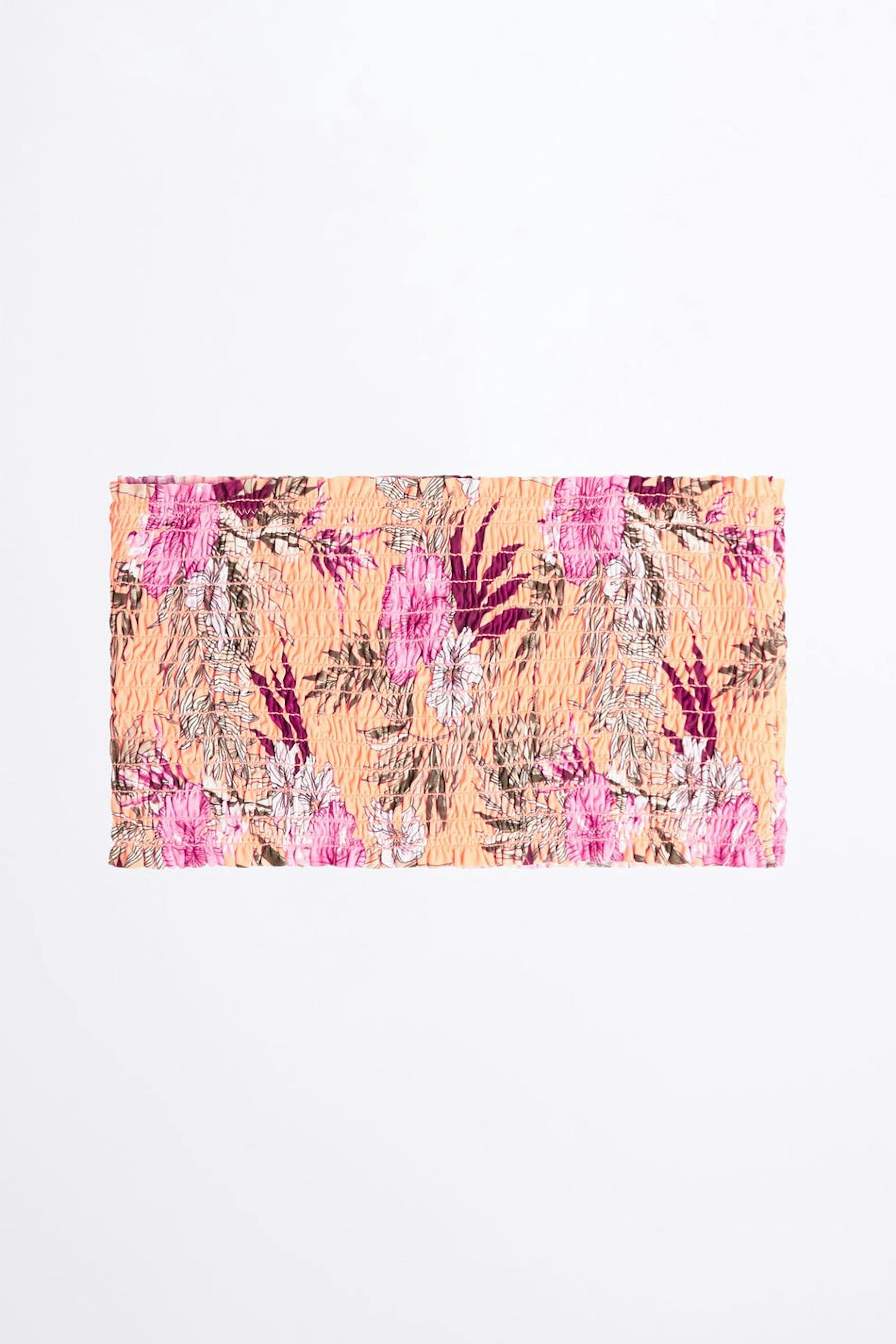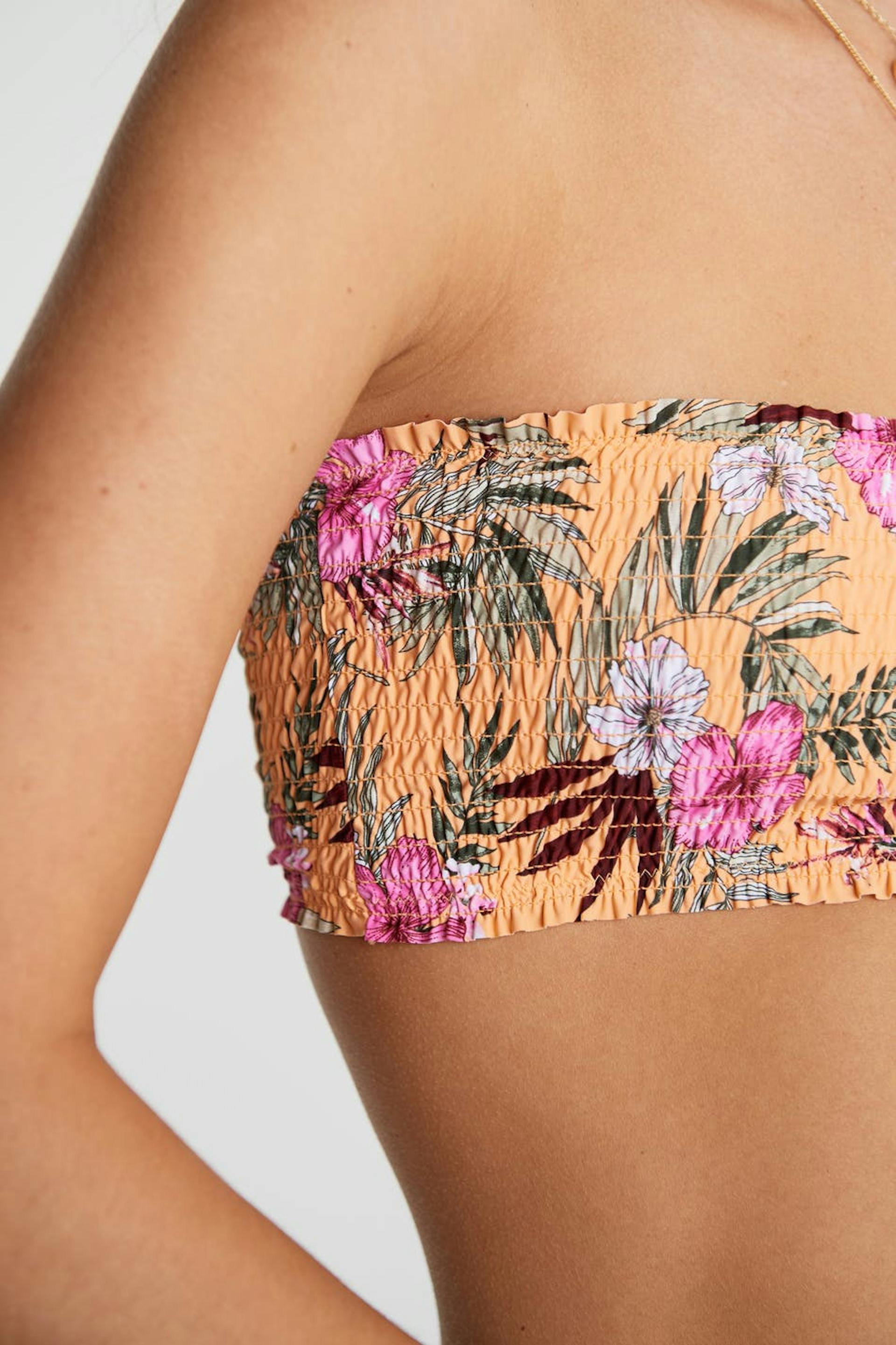 Bikini top with a flower pattern and bandeau style. The bikini top is orange, pink and smocked. It has swimsuit material.