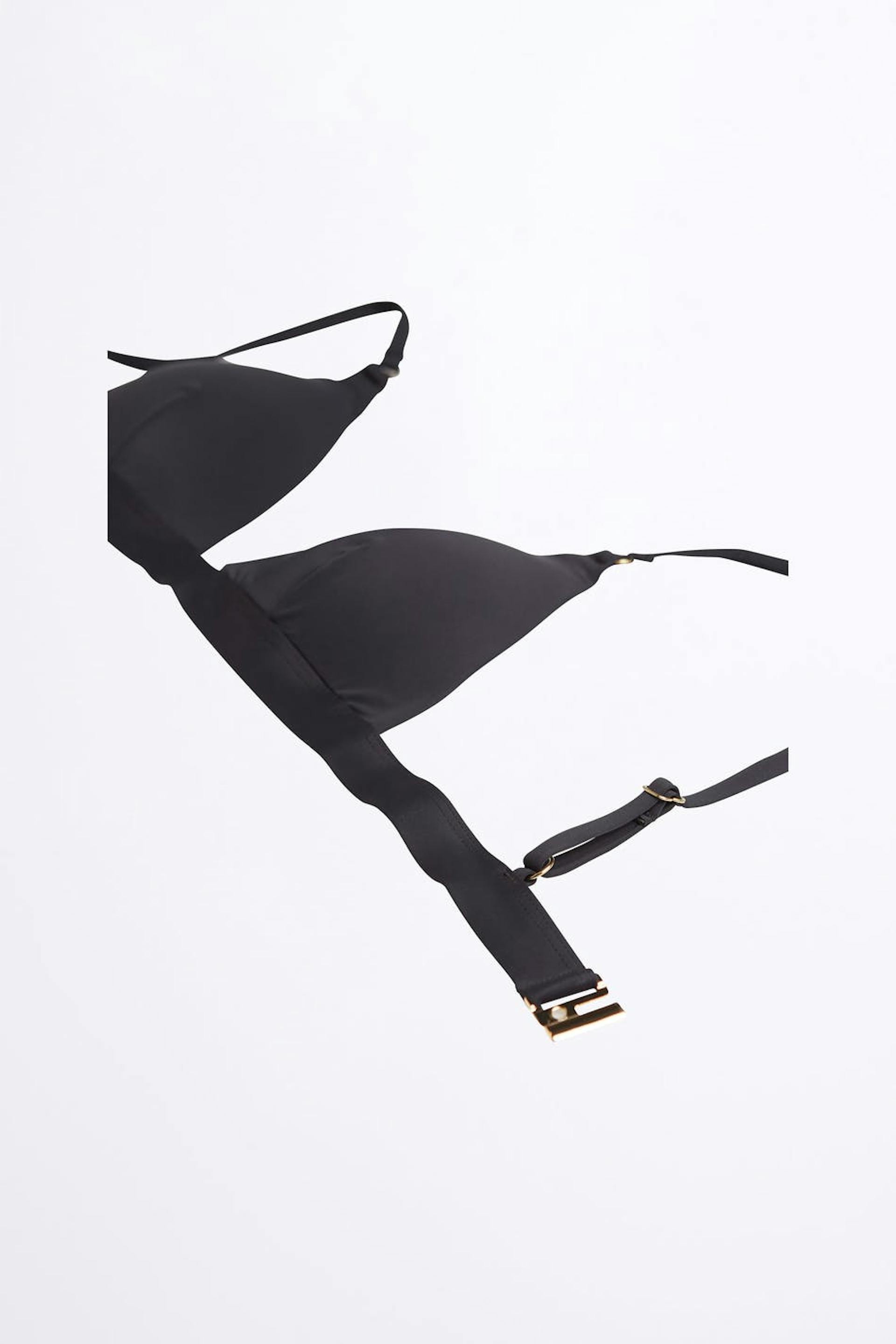 Triangle bikini top with detachable, soft padding. The bikini top is black and has adjustable shoulder straps. It has a closure at the back with clasp closure.