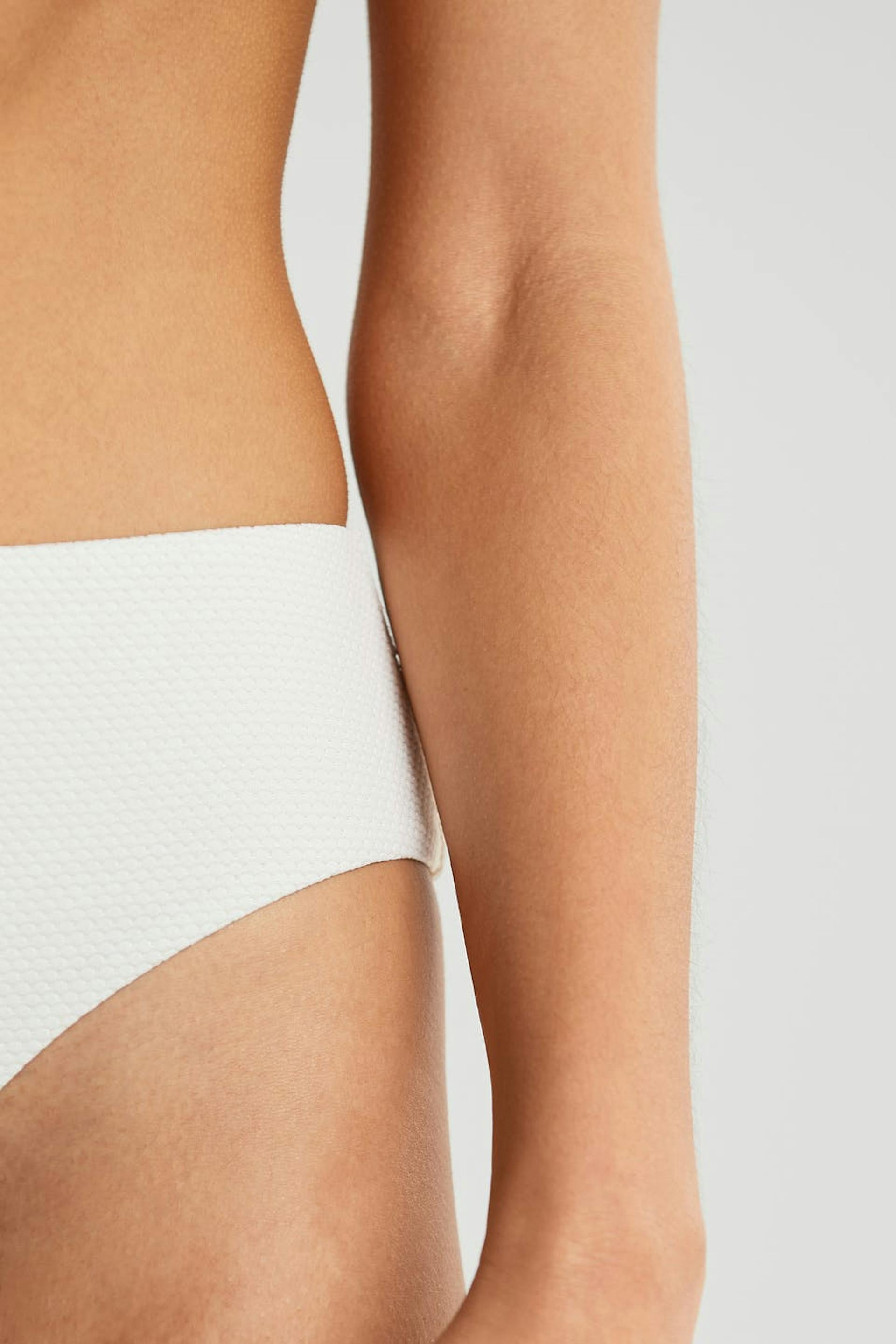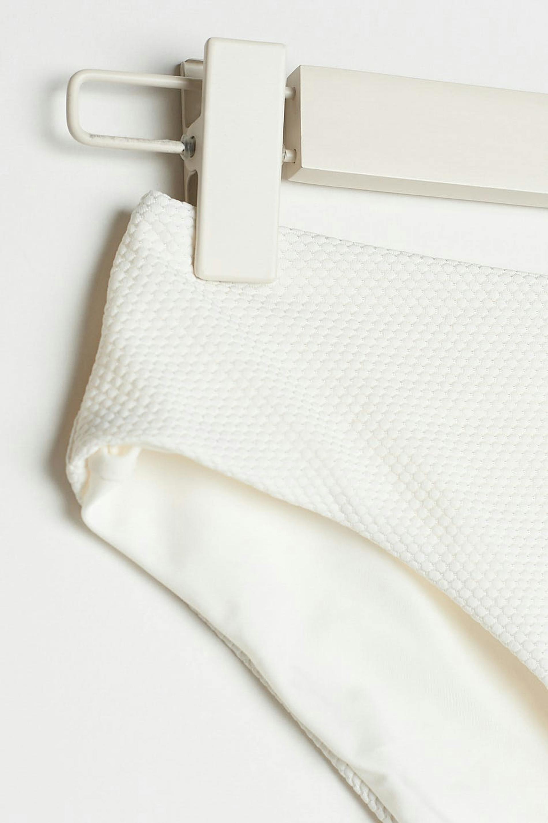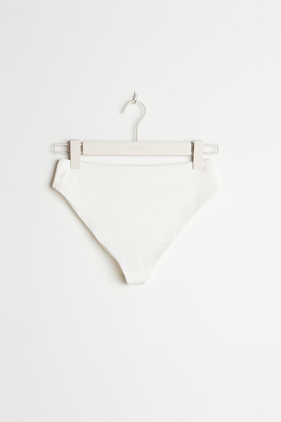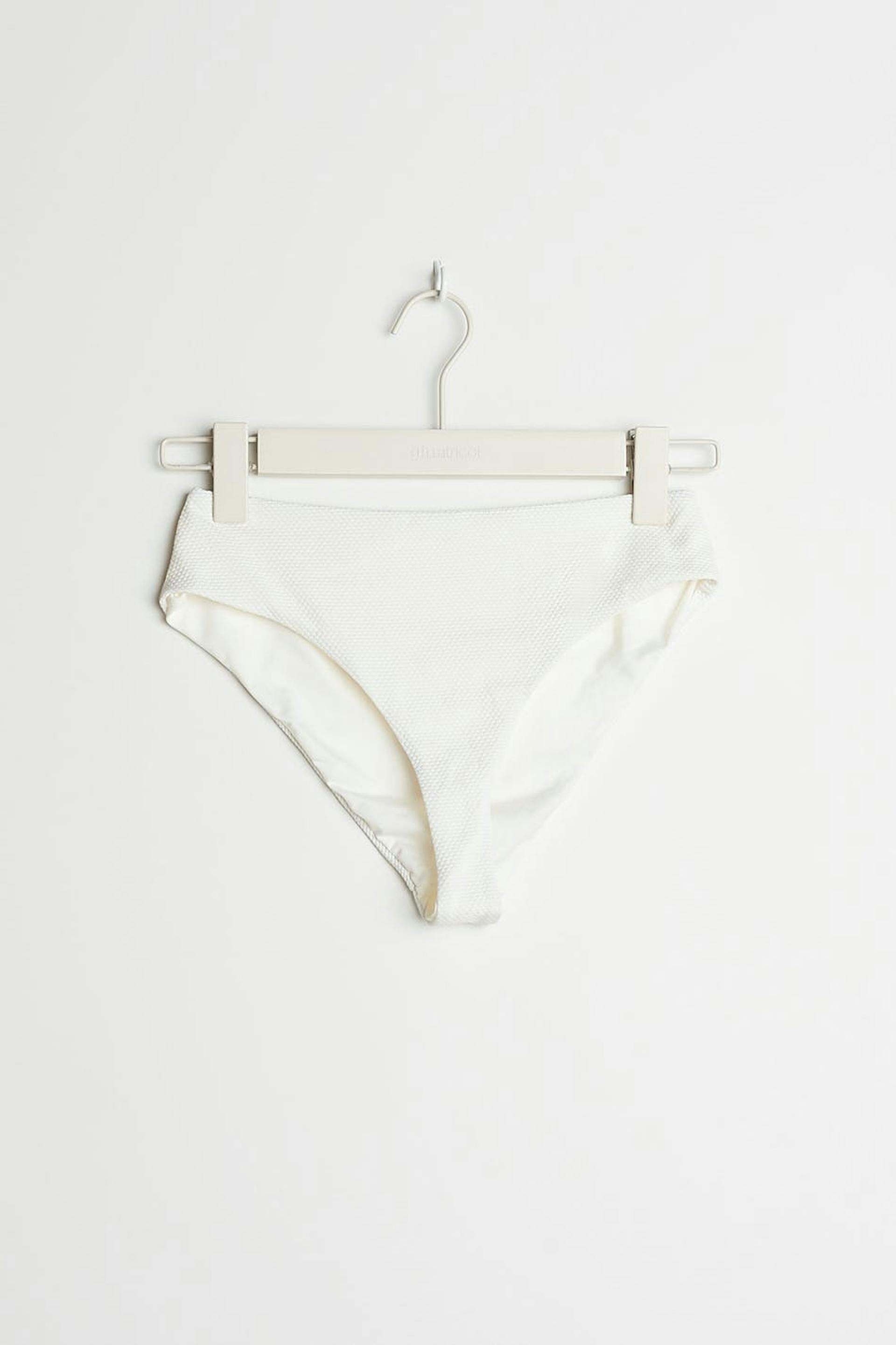 Bikini bottom with a high waist. The pantie is white and has elastic band at the waist and on the leg openings.