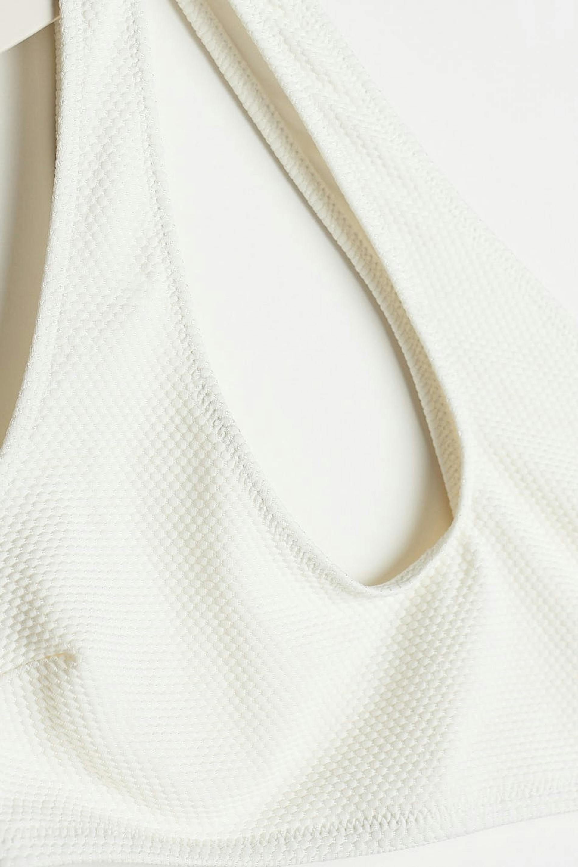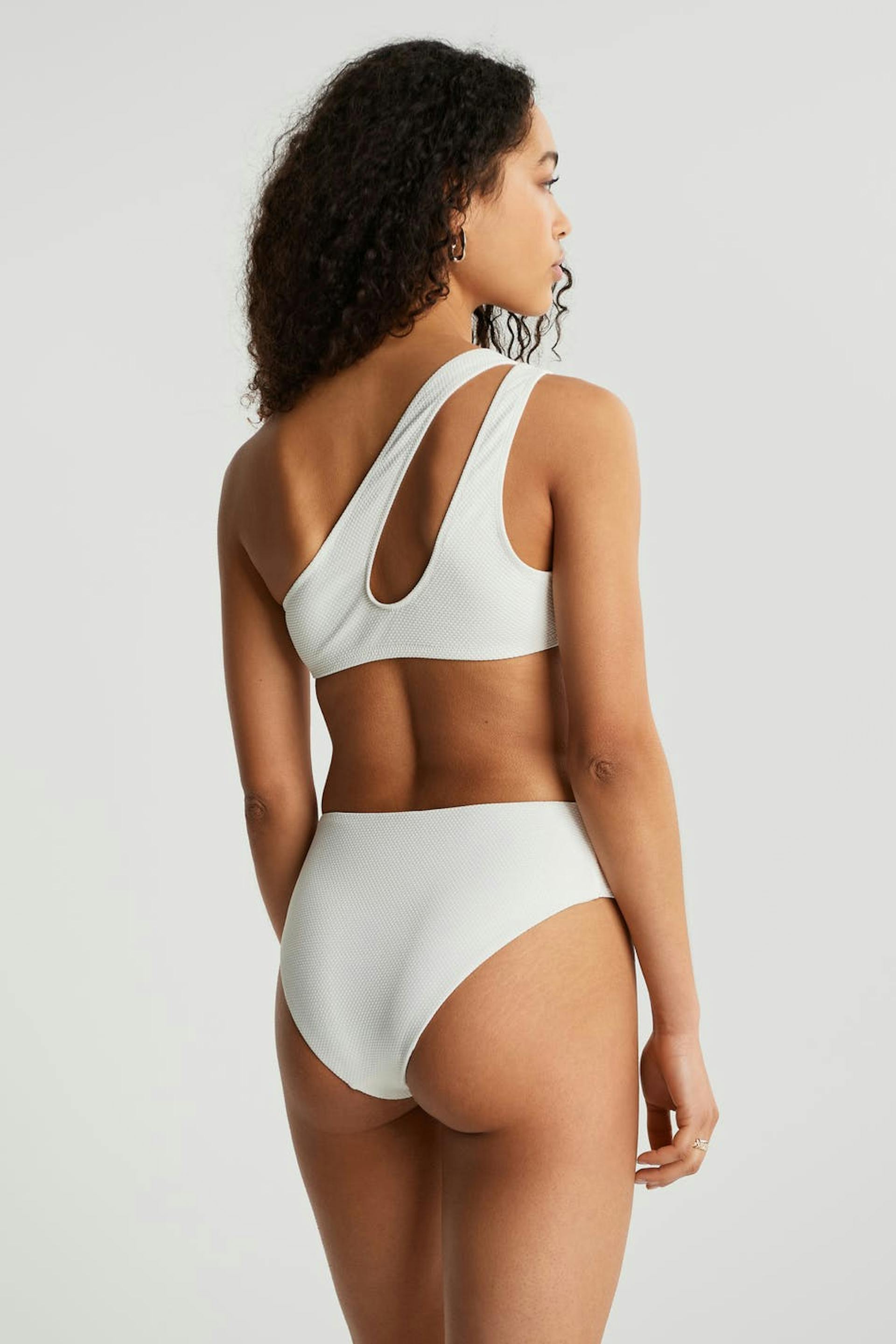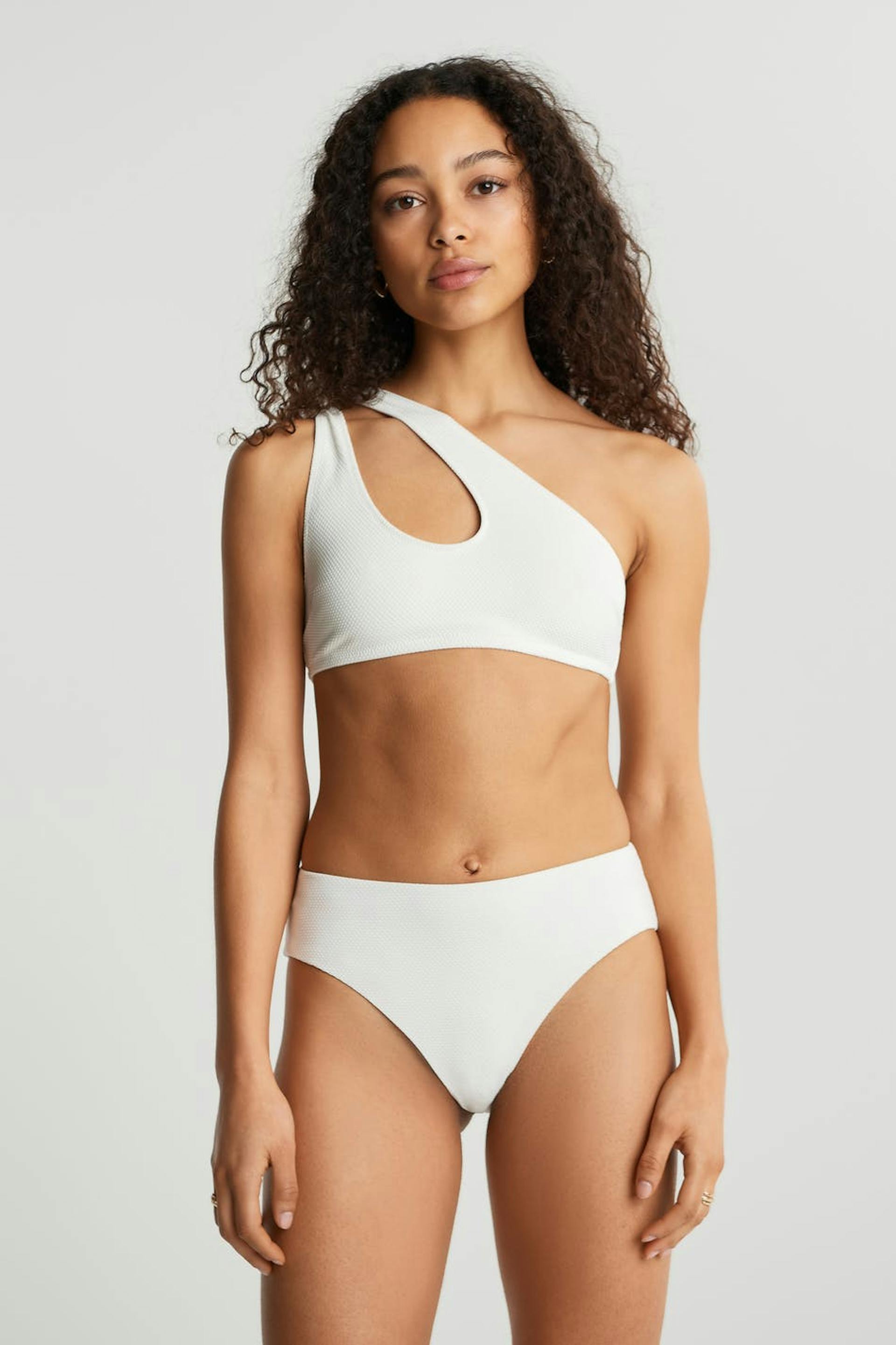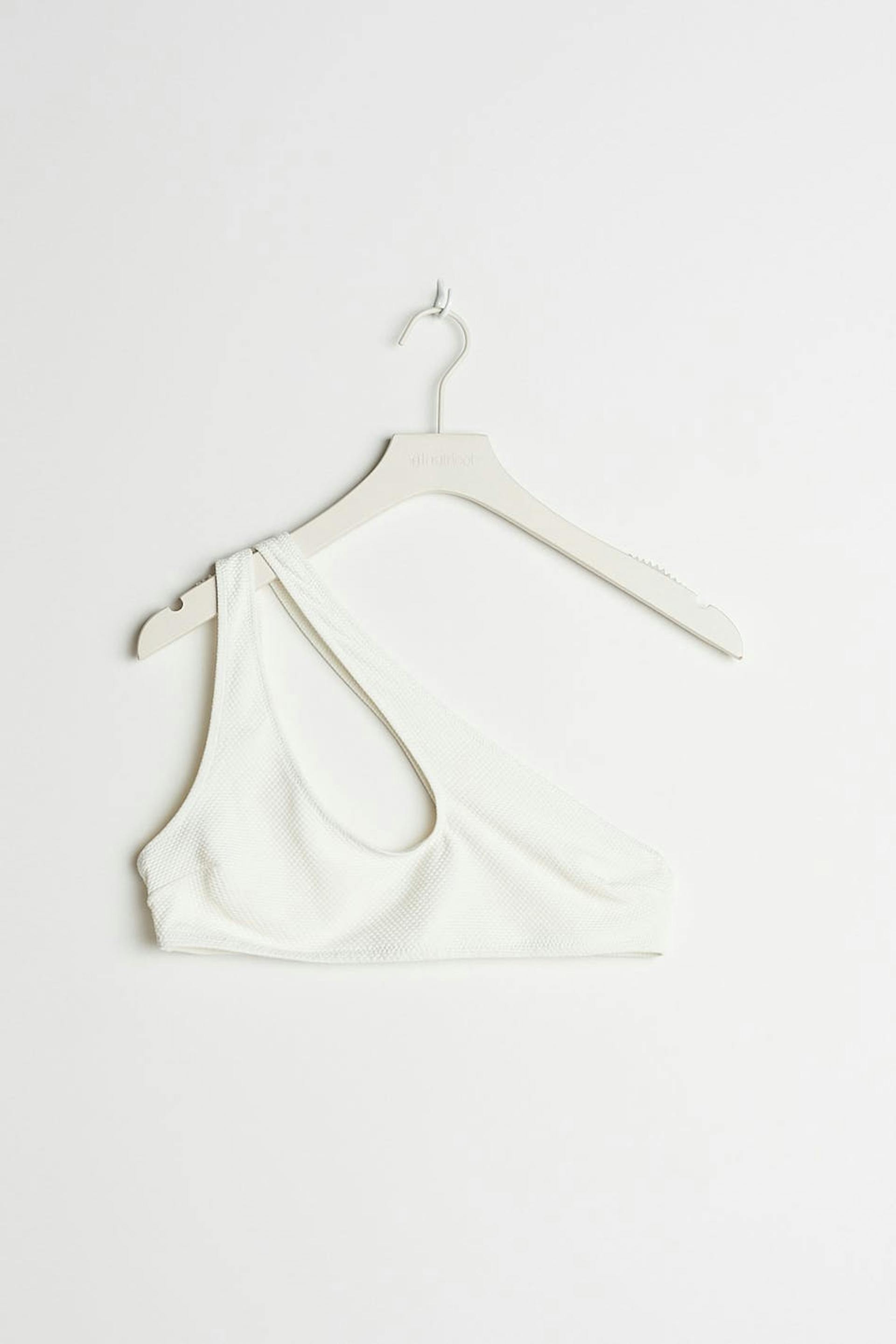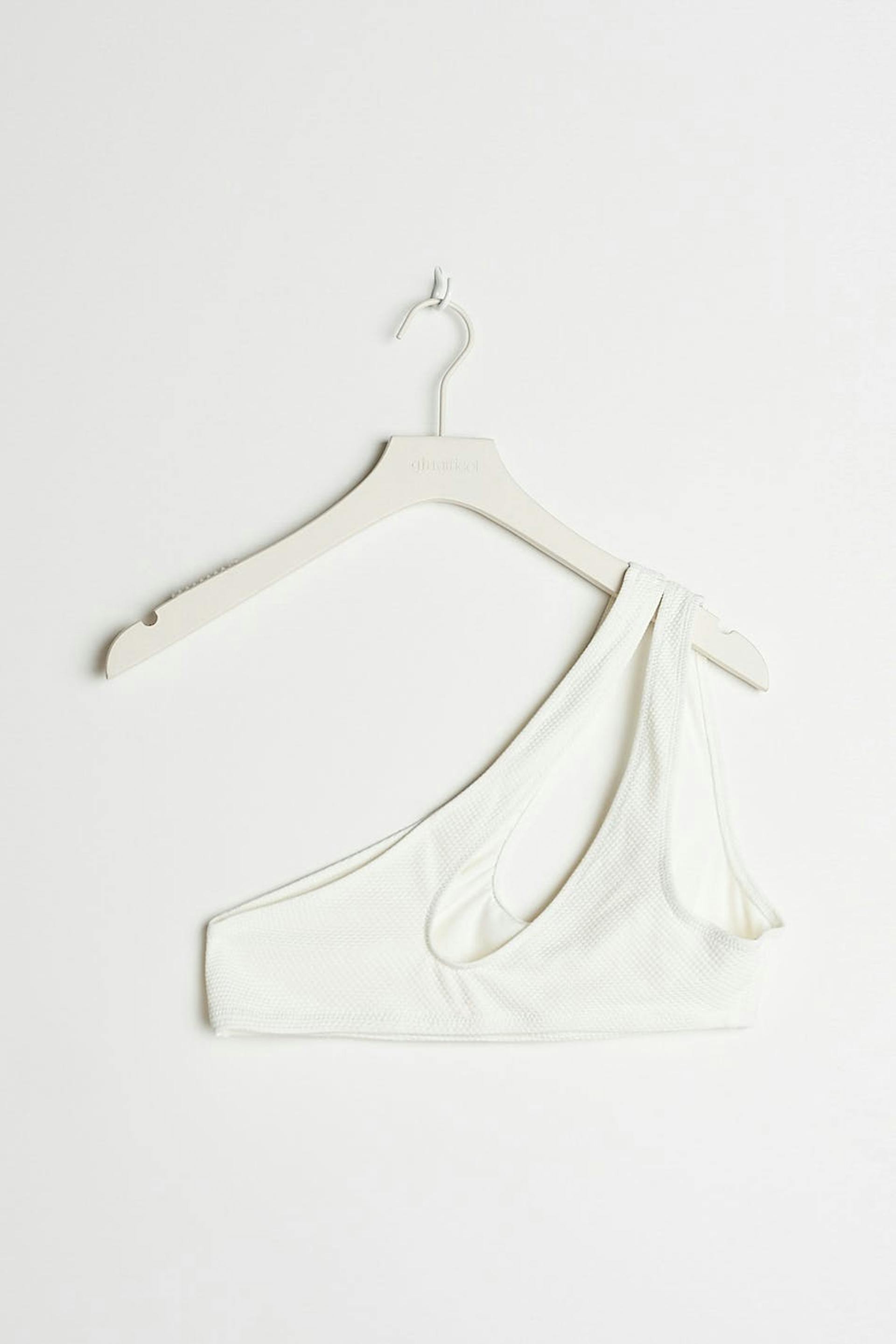 Bikini top with a one shoulder design. The bikini top is white and has a cutout detail on the front and on the back.