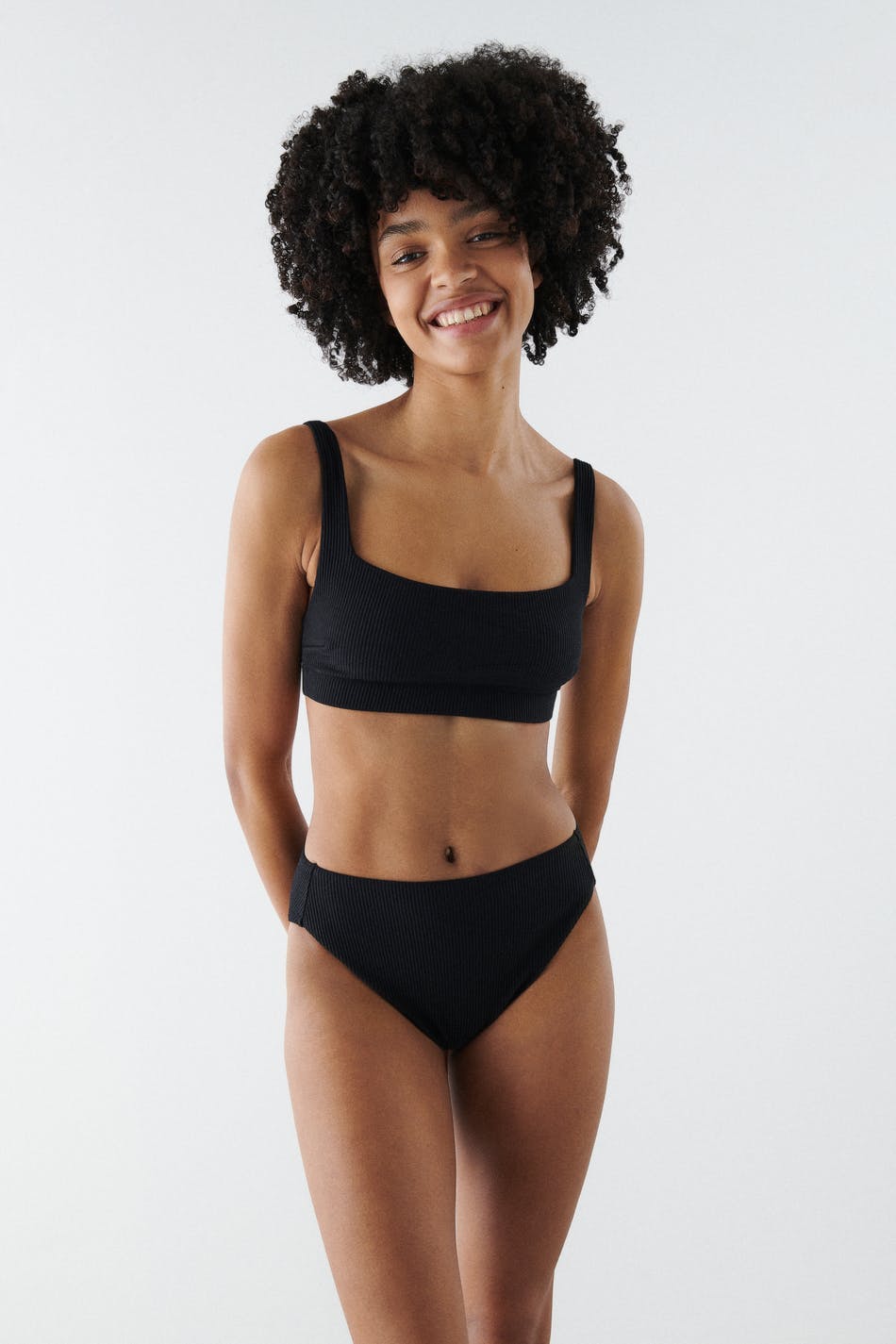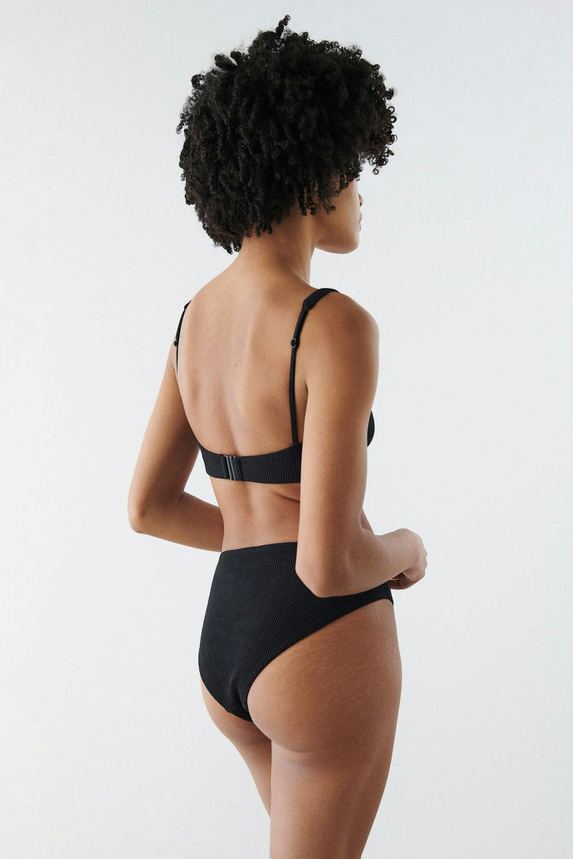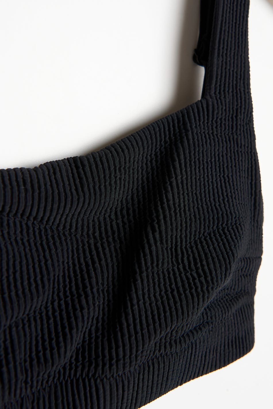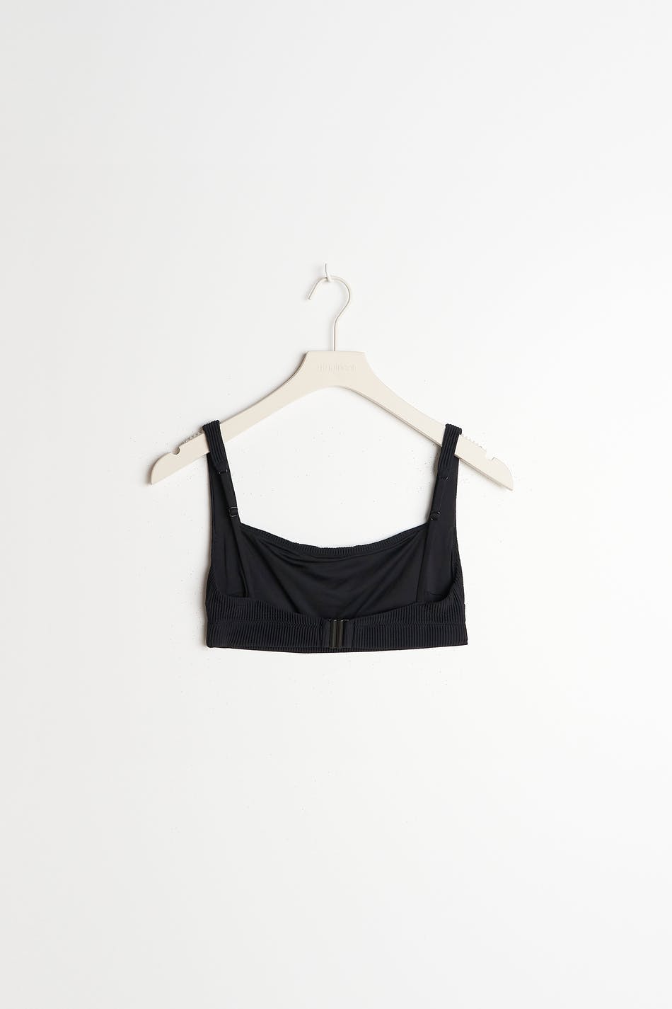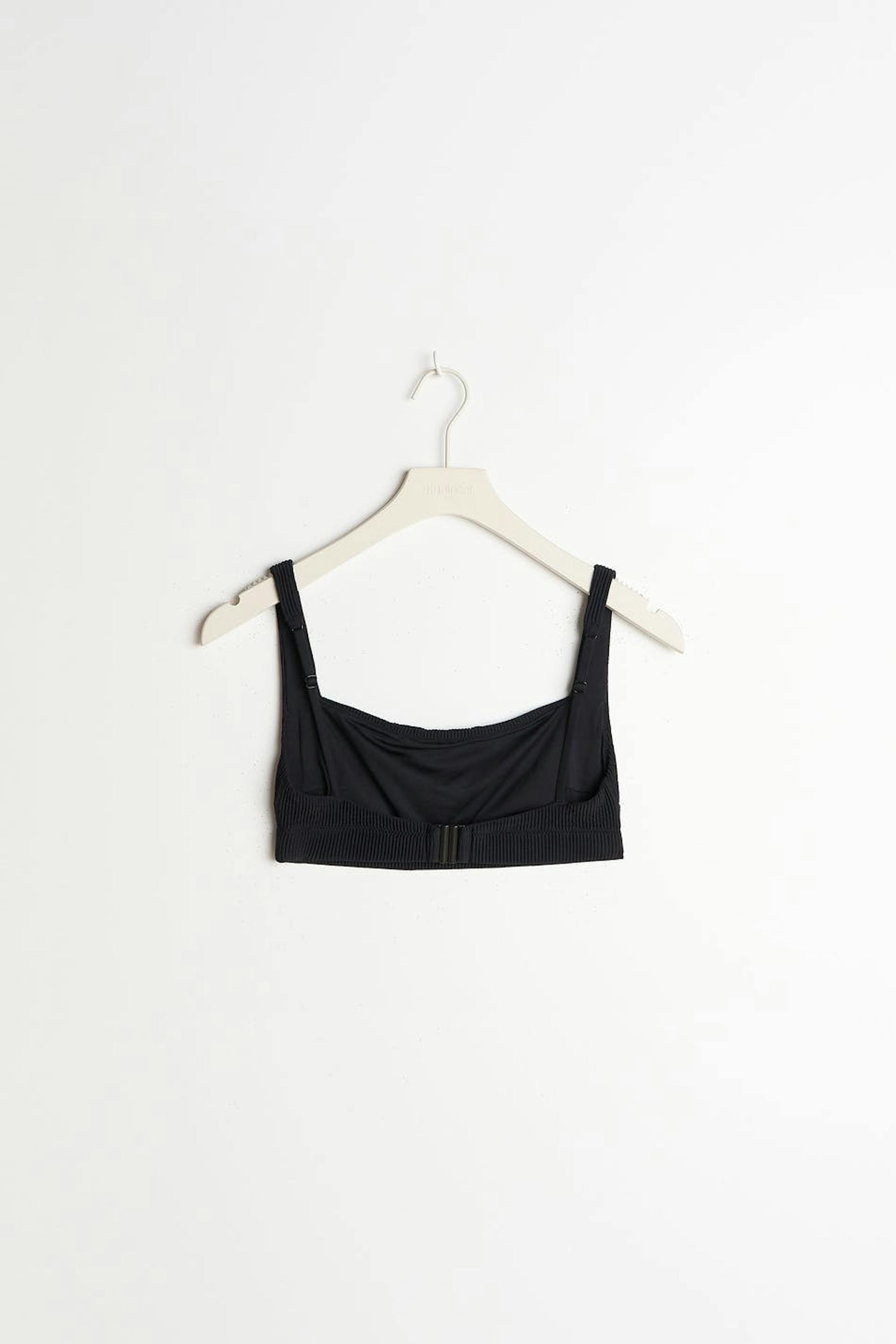 Lined bikini top with adjustable shoulder straps. The bikini top is black and has treaded swimsuit material with buckle at the back.