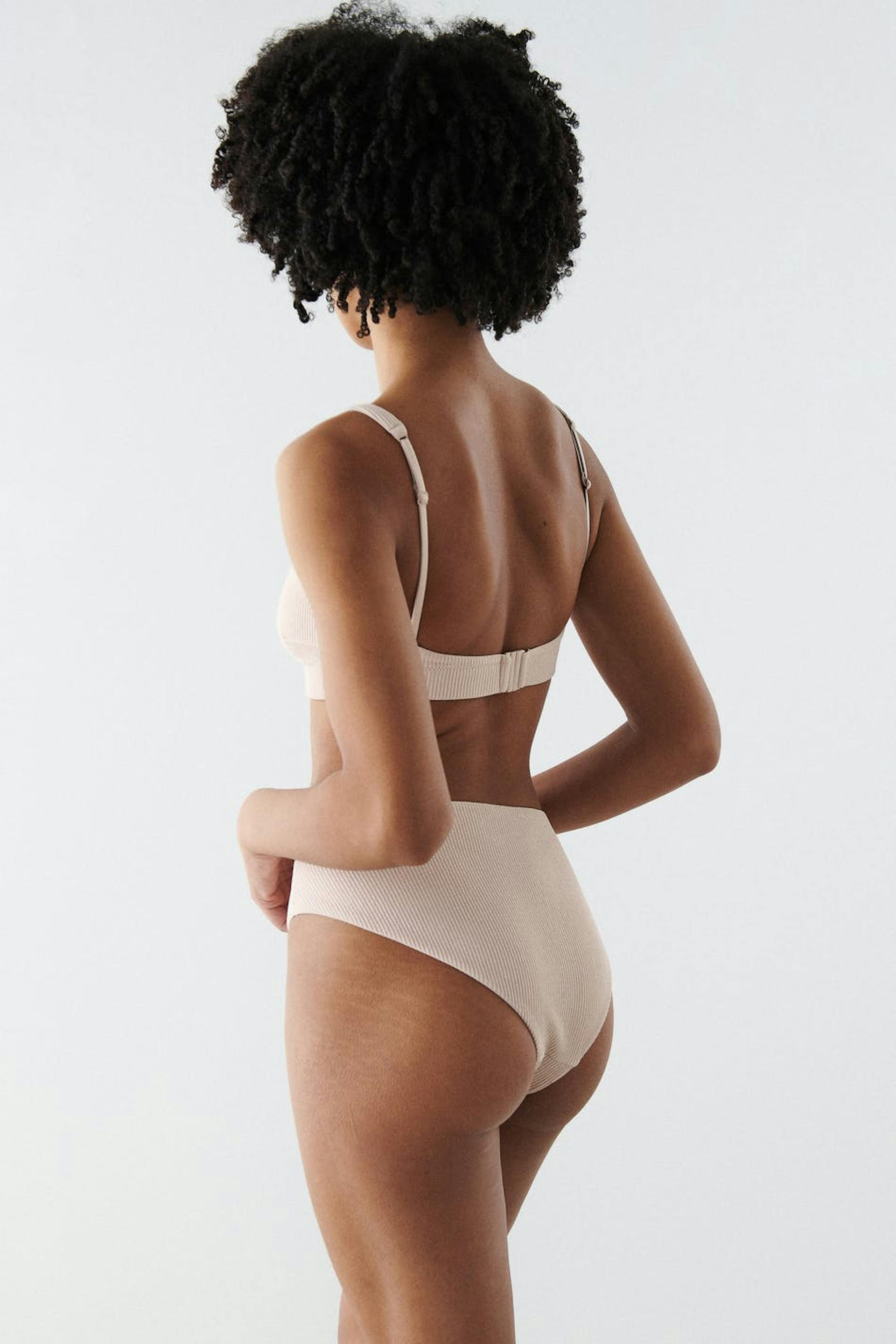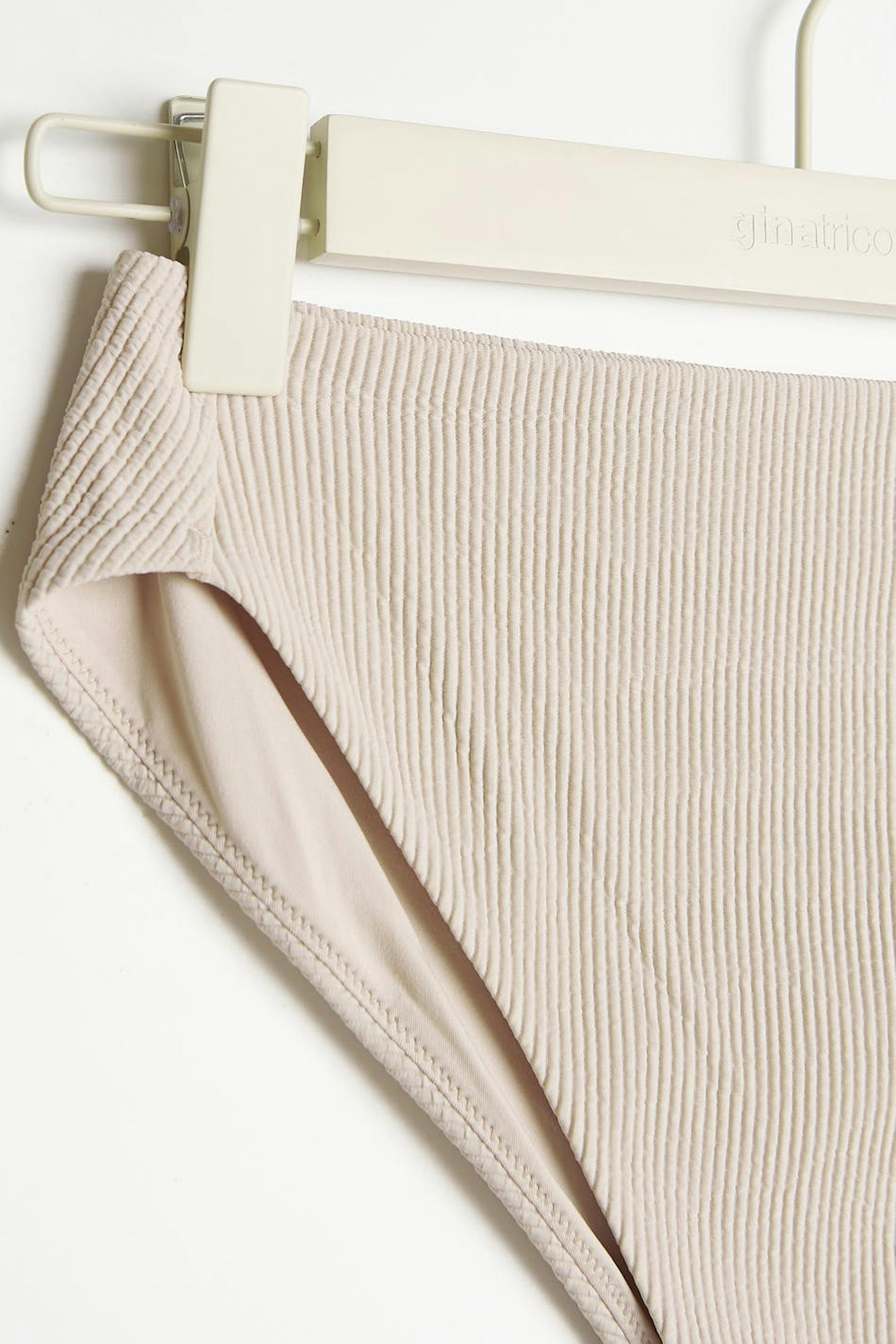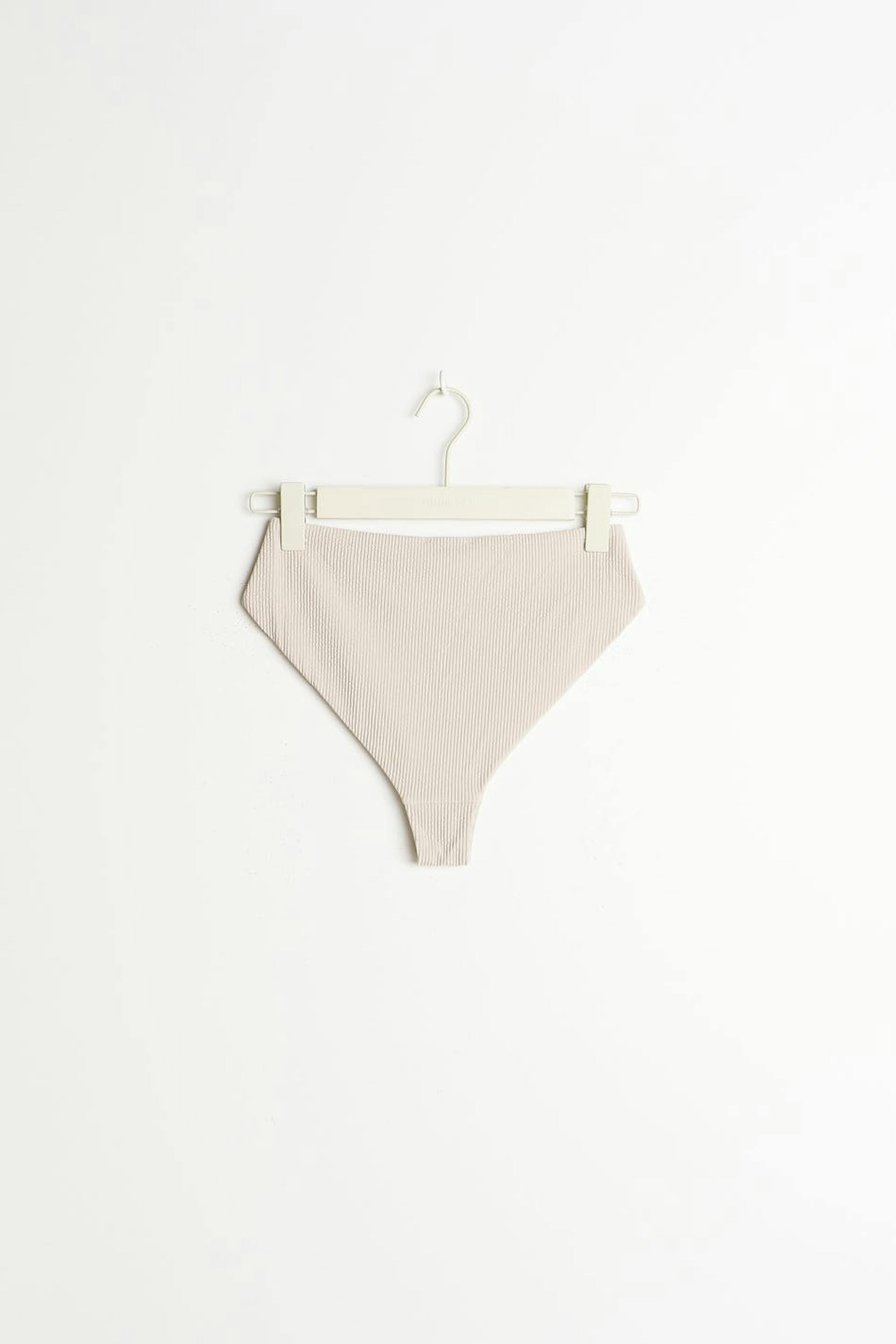 Bikini panties with high waist. The bikini panties are beige and have treaded swimsuit material. They have a soft elastic at the waist and on the leg openings.