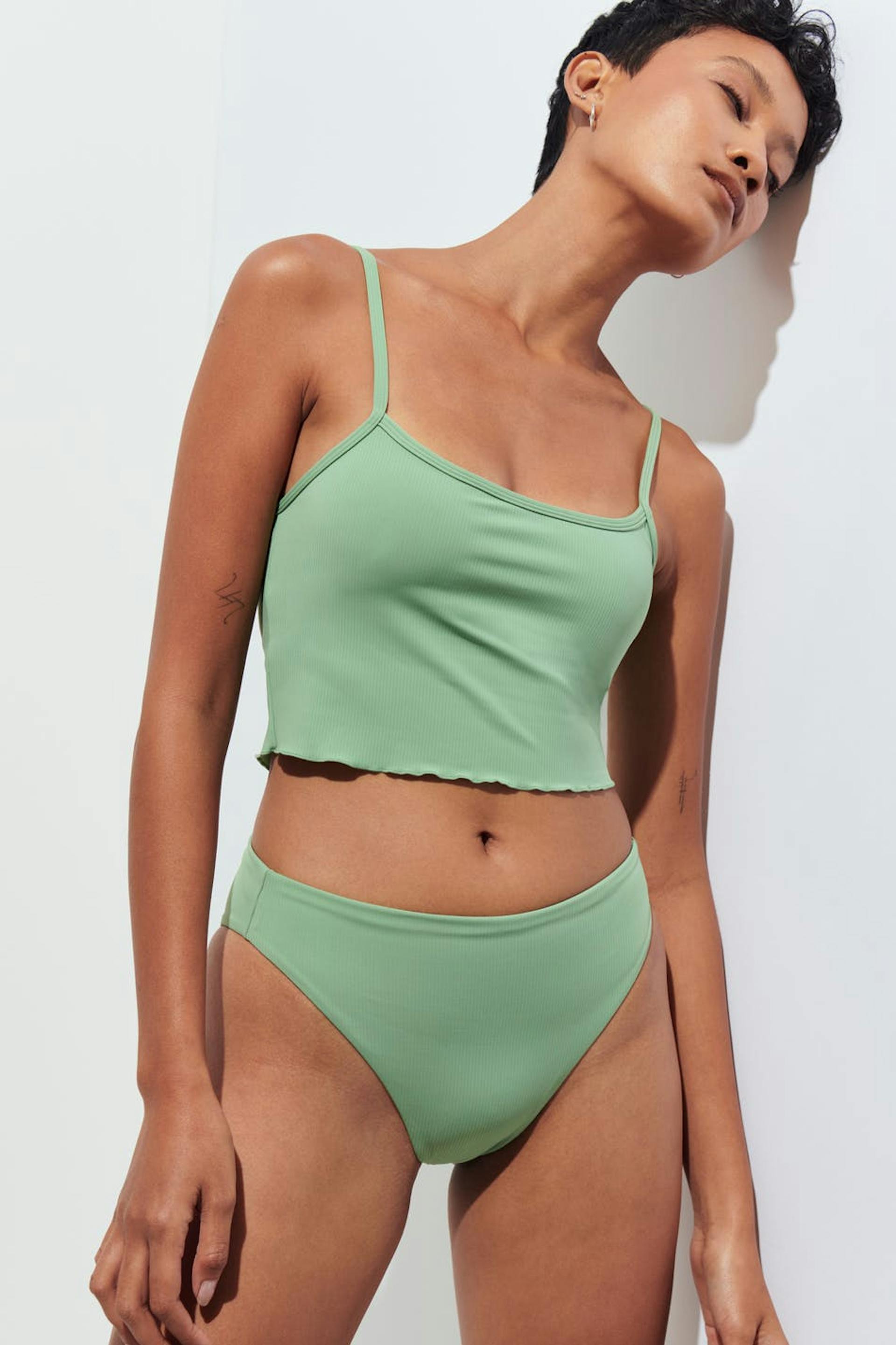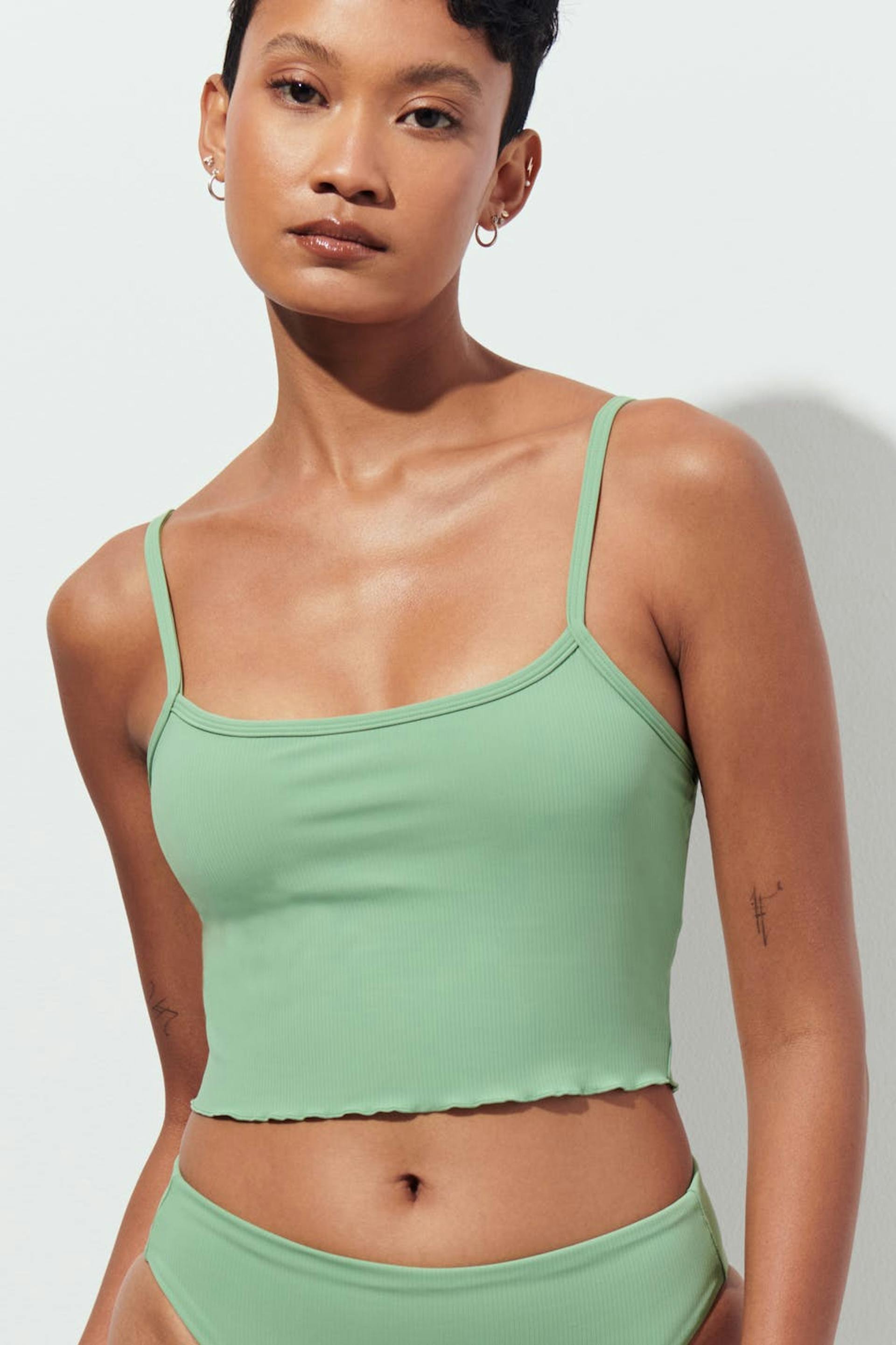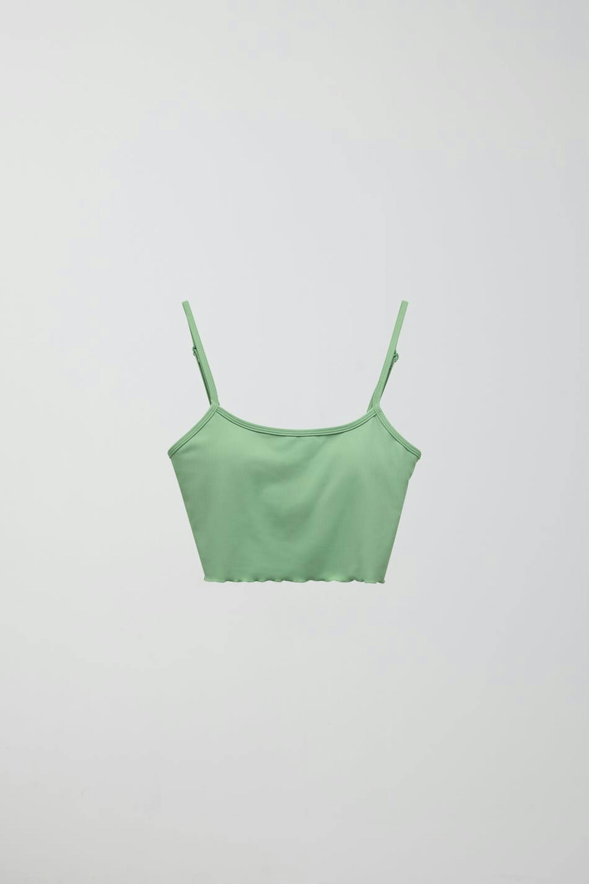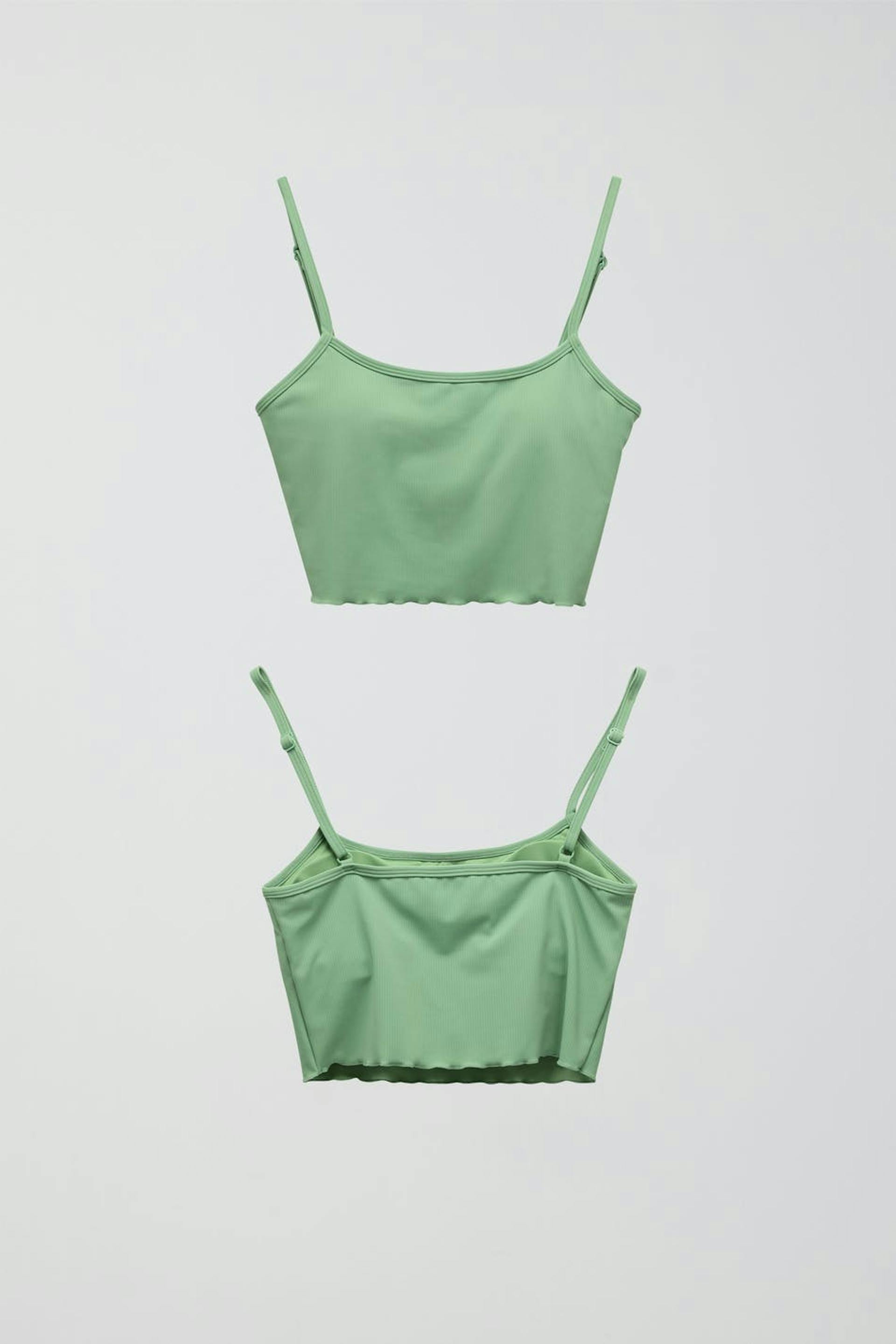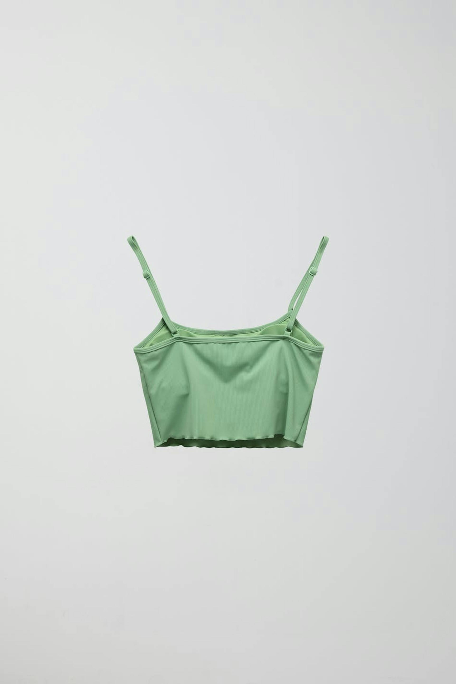 Bikini bra with thin, adjustable shoulder straps. The bikini top is green and has a ribbed quality.