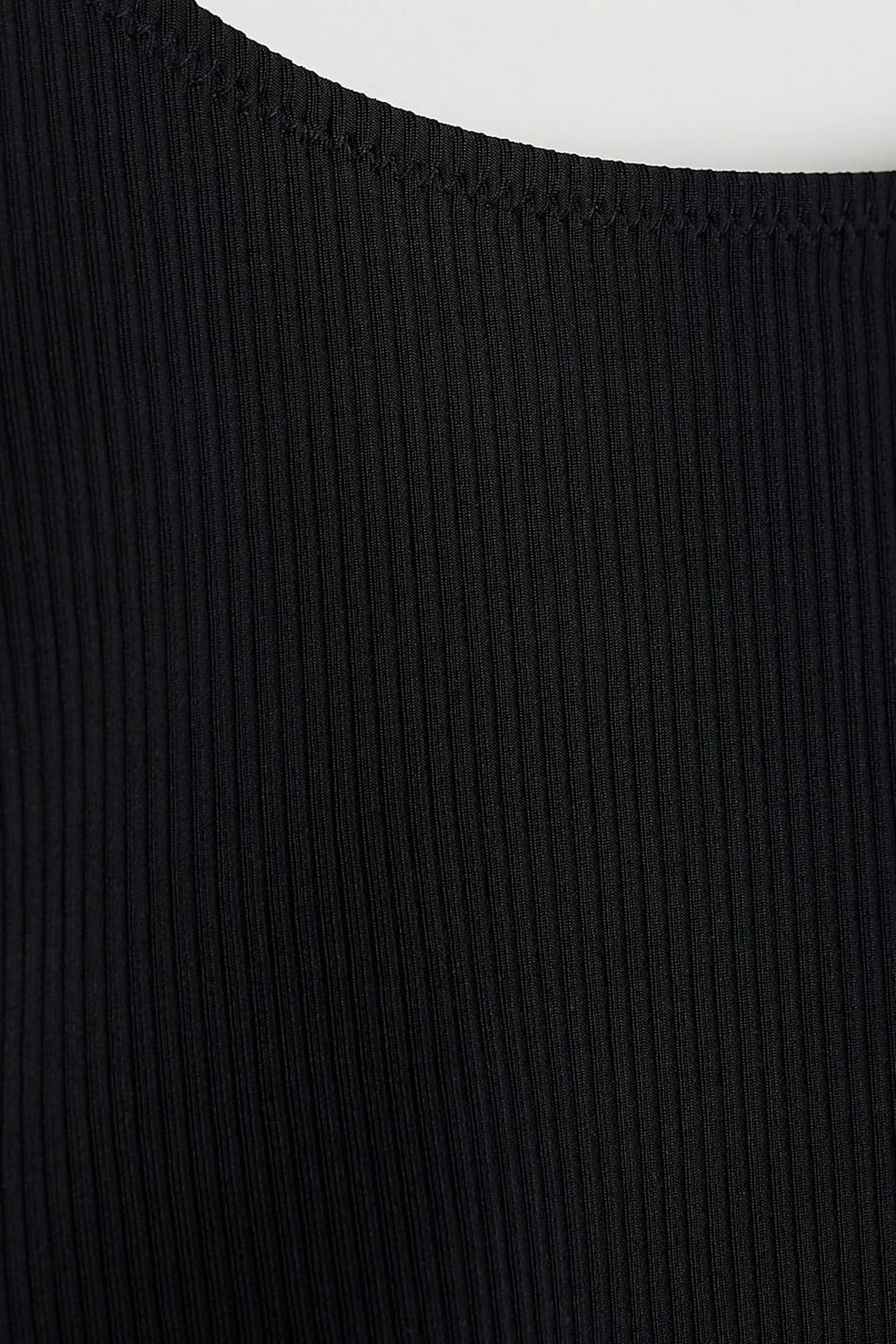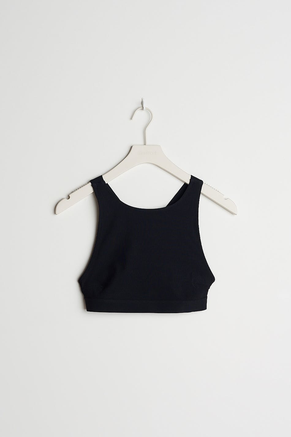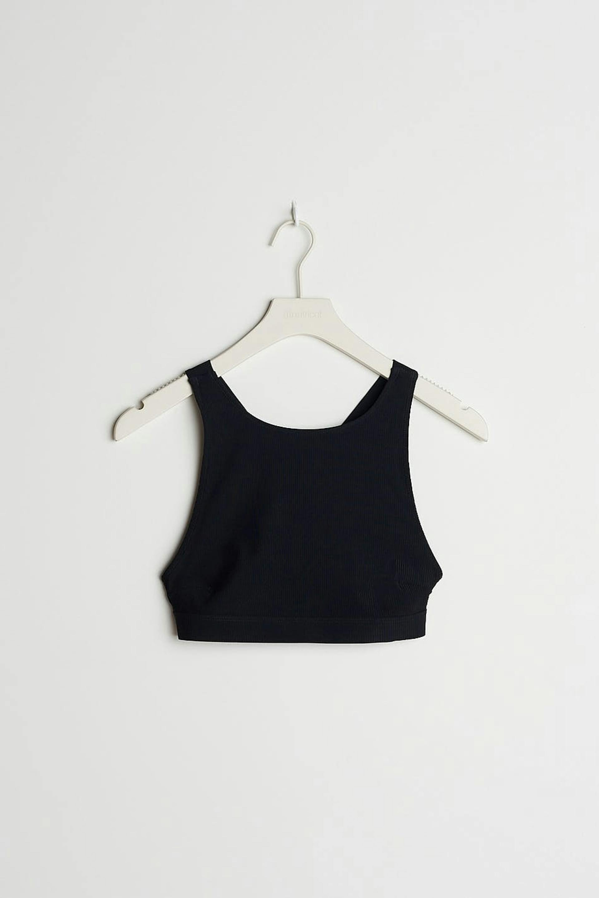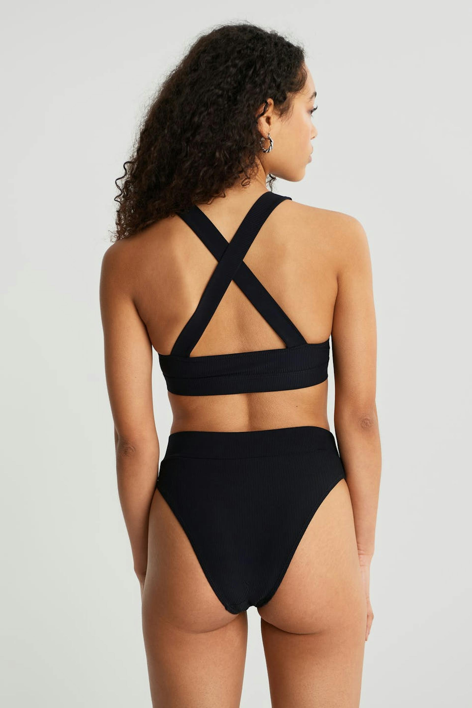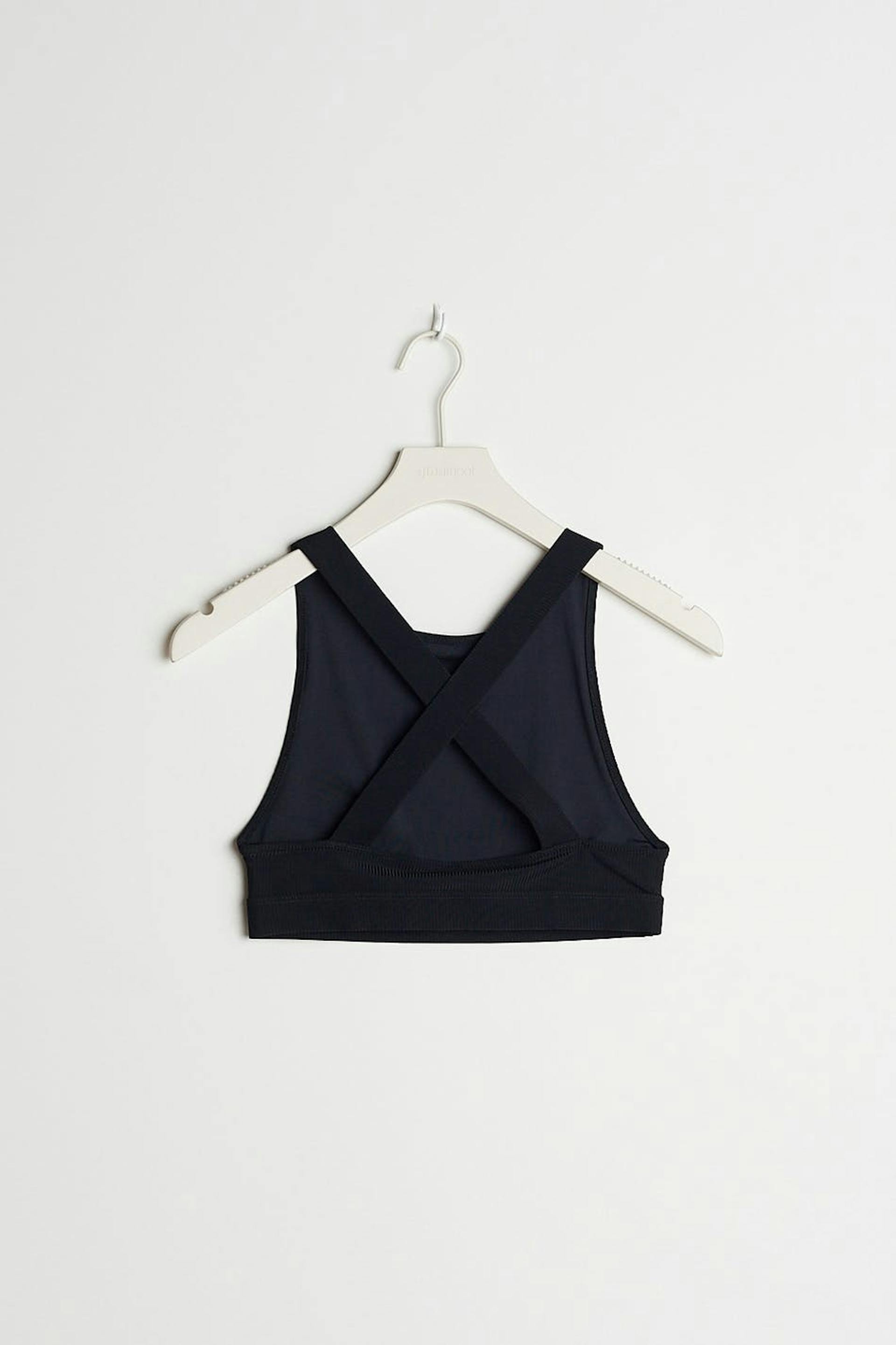Sporty bikini top with a ribbed material. The bikini top is black and has criss crossed shoulder straps in the back.