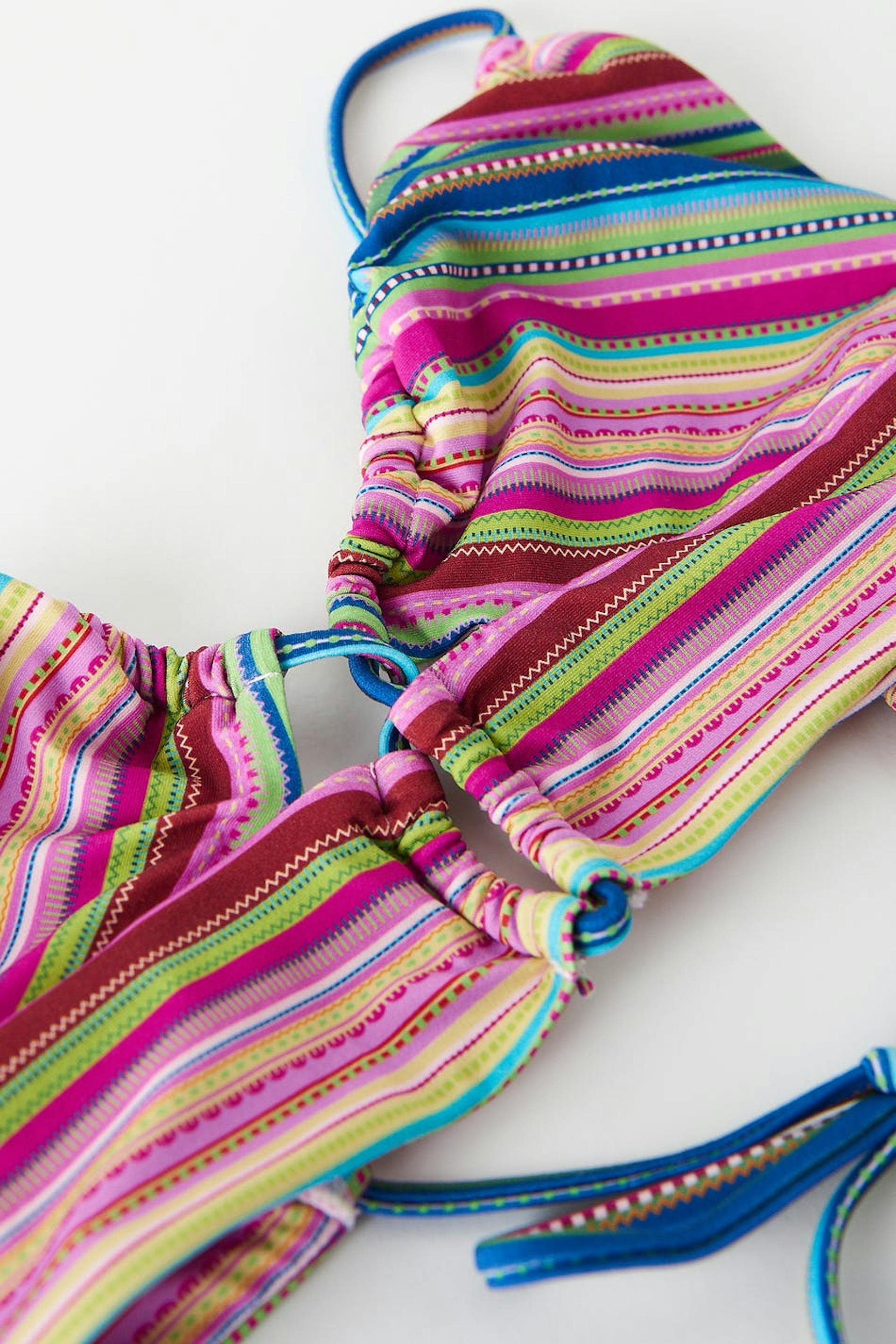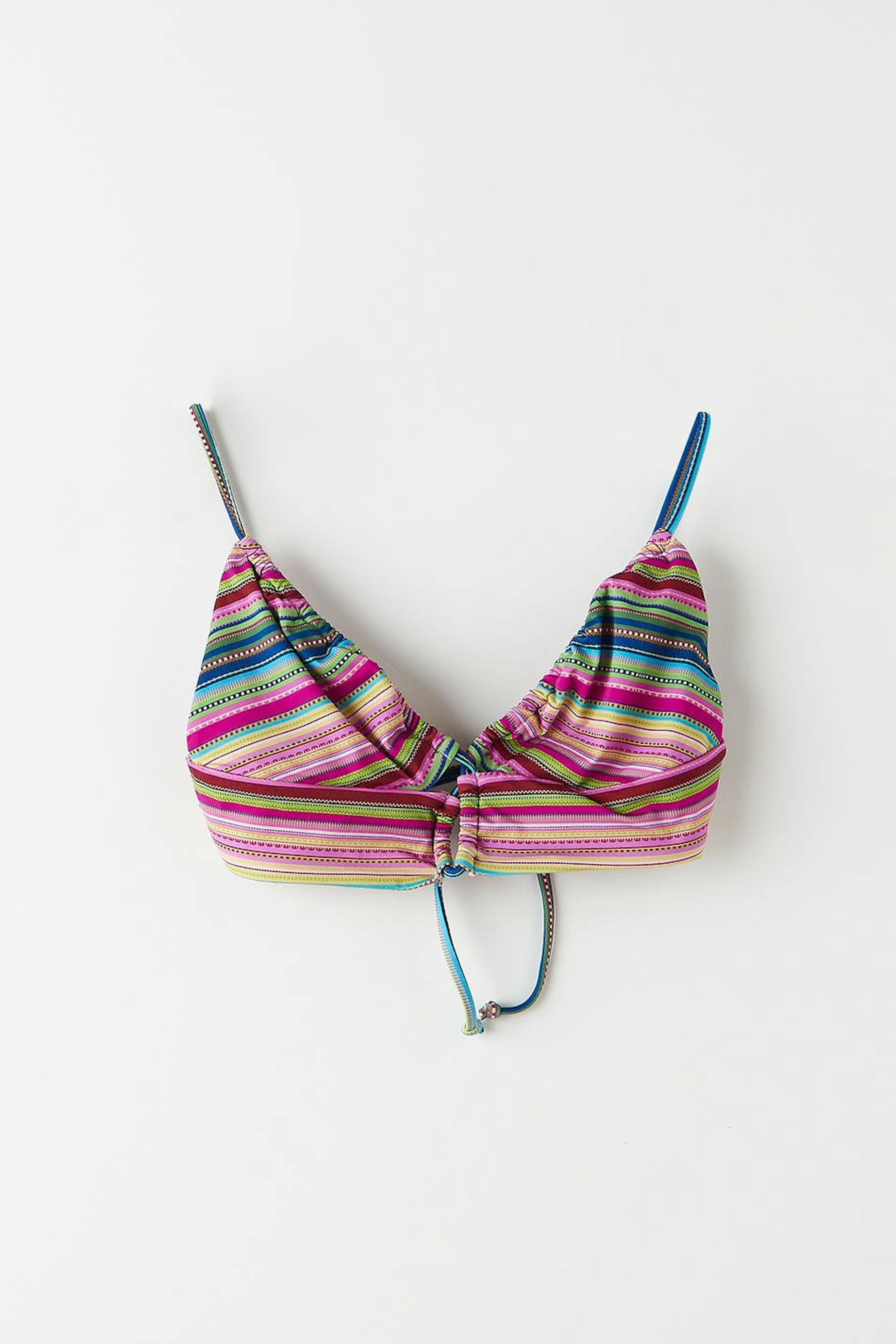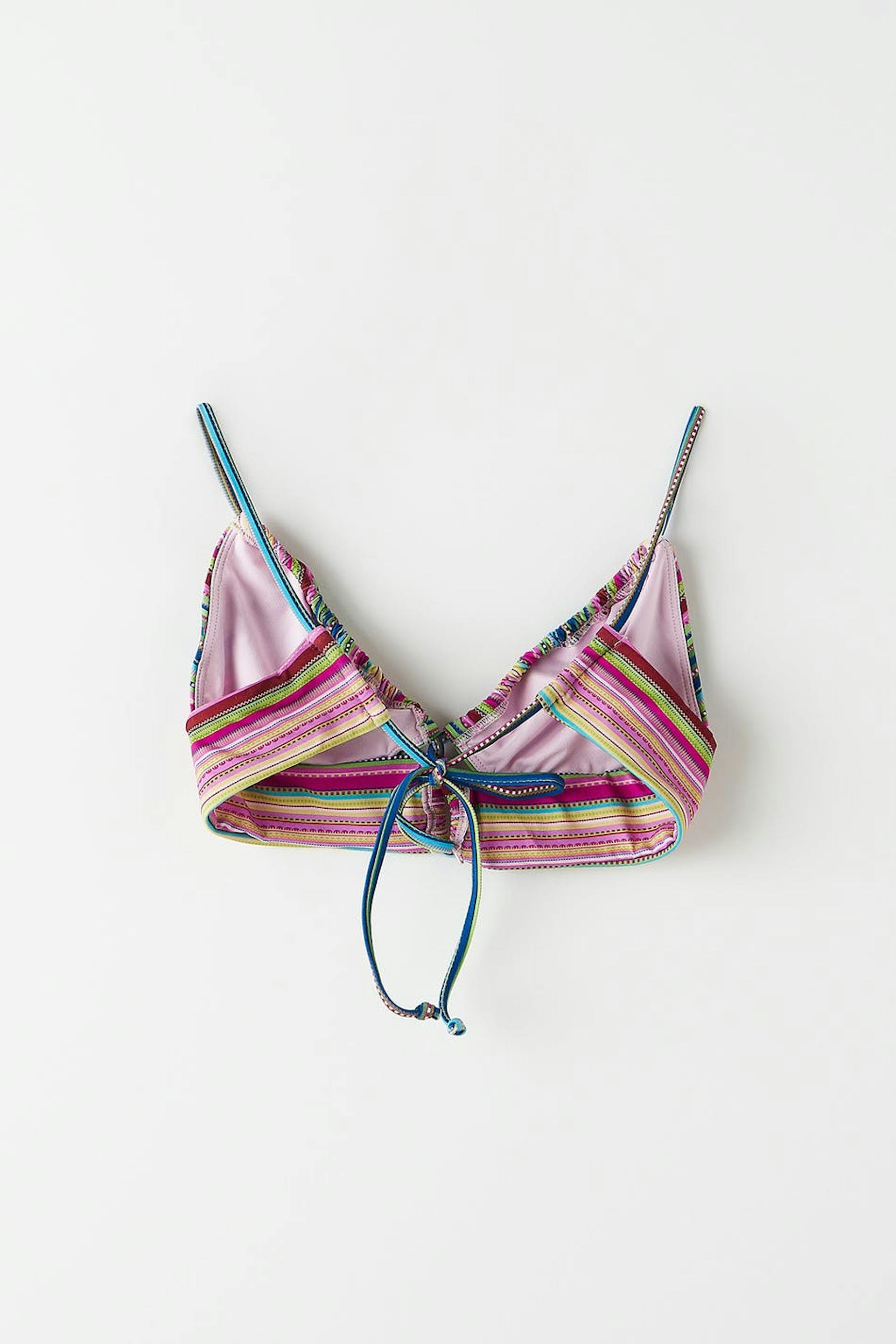 Striped bikini bra with an overlap detail at the front. The bikini top is pink and has soft swimsuit material. It has thin shoulder straps to tie on the back.