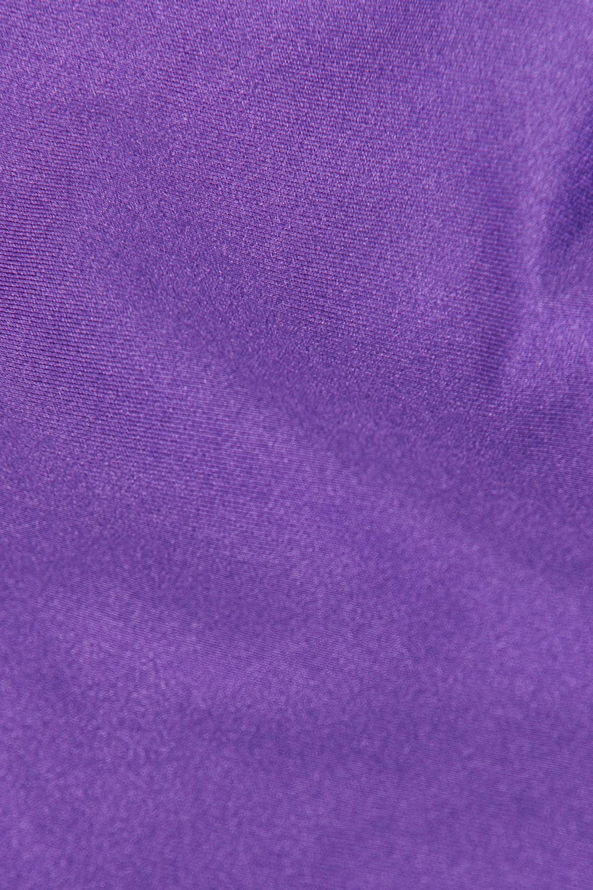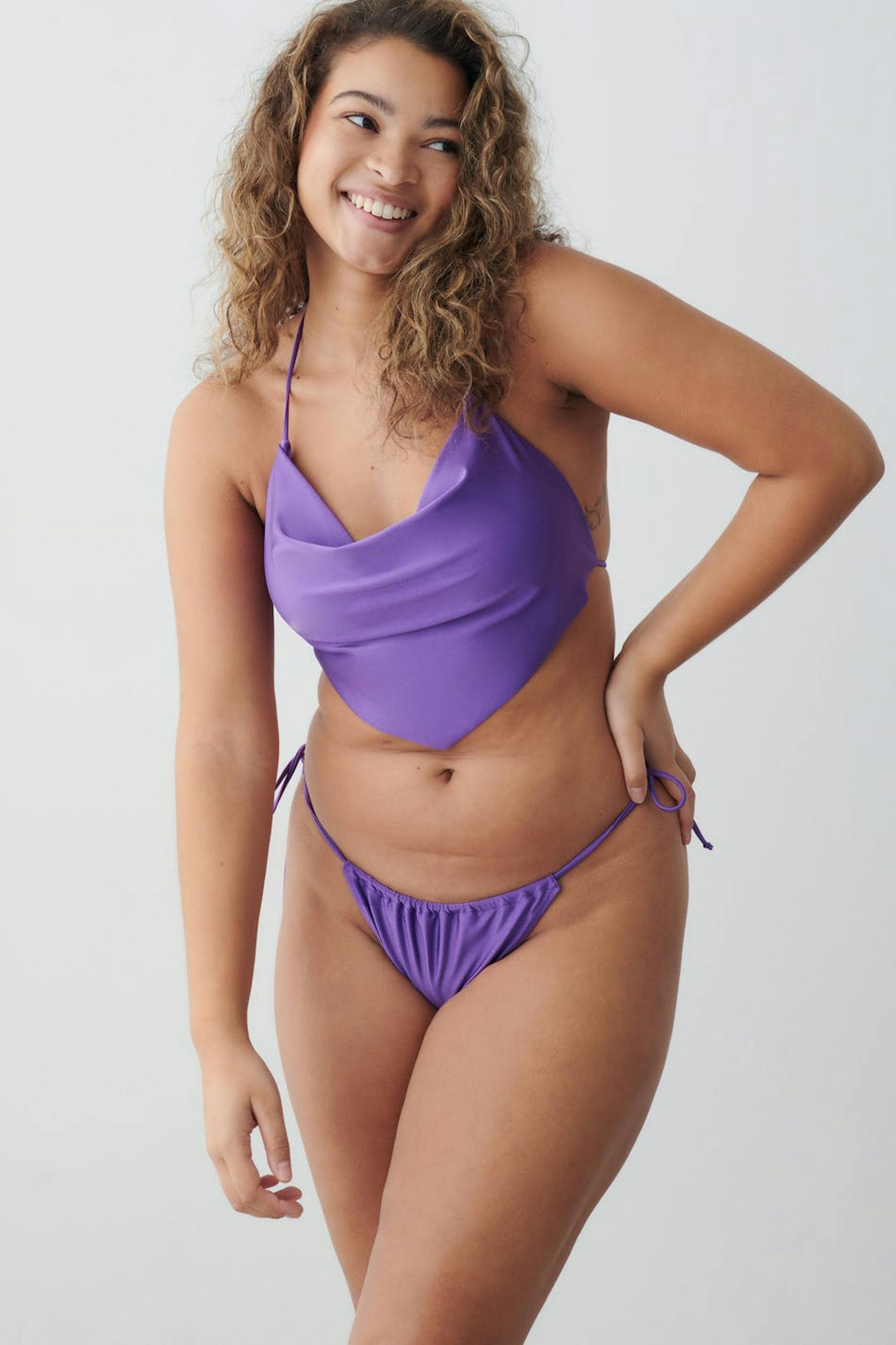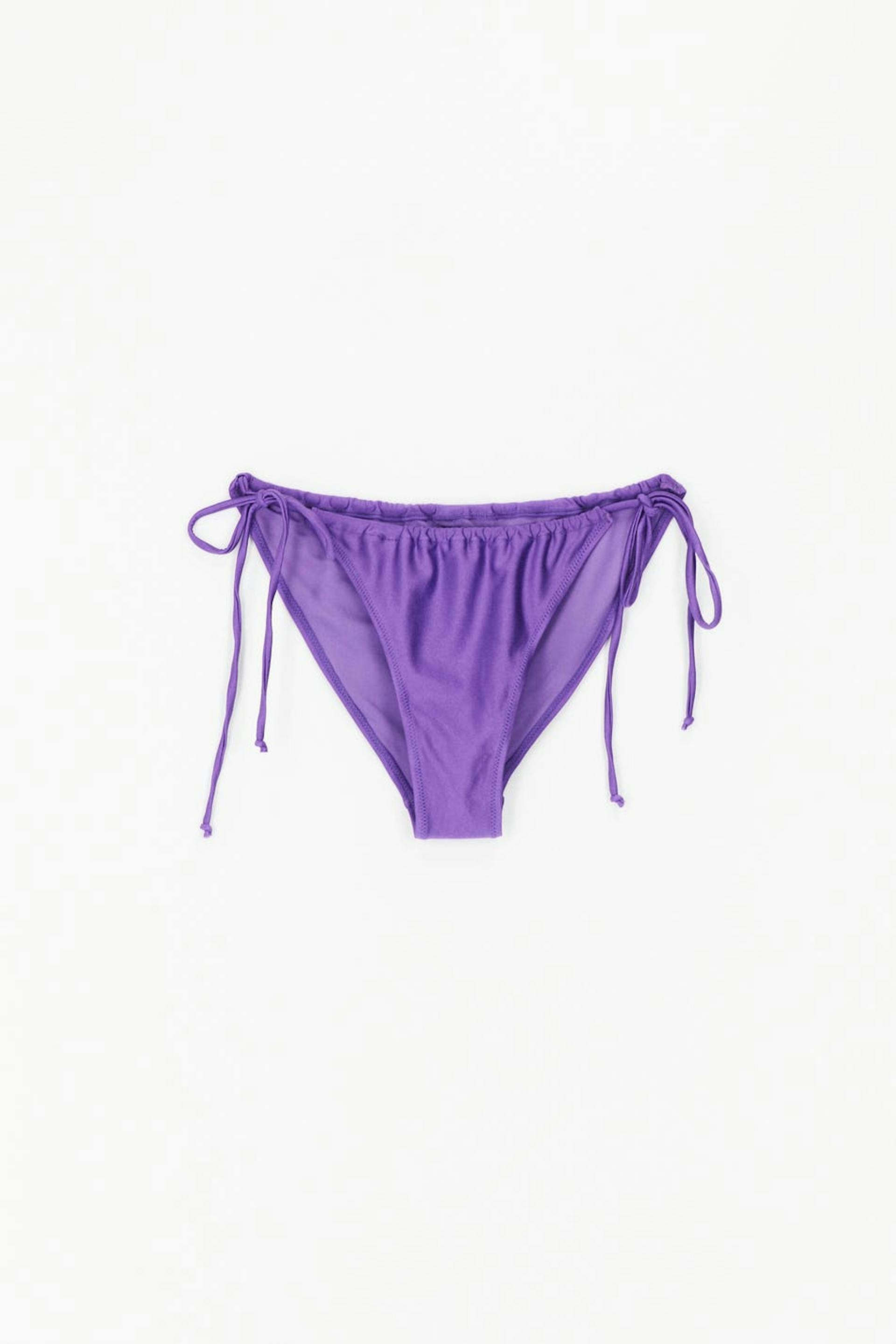 Fully lined bikini bottoms with self-tie in the sides. The panties are purple and have elastic at the edges.
