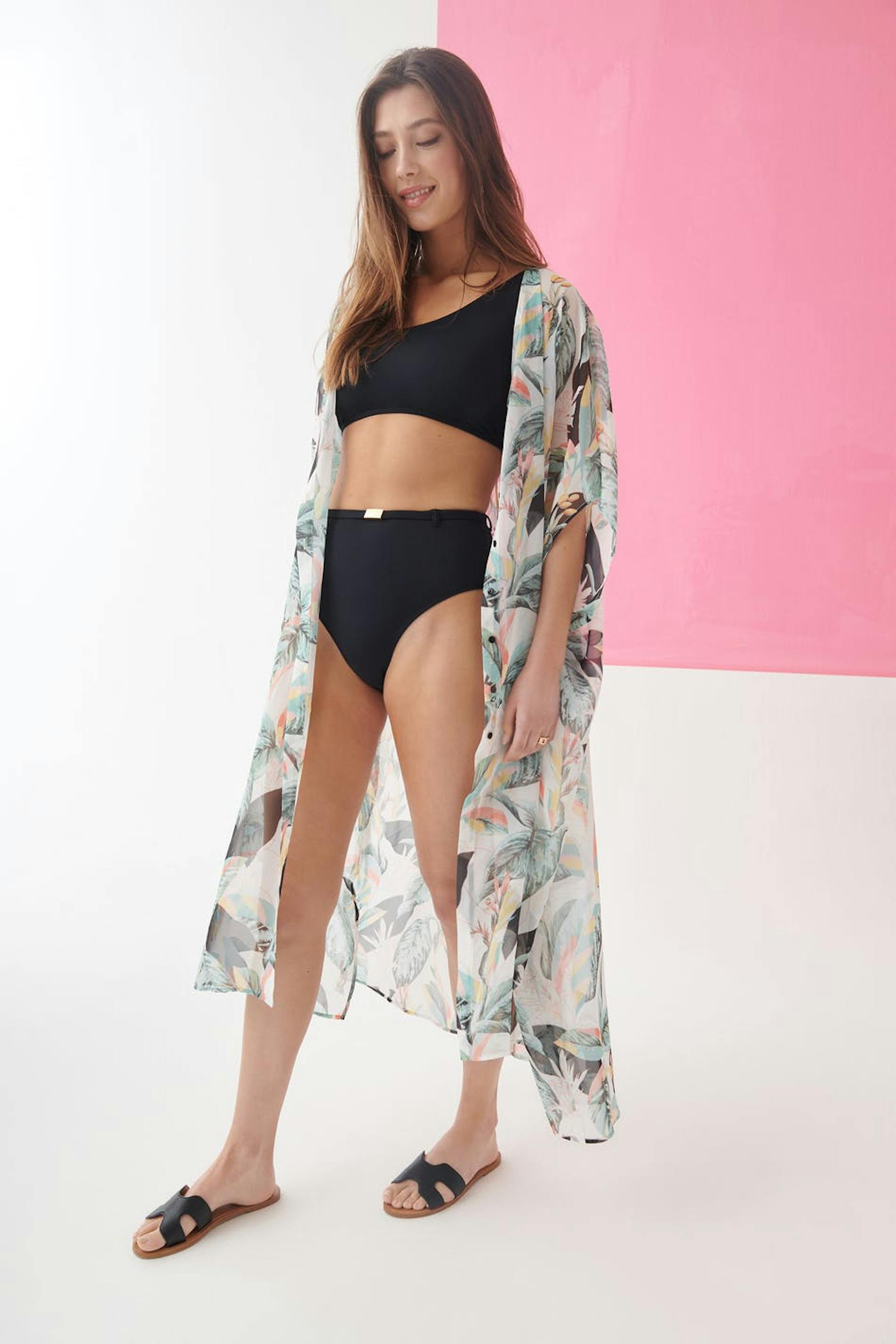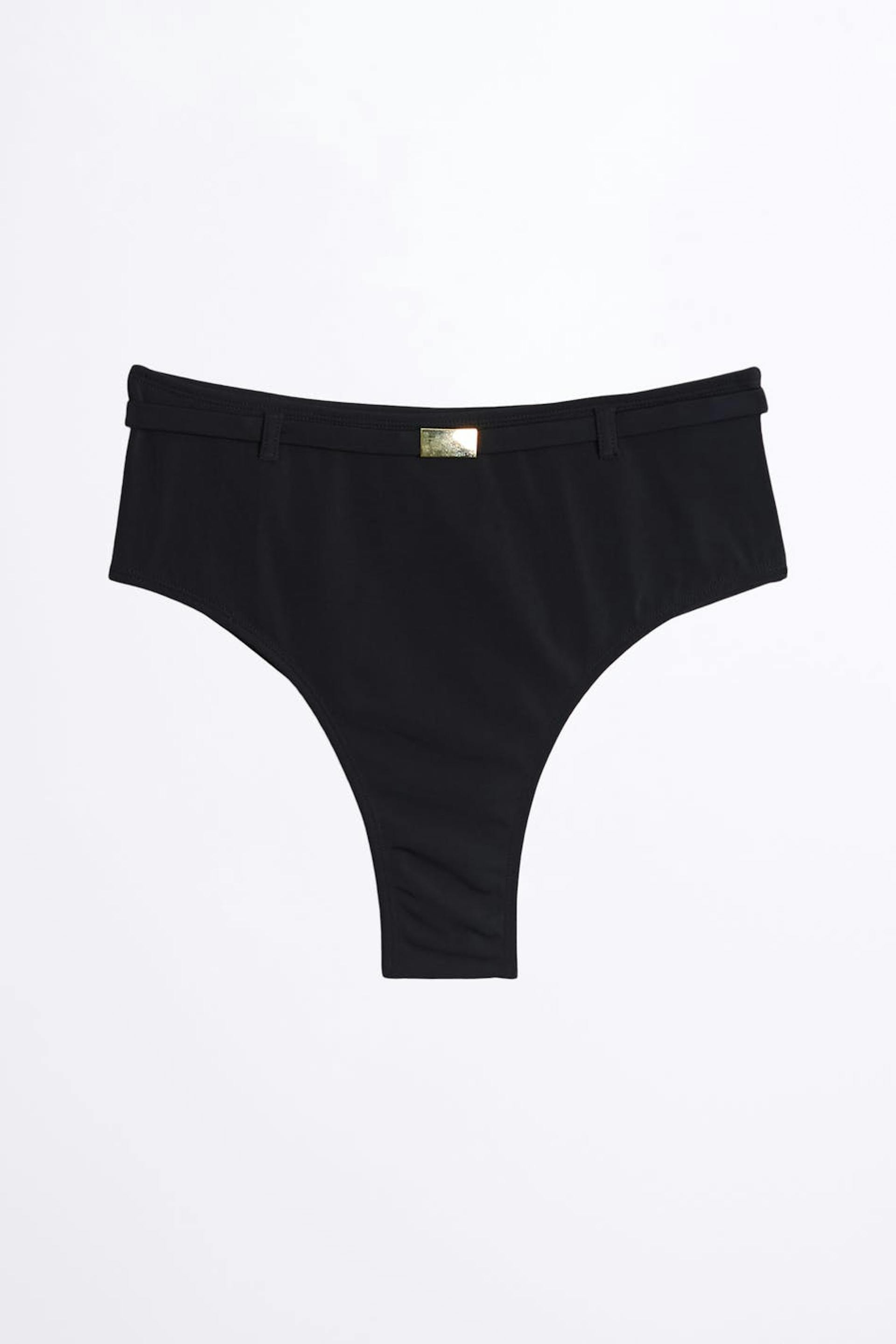Bikini bottoms with a high waist. The panties are black and have a detail with a thin belt with a buckle at the front. They have matt swimsuit material.