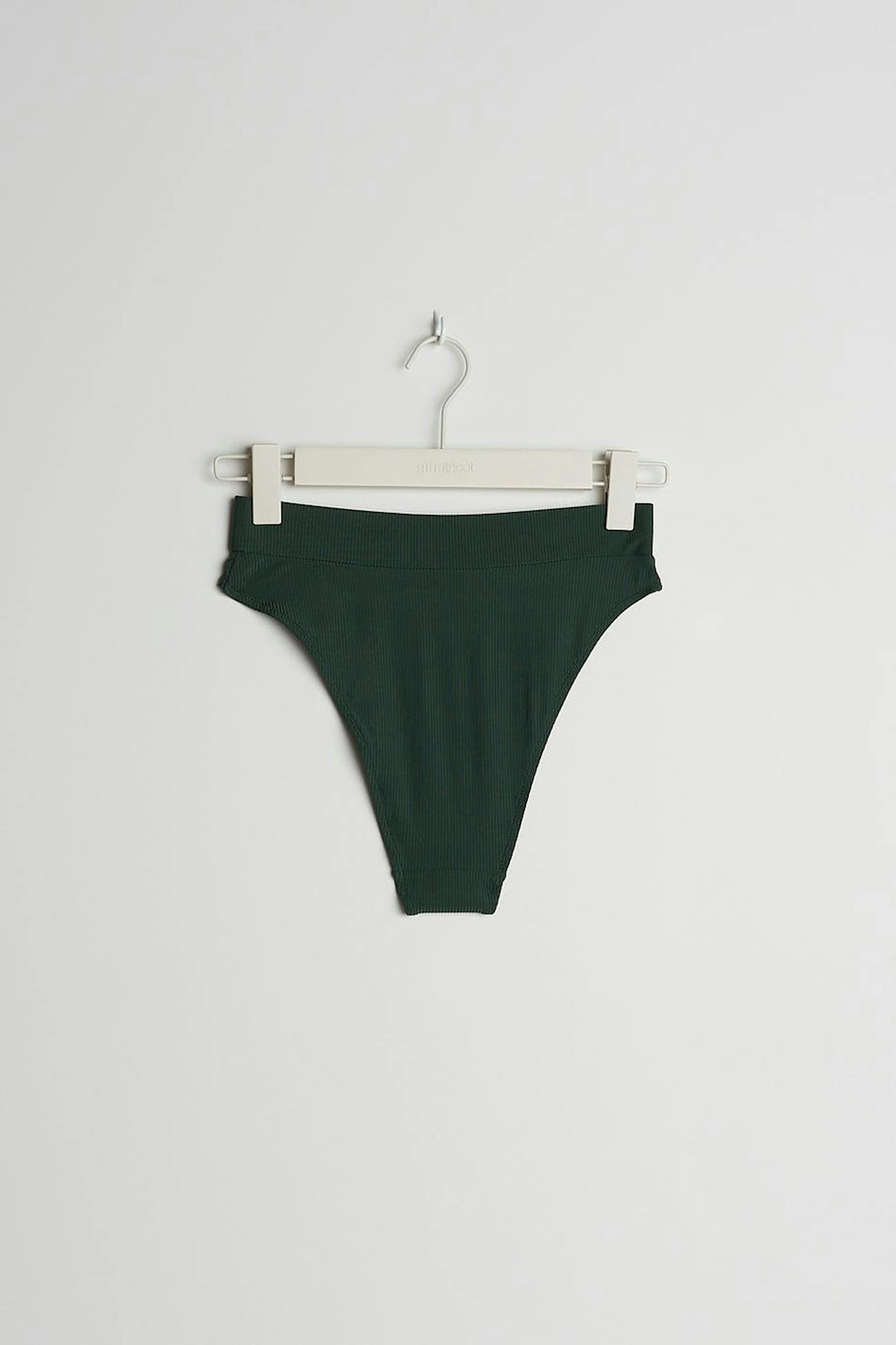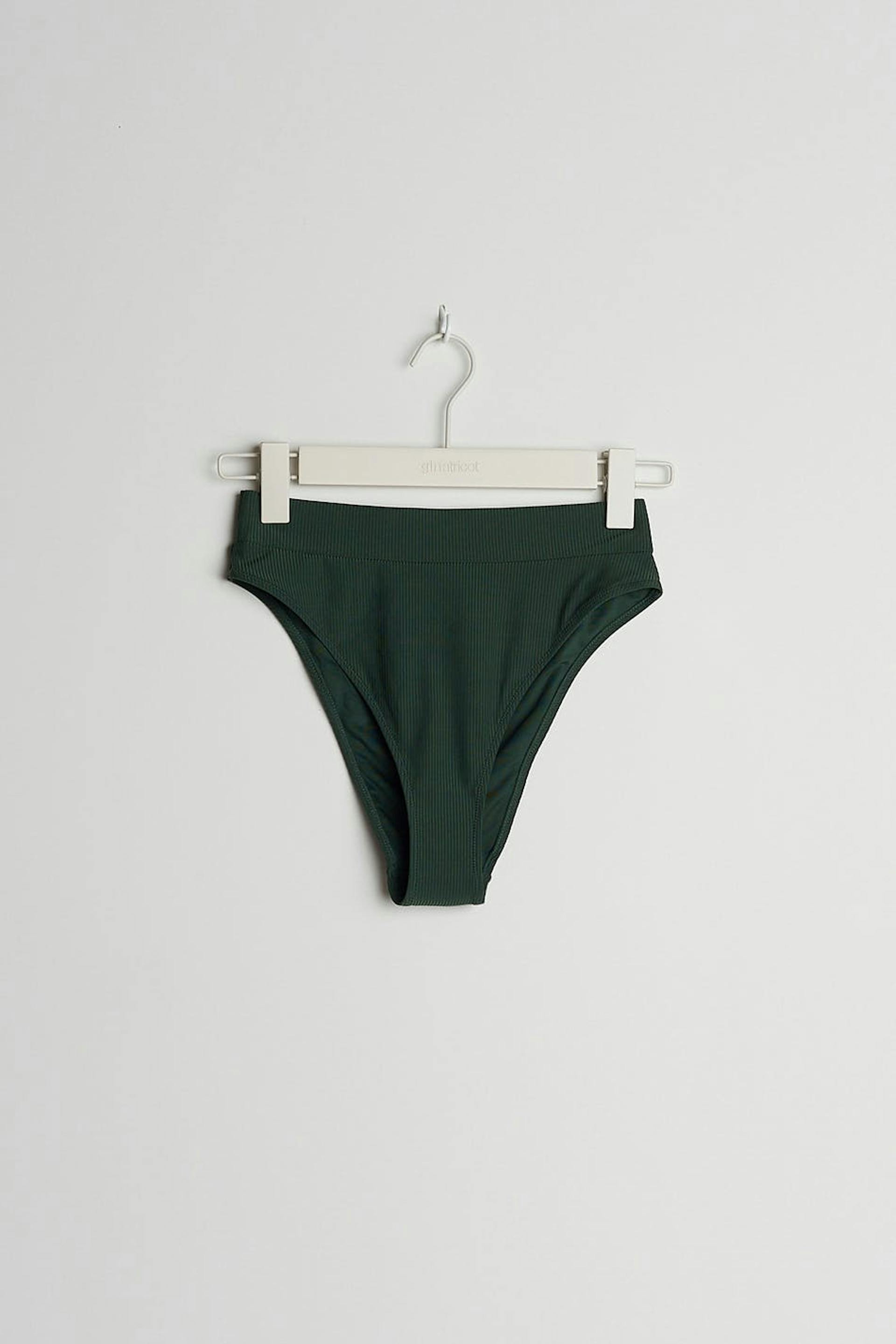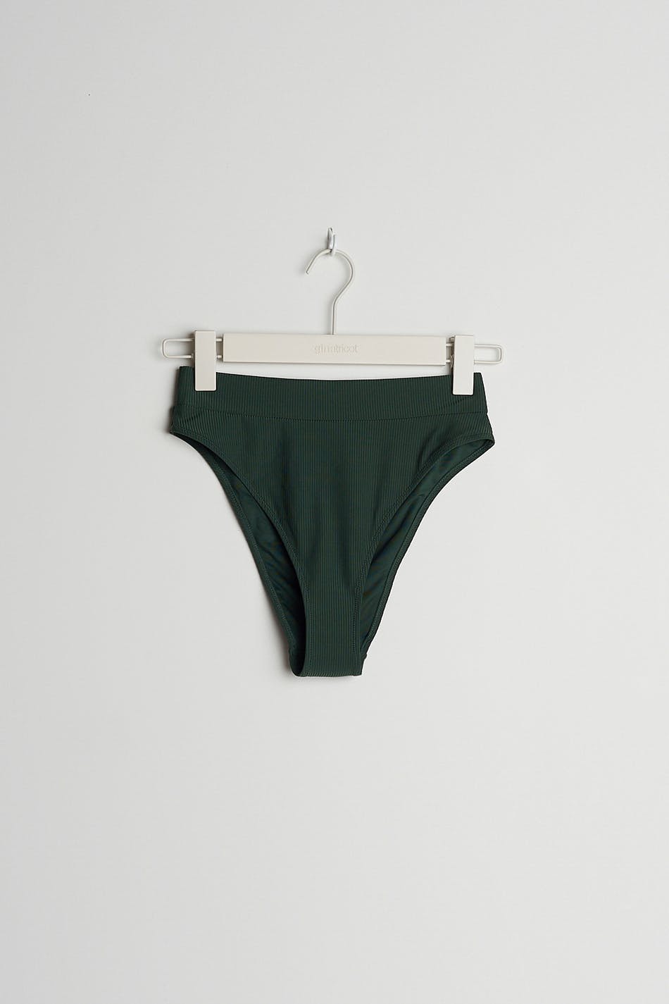 Bikini bottom with a high waist. The pantie is green and has ribbed swimsuit material. It has a soft elastic band at the waist and on the leg openings.