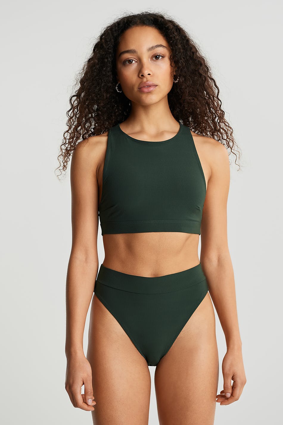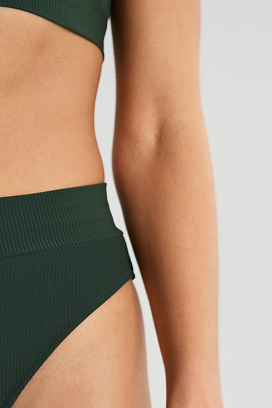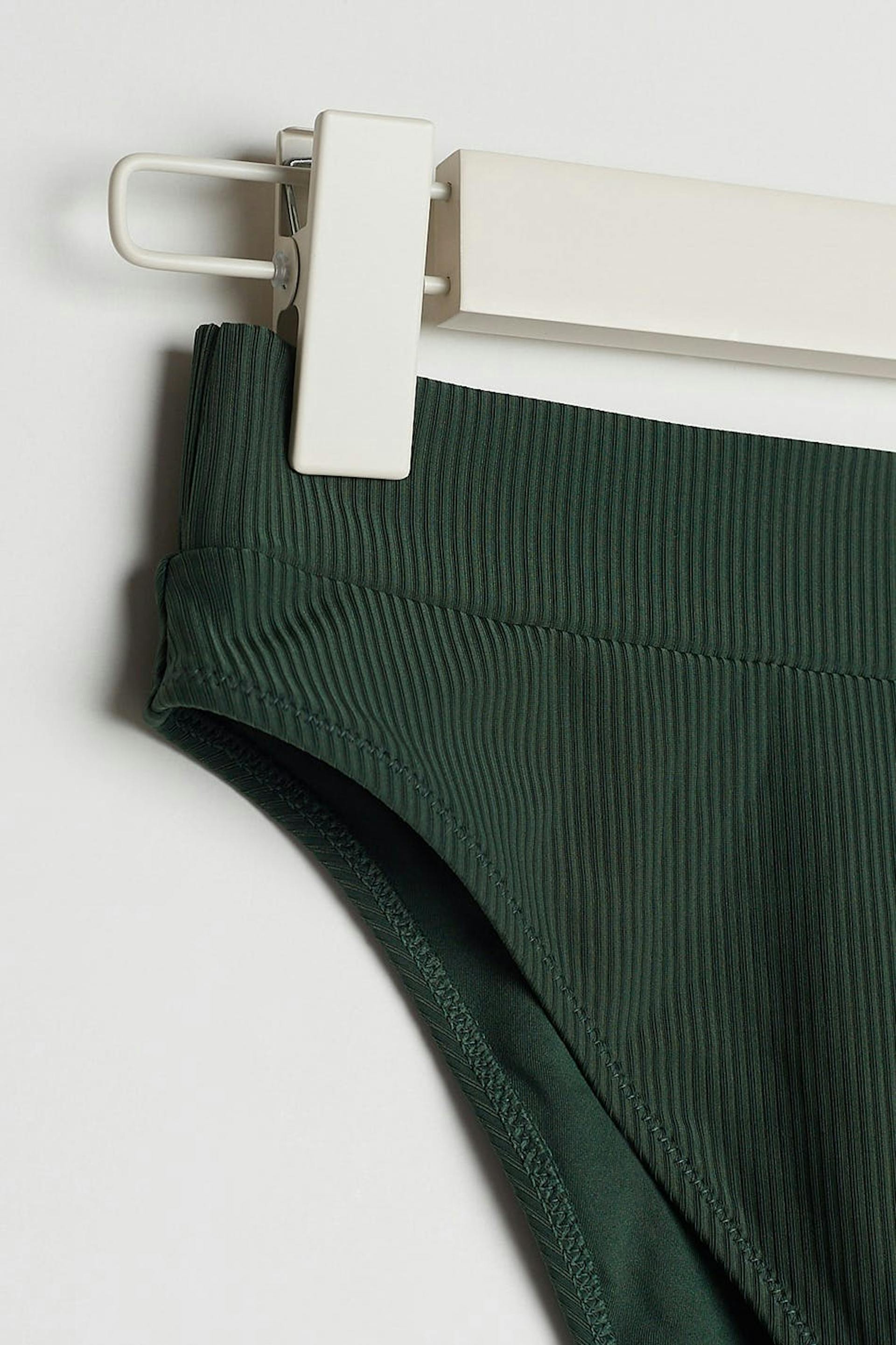 Bikini bottom with a high waist. The pantie is green and has ribbed swimsuit material. It has a soft elastic band at the waist and on the leg openings.