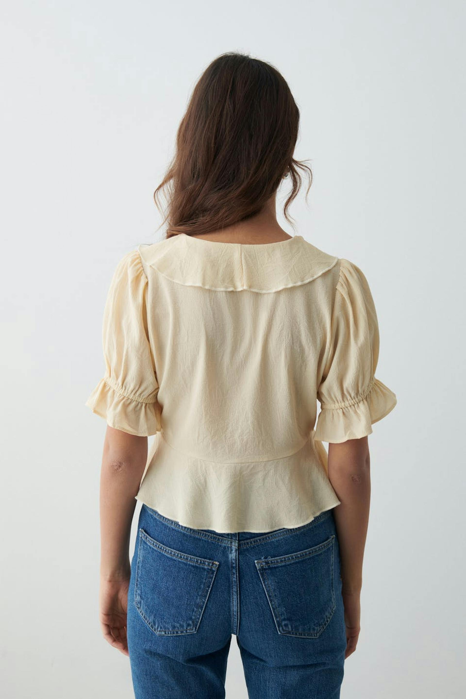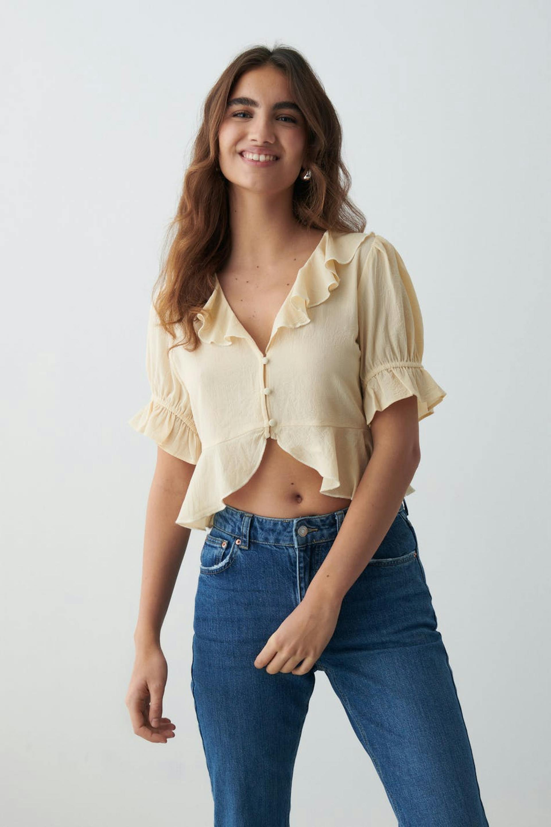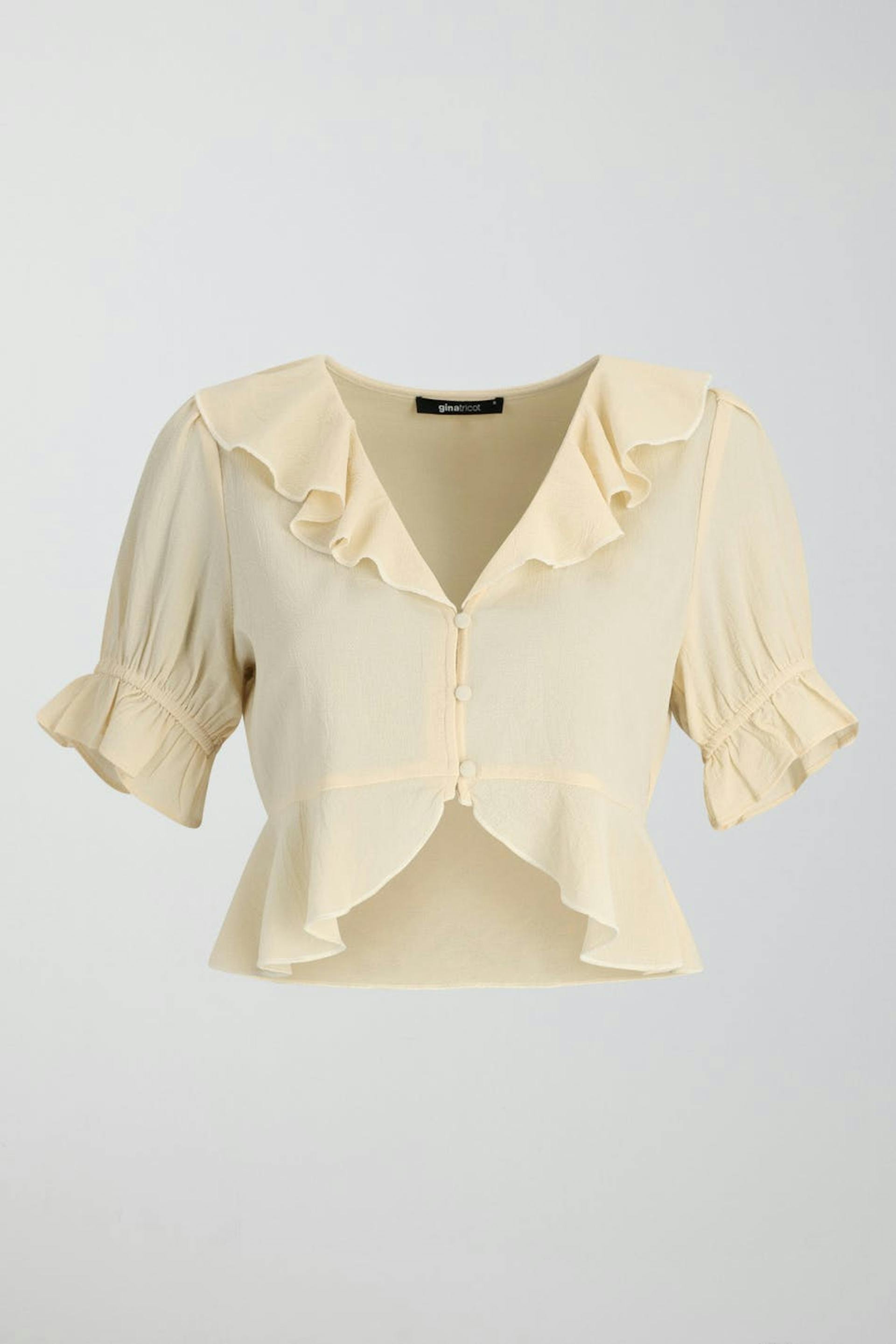 Cropped blouse with short puff sleeves. The blouse is white and has frills on the neckline and at the bottom. It has v-neck, button placket at the front and elasticized cuffs.