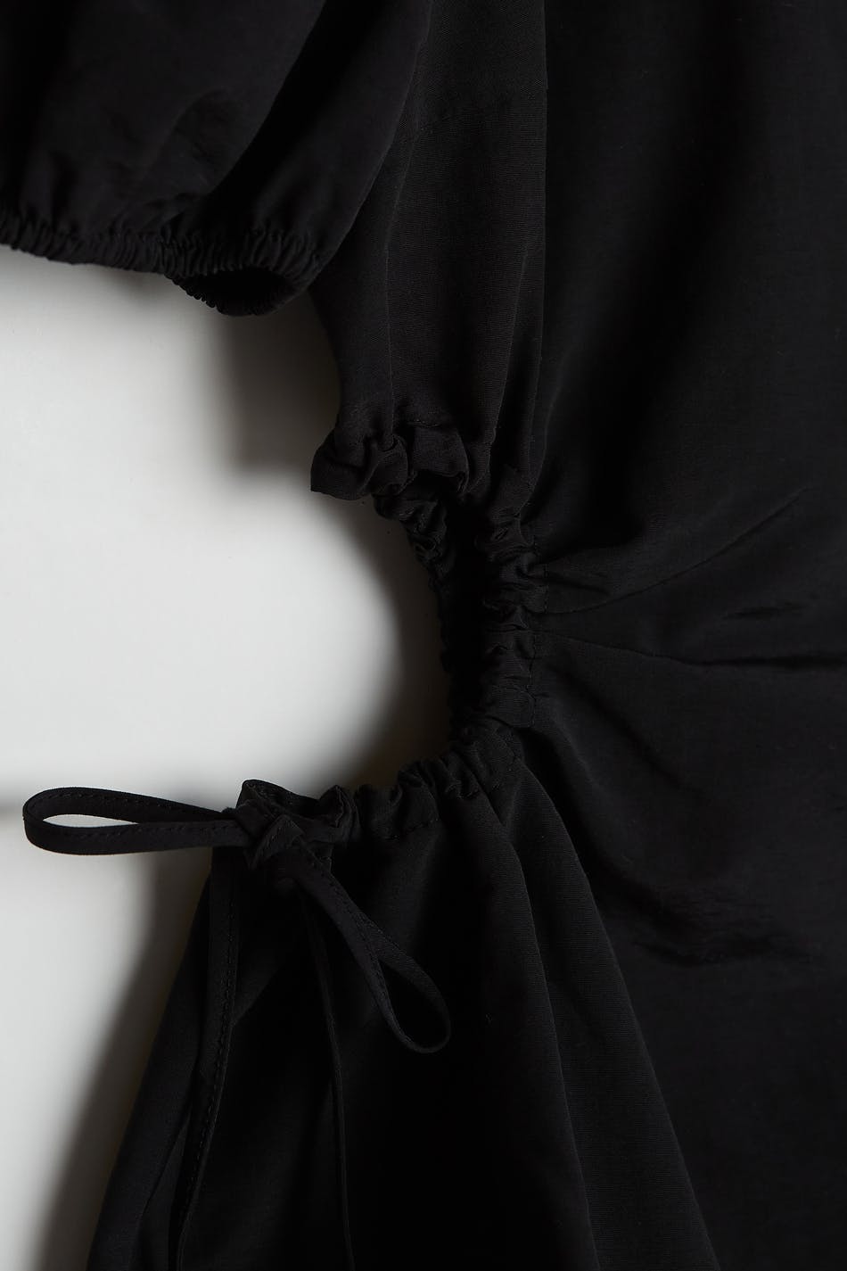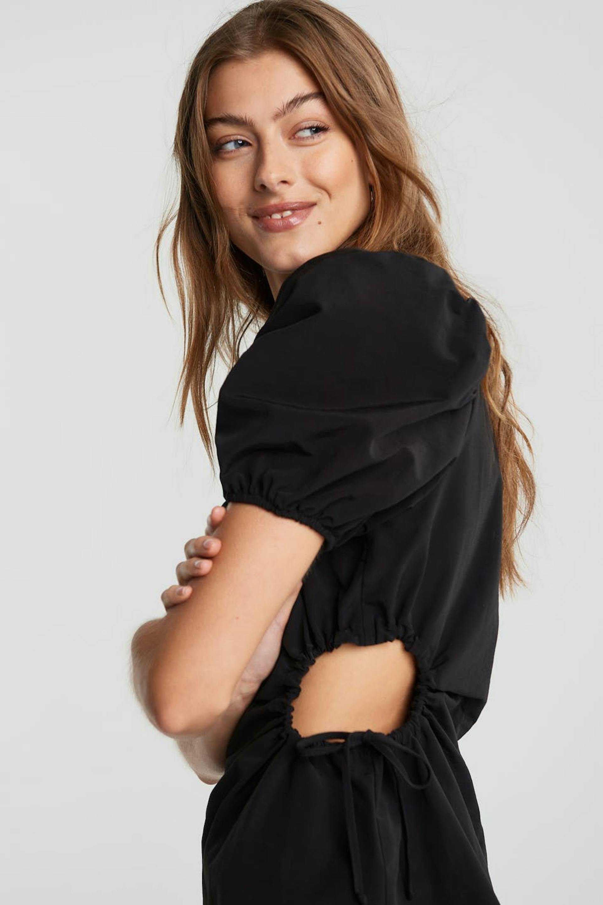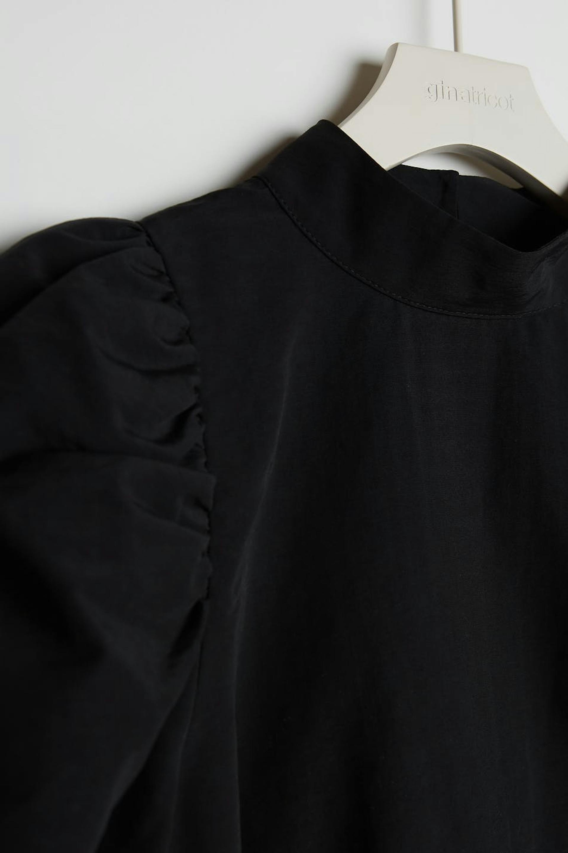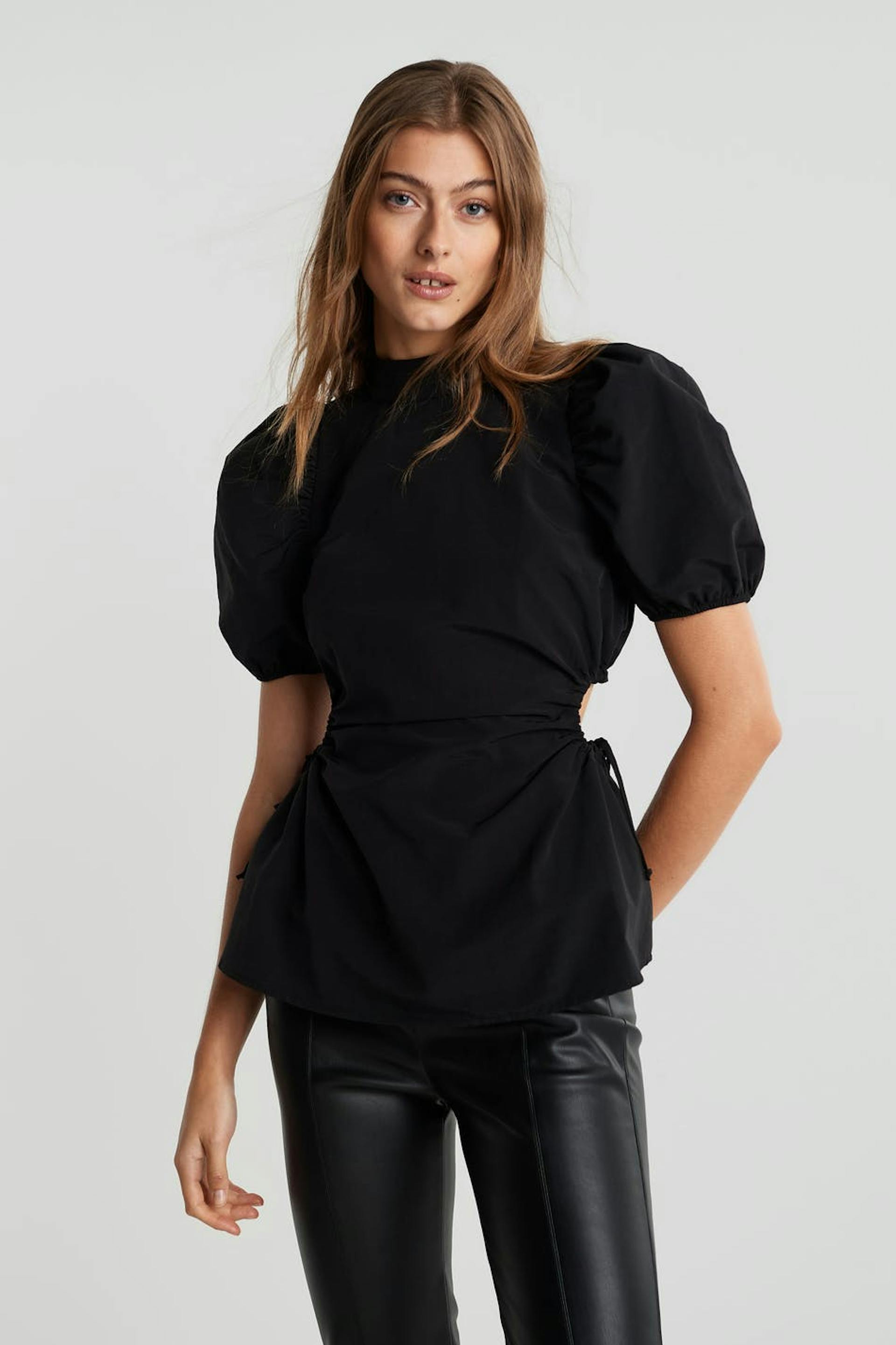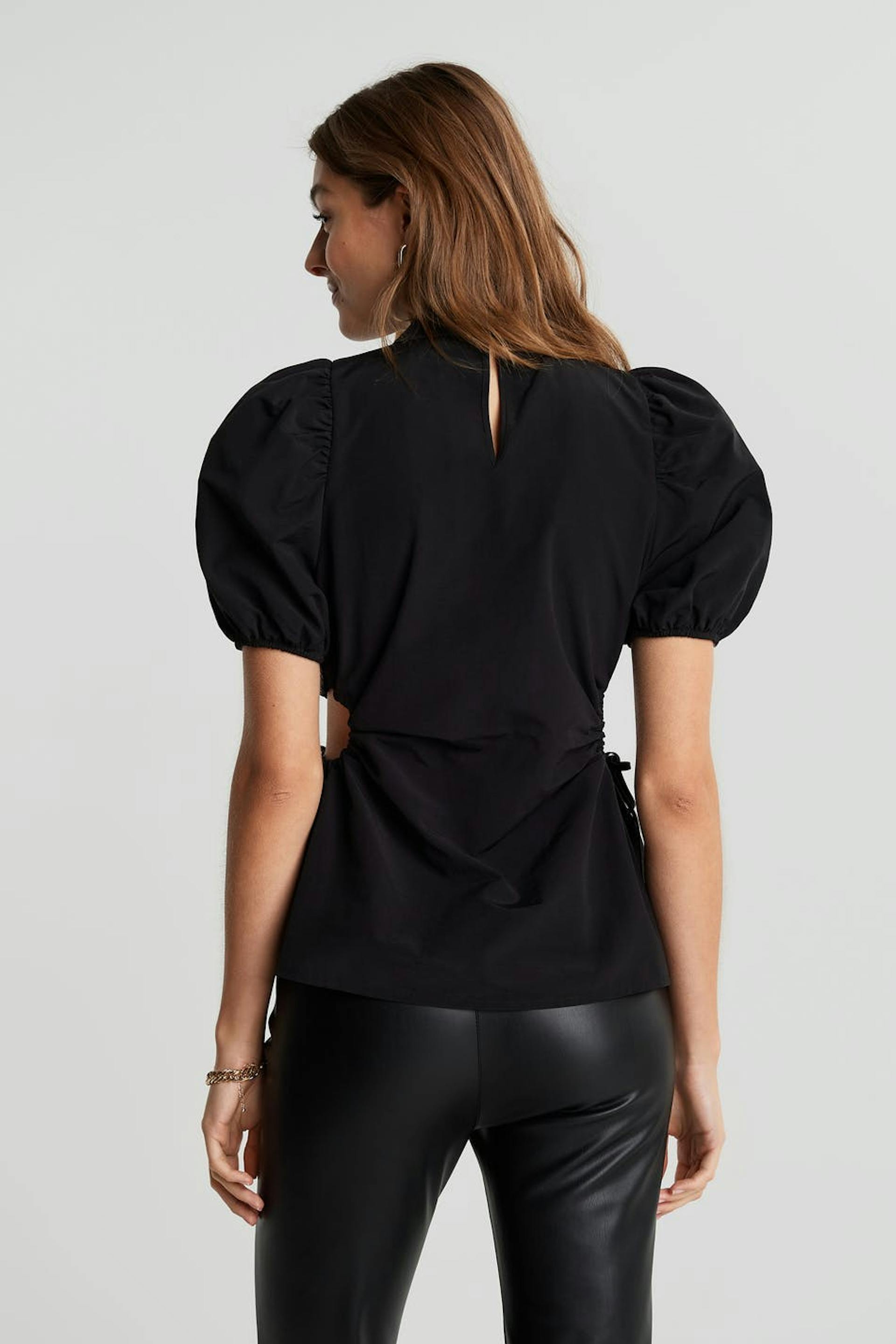 Blouse with short puff sleeves with elastic band on the sleeve ends. The blouse is black and has keyhole openings on the sides with drawstring and a self-tie. It has a high neckline.
