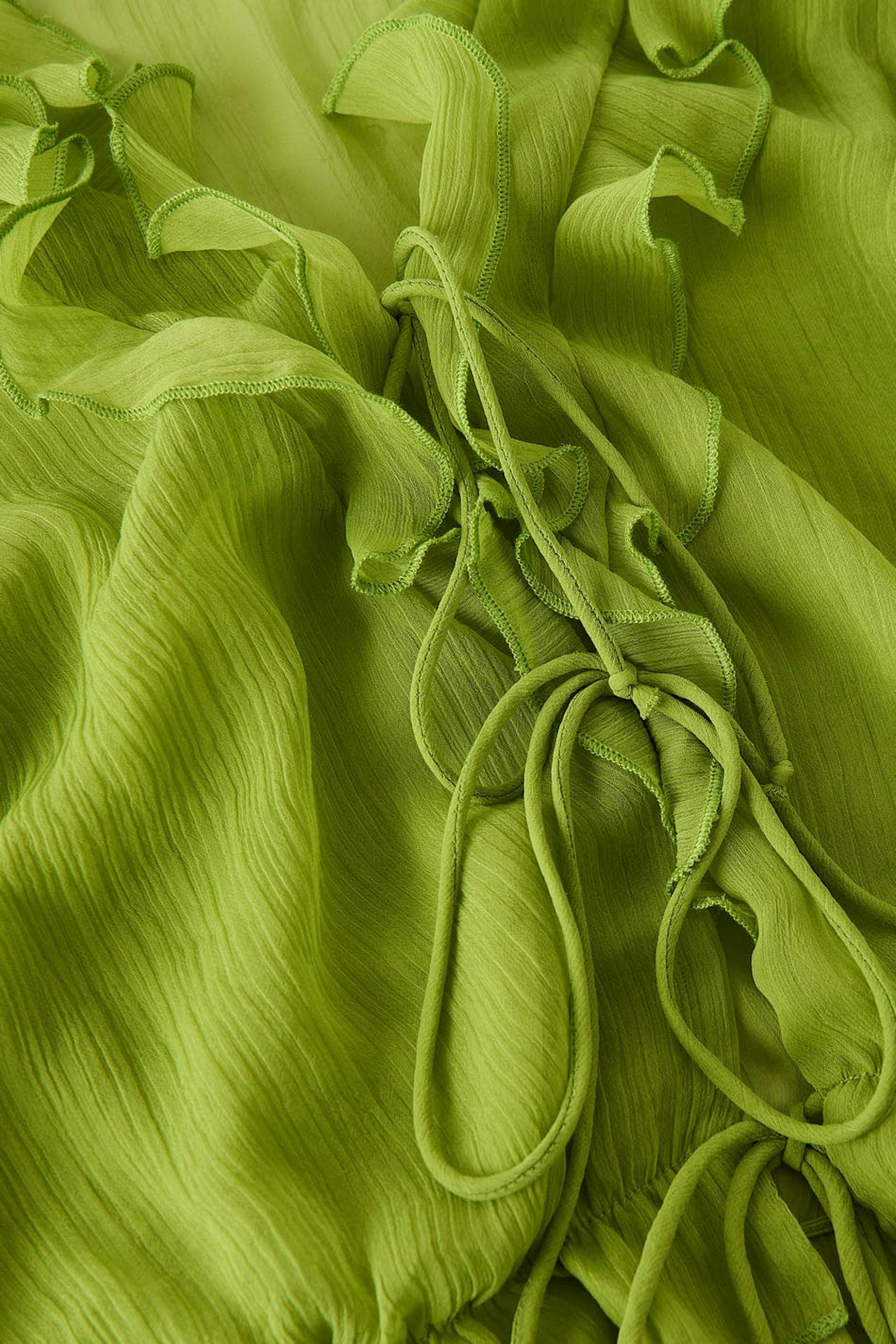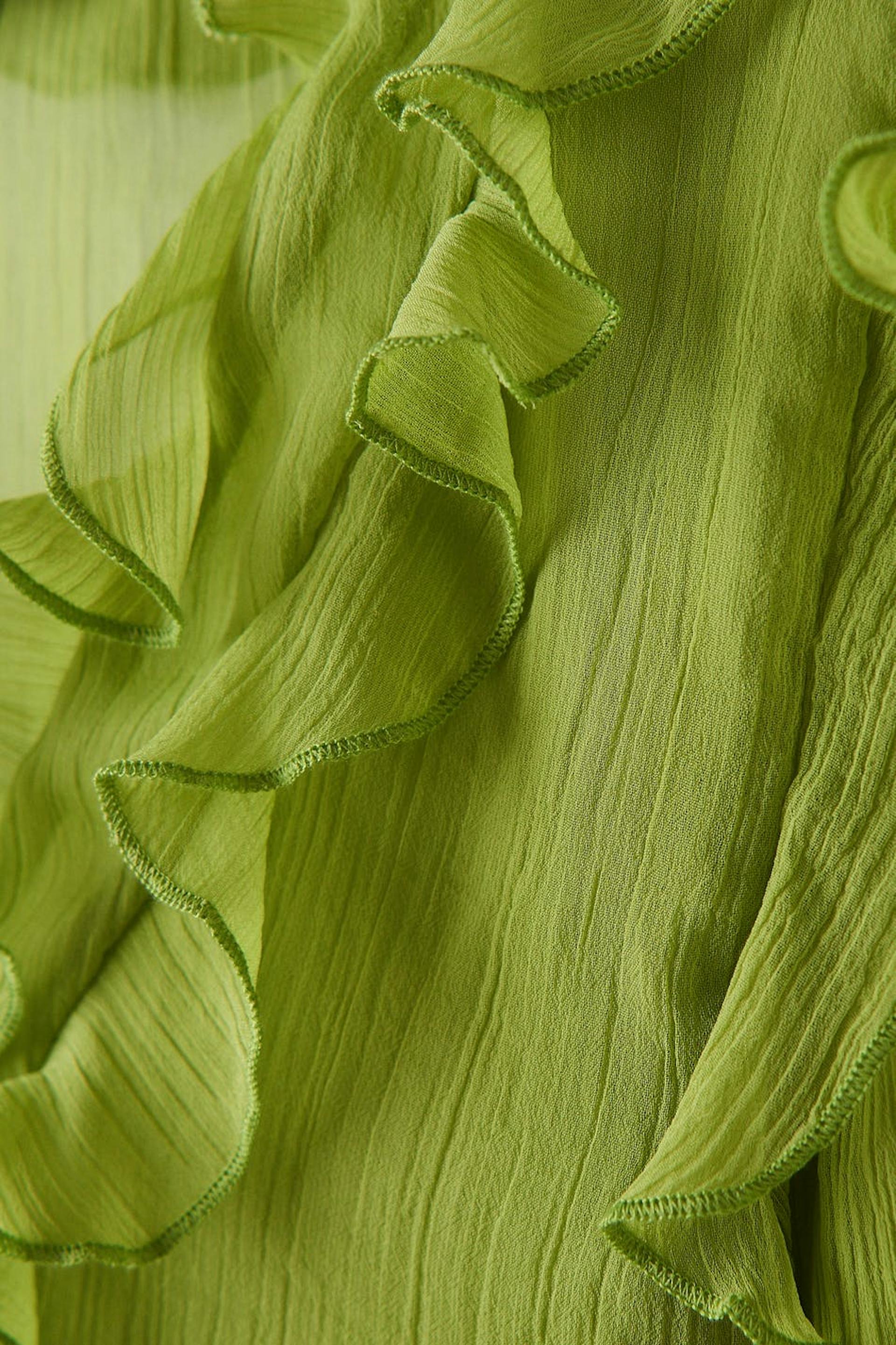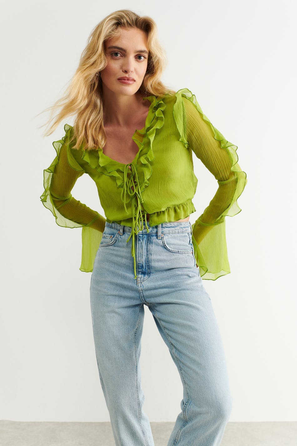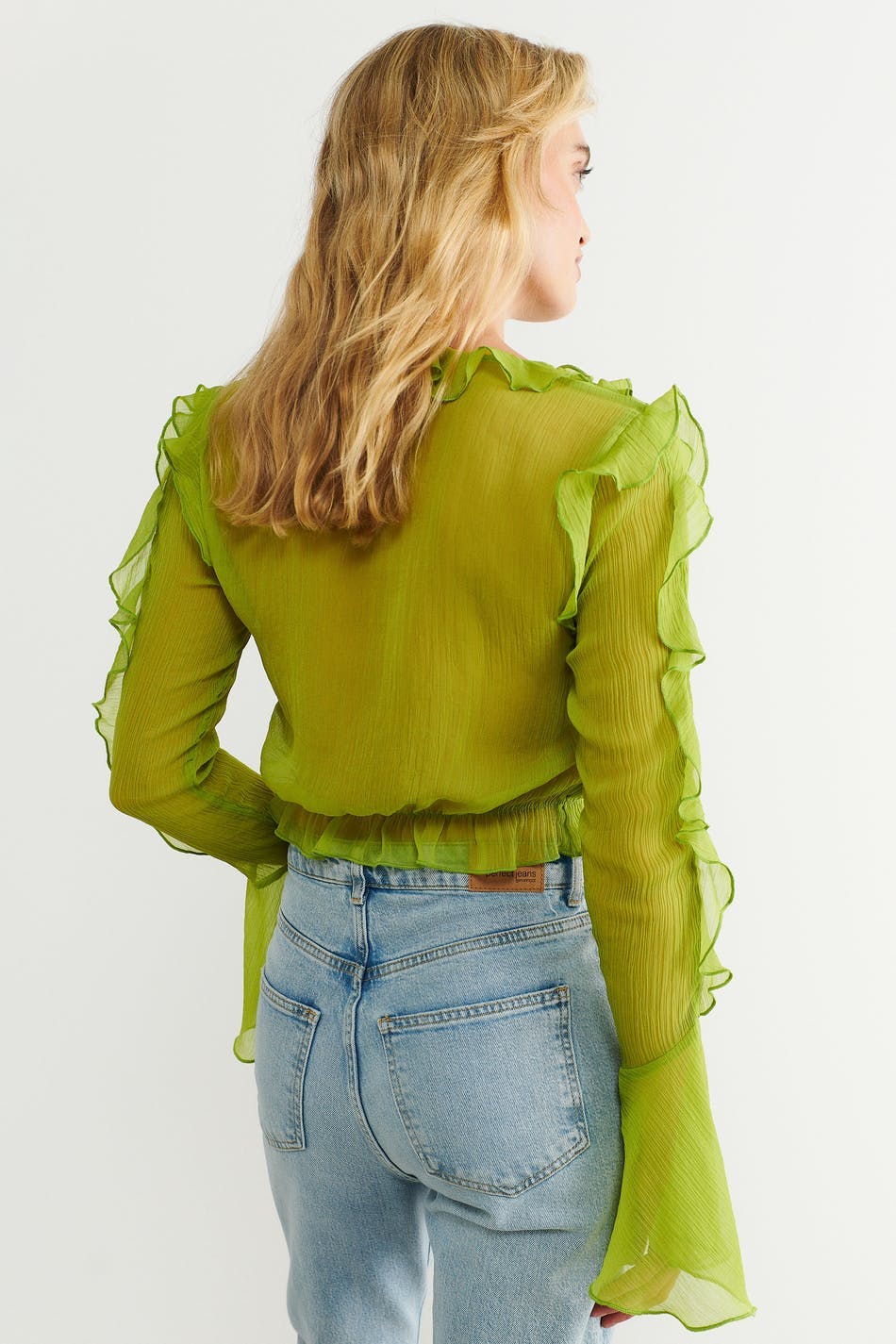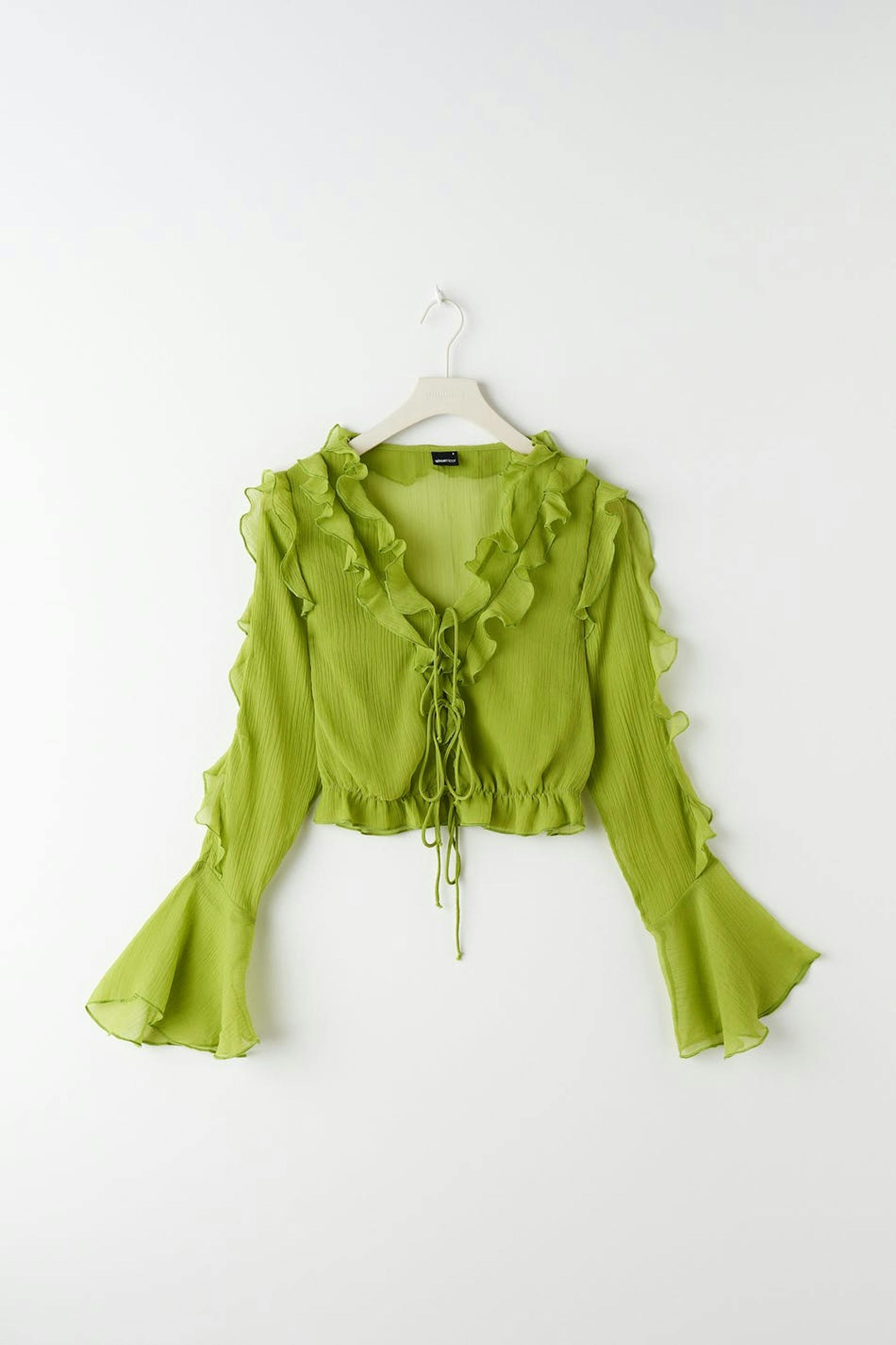 Sheer blouse in chiffon with v neckline. The blouse is green and has a knot detail at the front. It has trumpet sleeves and frills at the bottom hem and on the sleeve ends.