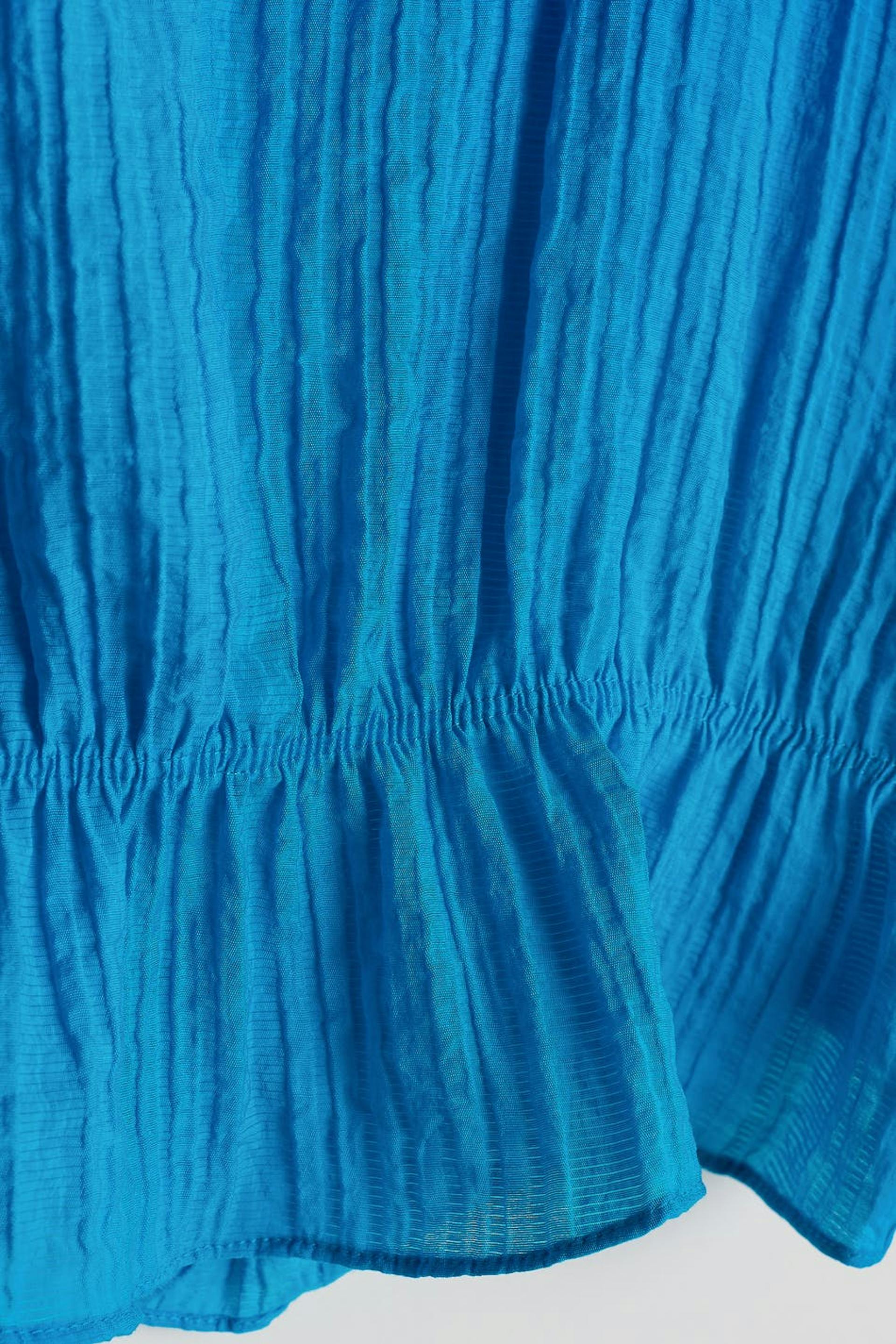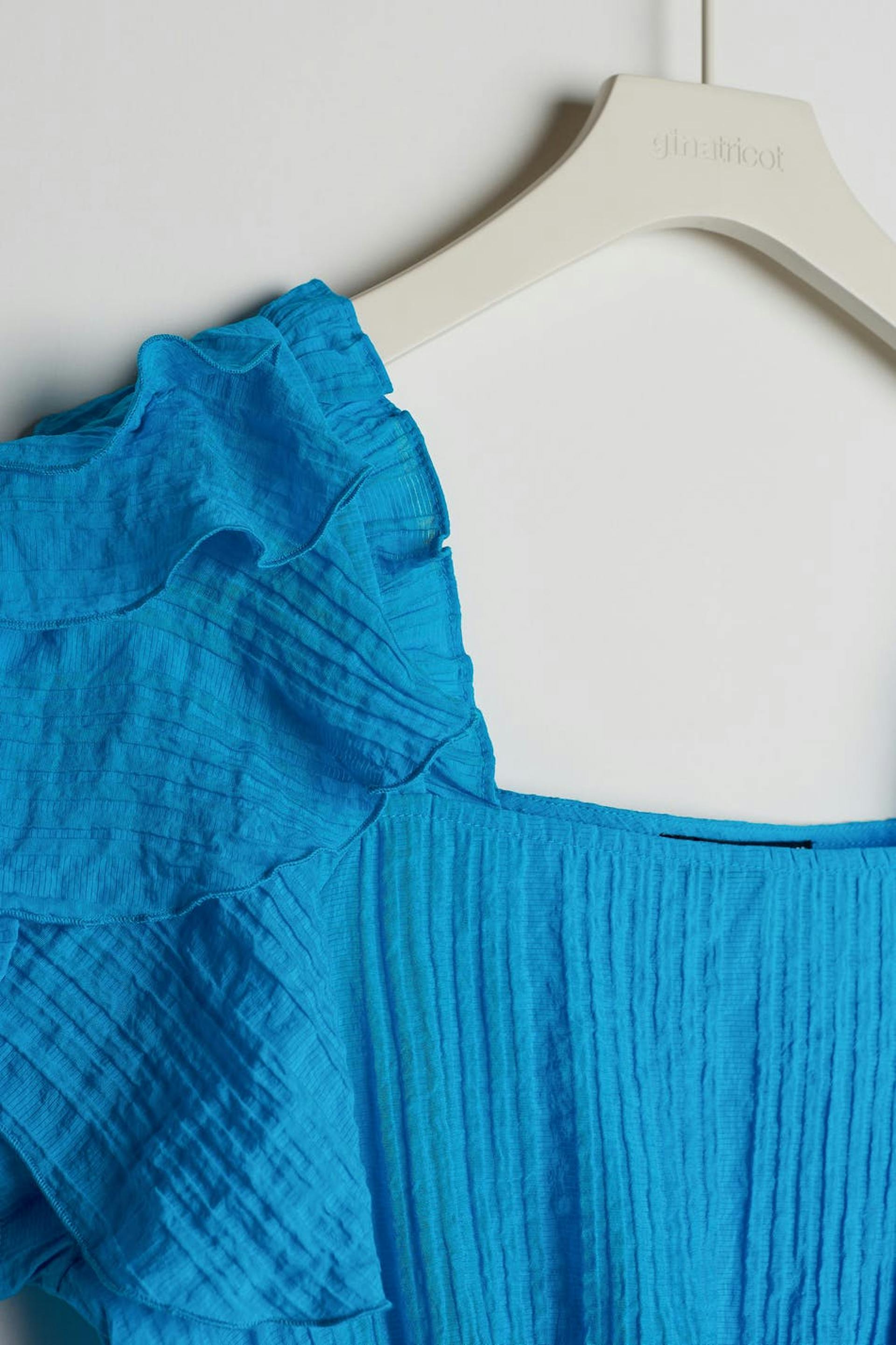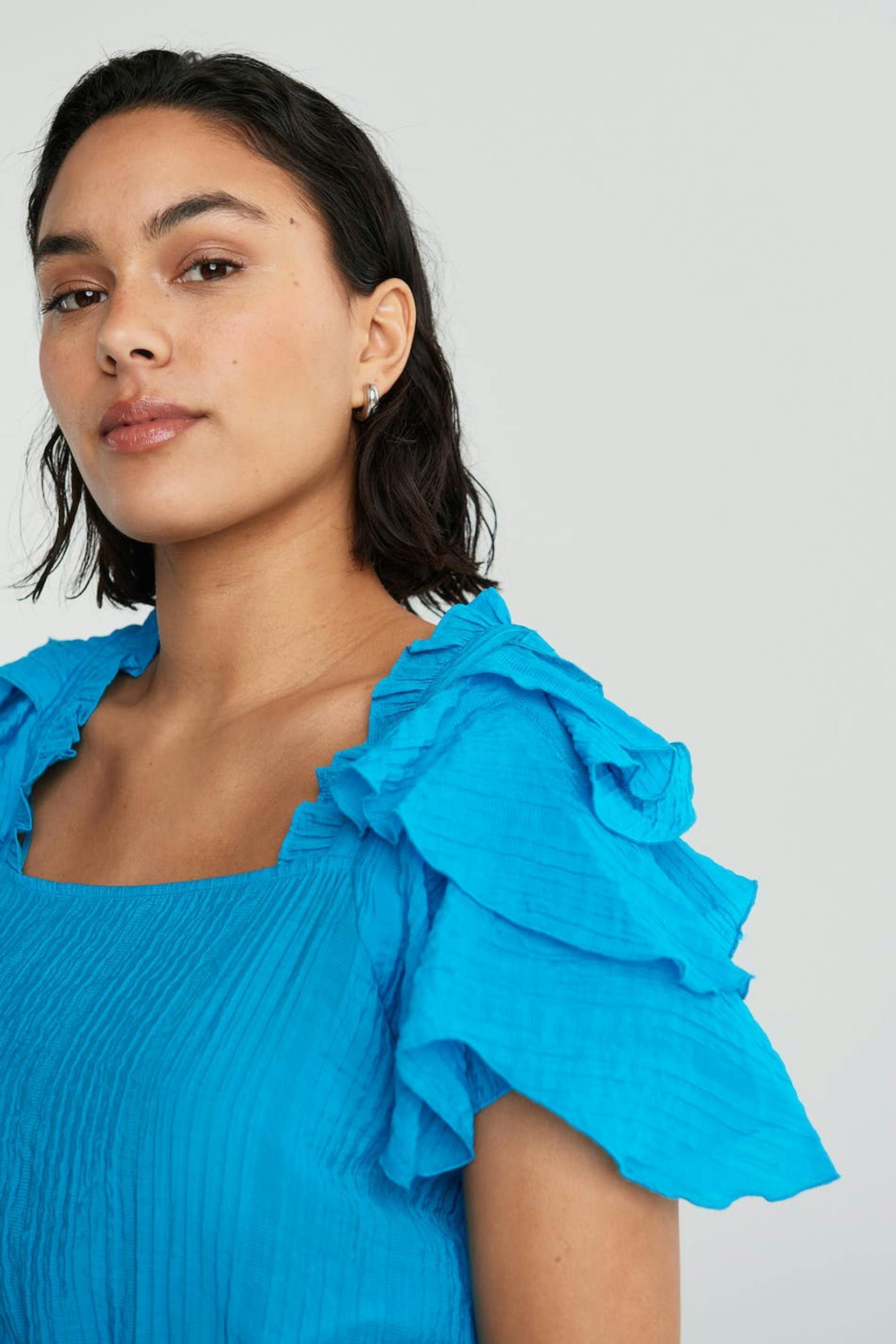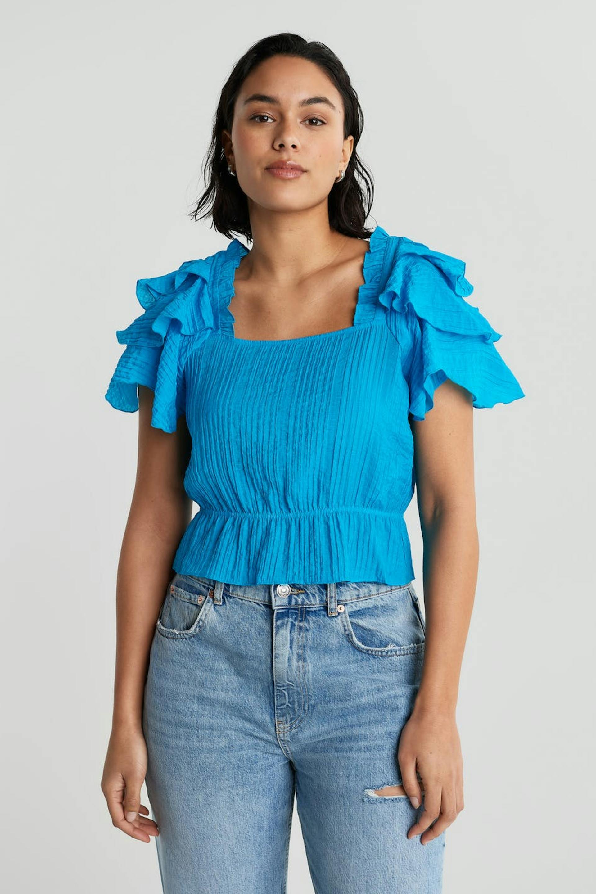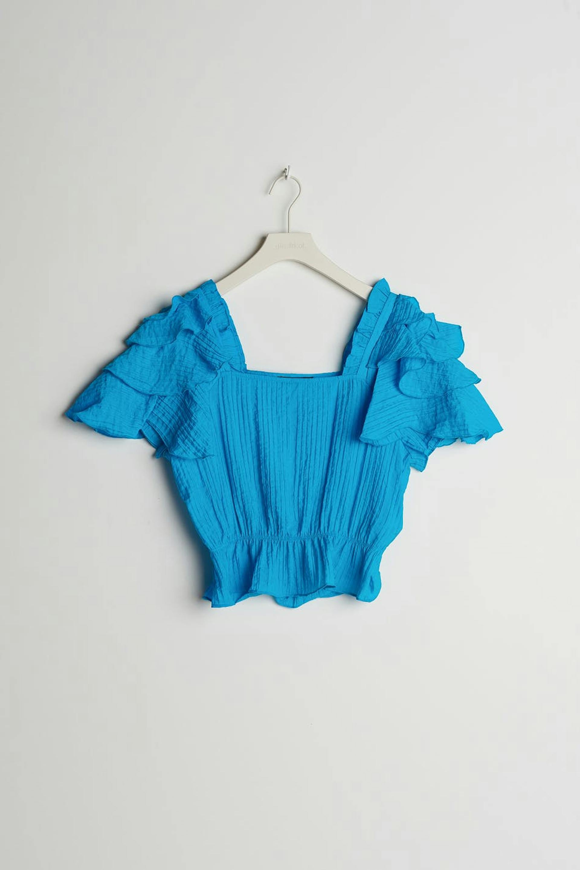 Short-sleeved blouse with ruffle details at the shoulders. The blouse is blue and has a square neckline. It has an elastic band at the waist with a small frill at the hem.