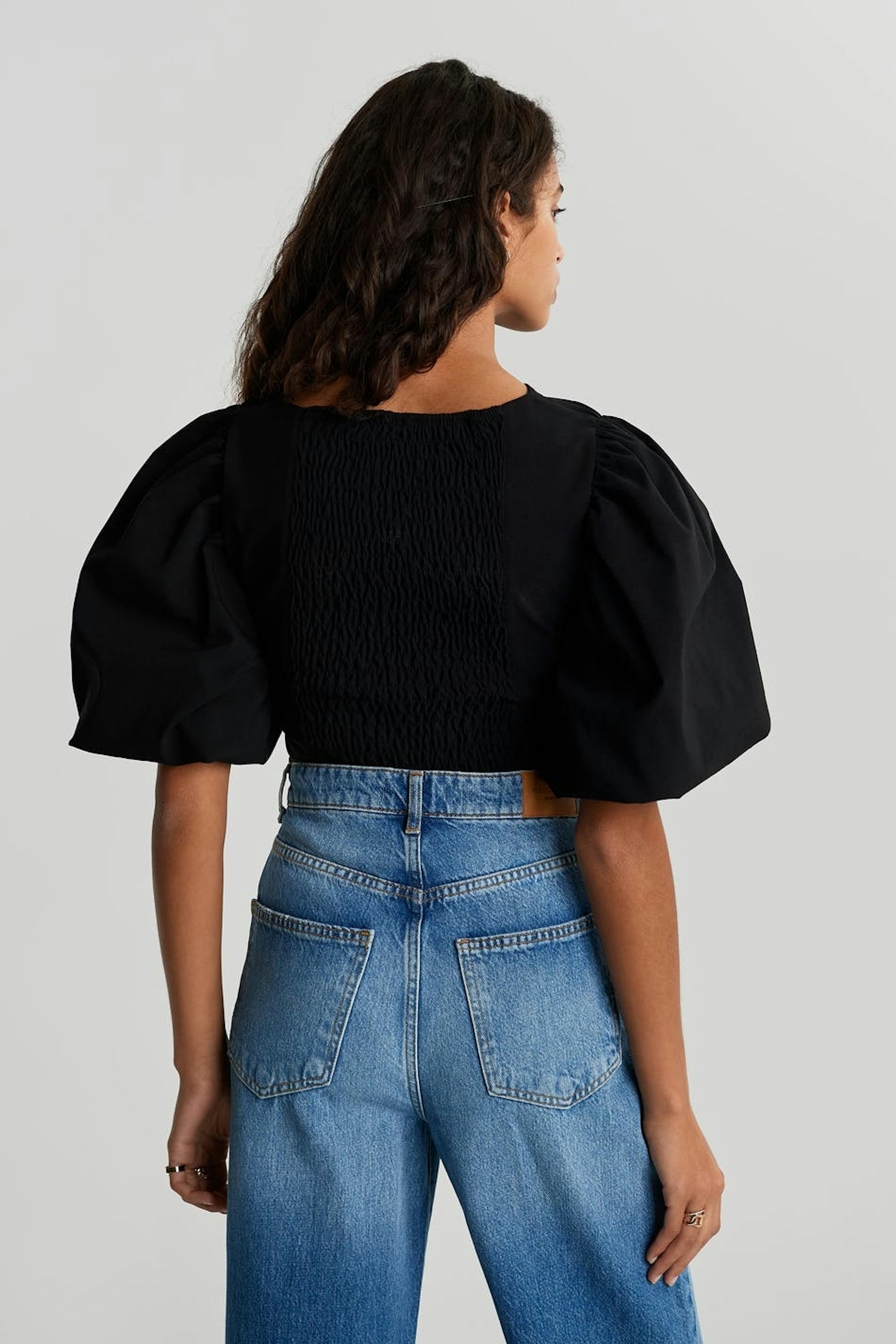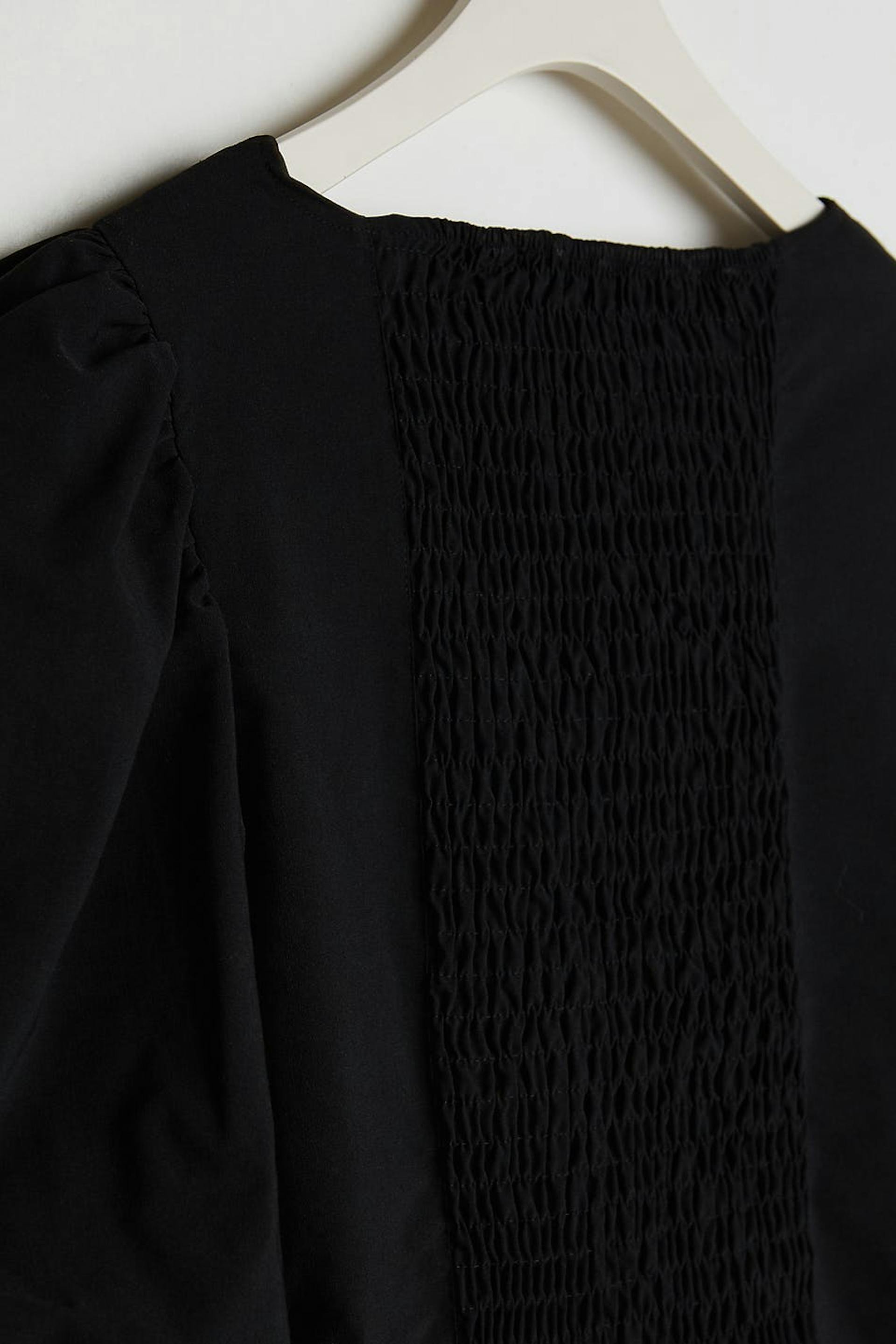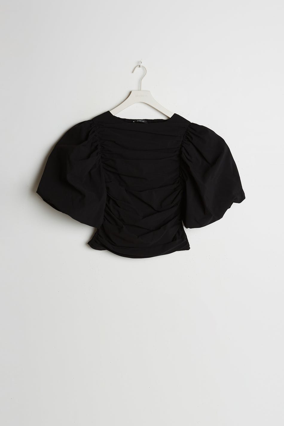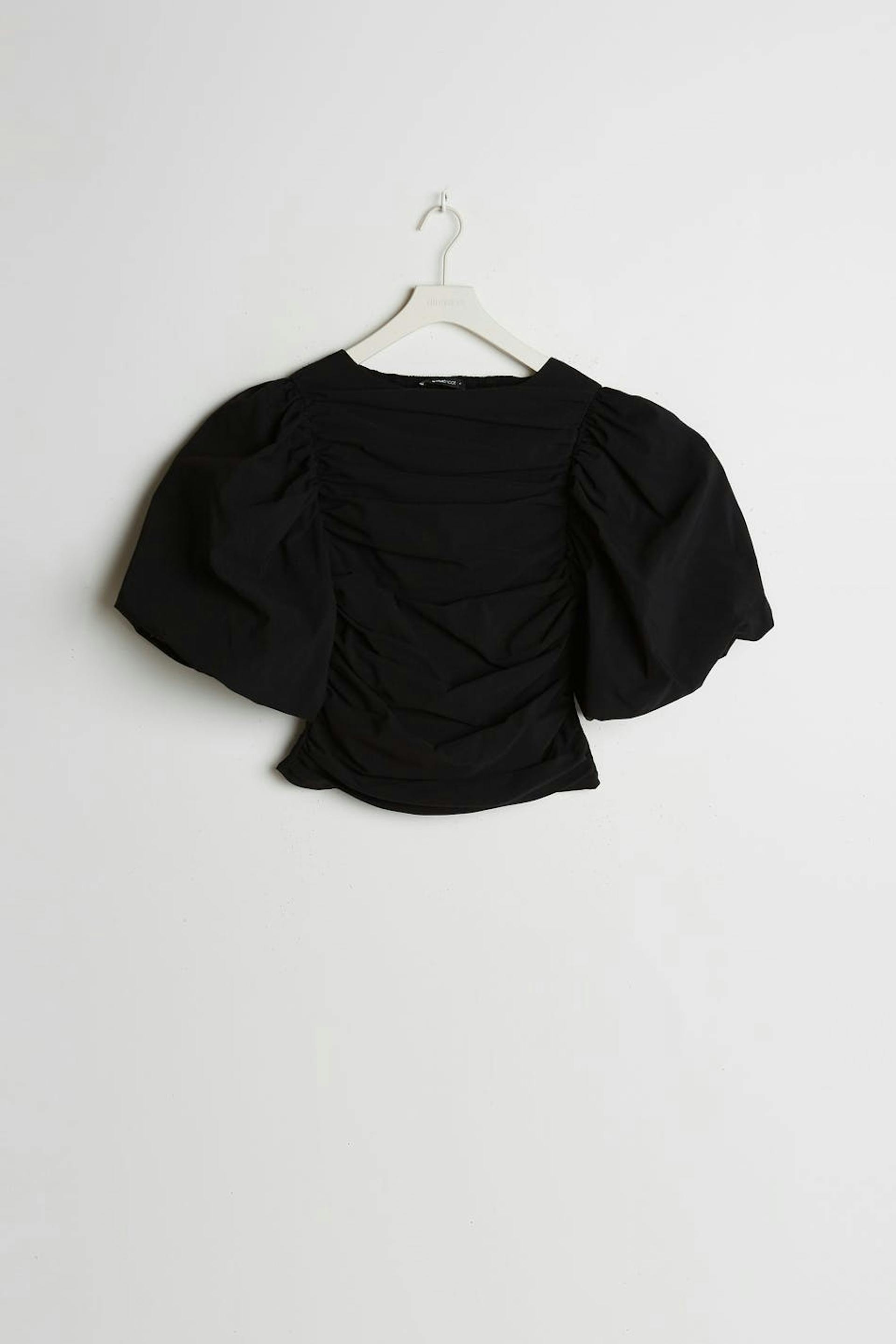 Blouse with short puff sleeves. The blouse is black and has ruching on the front. It has a smocking in the back.