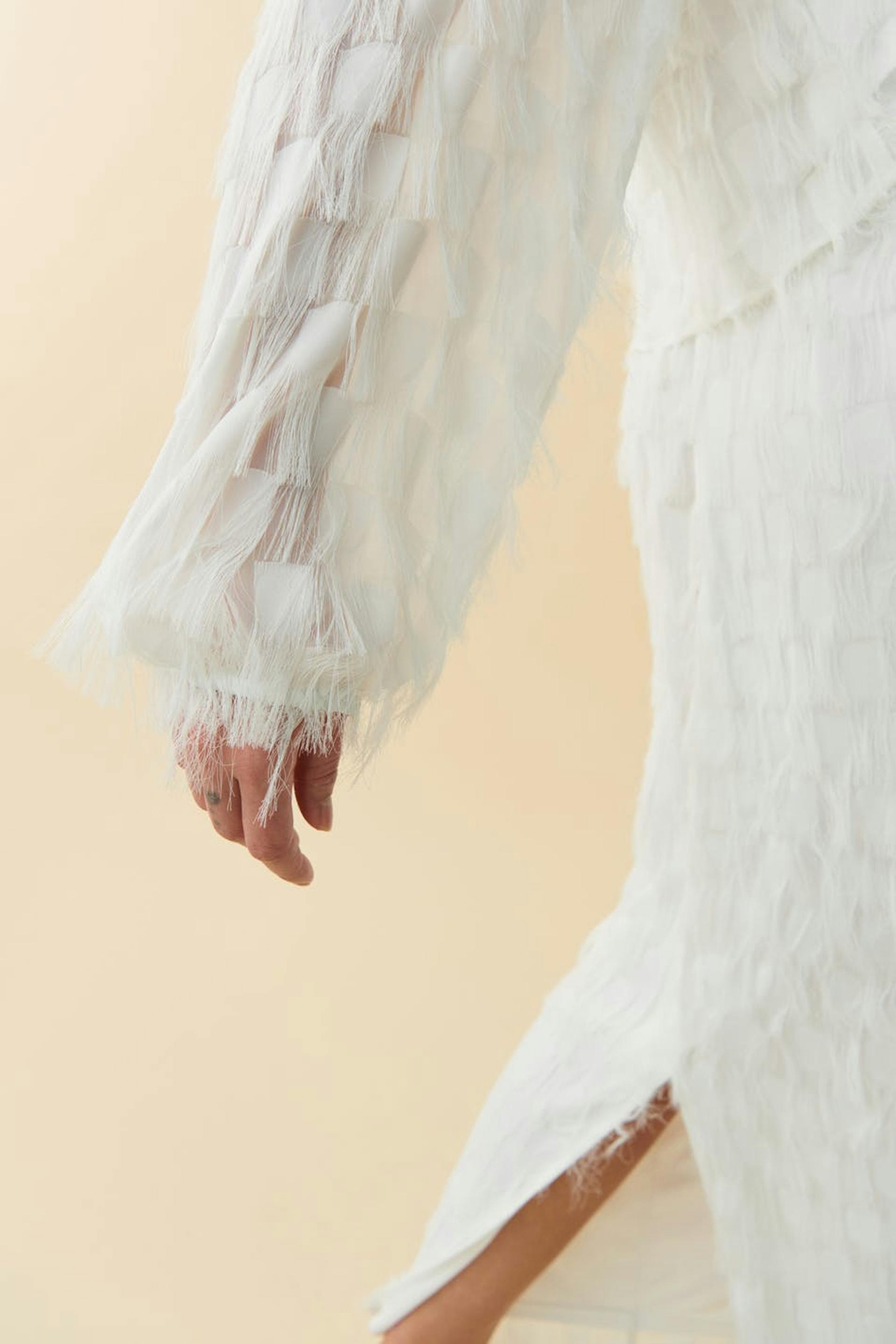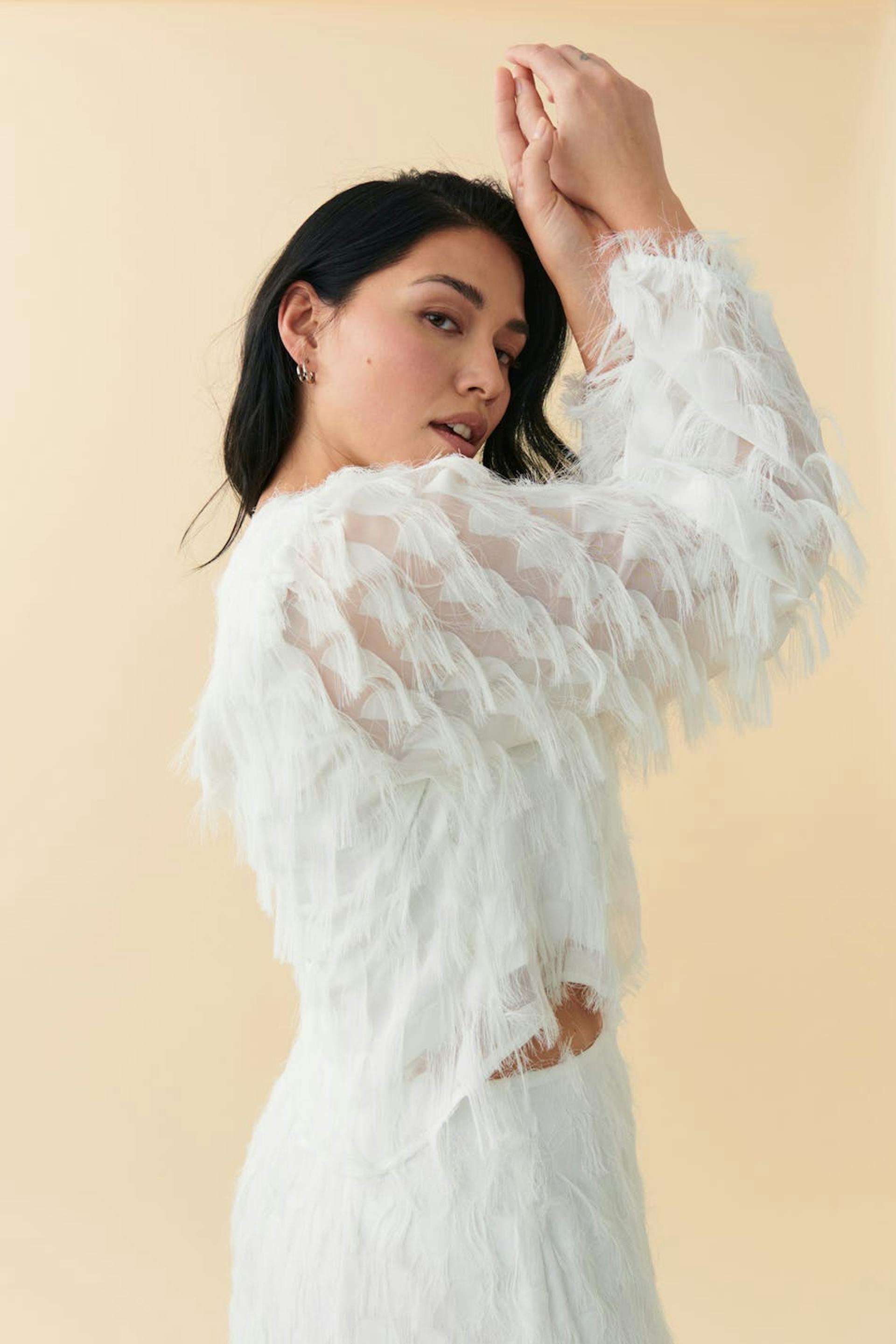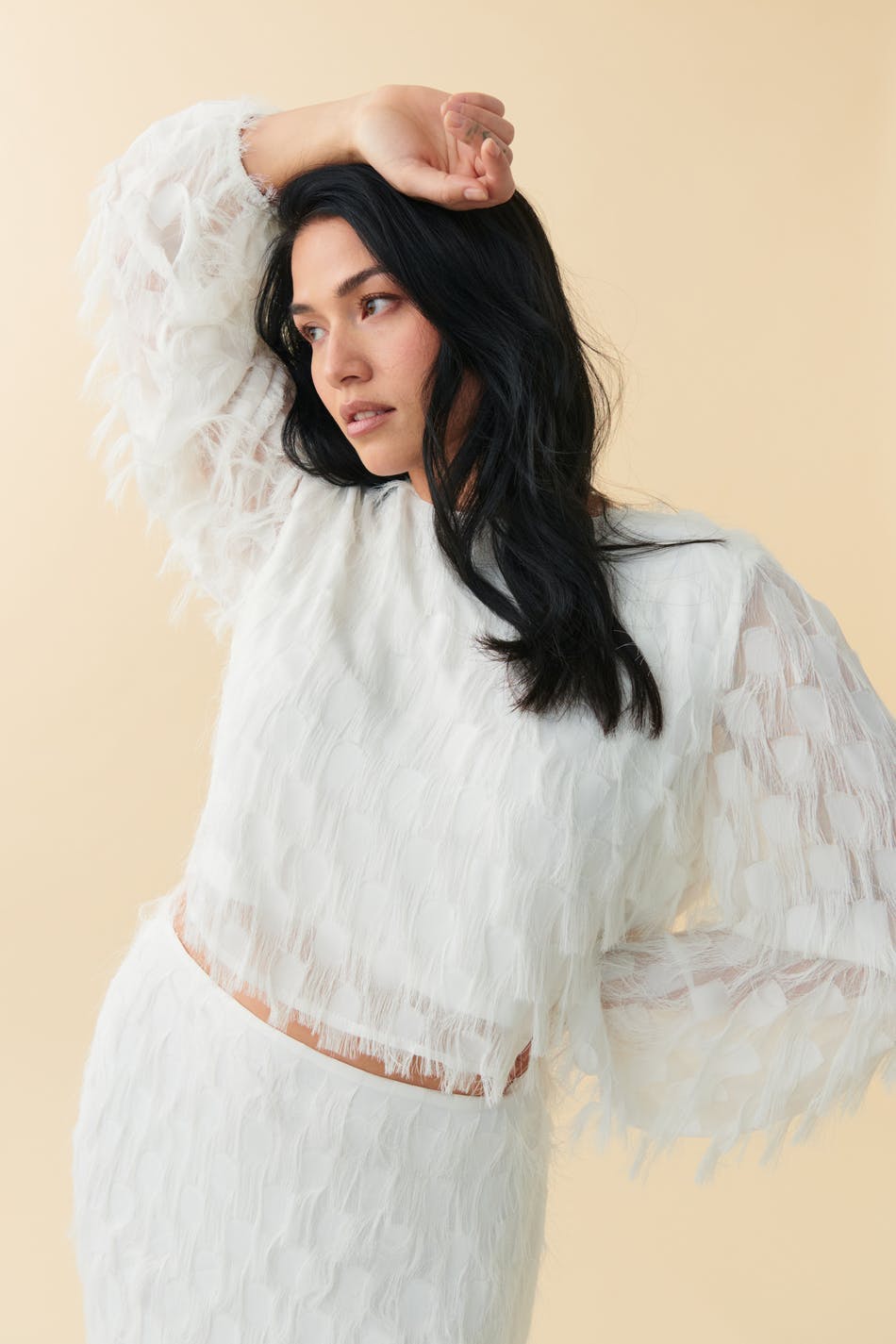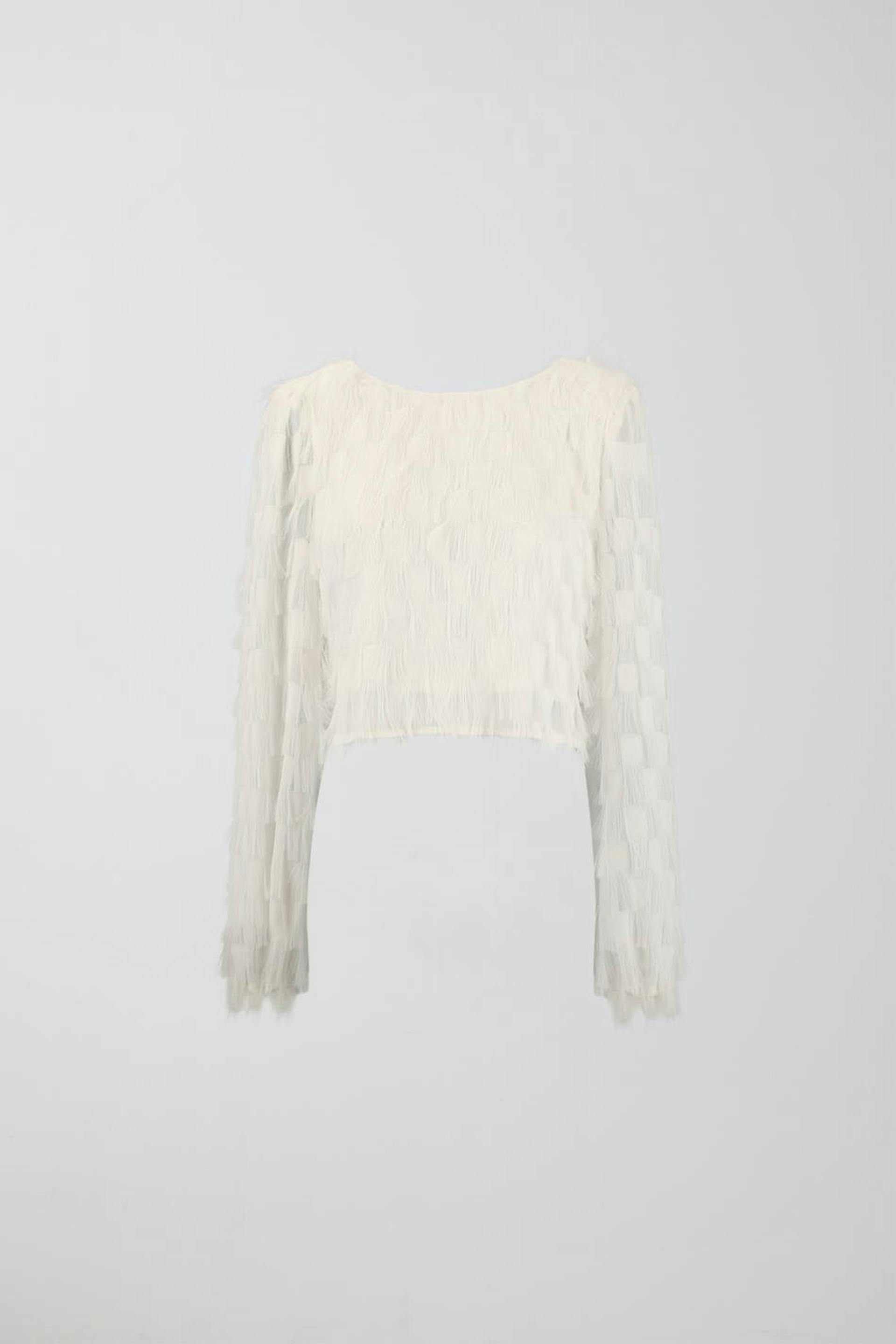 Long-sleeved top with fringes. The top is perfect for the party, white and cropped. It has slit in the back, loose-fitting style and knot closure at the back.