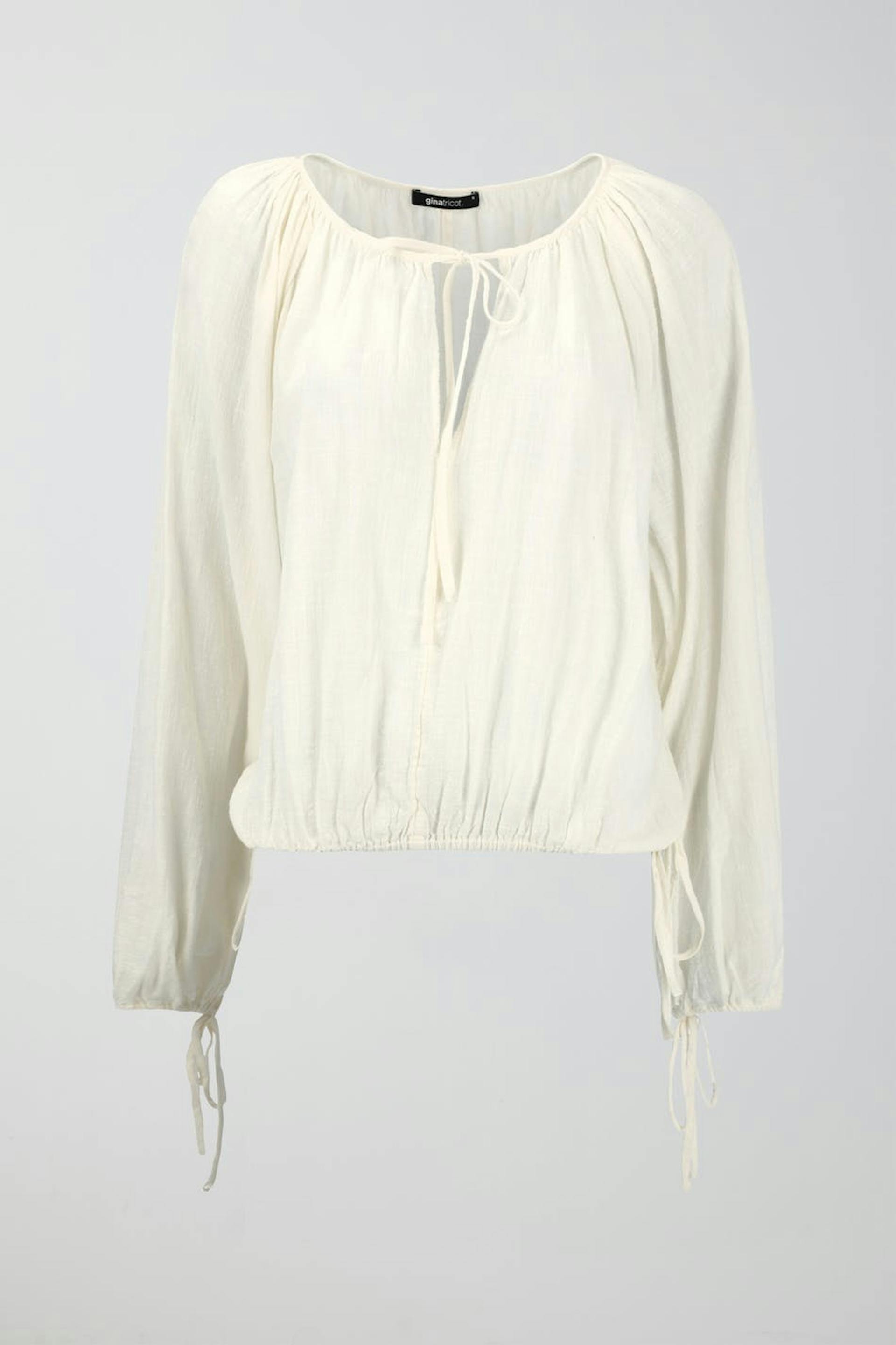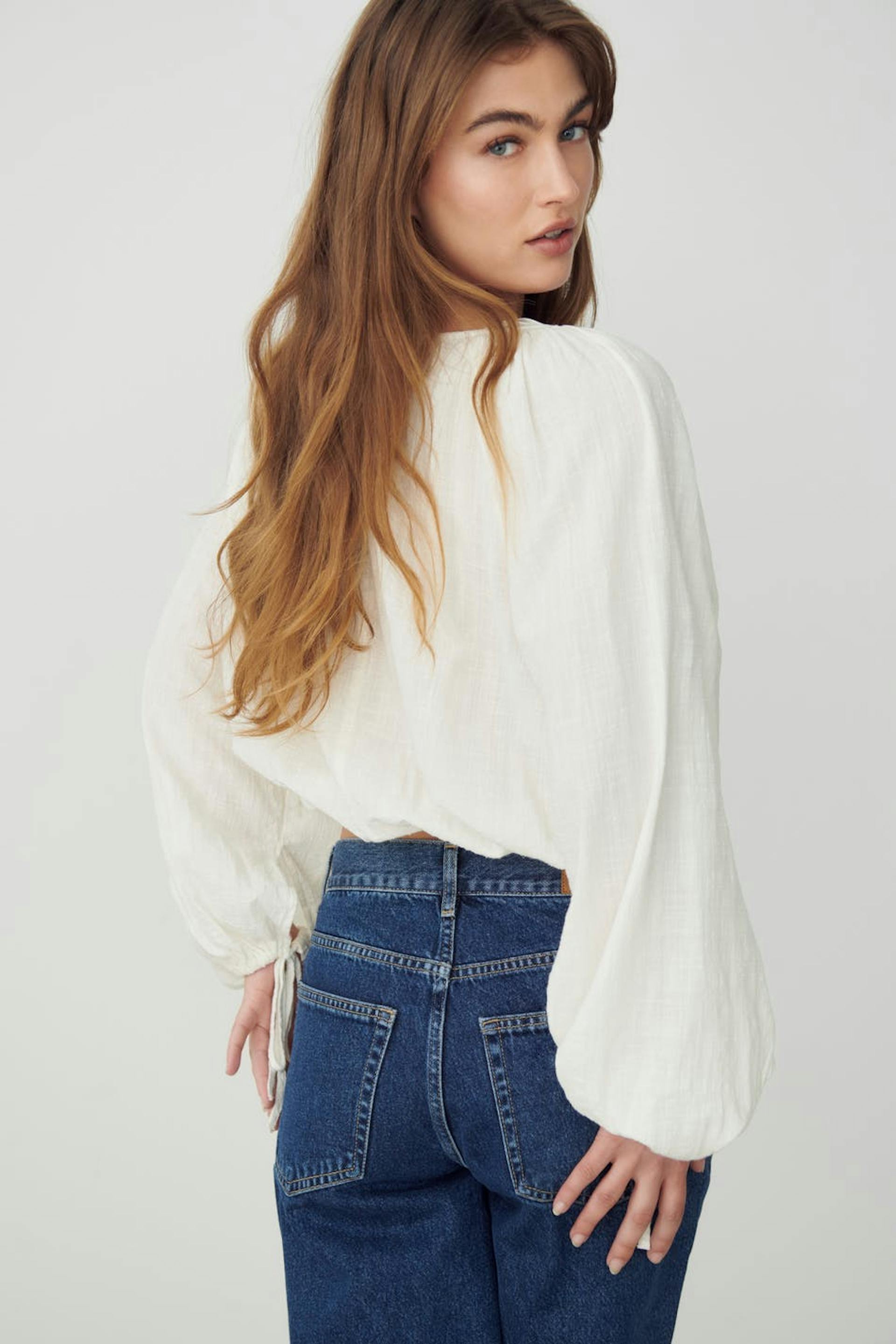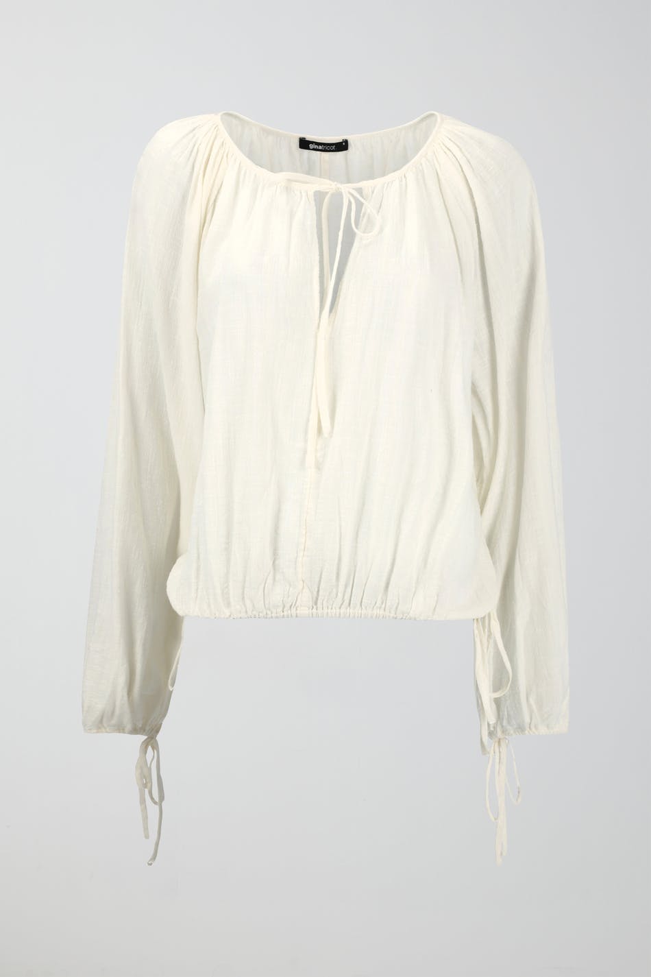 Bohemian blouse with relaxed fit. The blouse is white, long-sleeved and boxy. It has v-neck, airy woven quality and self-tie at the front, on the sleeve ends and at the bottom hem.
