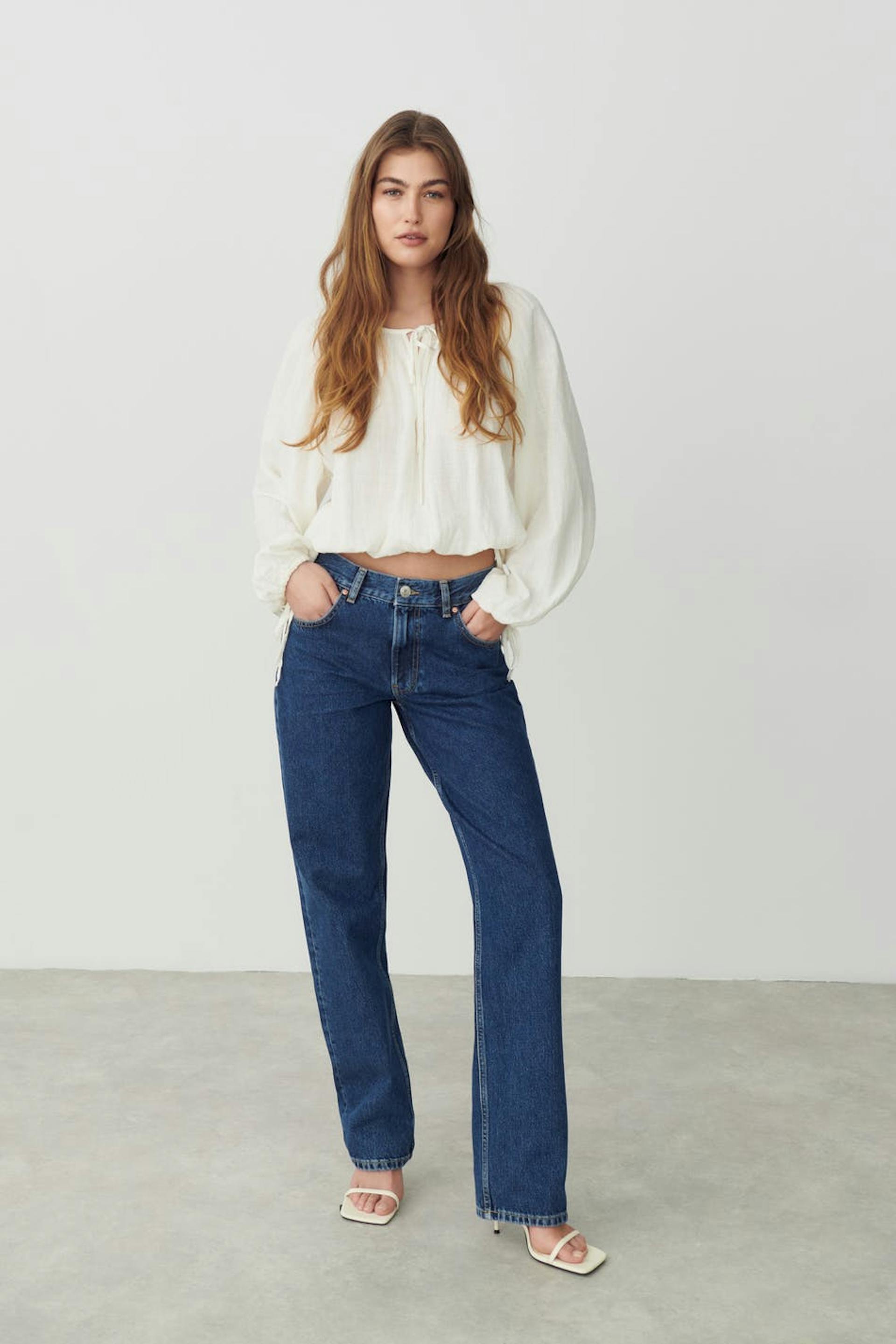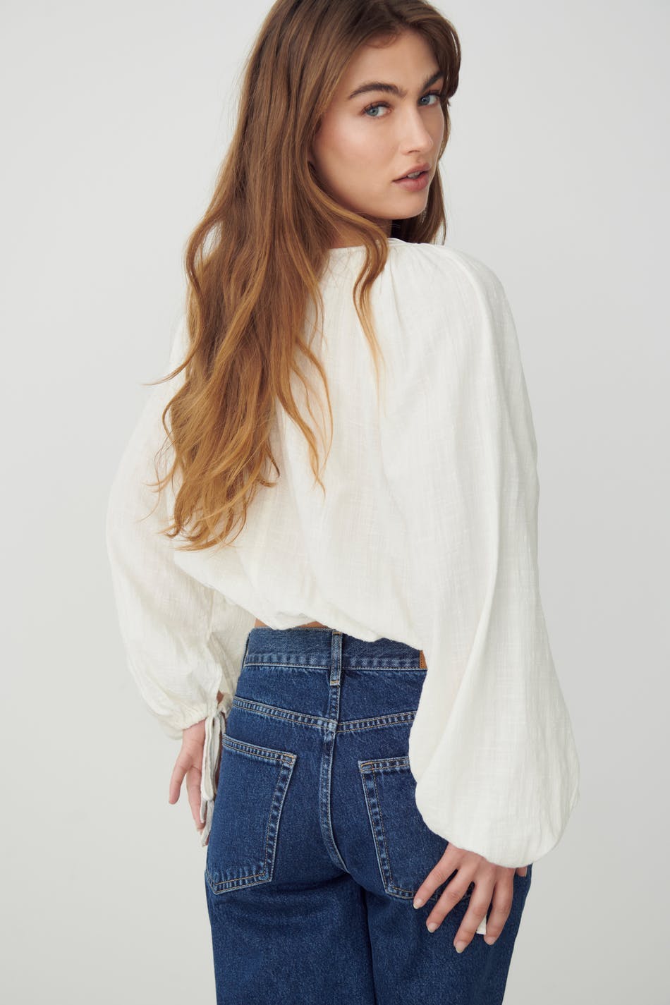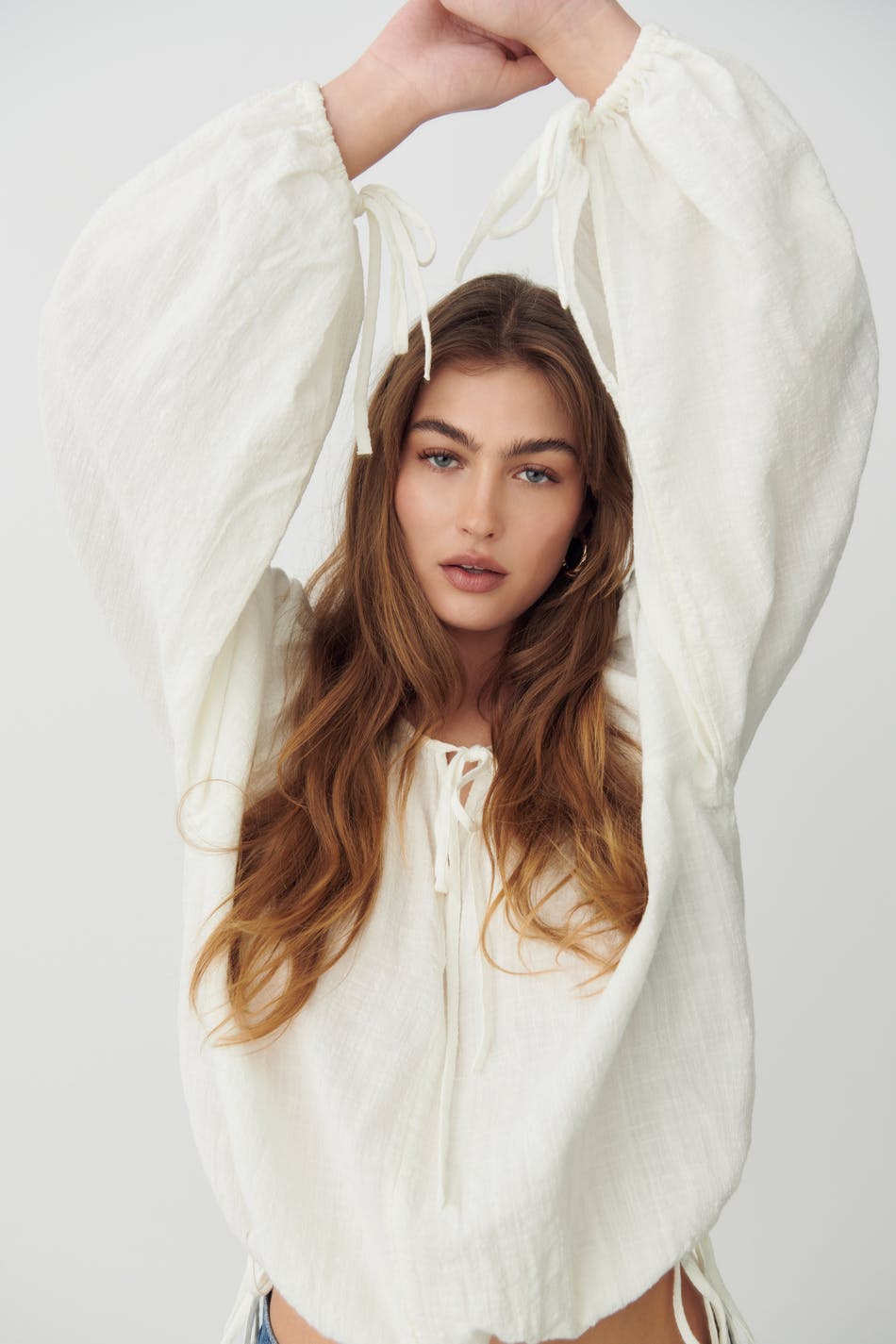 Bohemian blouse with relaxed fit. The blouse is white, long-sleeved and boxy. It has v-neck, airy woven quality and self-tie at the front, on the sleeve ends and at the bottom hem.