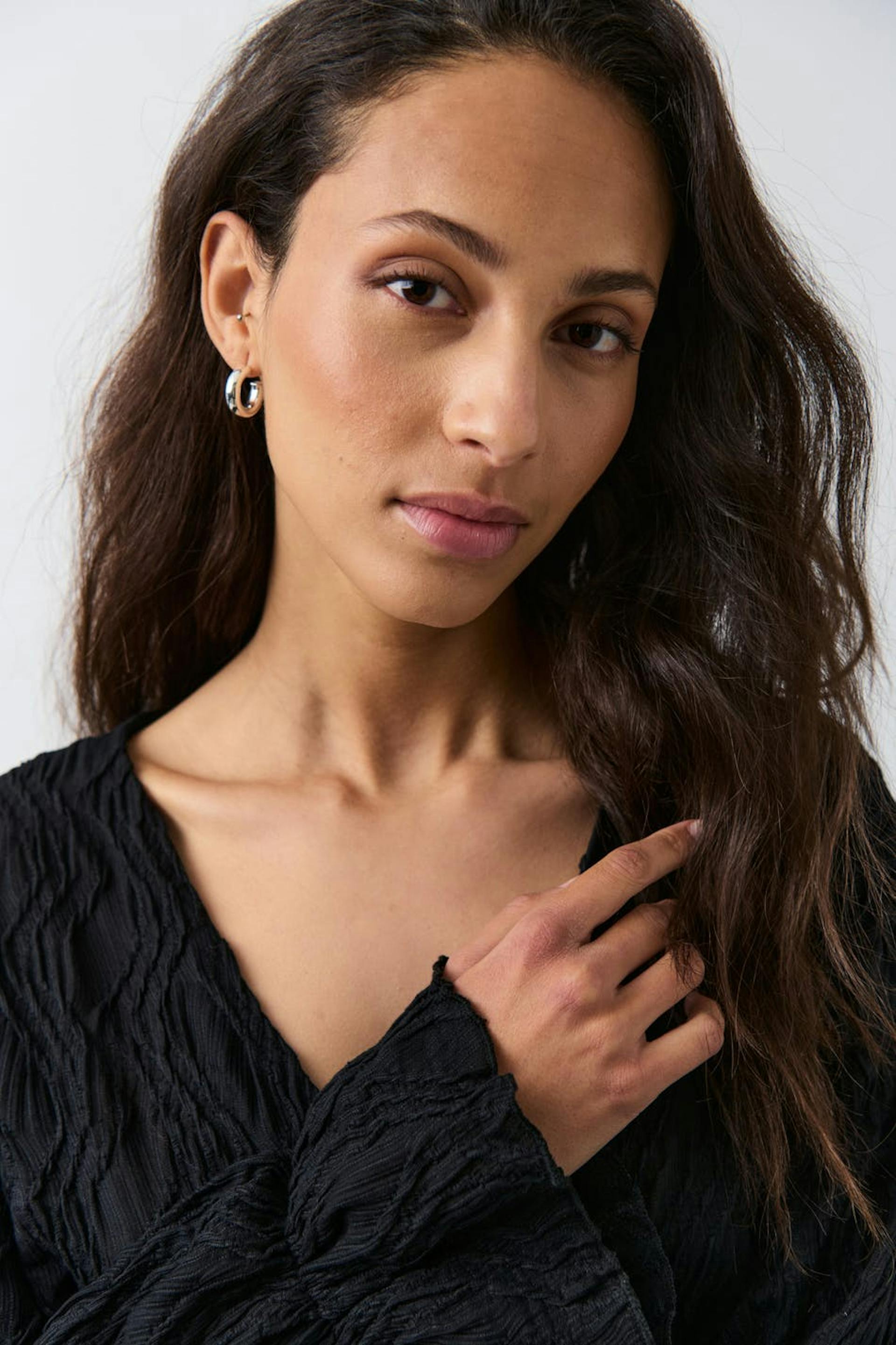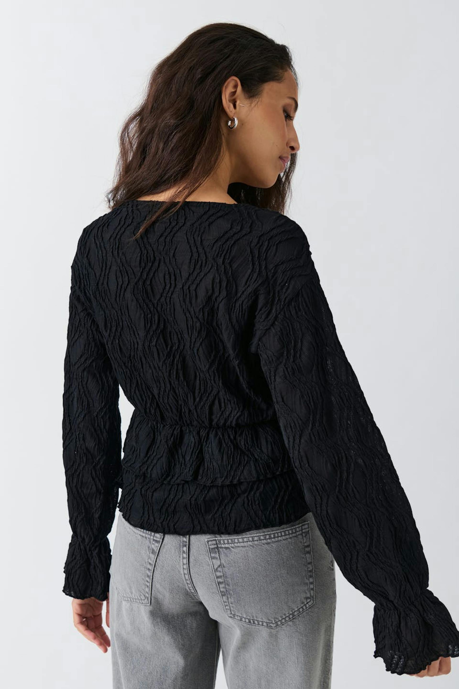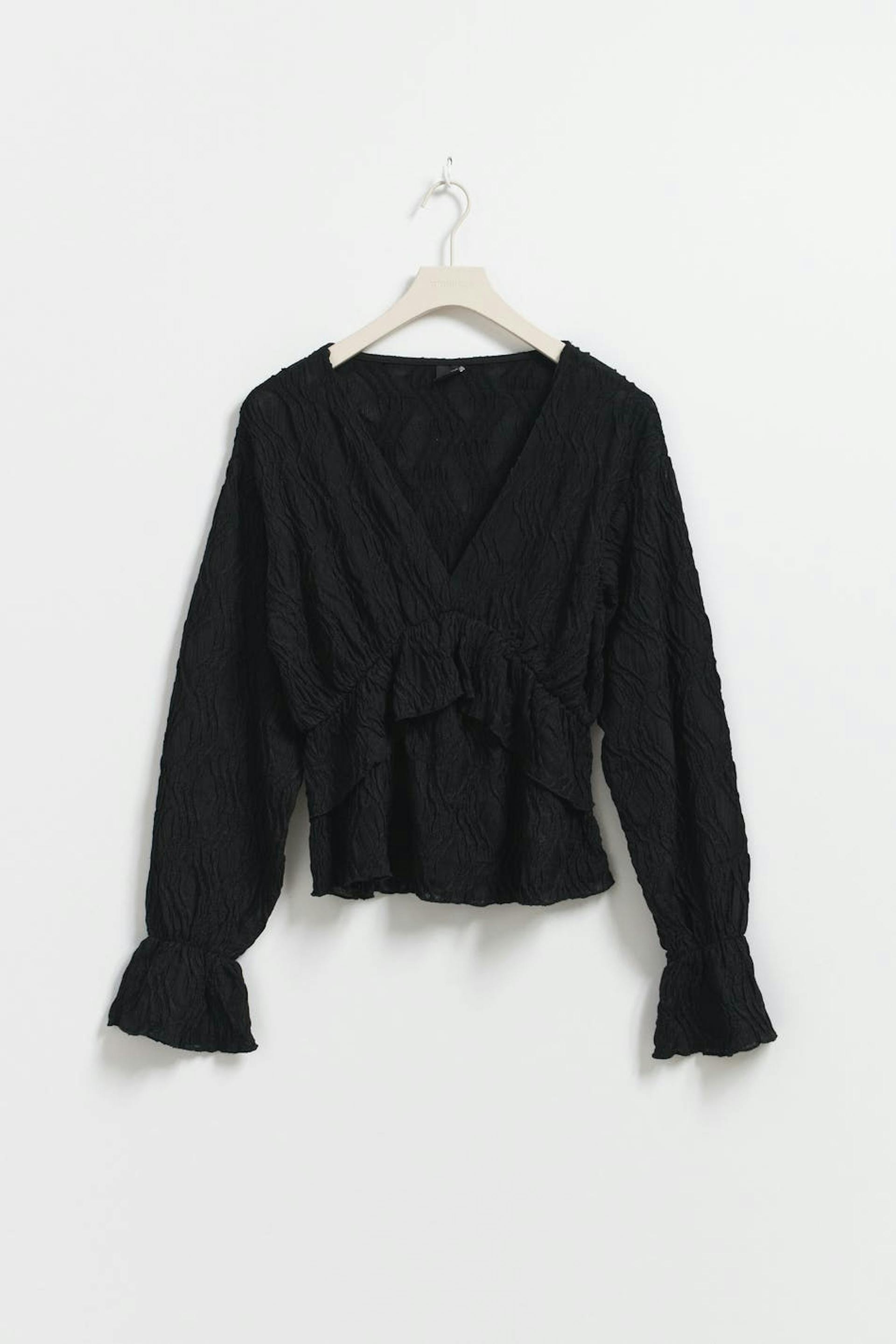 Bohemian top with frills. The top is black and has structured material. It has v-neck and long sleeve.
