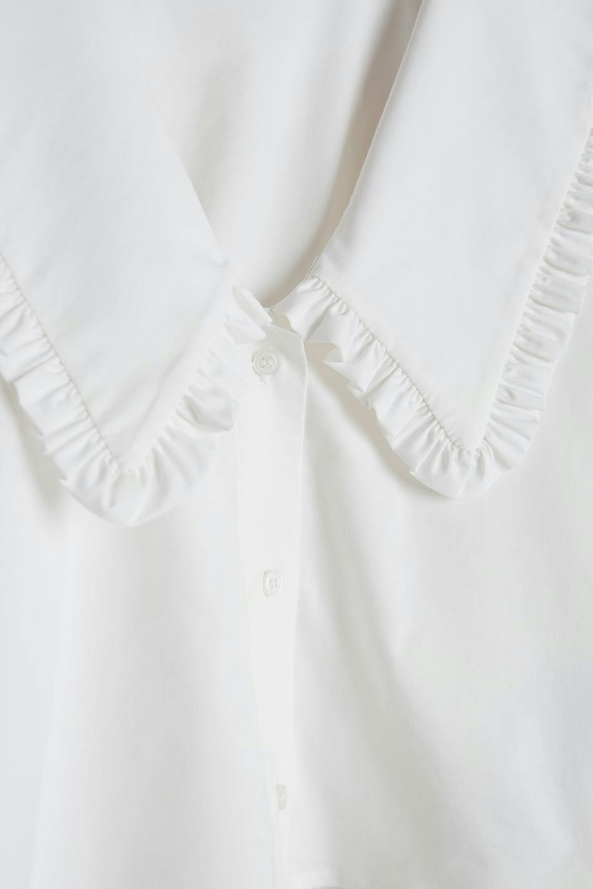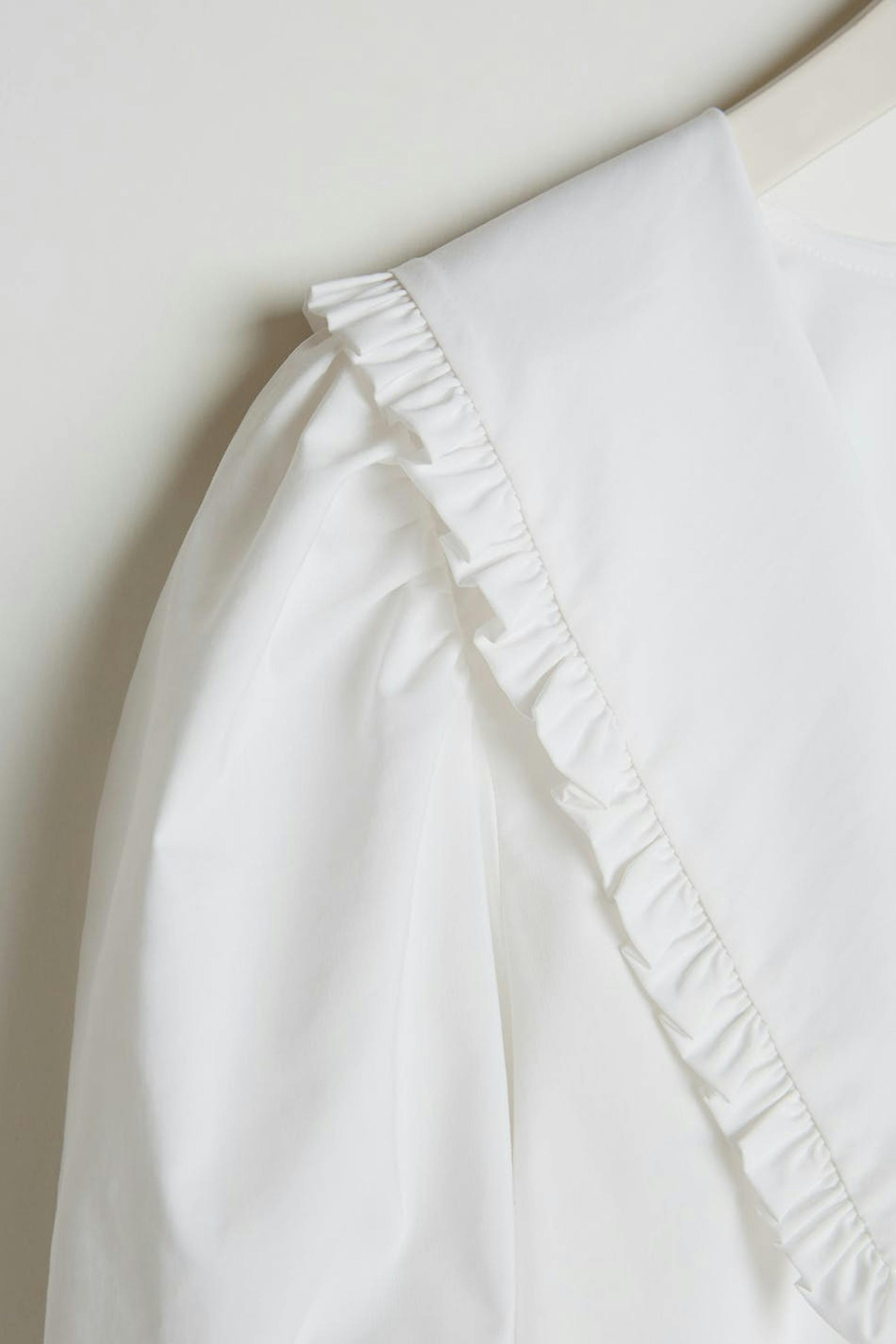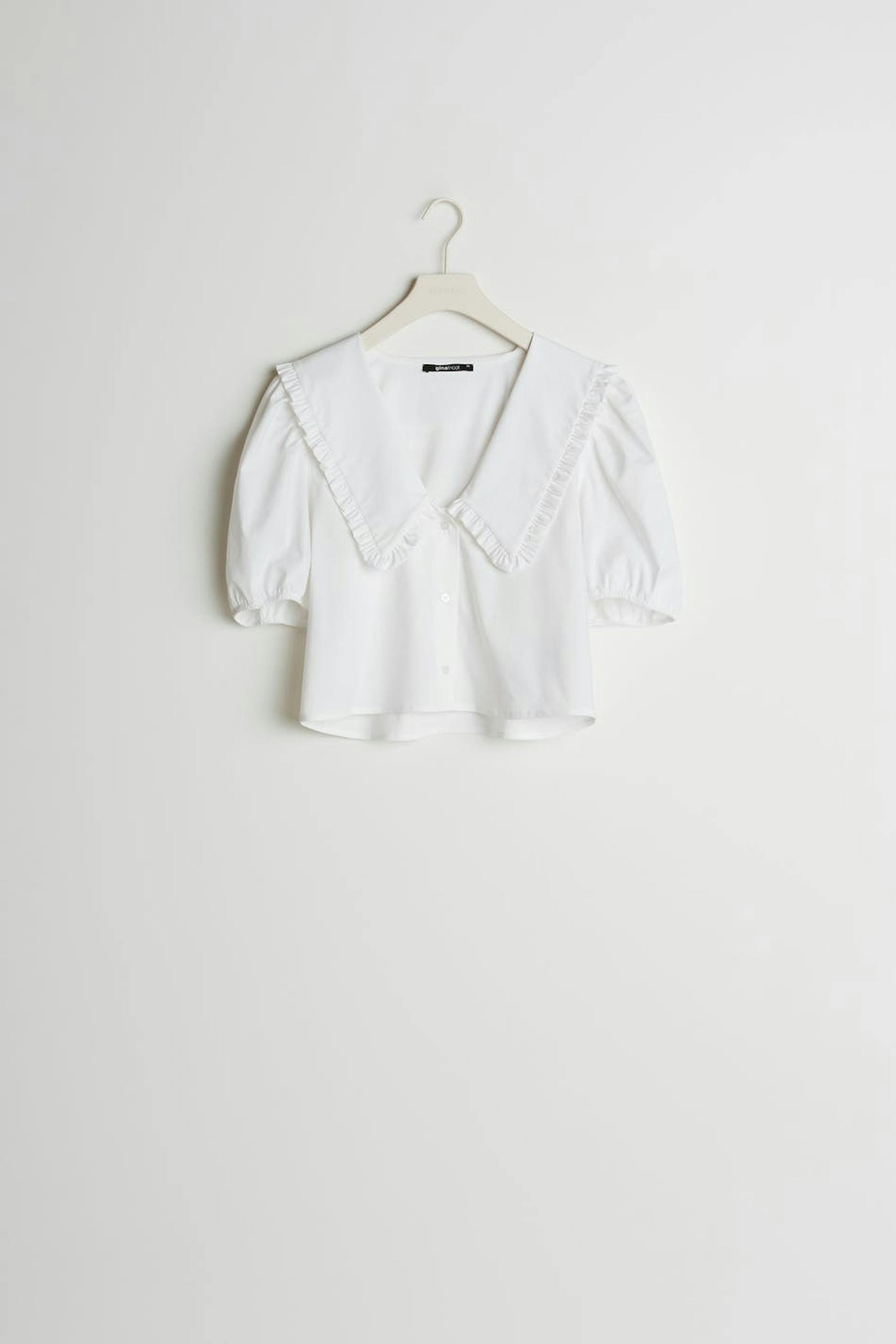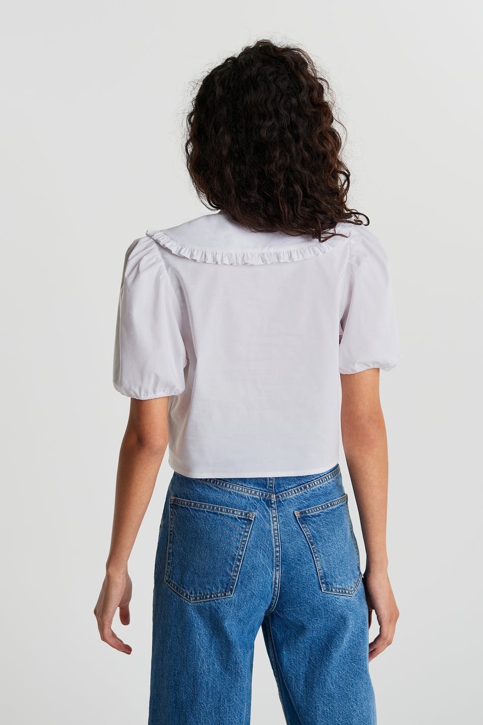 Short blouse with a plunging neckline with ruffle details. The blouse is white and woven and has short sleeves with an elastic band on the sleeve ends. It has buttons at the front.