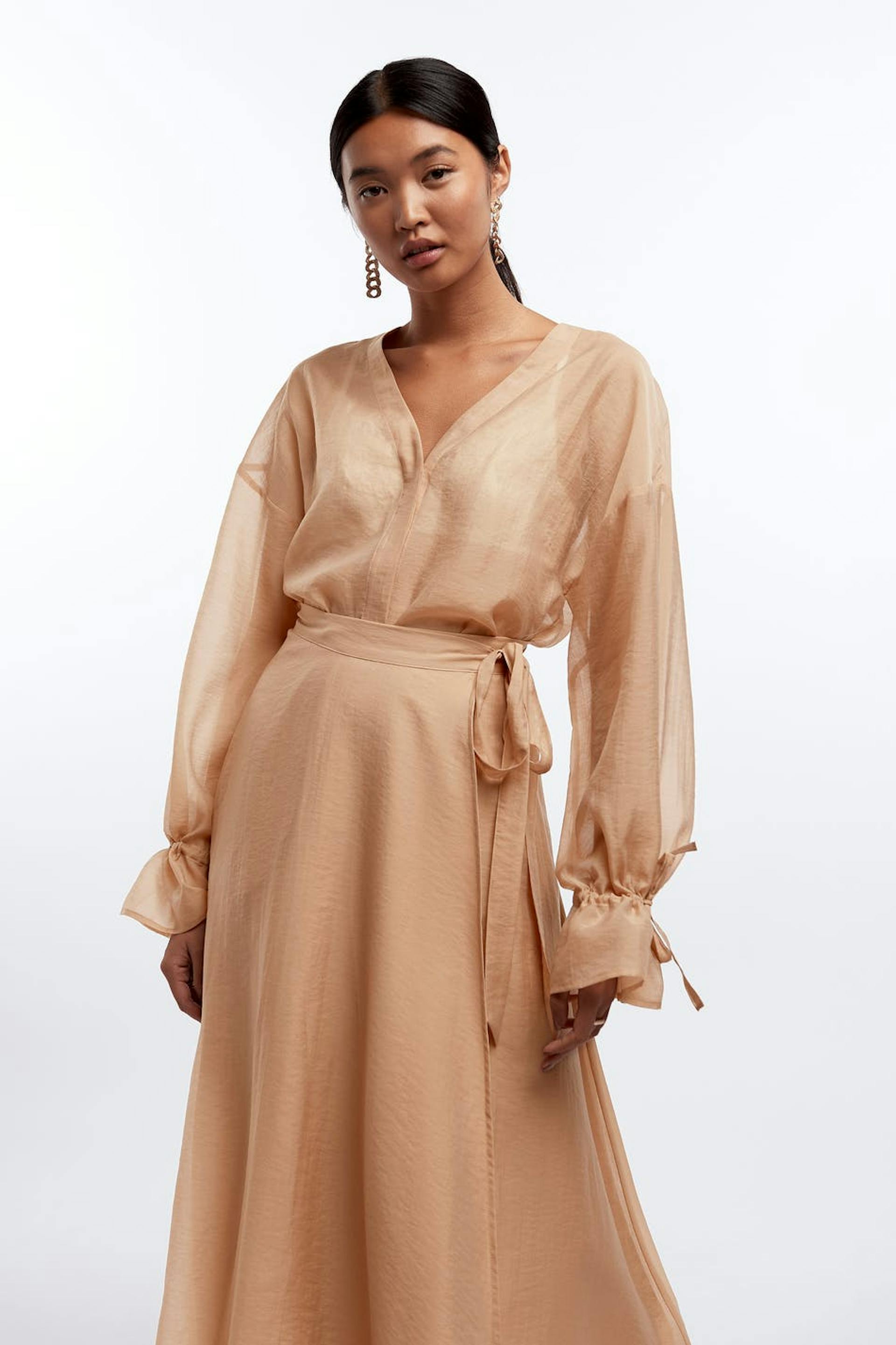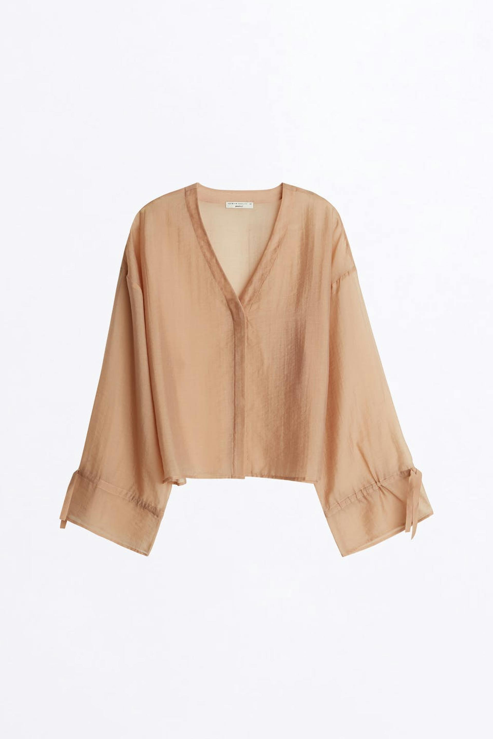 Blouse with a V-neck. The blouse is pink and has wide sleeves with a tie strap on the sleeve ends.