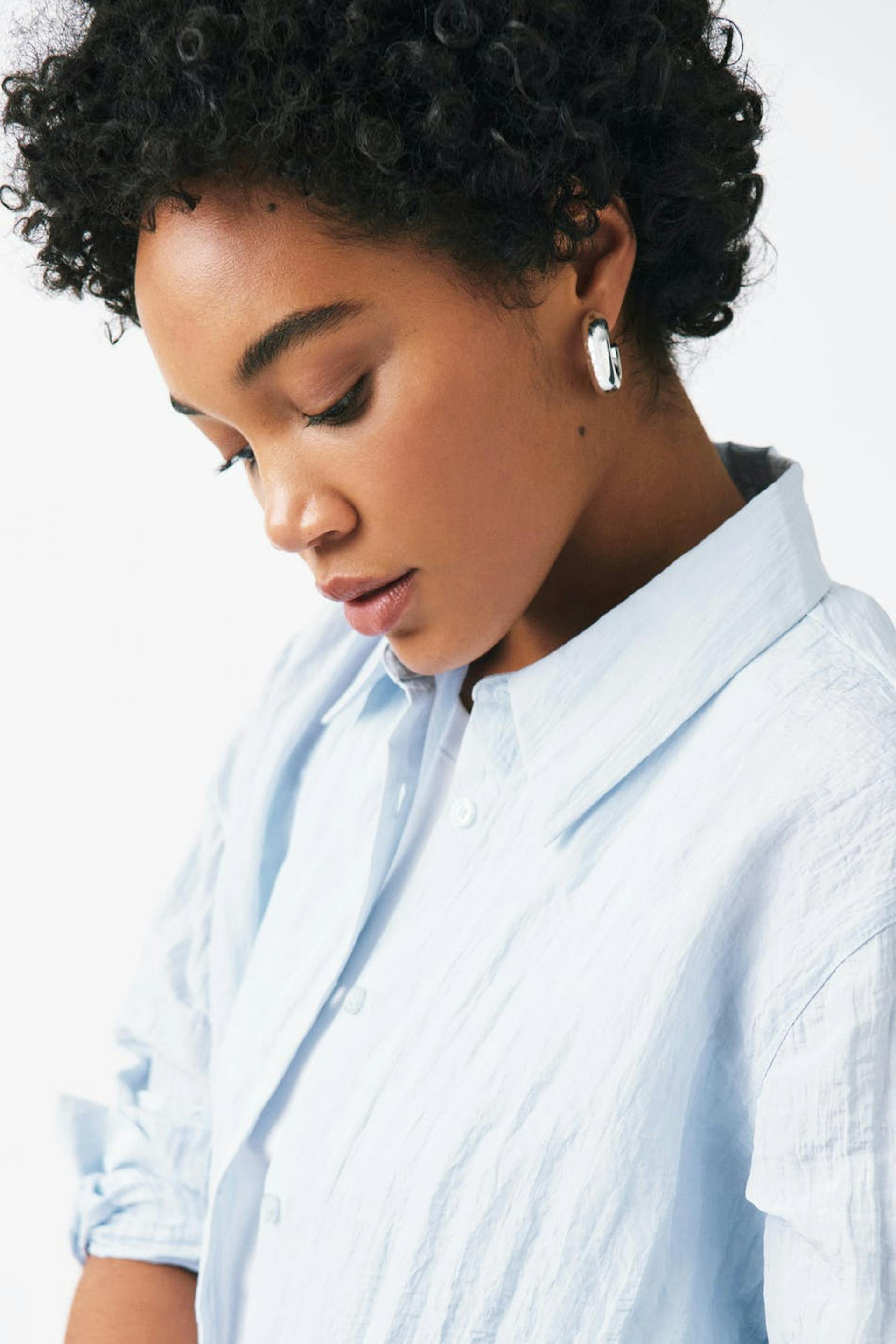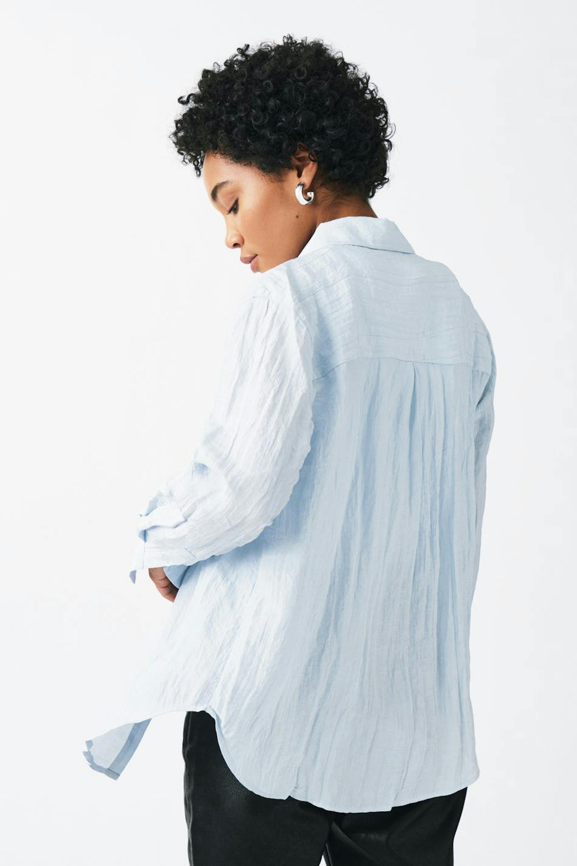 Crinkled shirt with buttoning at the front. The shirt is blue and has collar. It has long sleeve with button and cuff.