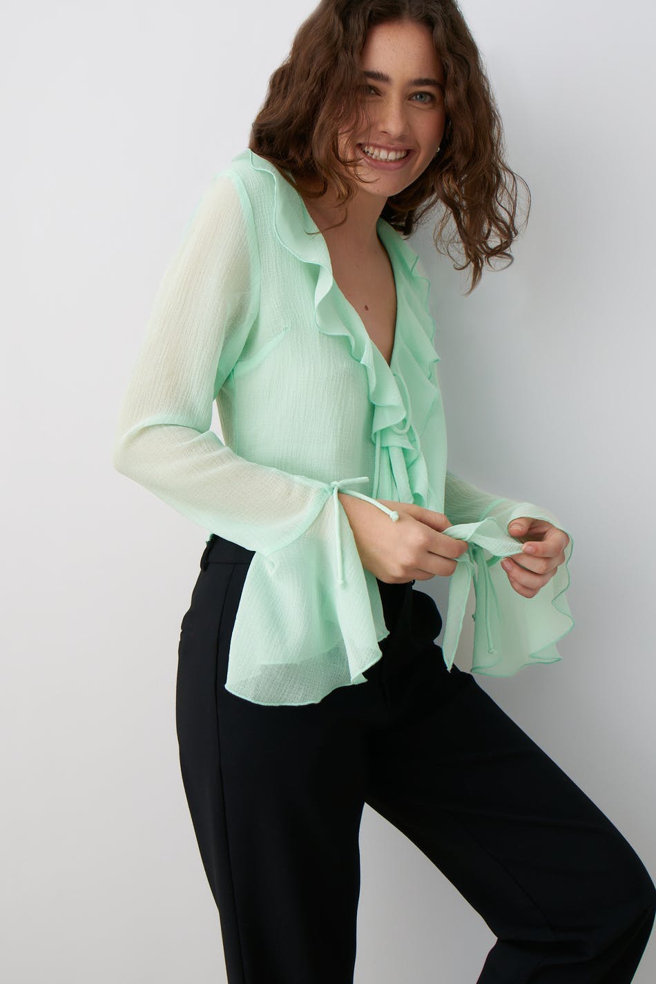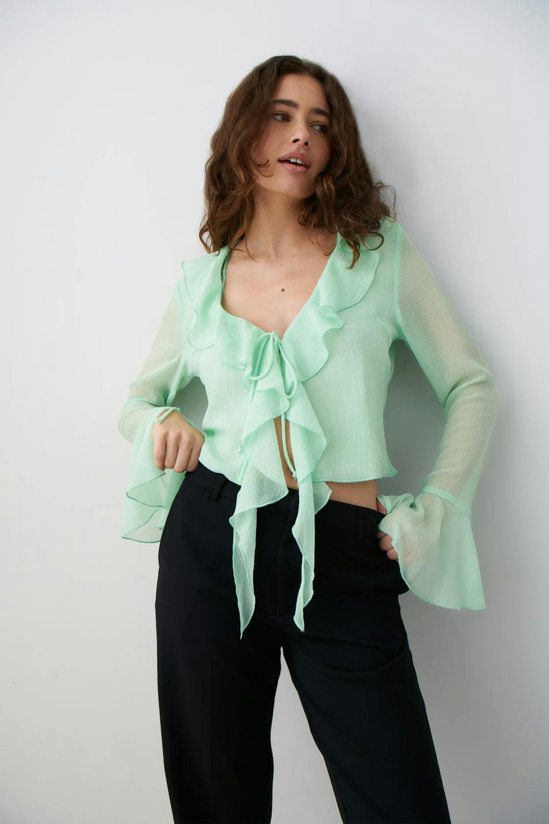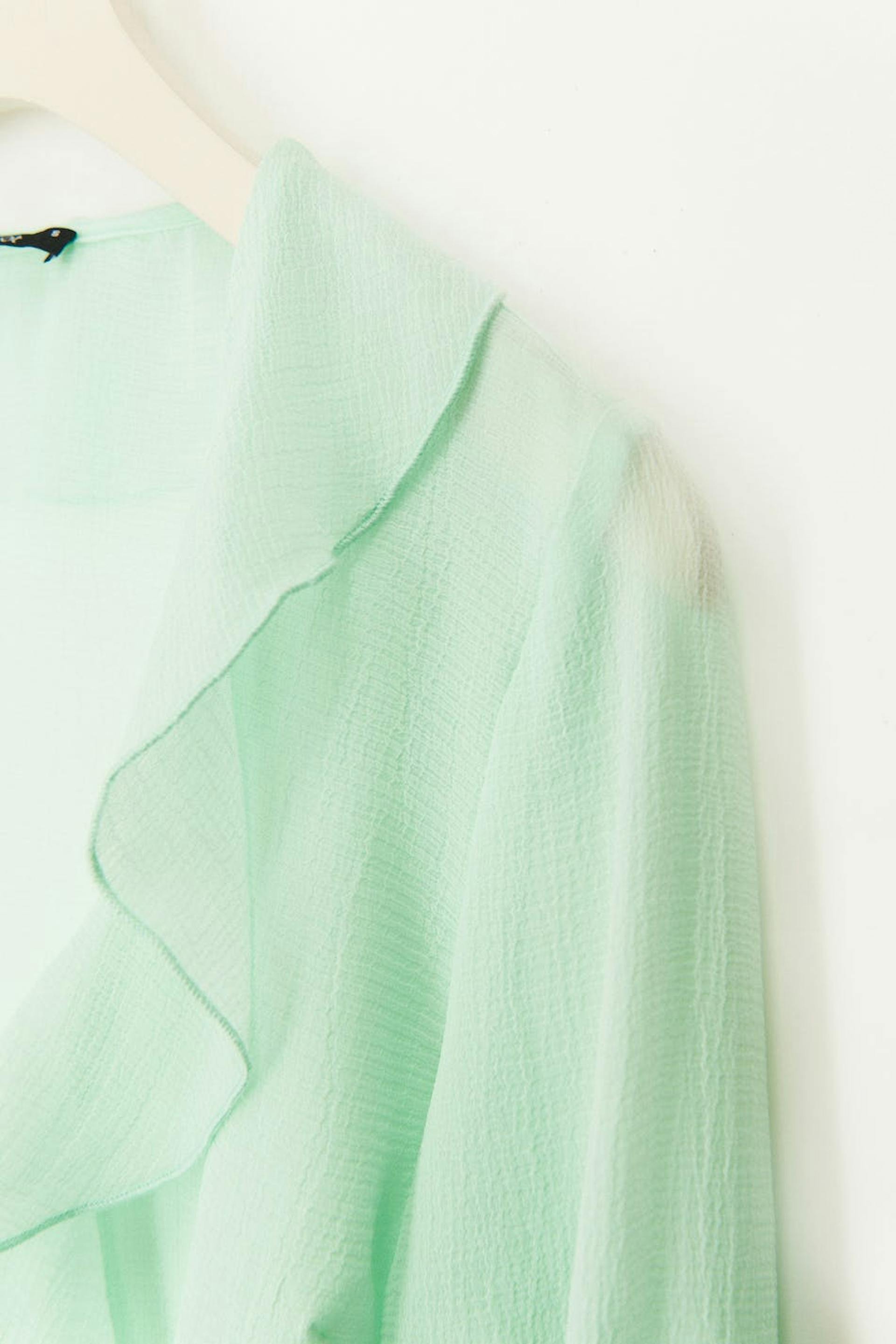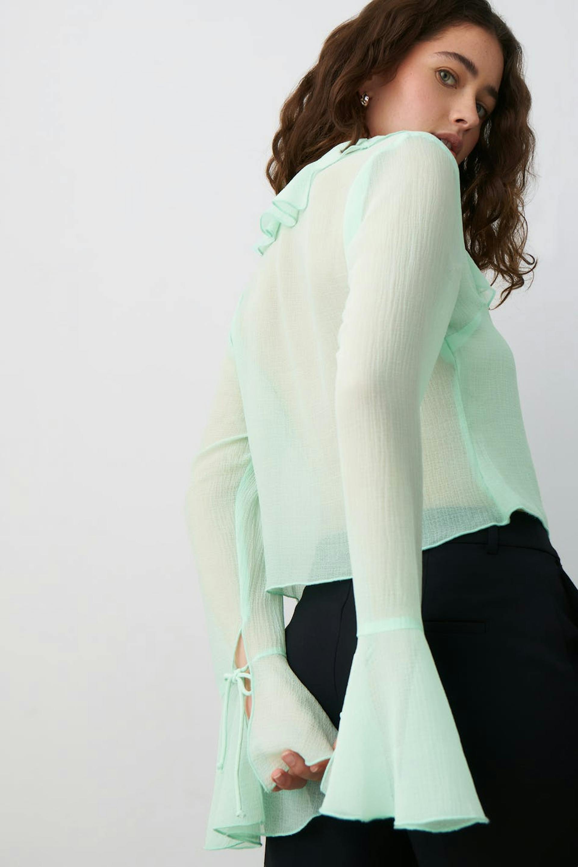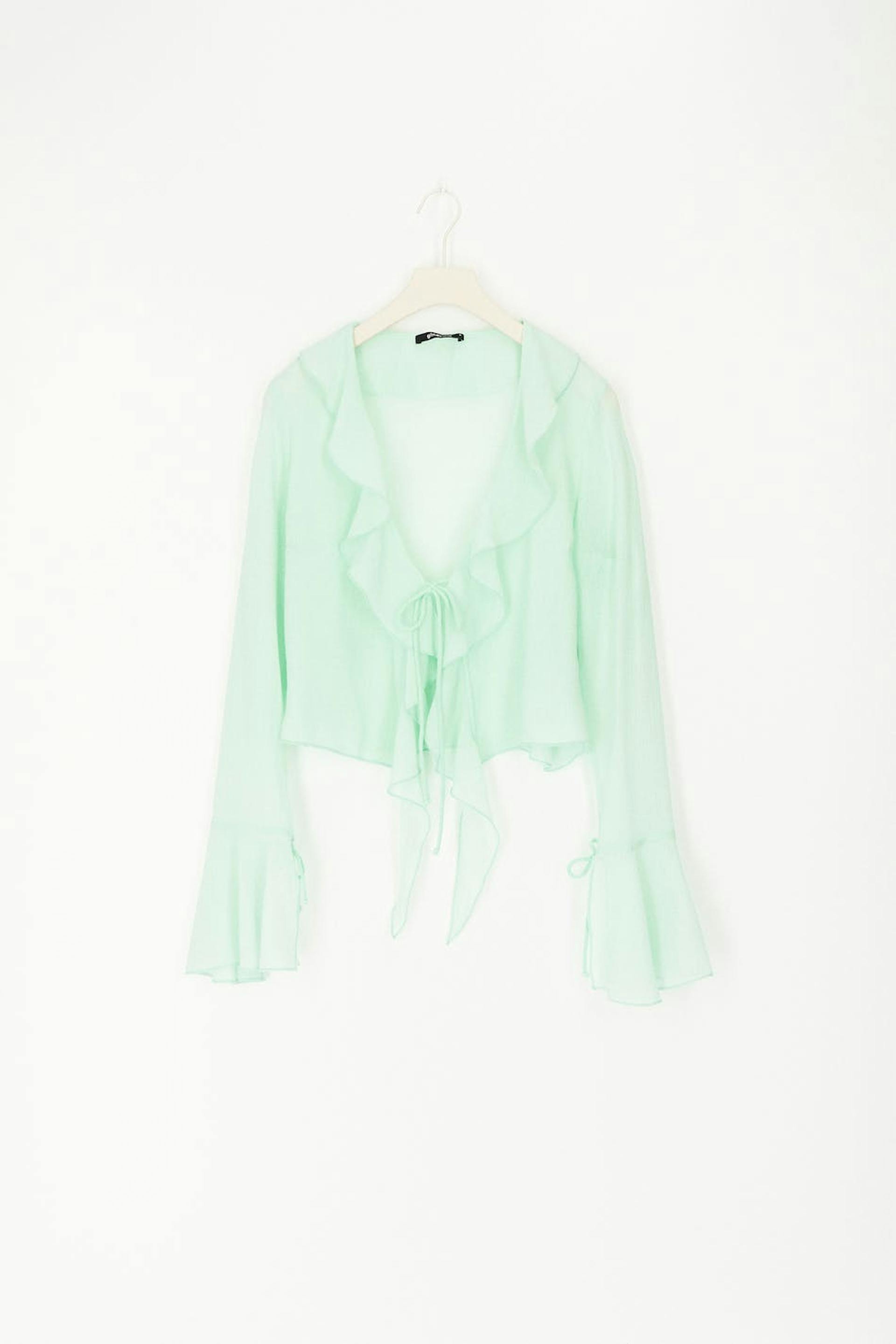 Sheer blouse in chiffon with self-tie in front. The blouse is green, long-sleeved and cropped. It has v-neck, thin, structured quality and frills on the neckline and at sleeve ends.
