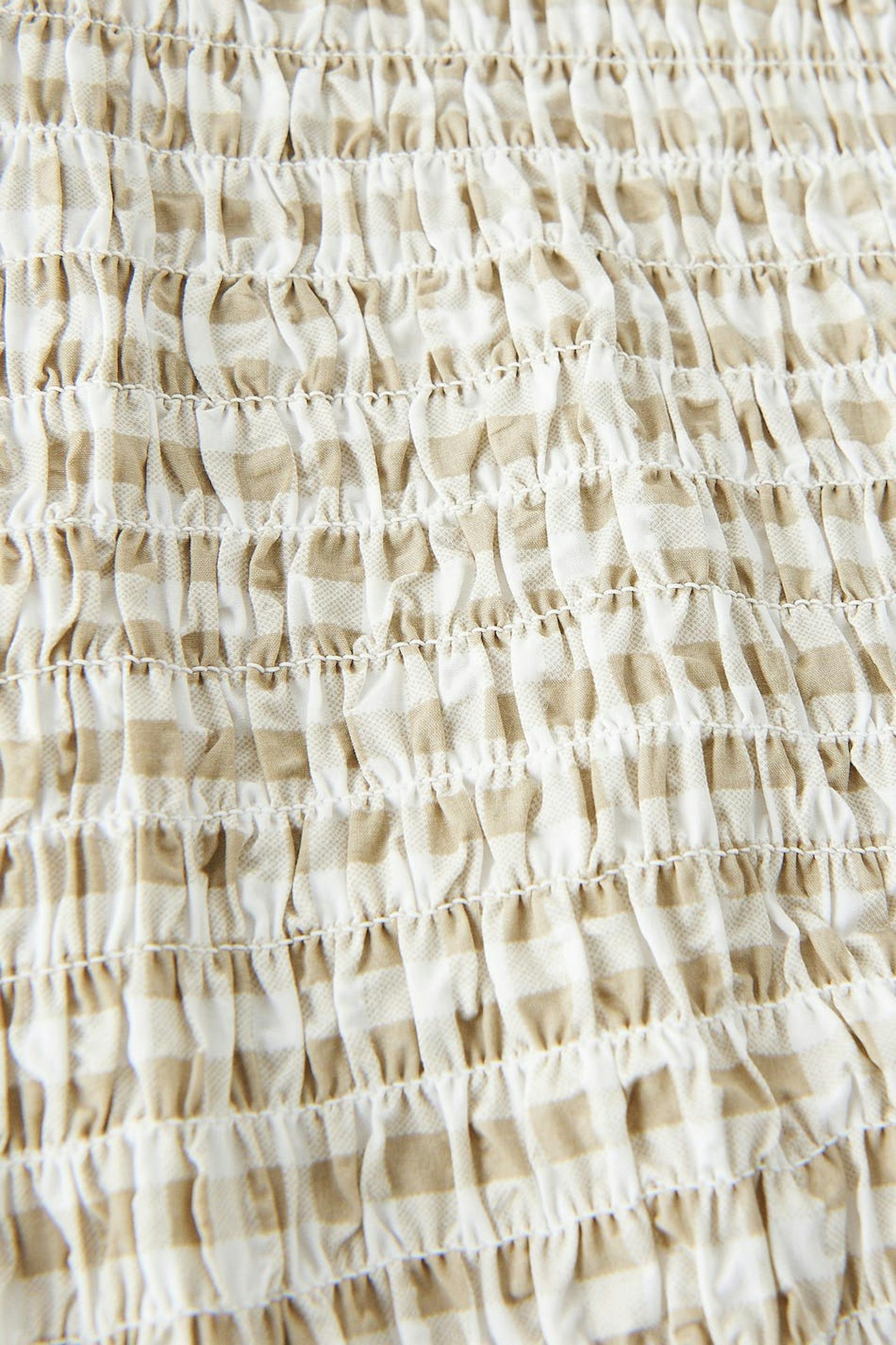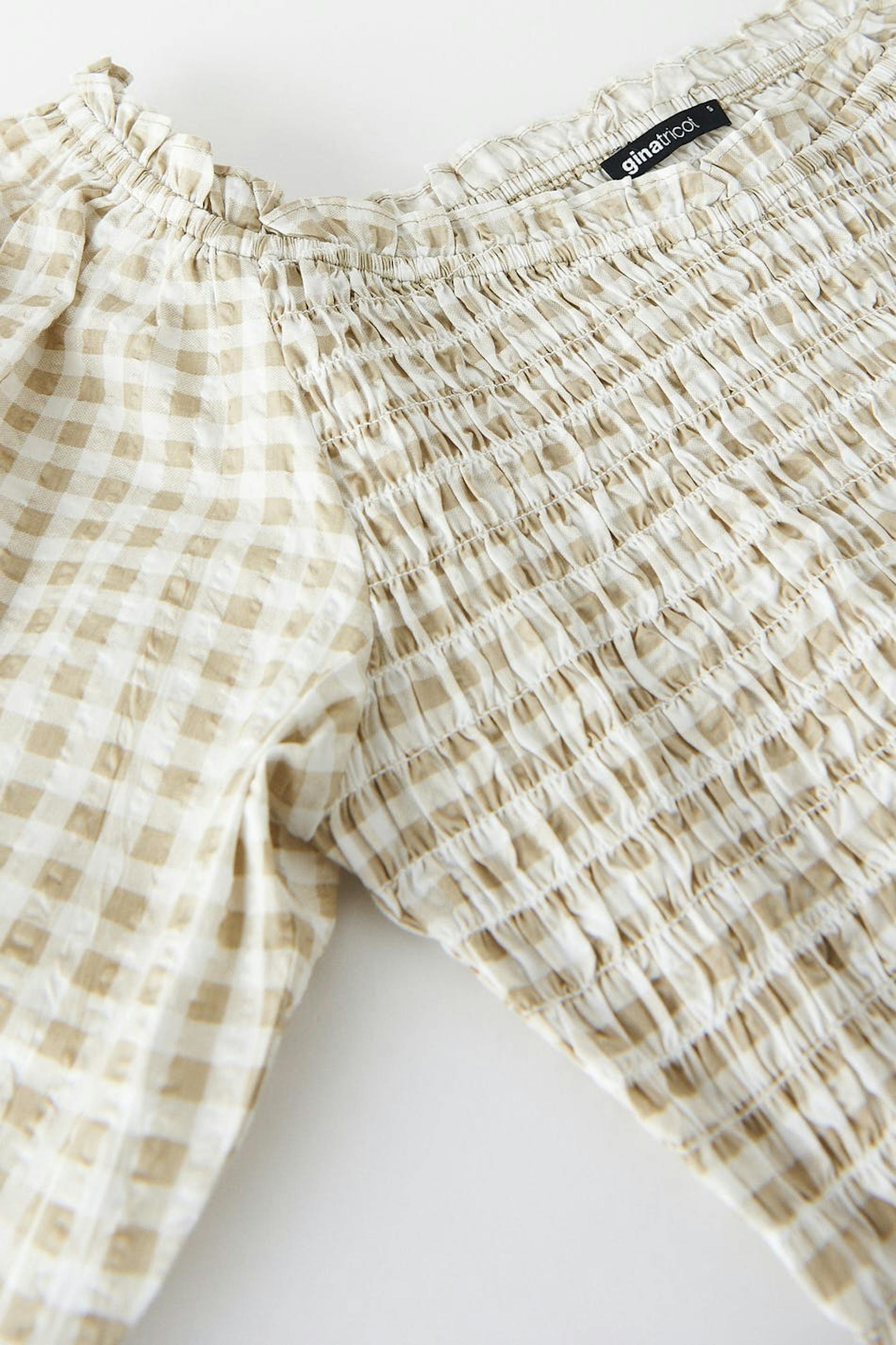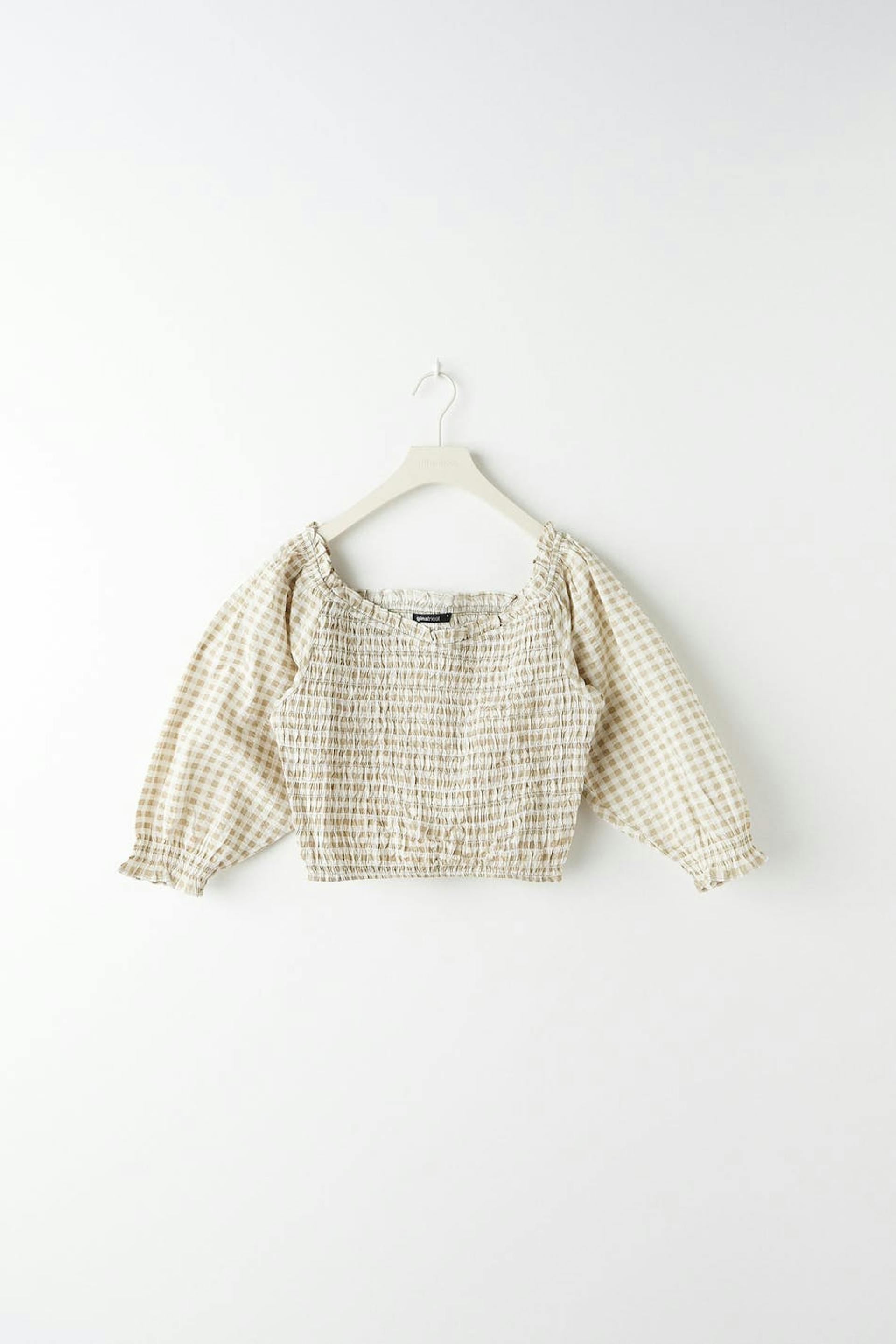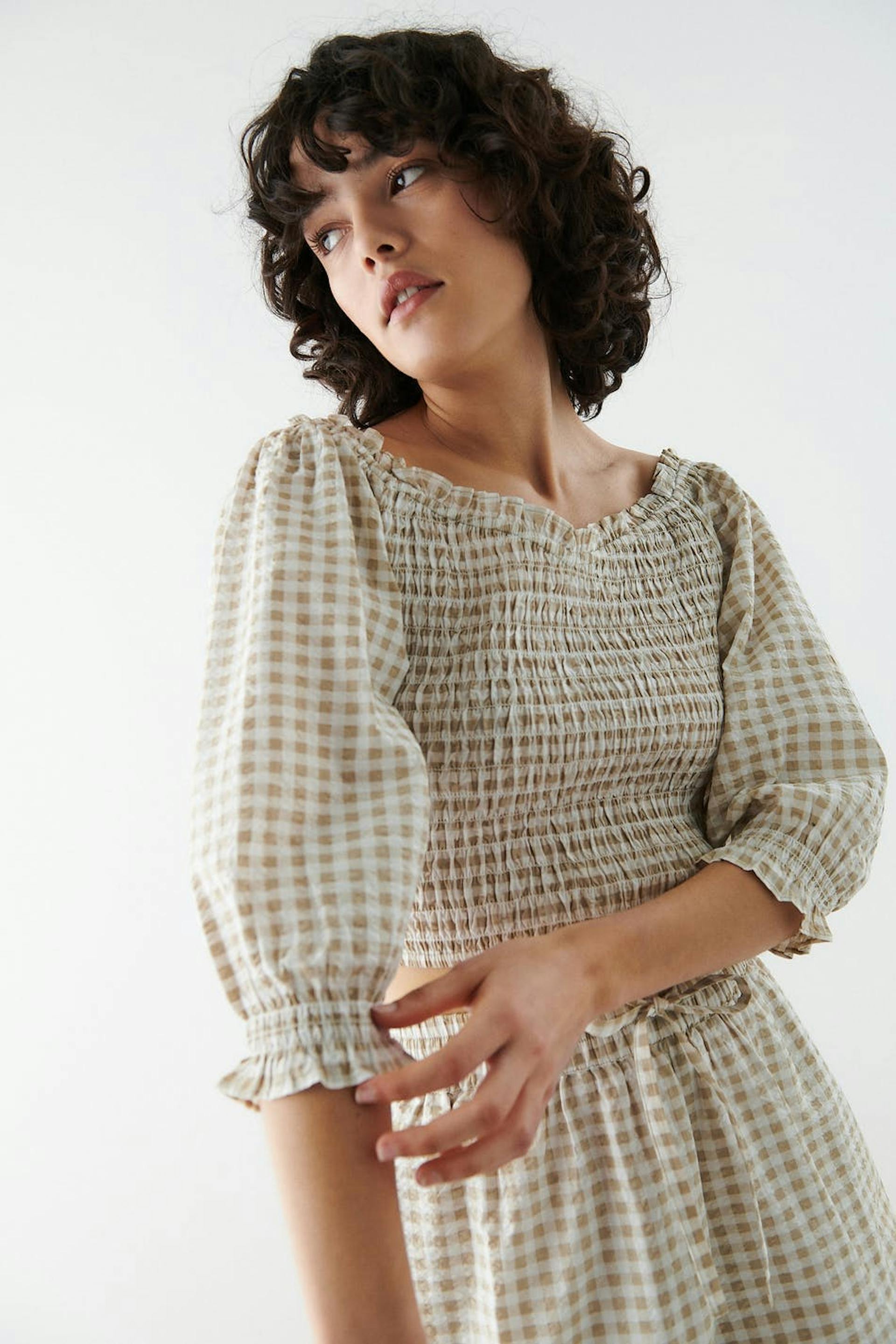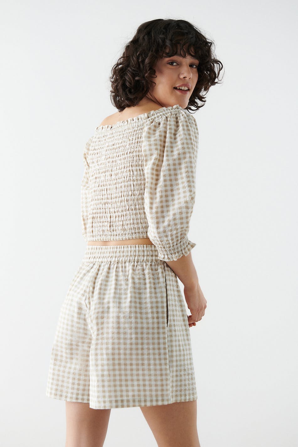 Checked blouse with short puff sleeves. The blouse is beige, white and smocked. It has a fitted fit, a structured quality, gathering at the shoulders, elasticized cuffs and square neckline with small frills.