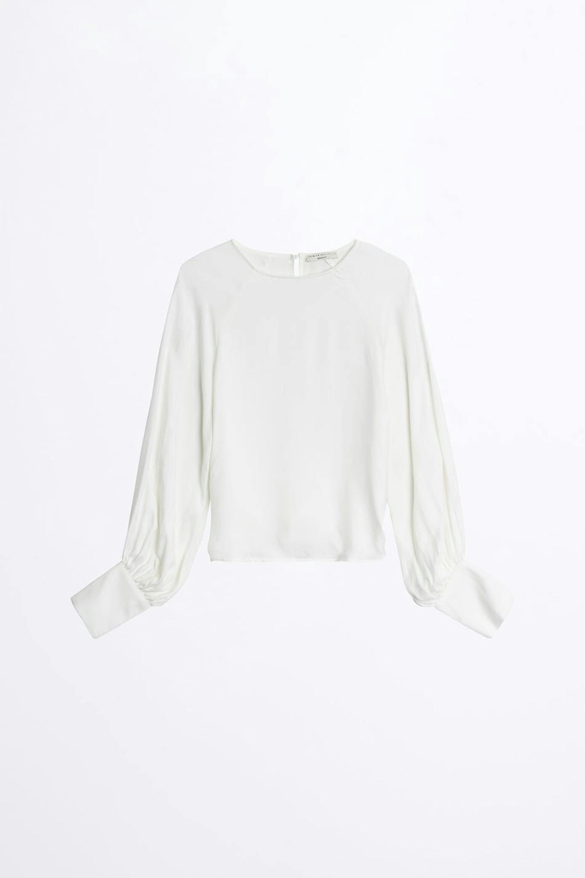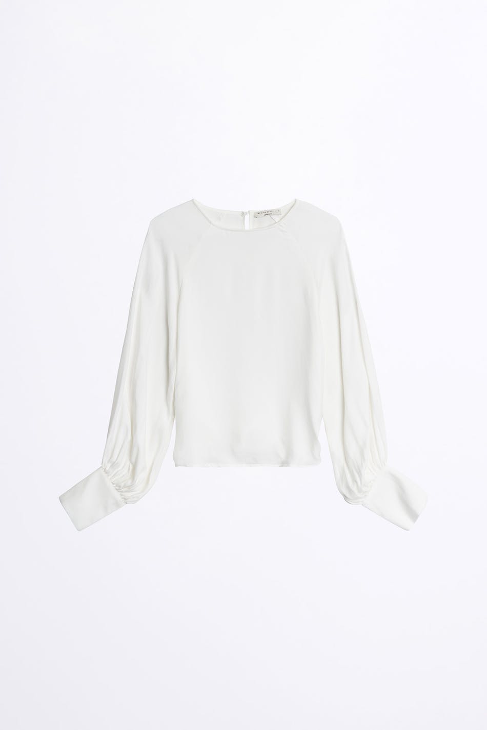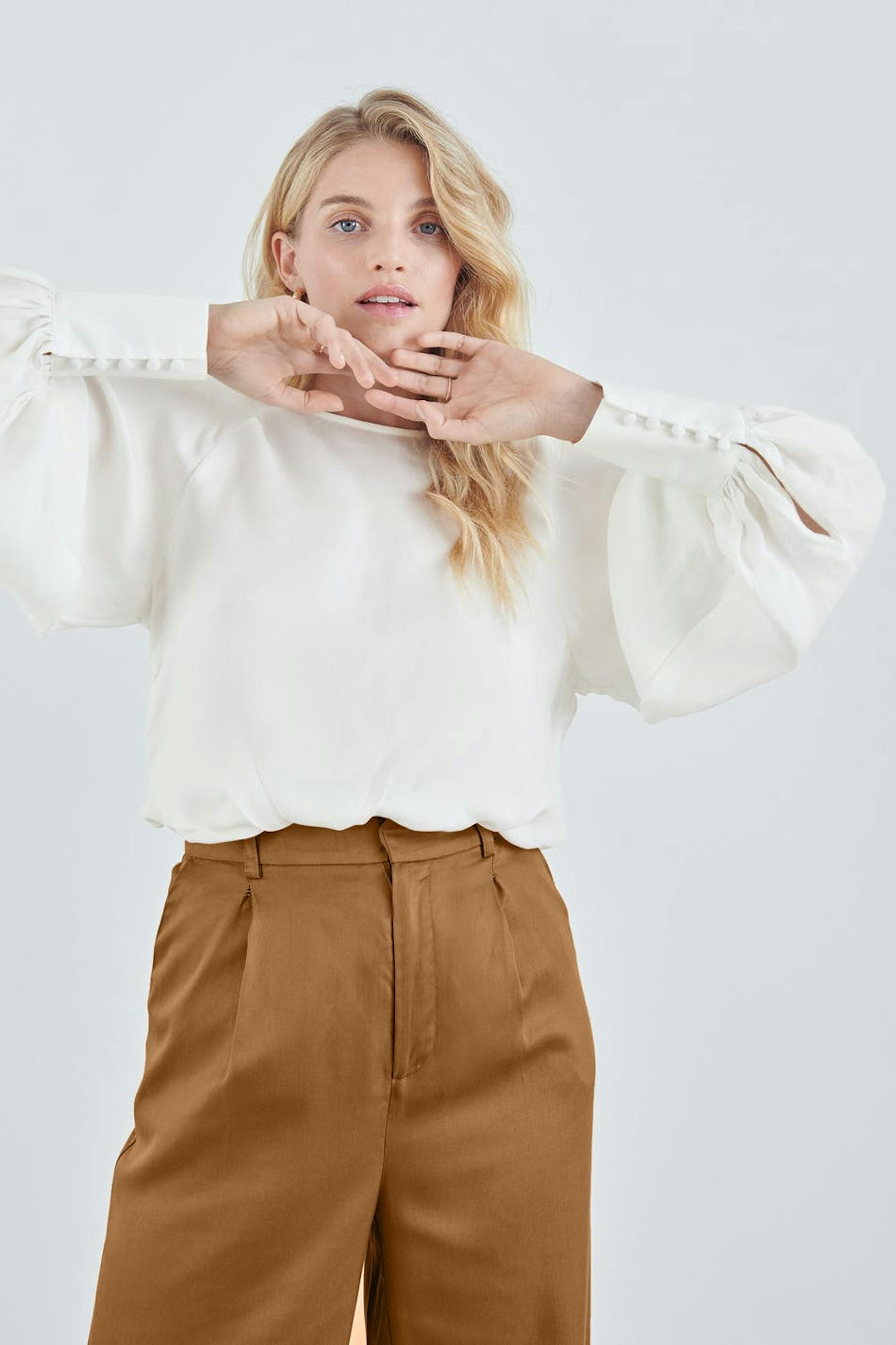 Soft blouse with big balloon sleeves with fabric covered cufflinks on the sleeve ends. The blouse is bone-white. It is made of cupro.