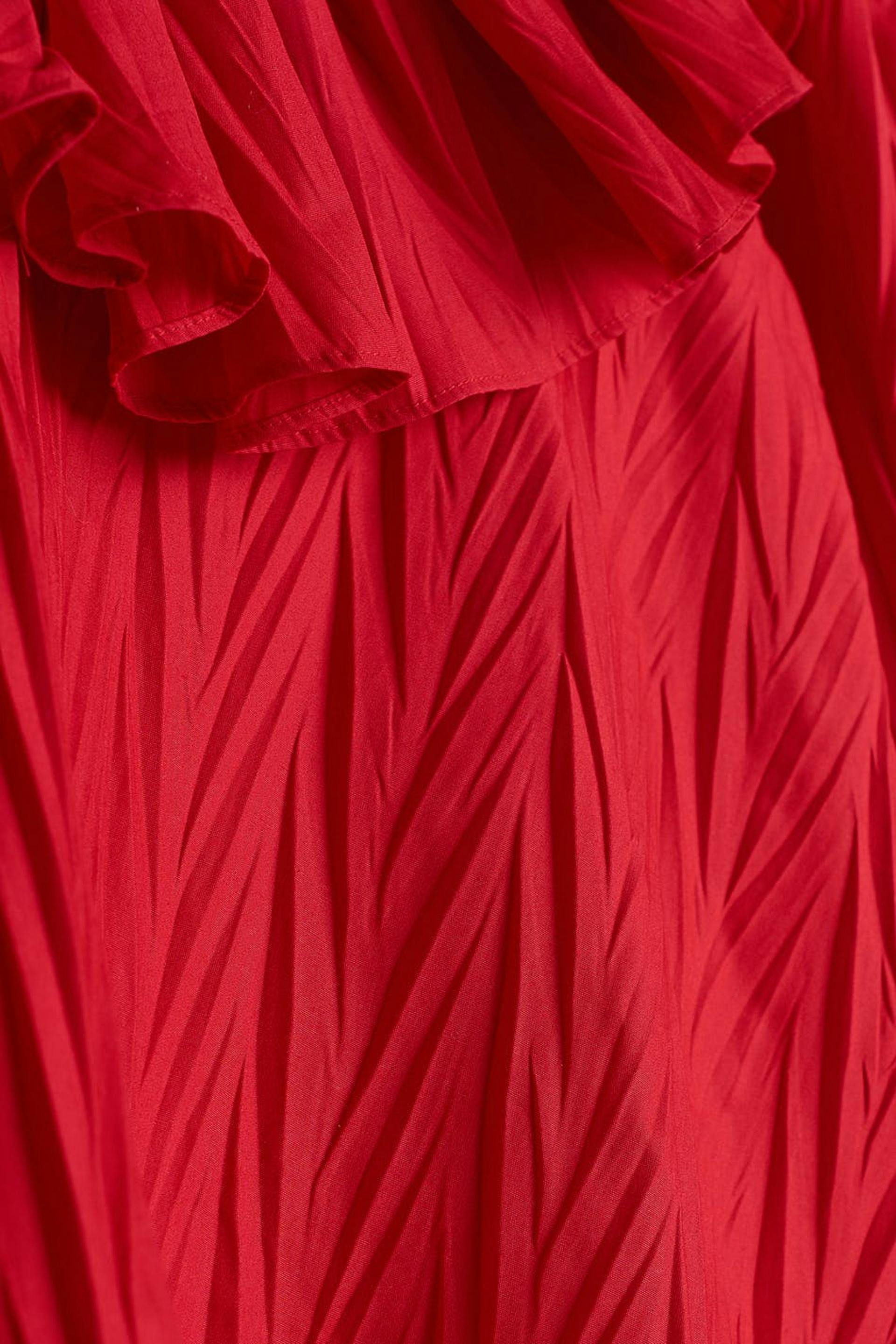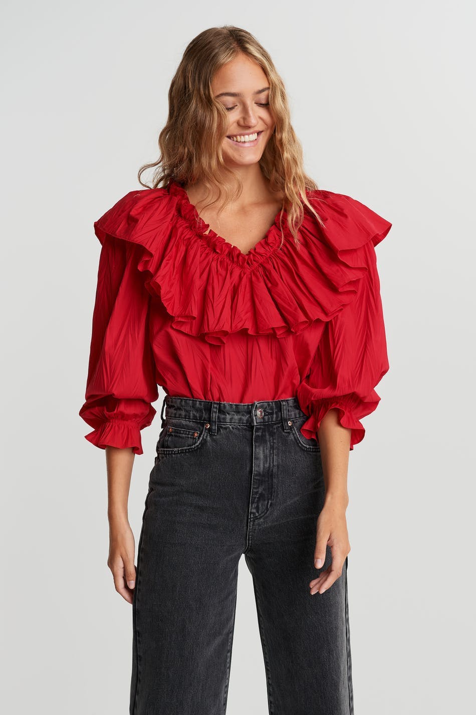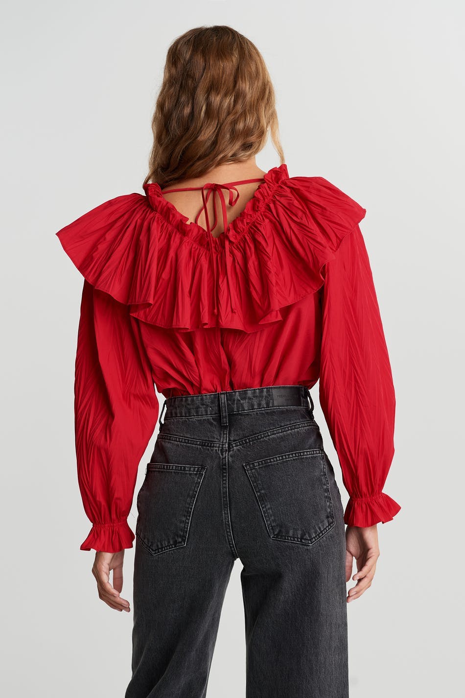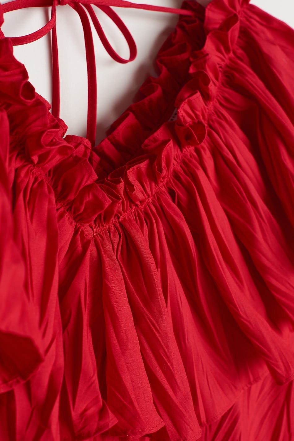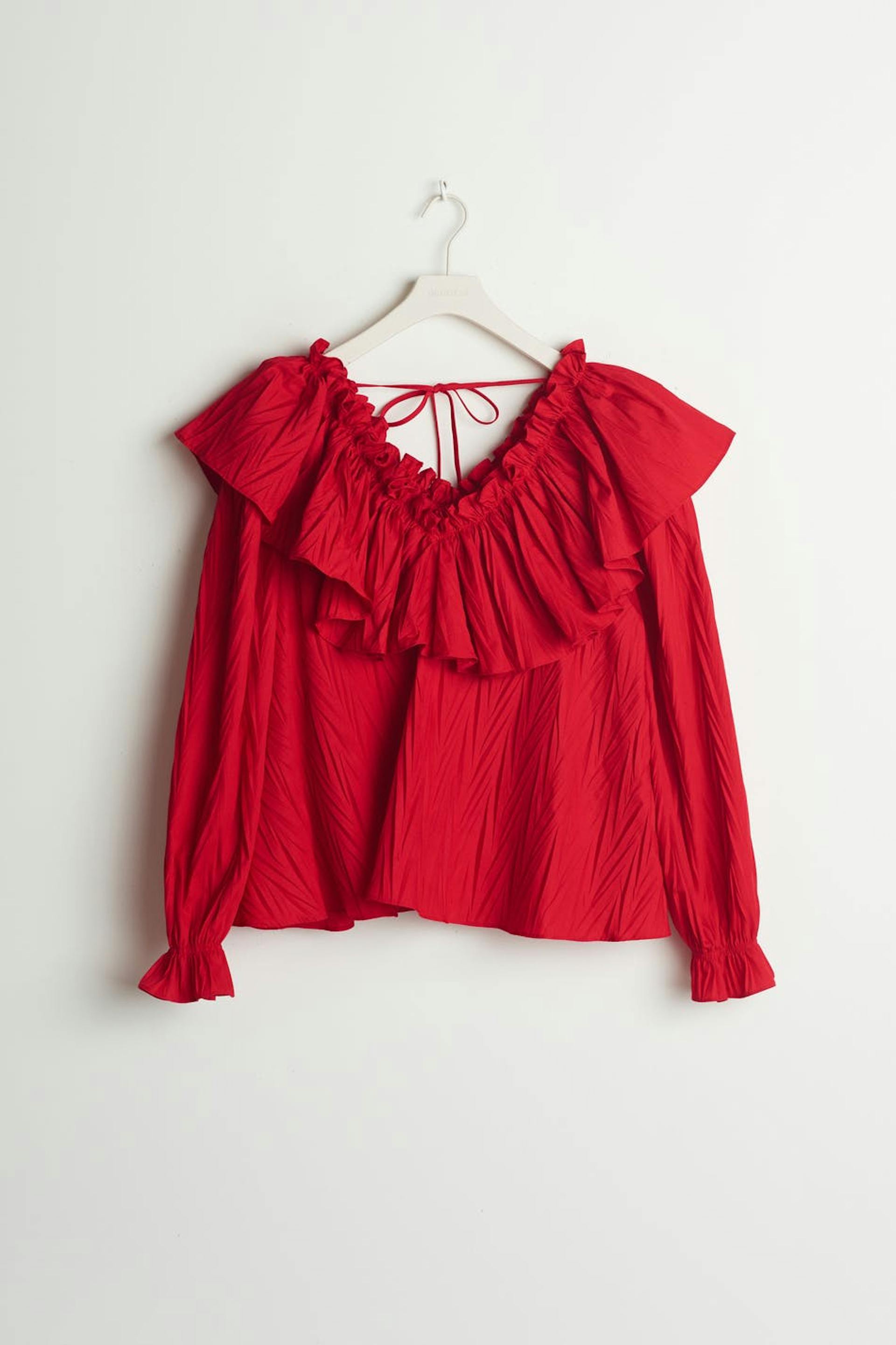 Ruffled blouse with a frill on the neckline. The blouse is red and has big sleeves with gathering on the sleeve ends. It has a tie strap at the neck.