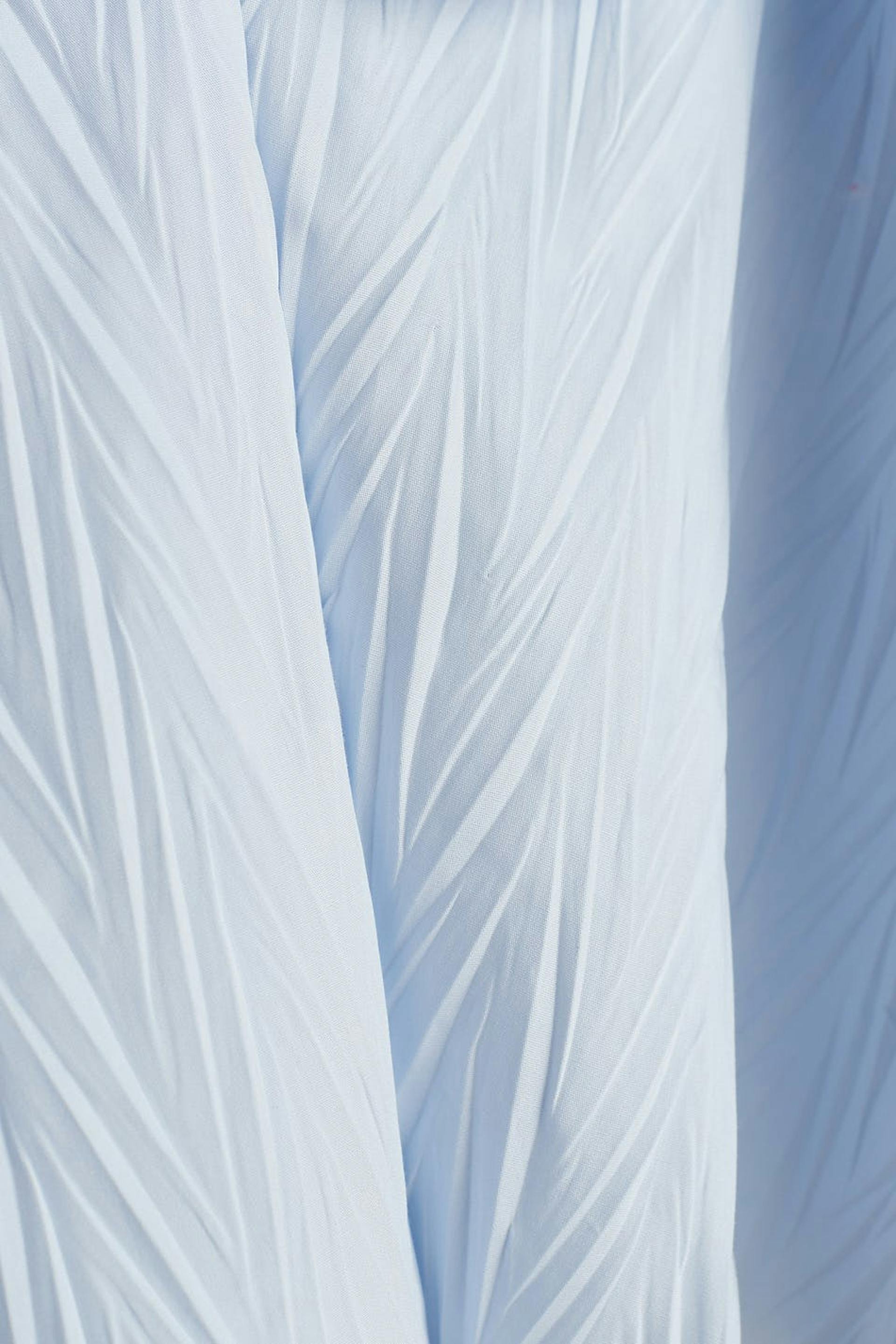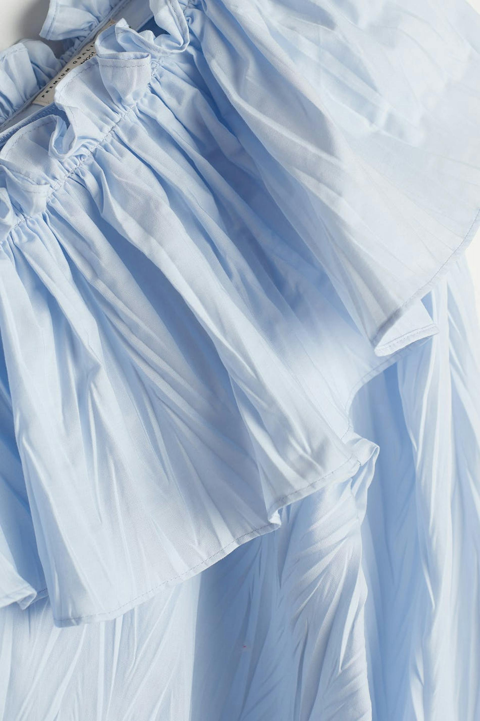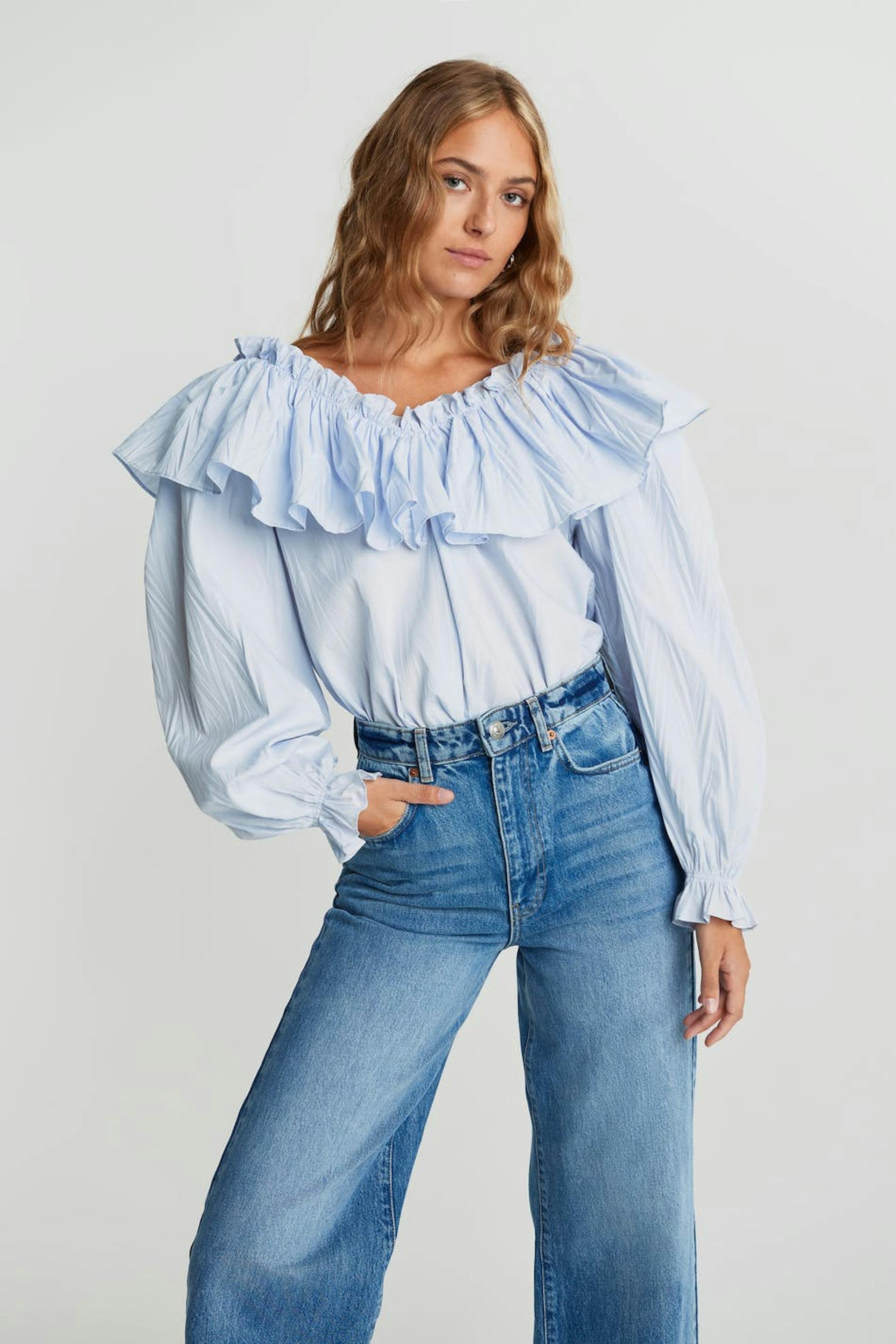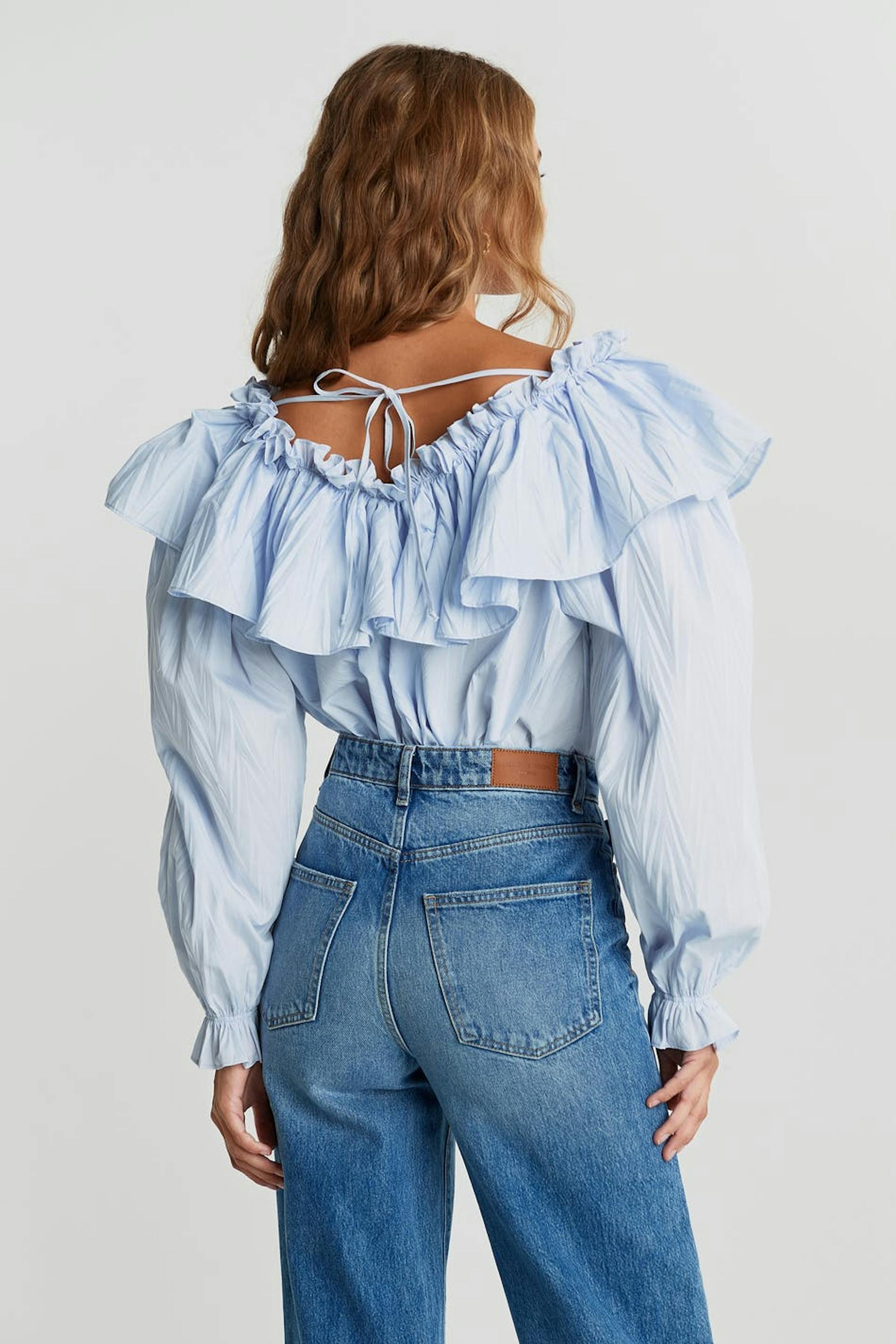 Ruffled blouse with a frill on the neckline. The blouse is blue and has big sleeves with gathering on the sleeve ends. It has a tie strap at the neck.