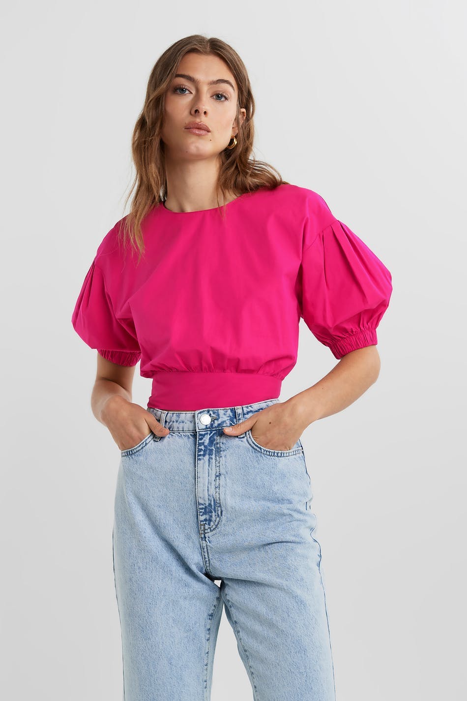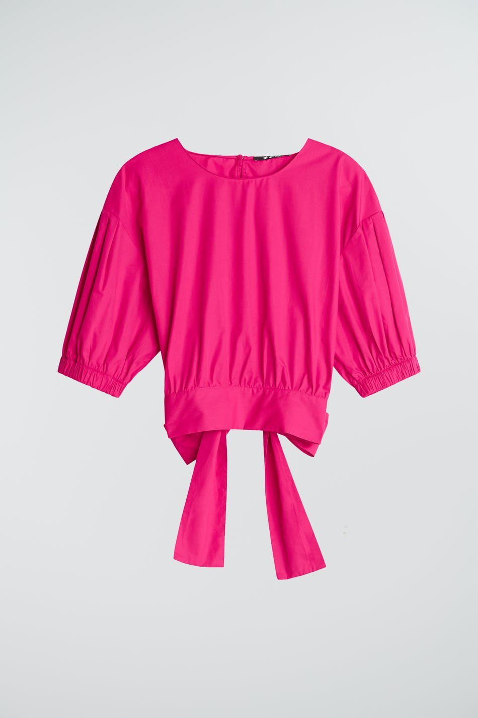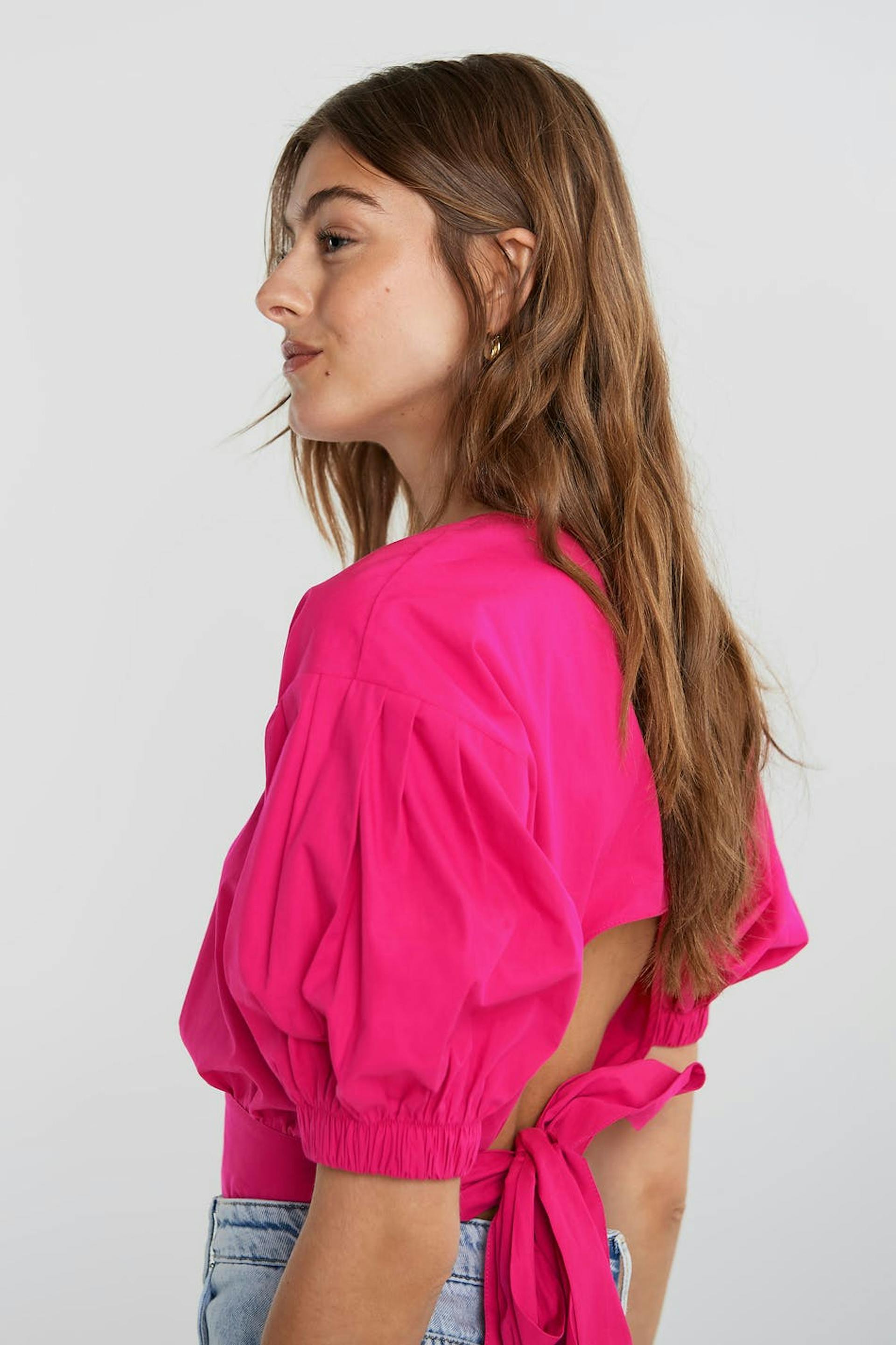 Blouse with an open back design. The blouse is pink and has short, big sleeves with an elastic band on the sleeve ends. It has a tie strap in the back.