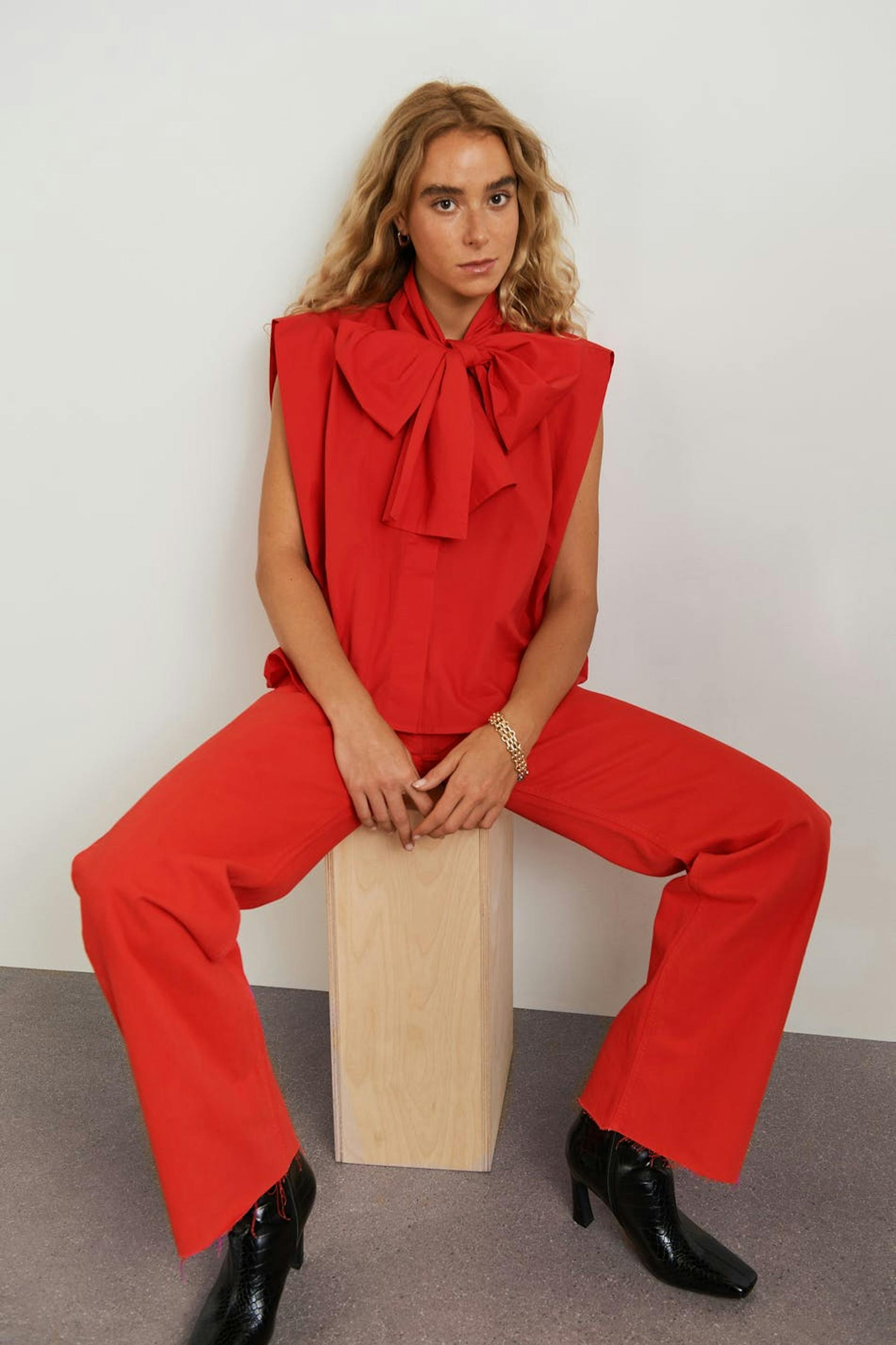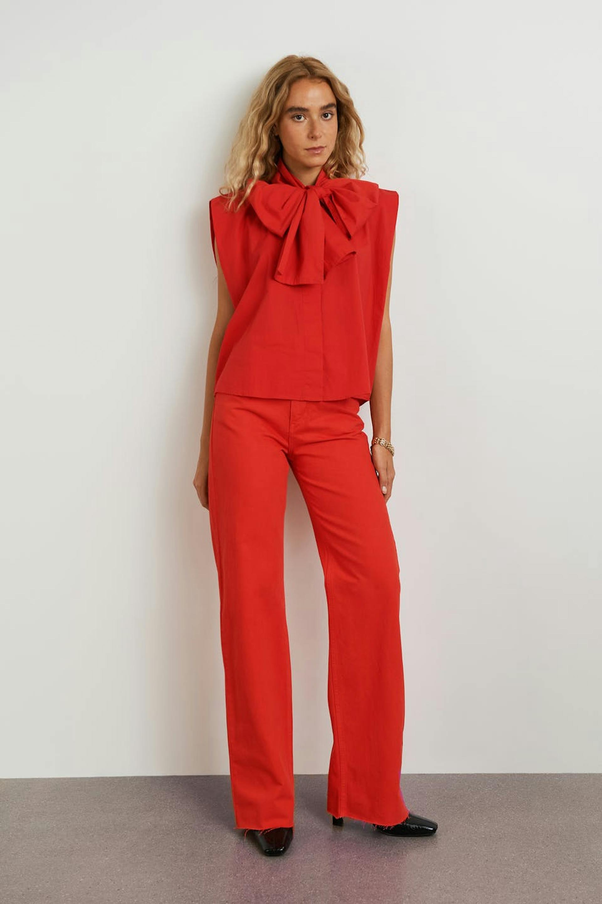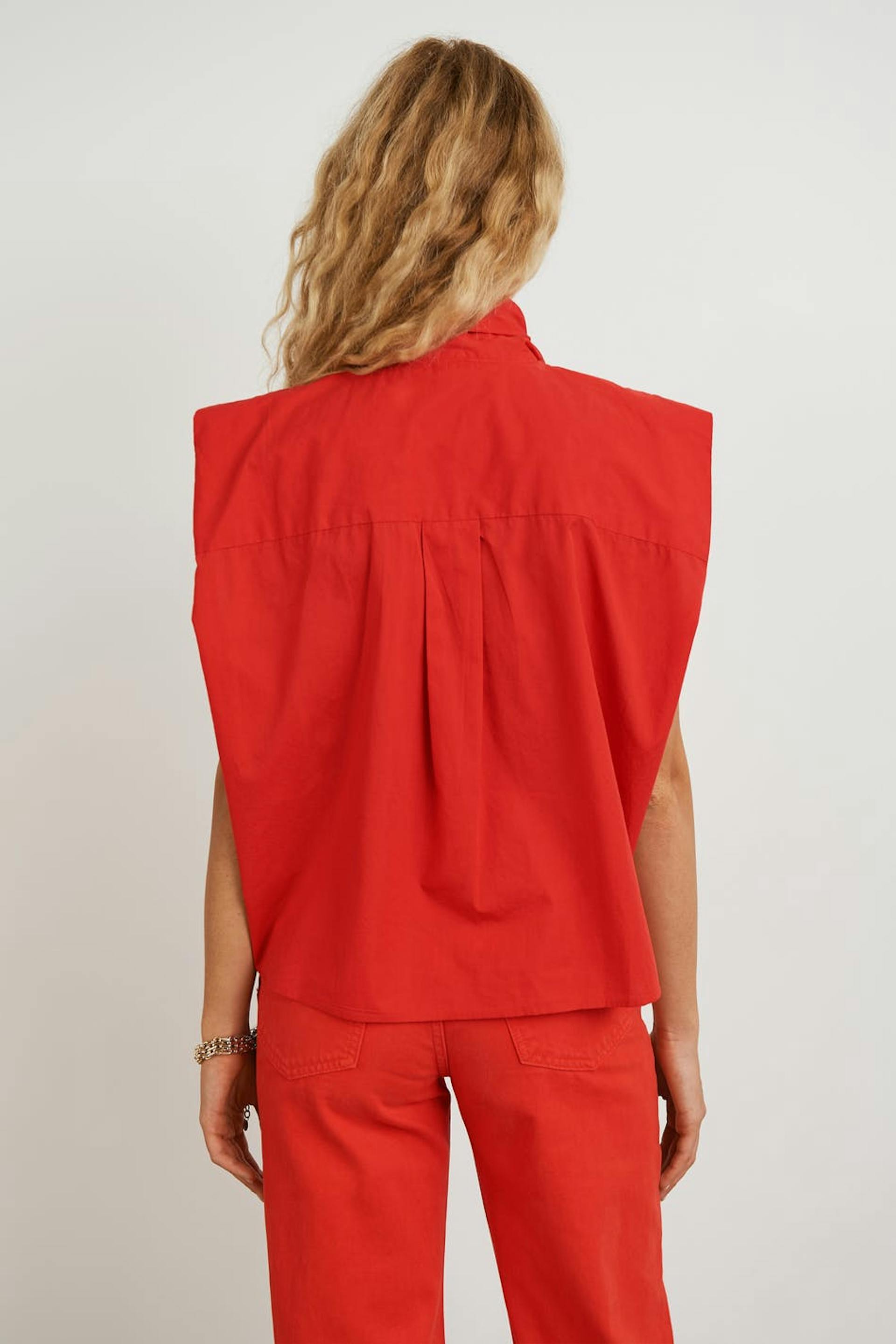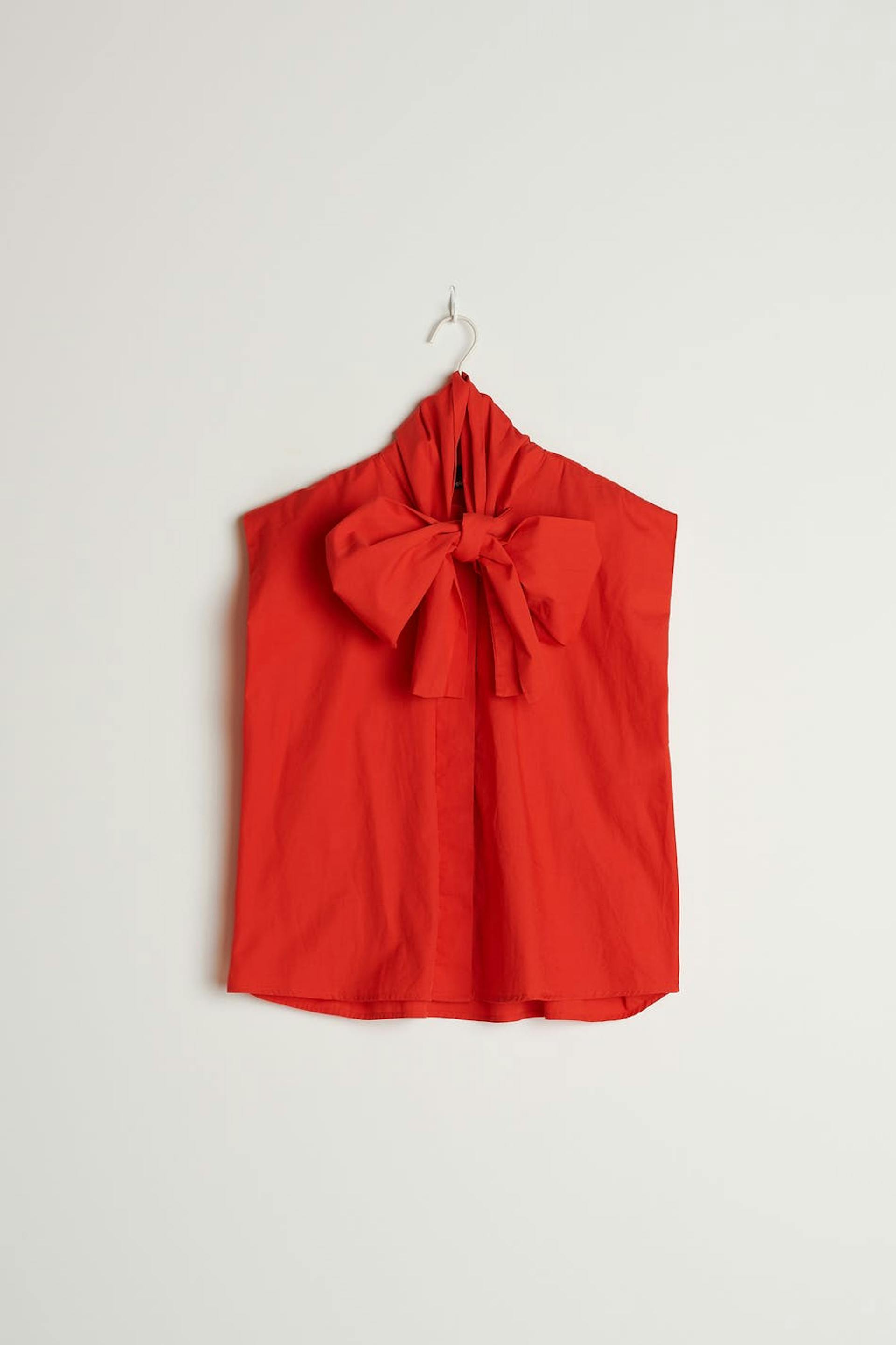 Sleeveless blouse with an oversize fit. The blouse is red and has wide shoulders. It is made of poplin and has a knot detail on the neckline, a button placket in front and yoke at the back.